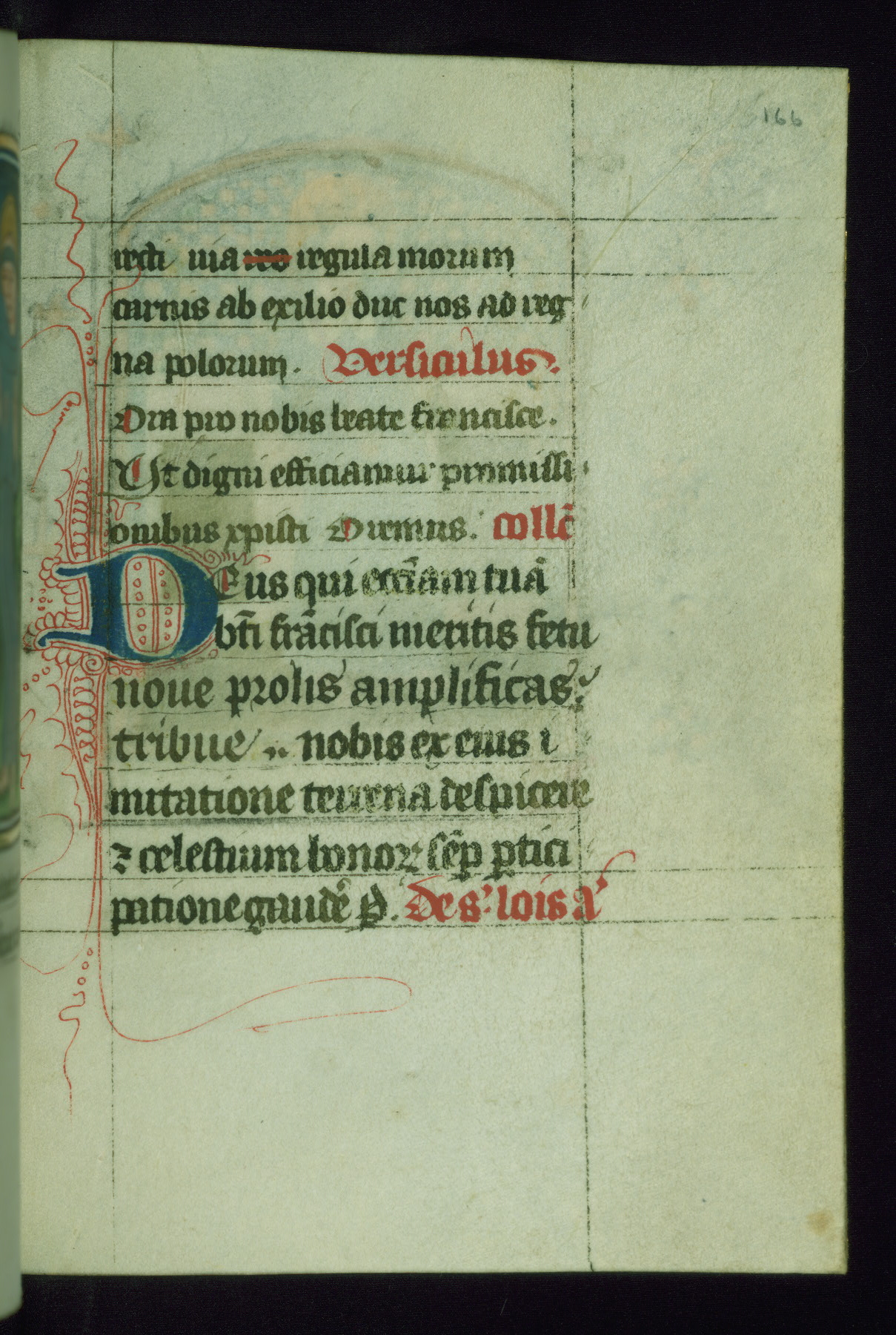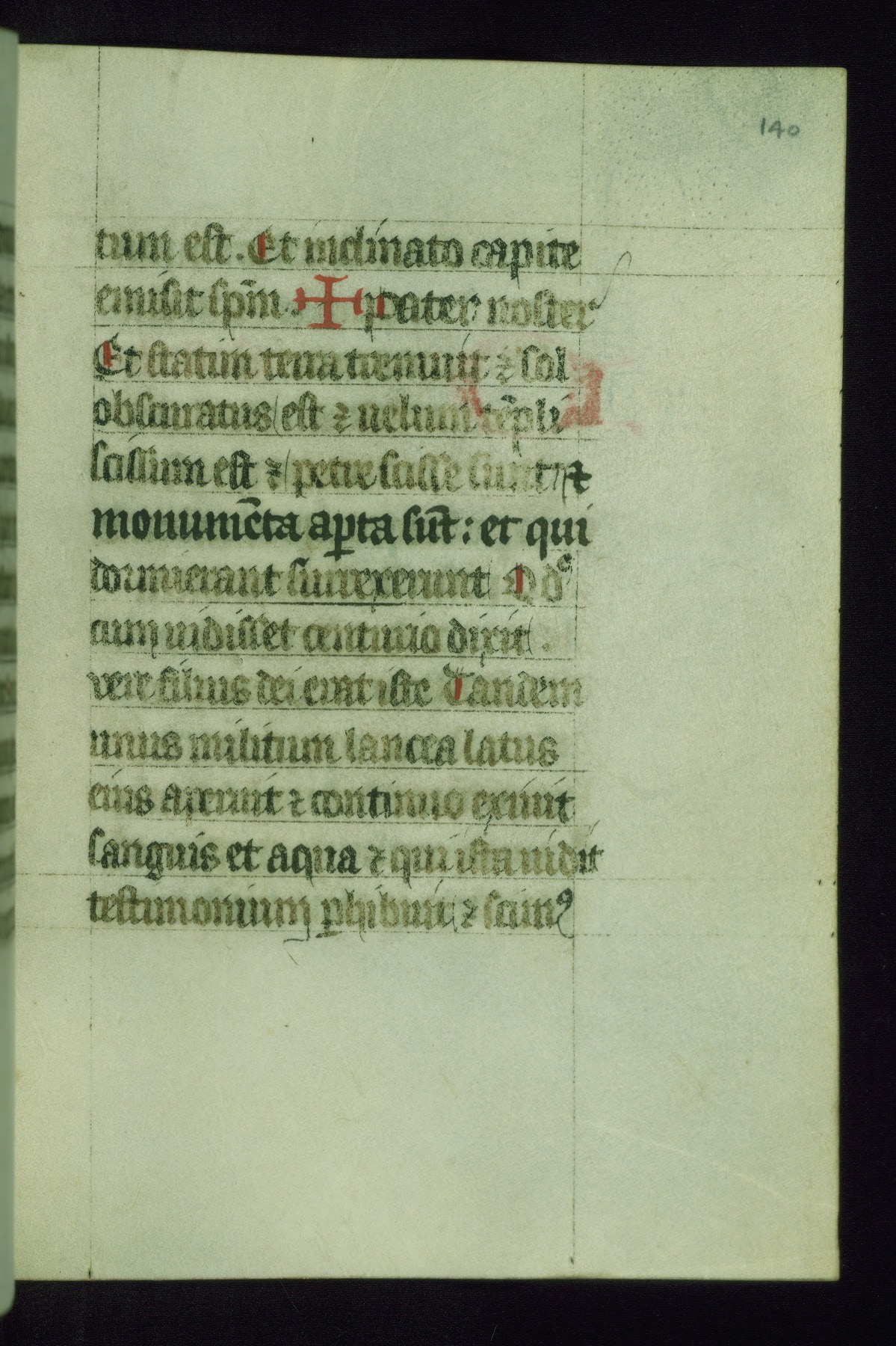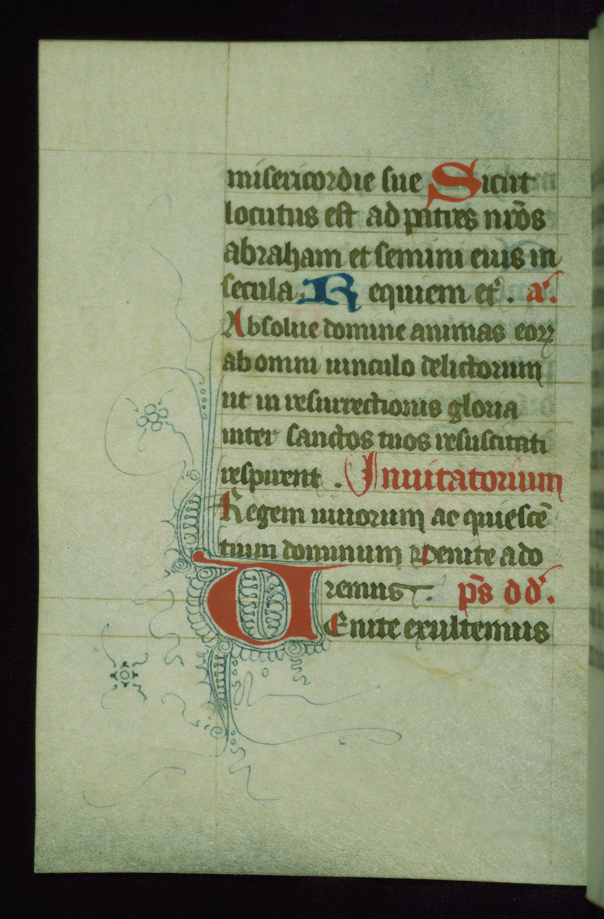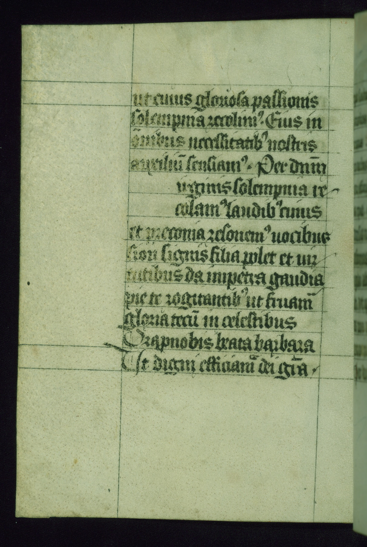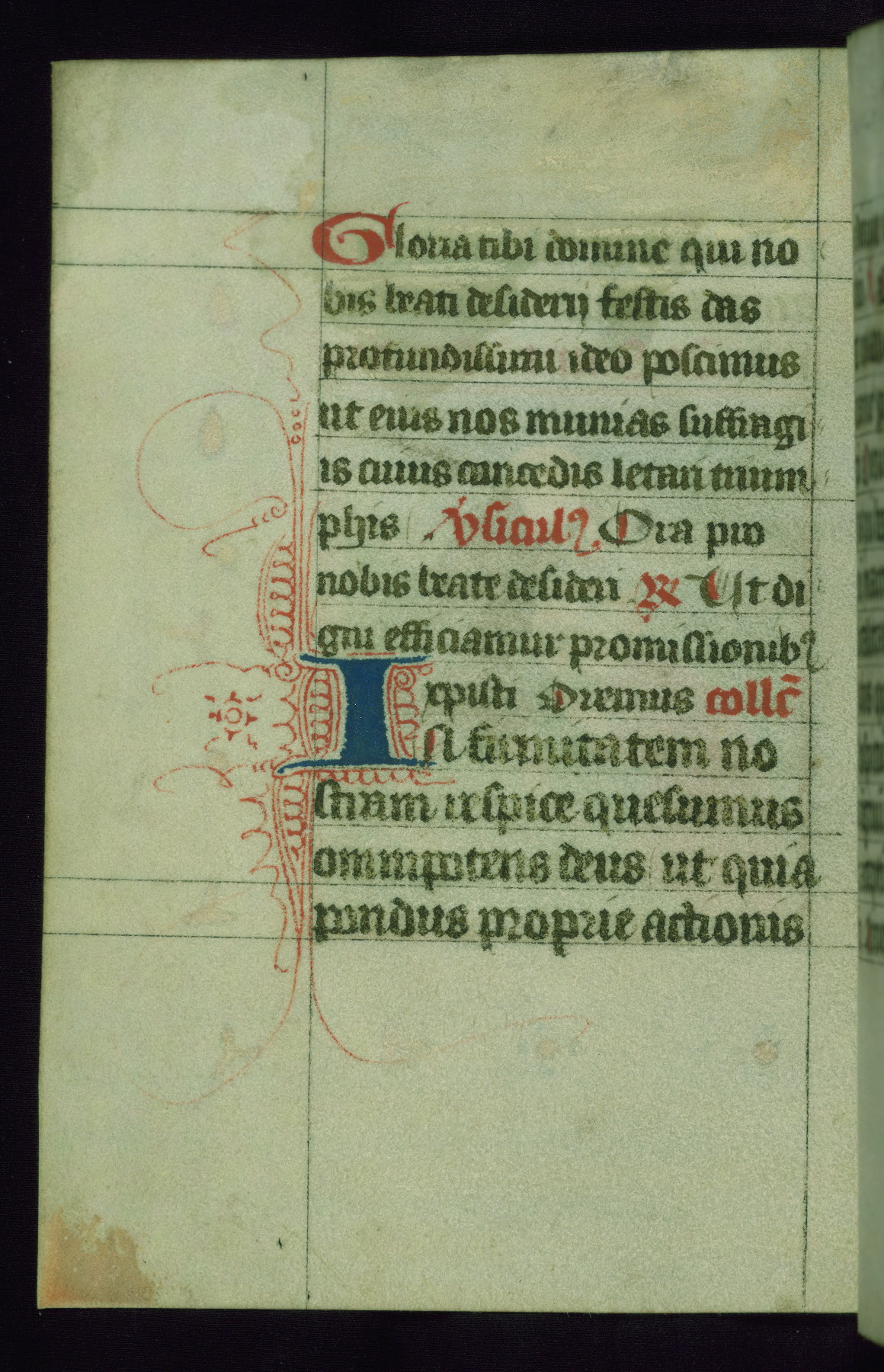 This prayer book was produced ca. 1430-40, likely in Brabant, but the contents of the calendar point to Tournai and Cambrai, and the Office of the Dead is for the use of Liège. North Netherlandish influence, possibly connected with works by the Masters of the Gold Scrolls, is suggested by the style and iconography of its images. The manuscript is notable for its large number of miniatures--forty-eight in total--as well as the sense of narrative within them, and the diversity of the suffrages they illustrate is striking. That the original owner had a strong interest in the Passion is evident in both the choice of texts and the images. The manuscript was well used, and accrued not only additional prayers and suffrages, but devotional objects as well: a pilgrim's badge was once attached to the corner of the image for the suffrage to relics on fol. 160r.