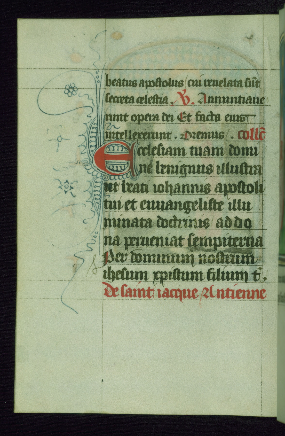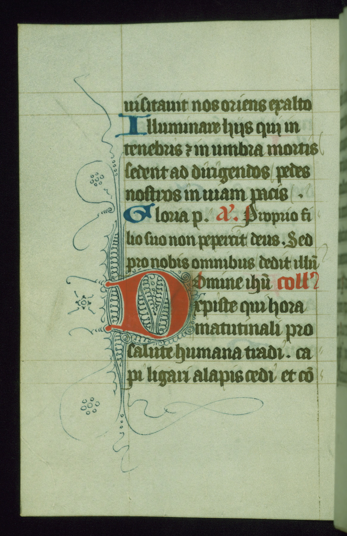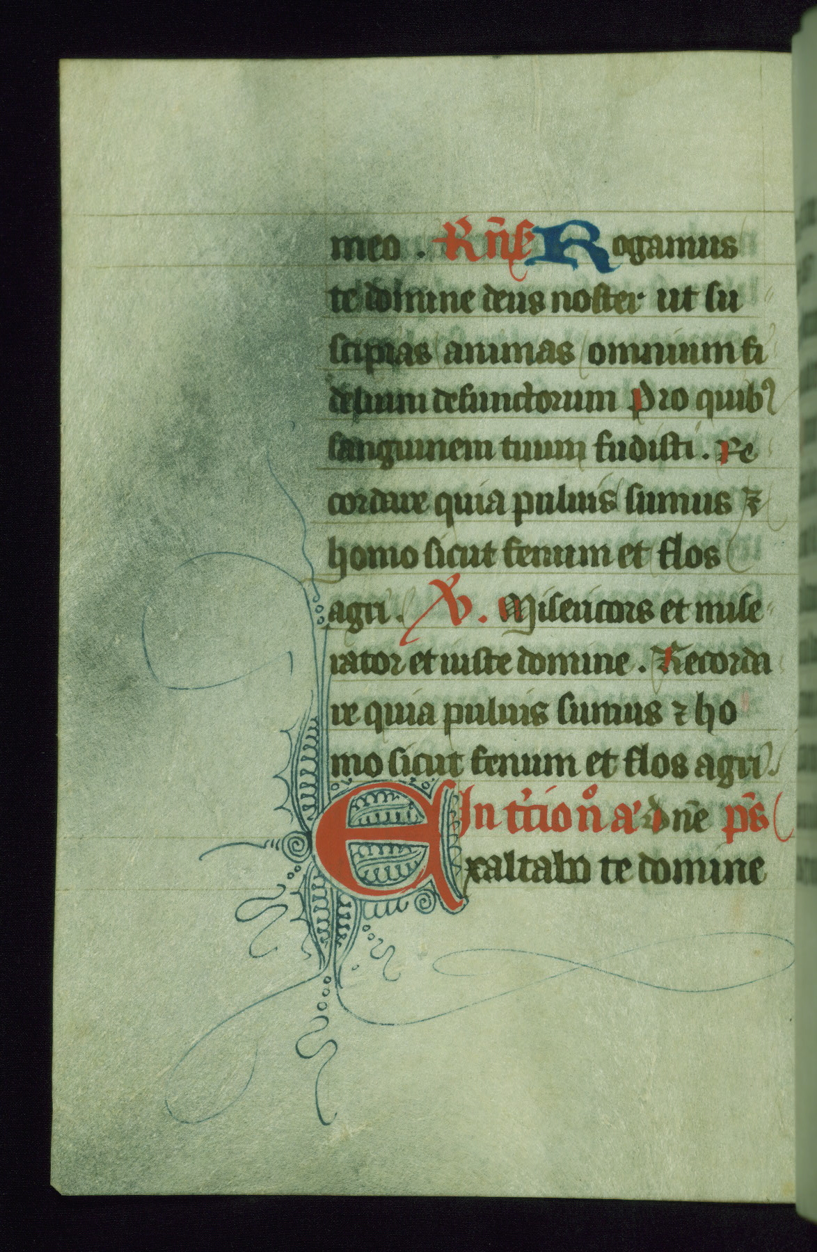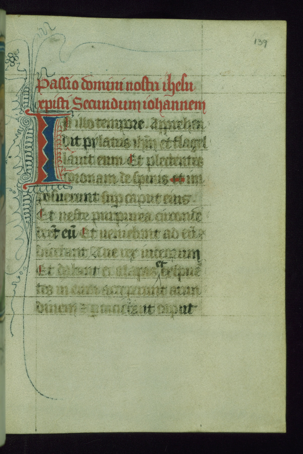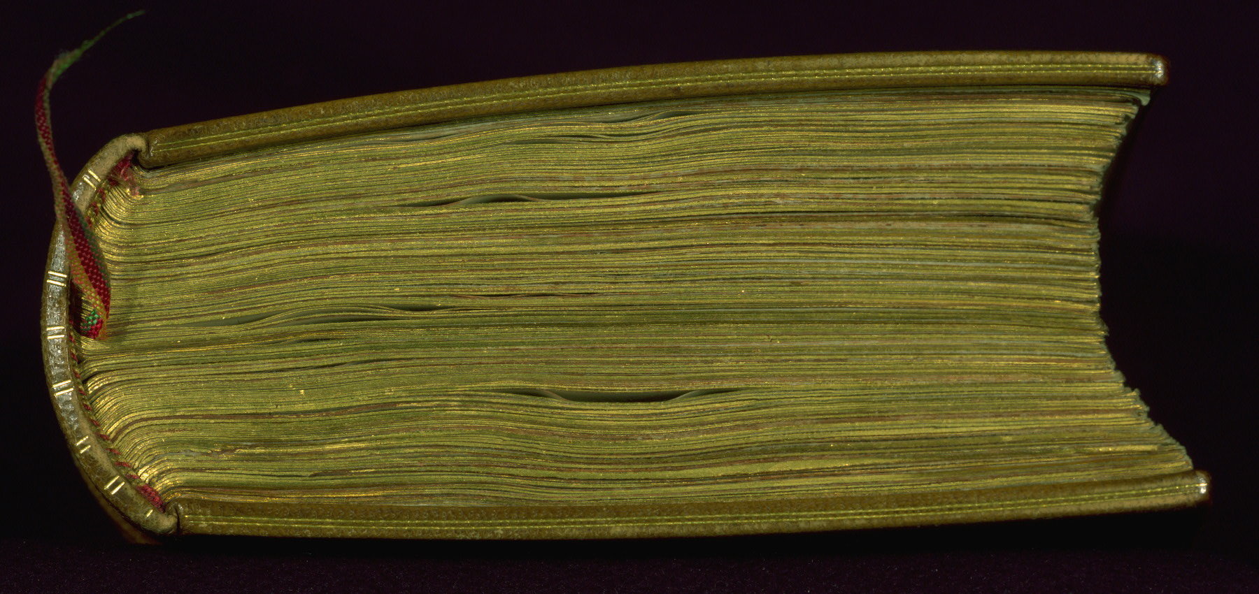 This prayer book was produced ca. 1430-40, likely in Brabant, but the contents of the calendar point to Tournai and Cambrai, and the Office of the Dead is for the use of Liège. North Netherlandish influence, possibly connected with works by the Masters of the Gold Scrolls, is suggested by the style and iconography of its images. The manuscript is notable for its large number of miniatures--forty-eight in total--as well as the sense of narrative within them, and the diversity of the suffrages they illustrate is striking. That the original owner had a strong interest in the Passion is evident in both the choice of texts and the images. The manuscript was well used, and accrued not only additional prayers and suffrages, but devotional objects as well: a pilgrim's badge was once attached to the corner of the image for the suffrage to relics on fol. 160r.