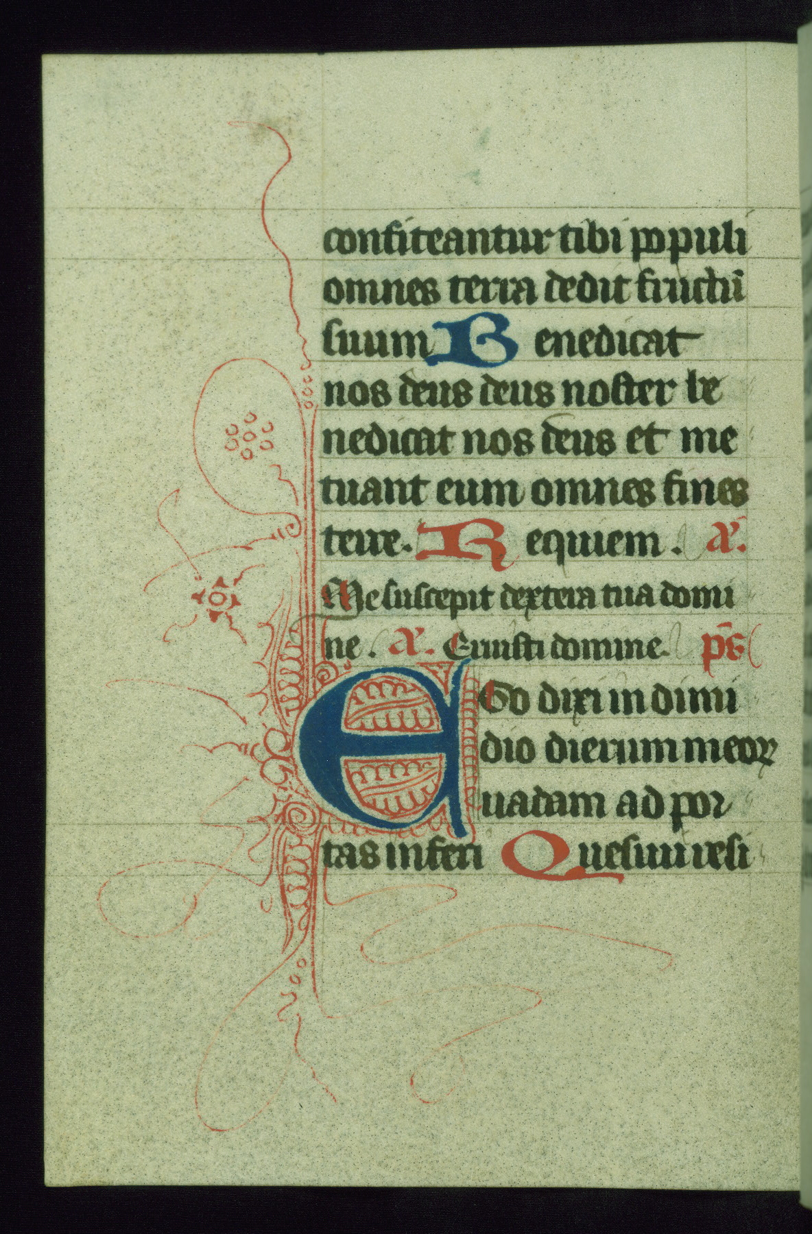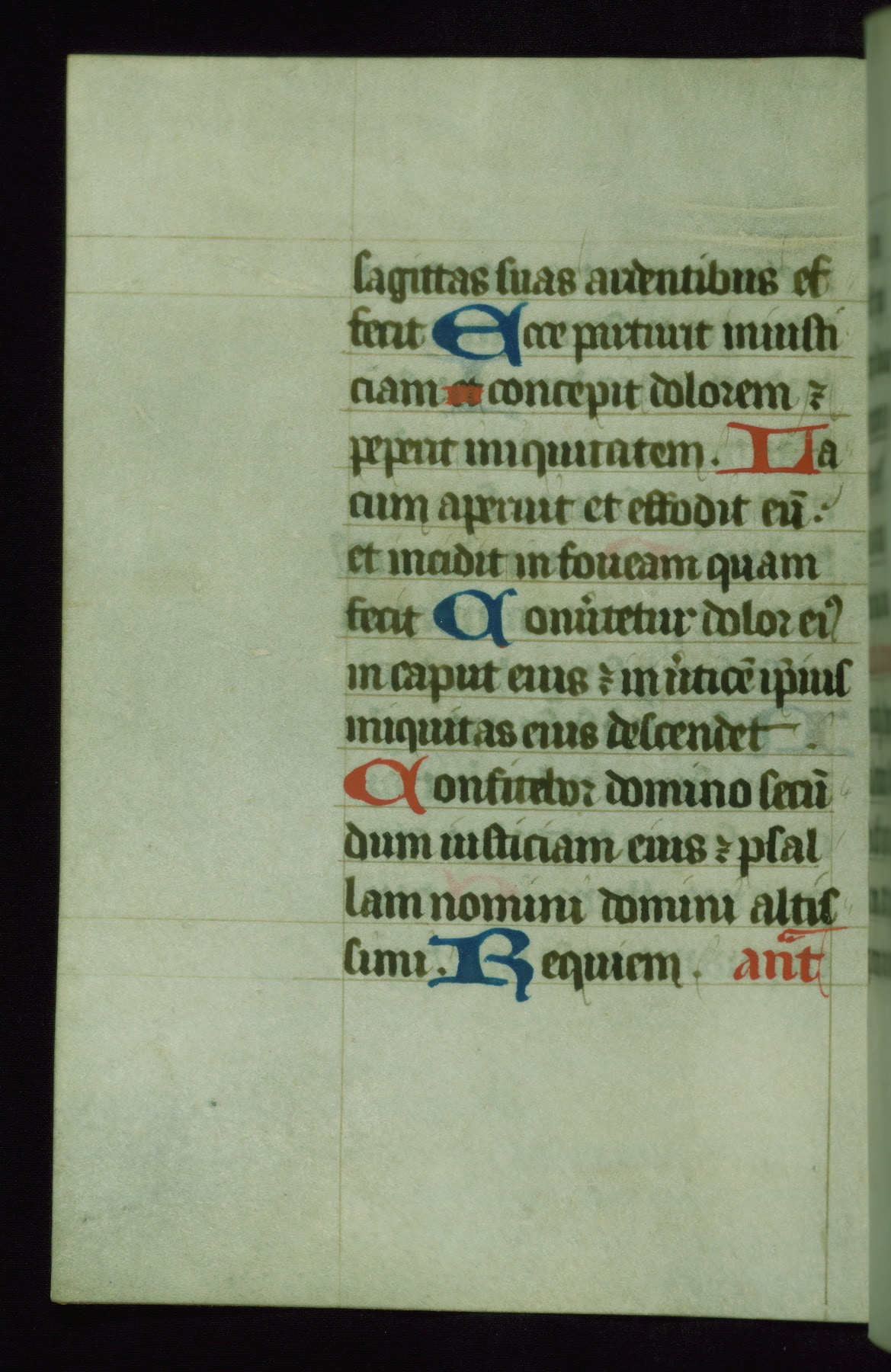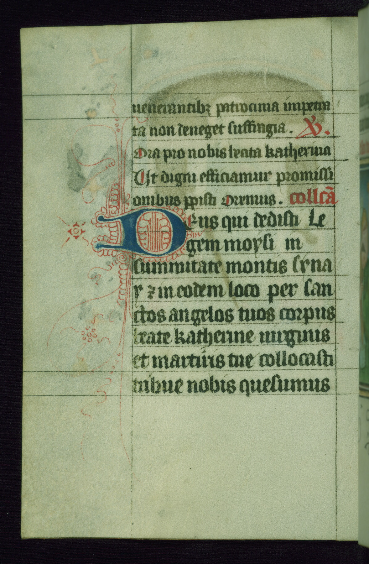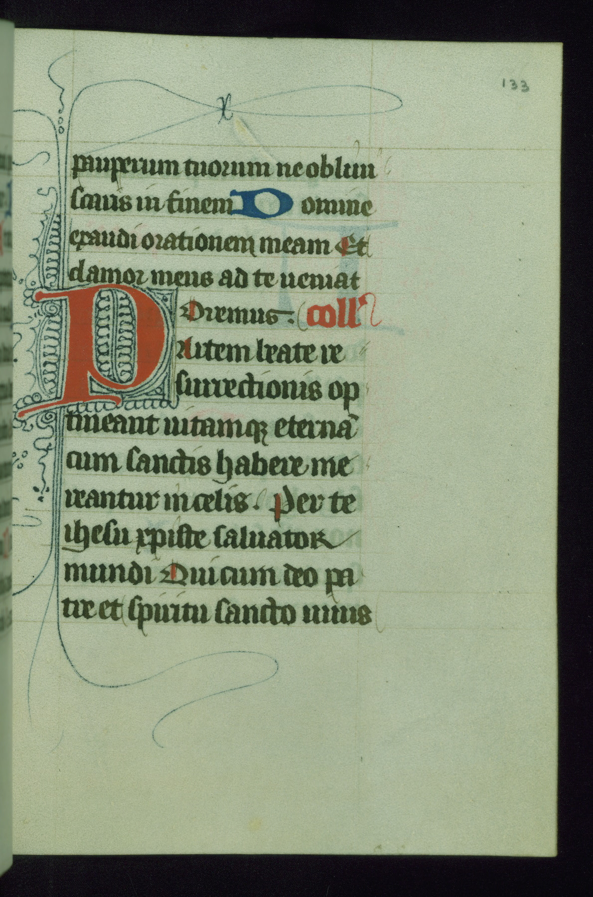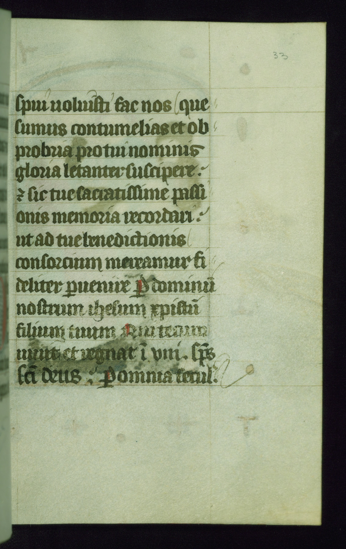 This prayer book was produced ca. 1430-40, likely in Brabant, but the contents of the calendar point to Tournai and Cambrai, and the Office of the Dead is for the use of Liège. North Netherlandish influence, possibly connected with works by the Masters of the Gold Scrolls, is suggested by the style and iconography of its images. The manuscript is notable for its large number of miniatures--forty-eight in total--as well as the sense of narrative within them, and the diversity of the suffrages they illustrate is striking. That the original owner had a strong interest in the Passion is evident in both the choice of texts and the images. The manuscript was well used, and accrued not only additional prayers and suffrages, but devotional objects as well: a pilgrim's badge was once attached to the corner of the image for the suffrage to relics on fol. 160r.
