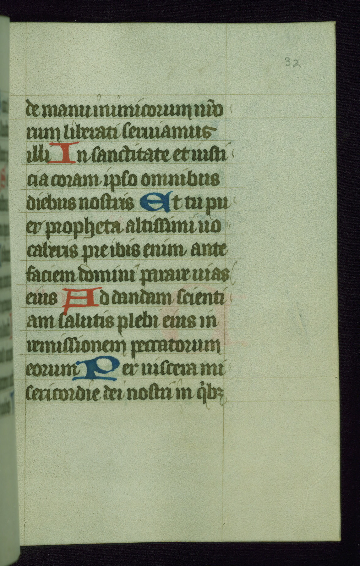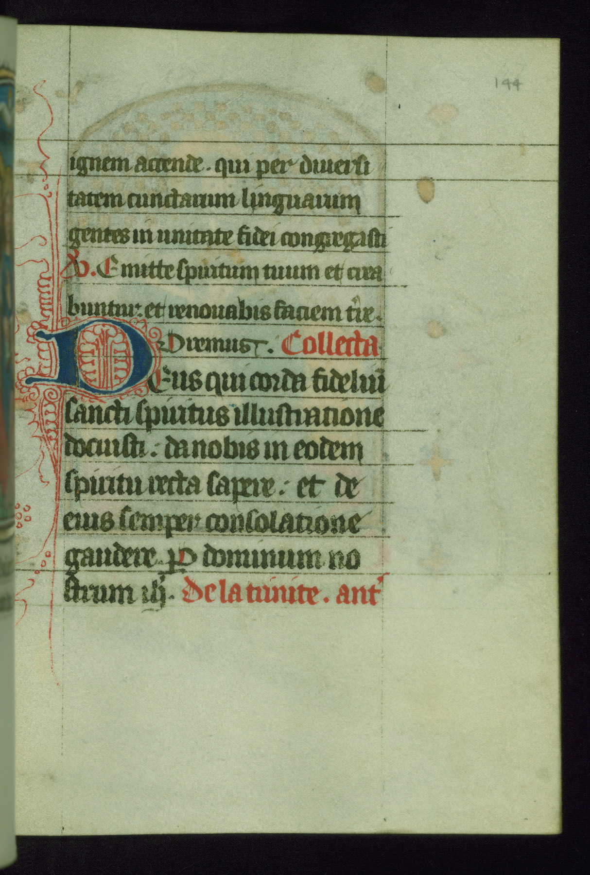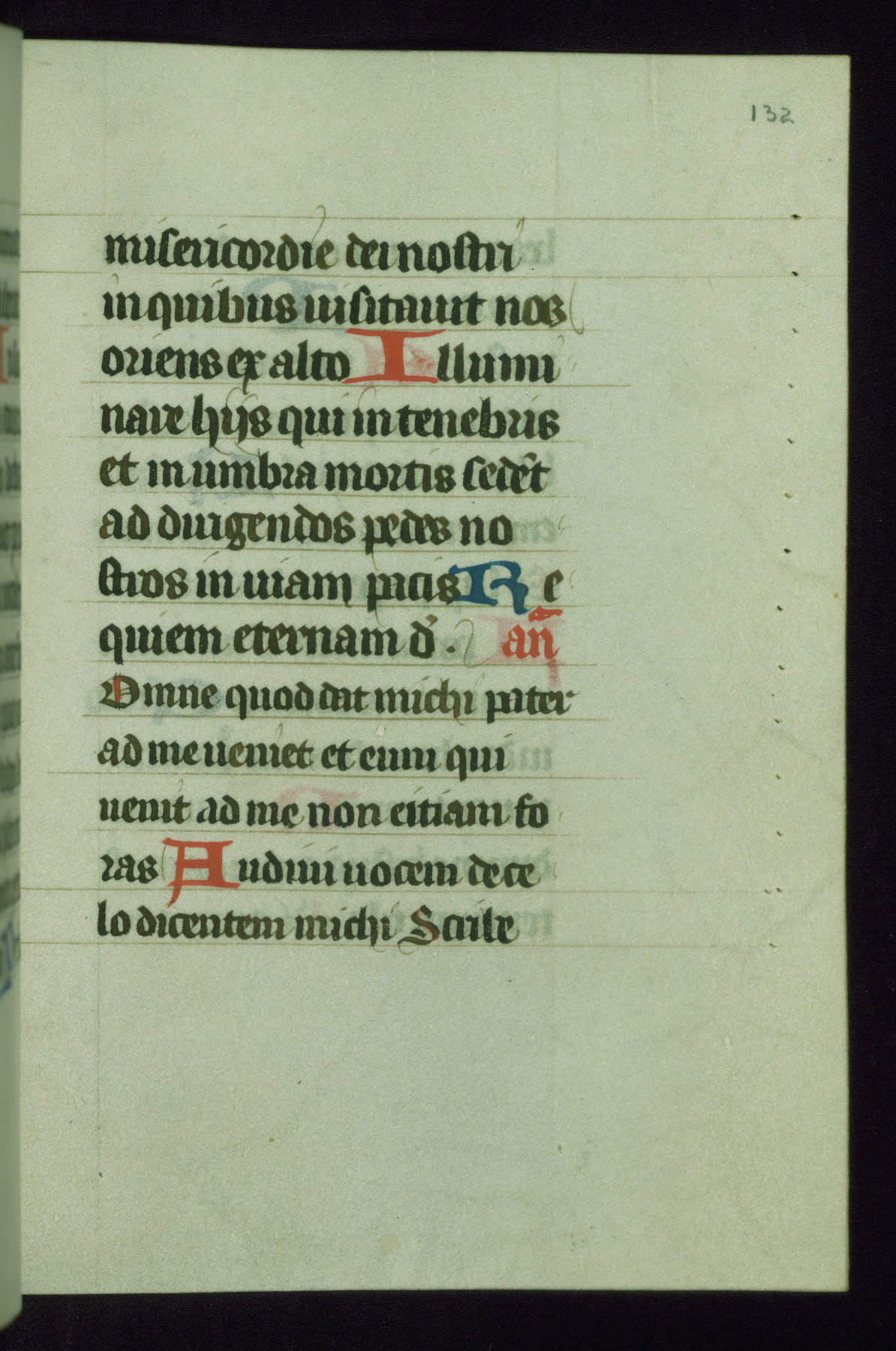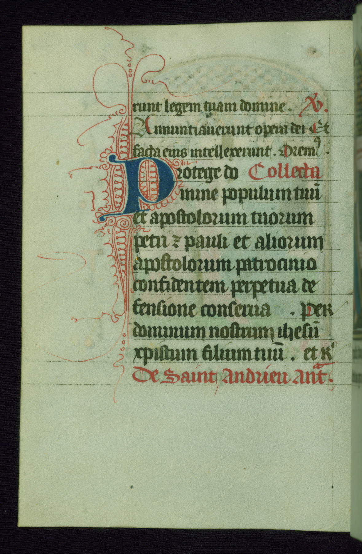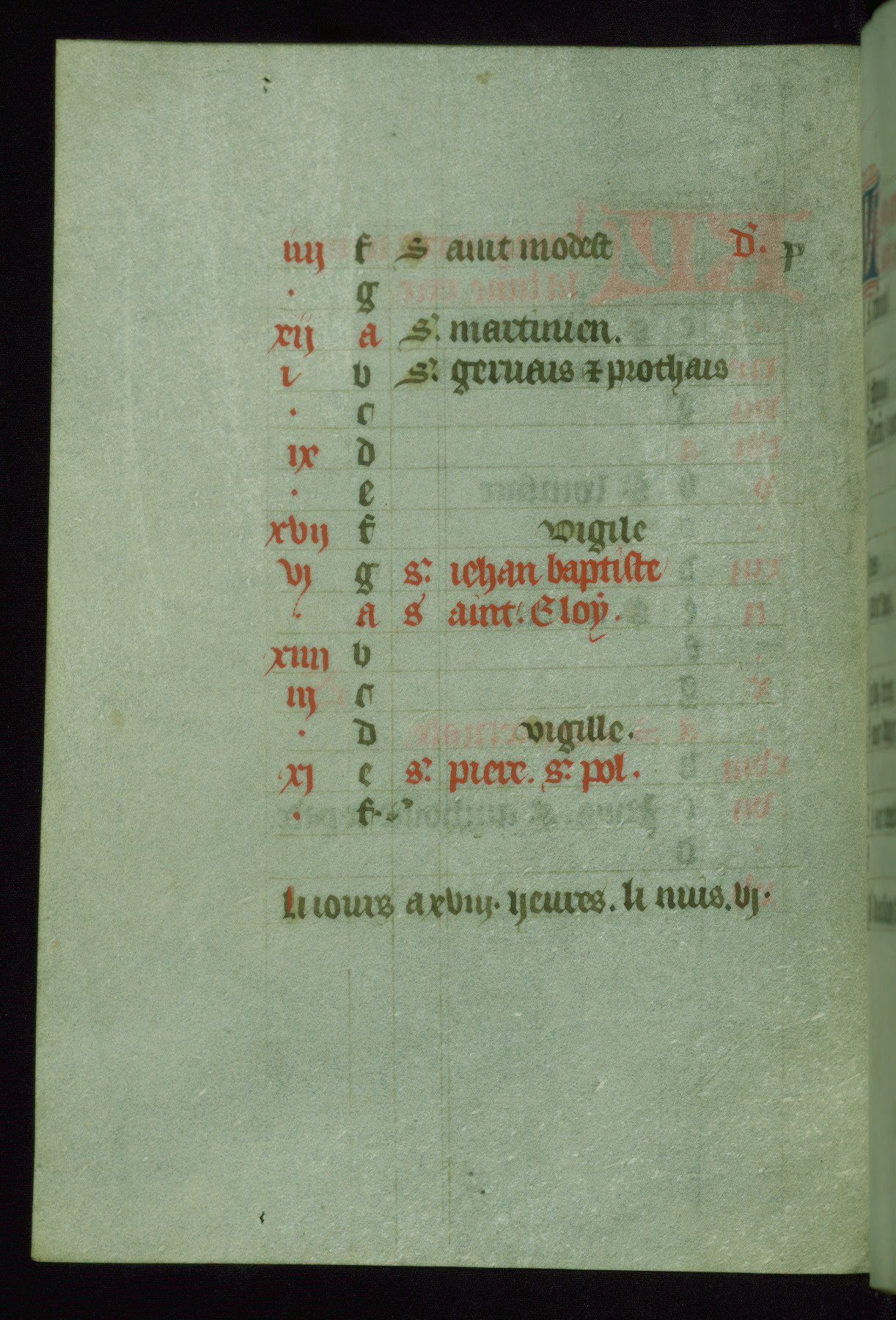 This prayer book was produced ca. 1430-40, likely in Brabant, but the contents of the calendar point to Tournai and Cambrai, and the Office of the Dead is for the use of Liège. North Netherlandish influence, possibly connected with works by the Masters of the Gold Scrolls, is suggested by the style and iconography of its images. The manuscript is notable for its large number of miniatures--forty-eight in total--as well as the sense of narrative within them, and the diversity of the suffrages they illustrate is striking. That the original owner had a strong interest in the Passion is evident in both the choice of texts and the images. The manuscript was well used, and accrued not only additional prayers and suffrages, but devotional objects as well: a pilgrim's badge was once attached to the corner of the image for the suffrage to relics on fol. 160r.