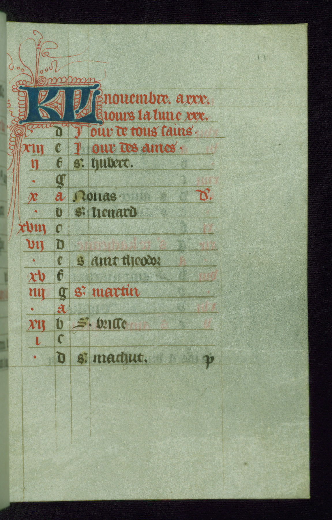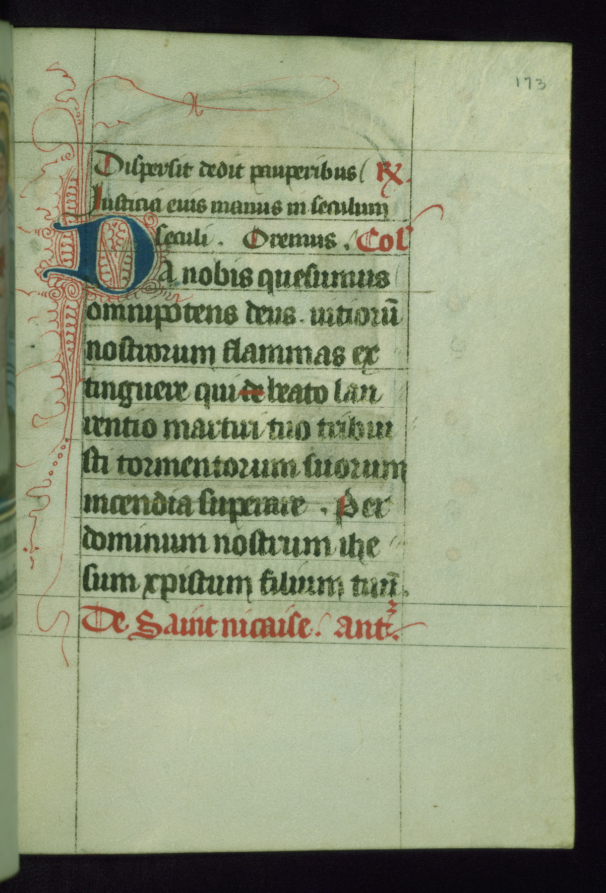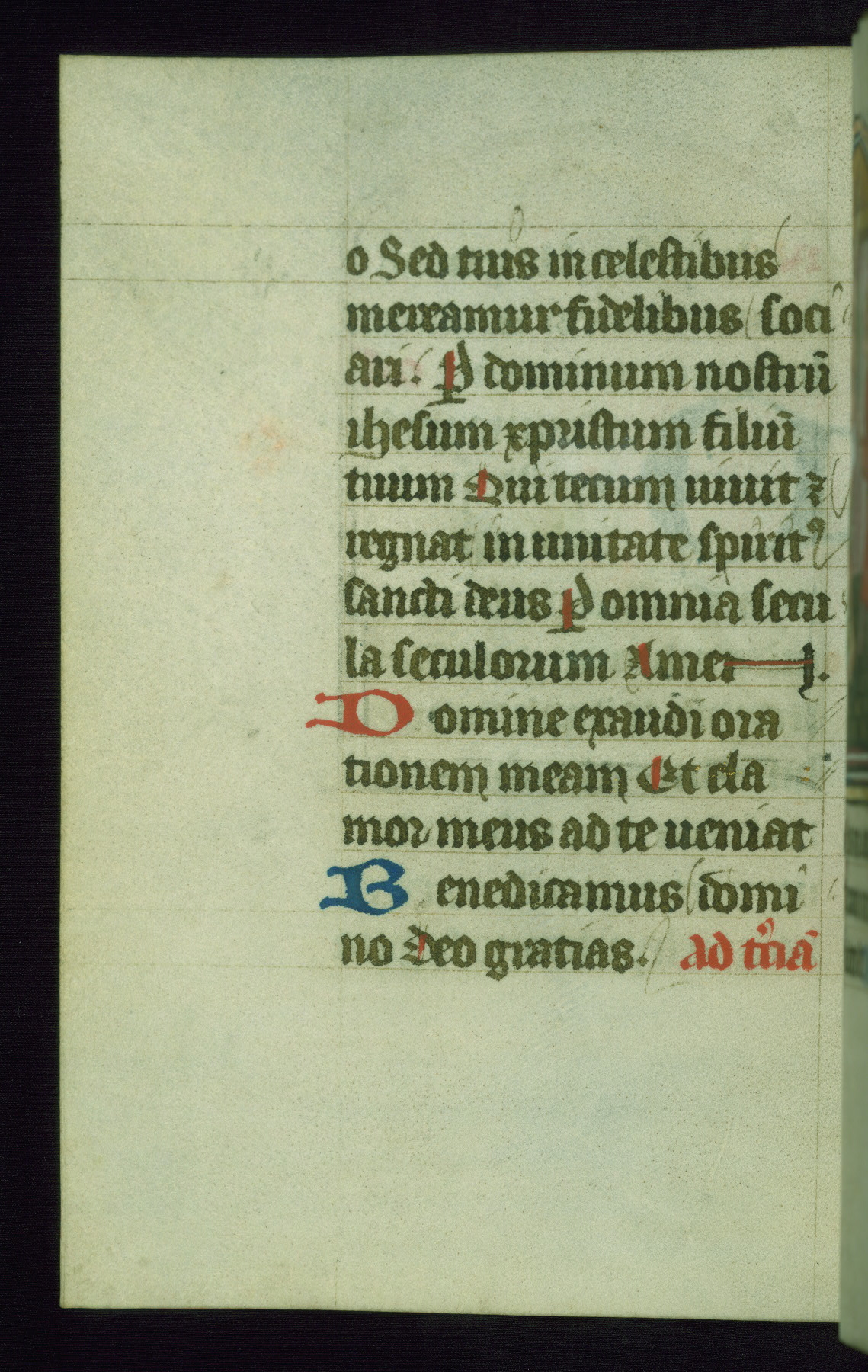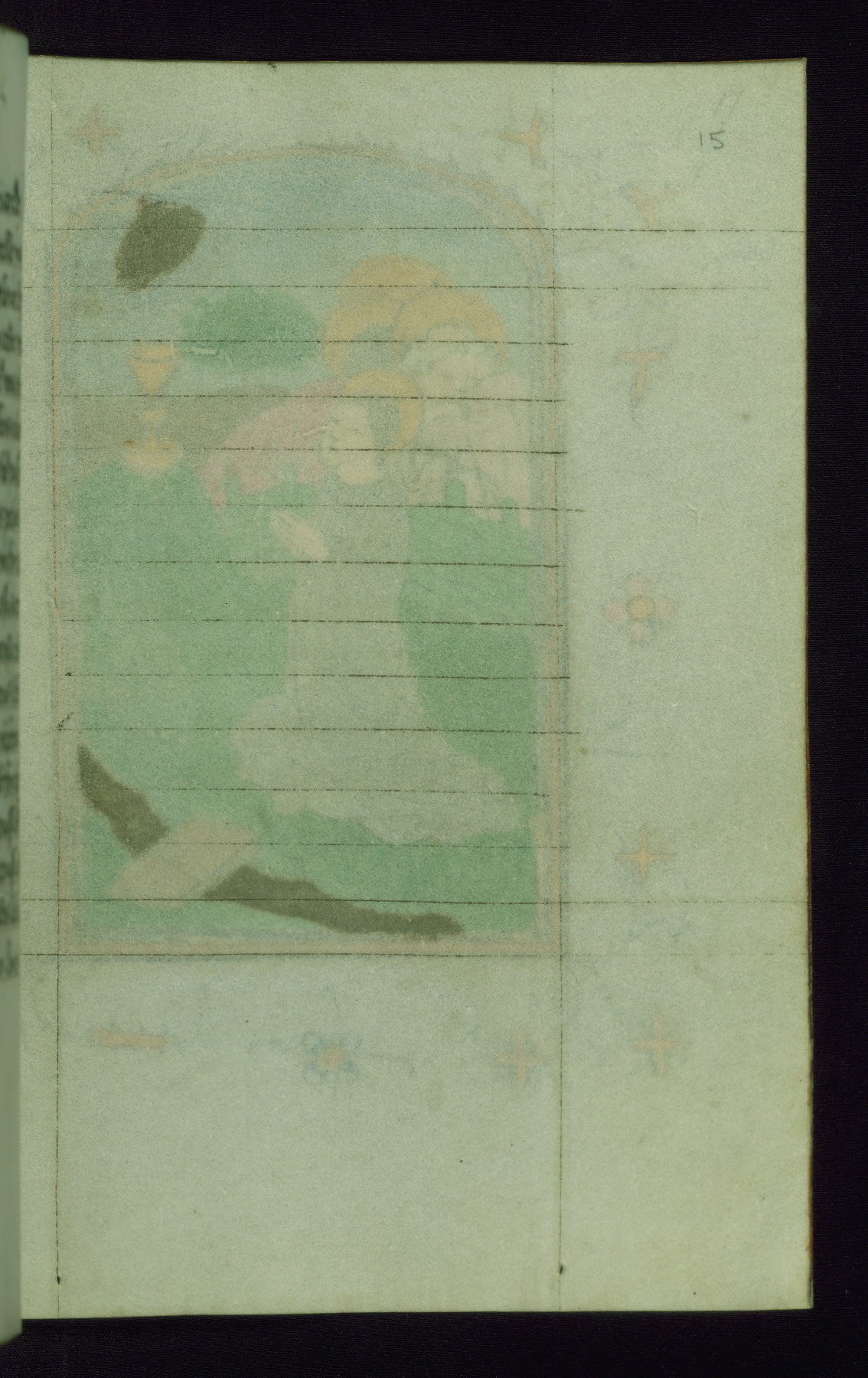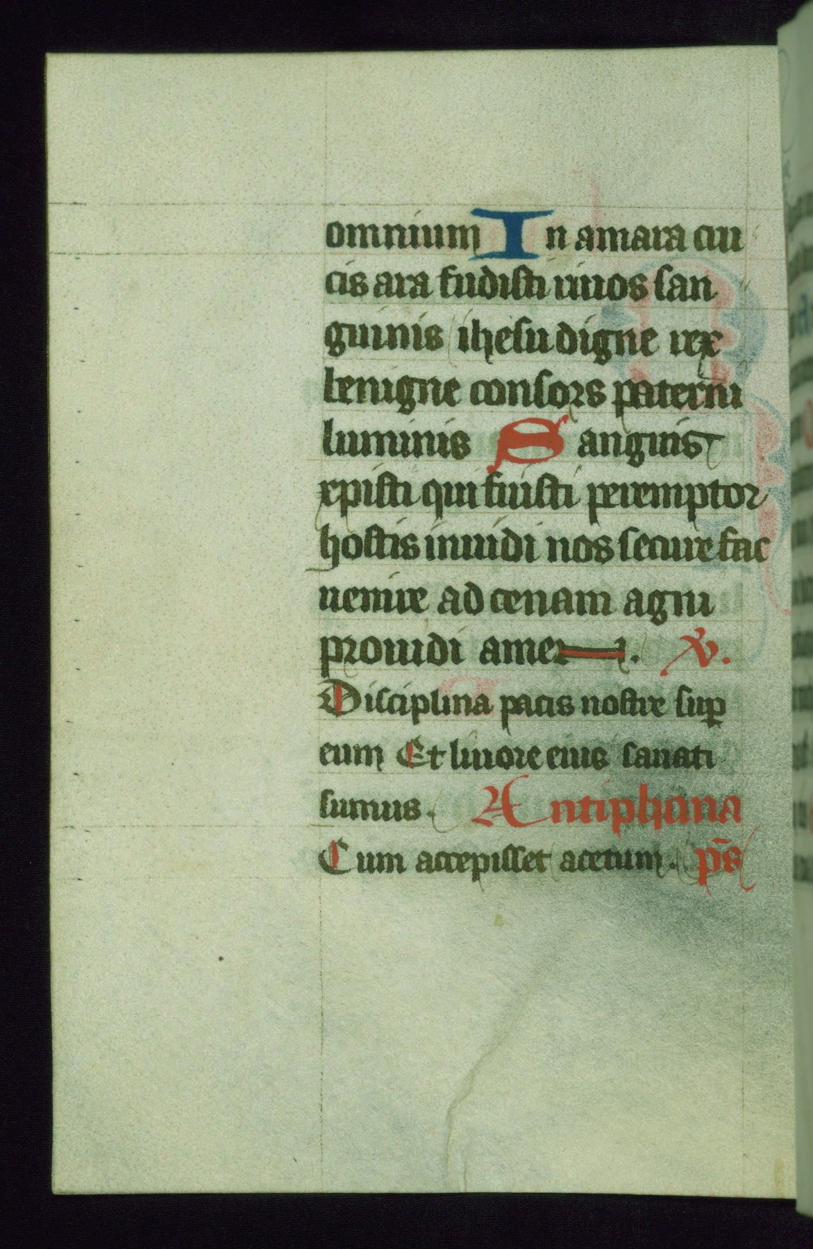 This prayer book was produced ca. 1430-40, likely in Brabant, but the contents of the calendar point to Tournai and Cambrai, and the Office of the Dead is for the use of Liège. North Netherlandish influence, possibly connected with works by the Masters of the Gold Scrolls, is suggested by the style and iconography of its images. The manuscript is notable for its large number of miniatures--forty-eight in total--as well as the sense of narrative within them, and the diversity of the suffrages they illustrate is striking. That the original owner had a strong interest in the Passion is evident in both the choice of texts and the images. The manuscript was well used, and accrued not only additional prayers and suffrages, but devotional objects as well: a pilgrim's badge was once attached to the corner of the image for the suffrage to relics on fol. 160r.