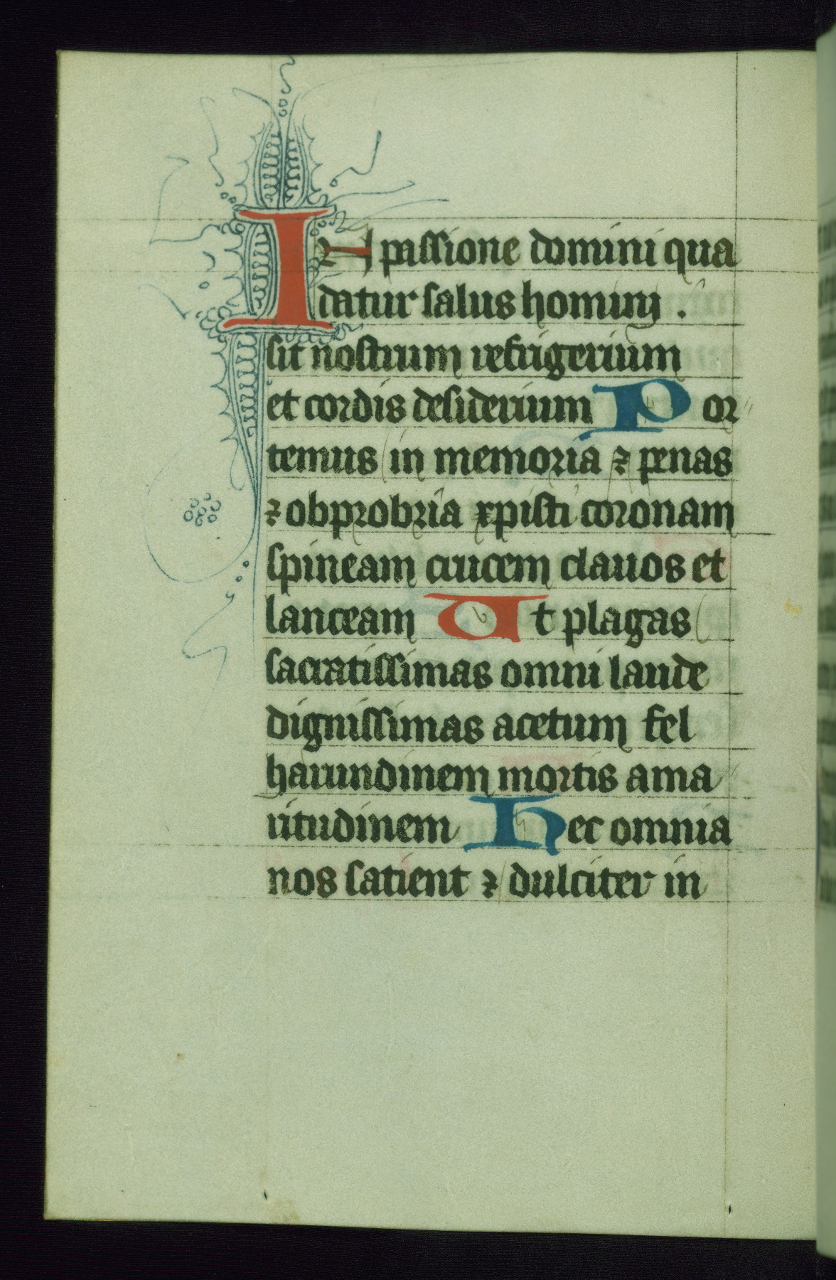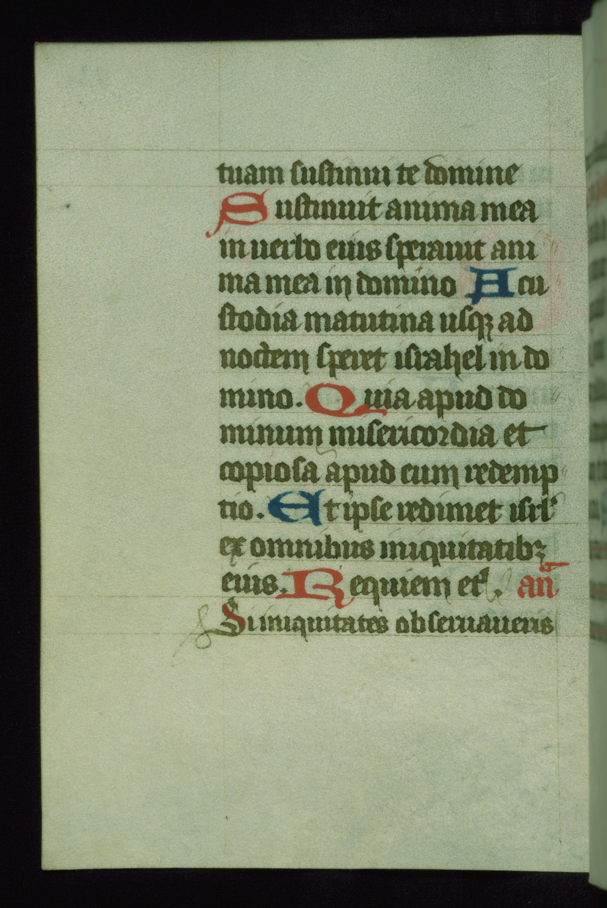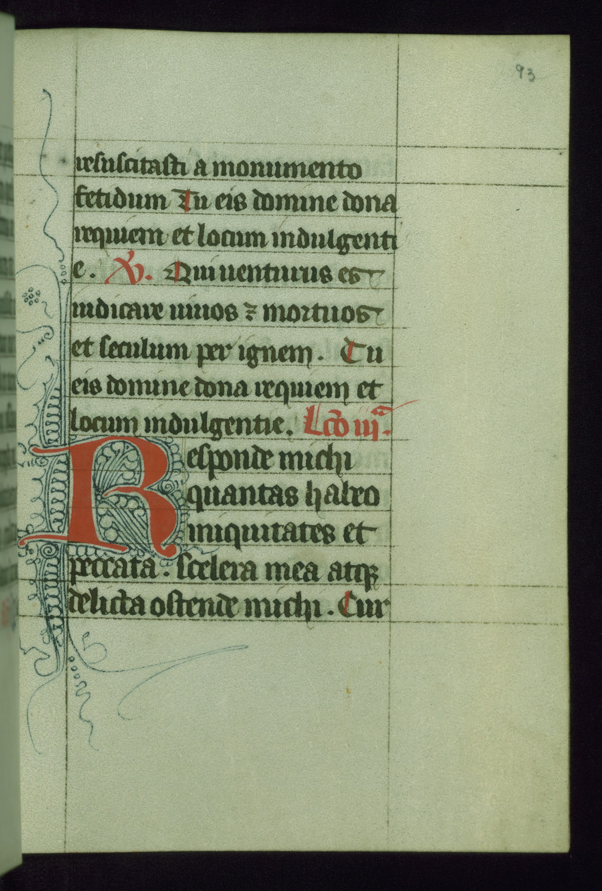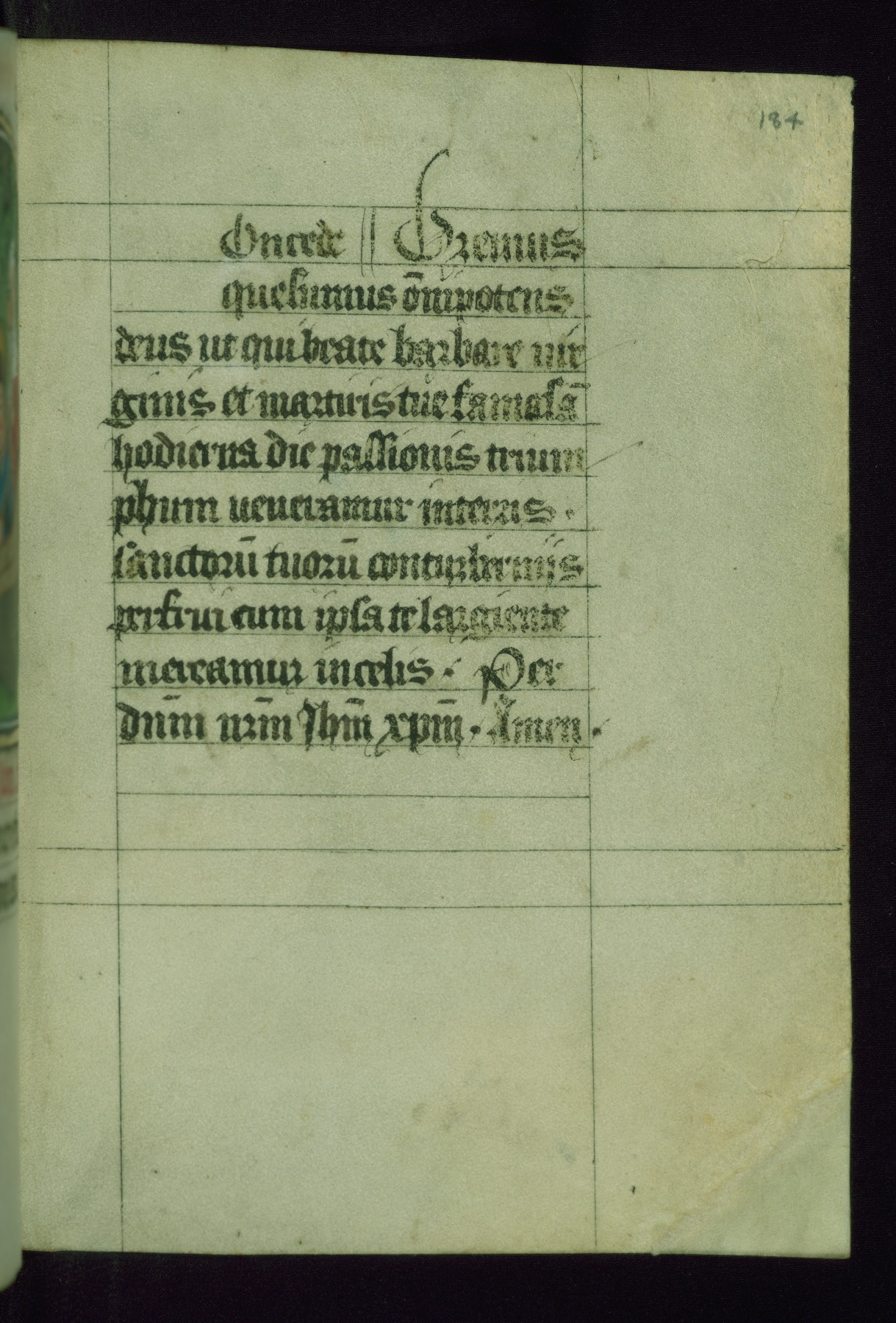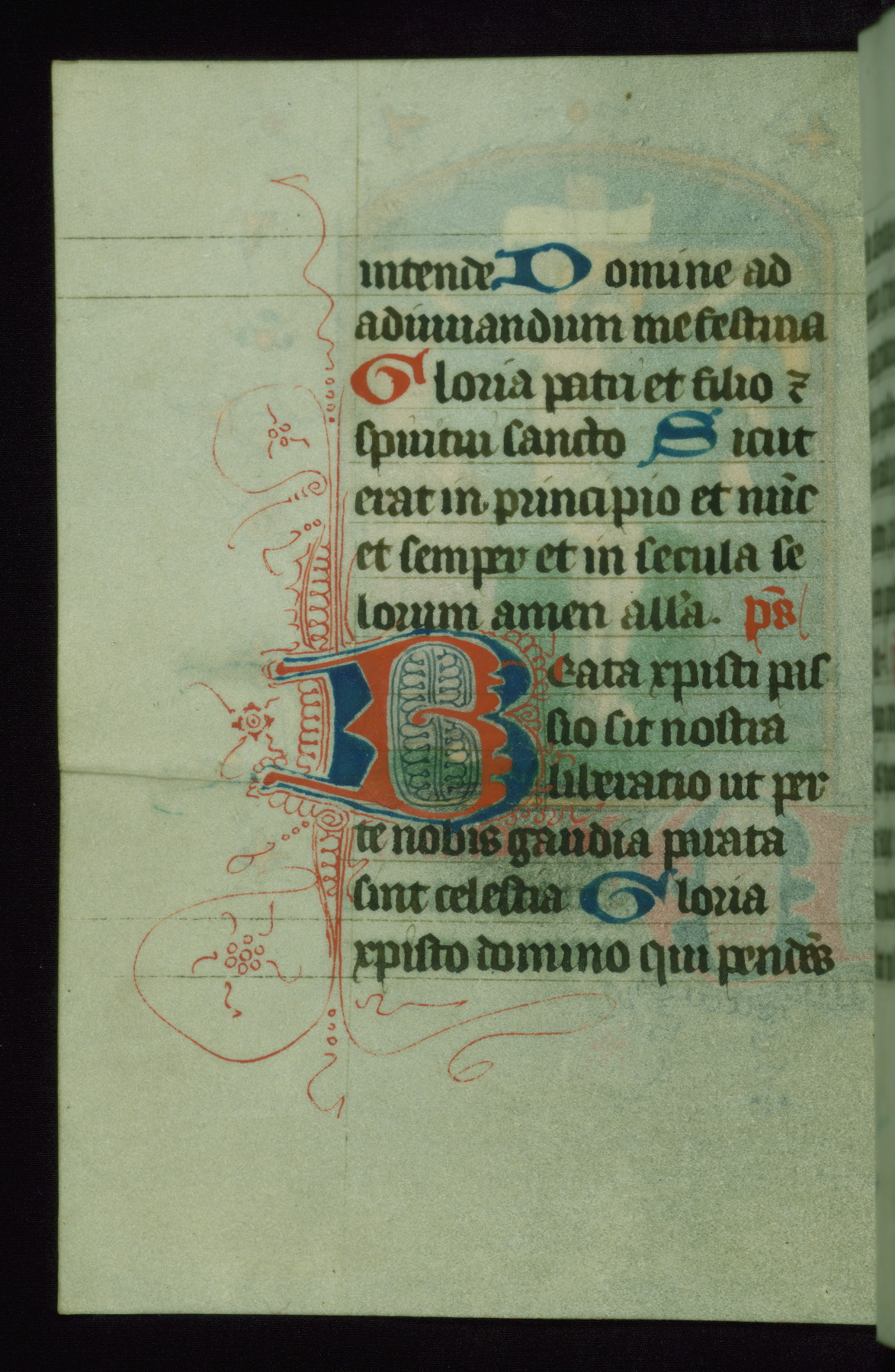This prayer book was produced ca. 1430-40, likely in Brabant, but the contents of the calendar point to Tournai and Cambrai, and the Office of the Dead is for the use of Liège. North Netherlandish influence, possibly connected with works by the Masters of the Gold Scrolls, is suggested by the style and iconography of its images. The manuscript is notable for its large number of miniatures--forty-eight in total--as well as the sense of narrative within them, and the diversity of the suffrages they illustrate is striking. That the original owner had a strong interest in the Passion is evident in both the choice of texts and the images. The manuscript was well used, and accrued not only additional prayers and suffrages, but devotional objects as well: a pilgrim's badge was once attached to the corner of the image for the suffrage to relics on fol. 160r.