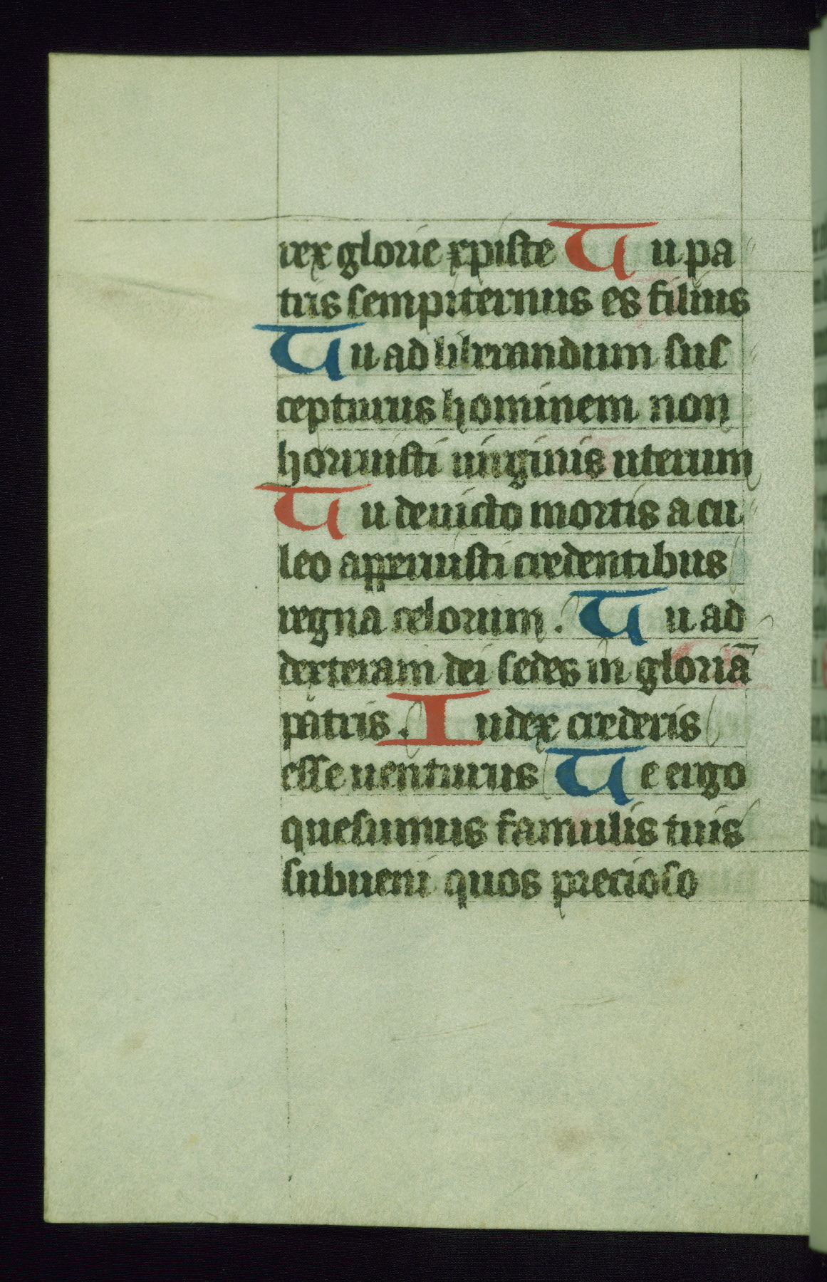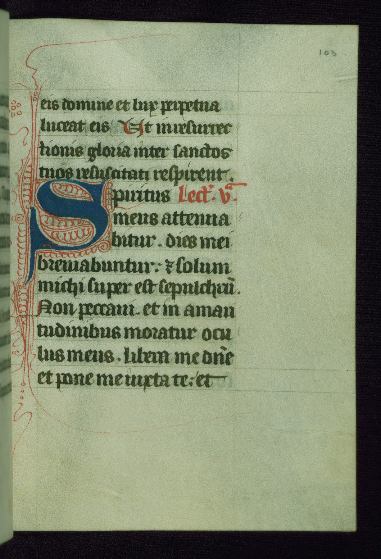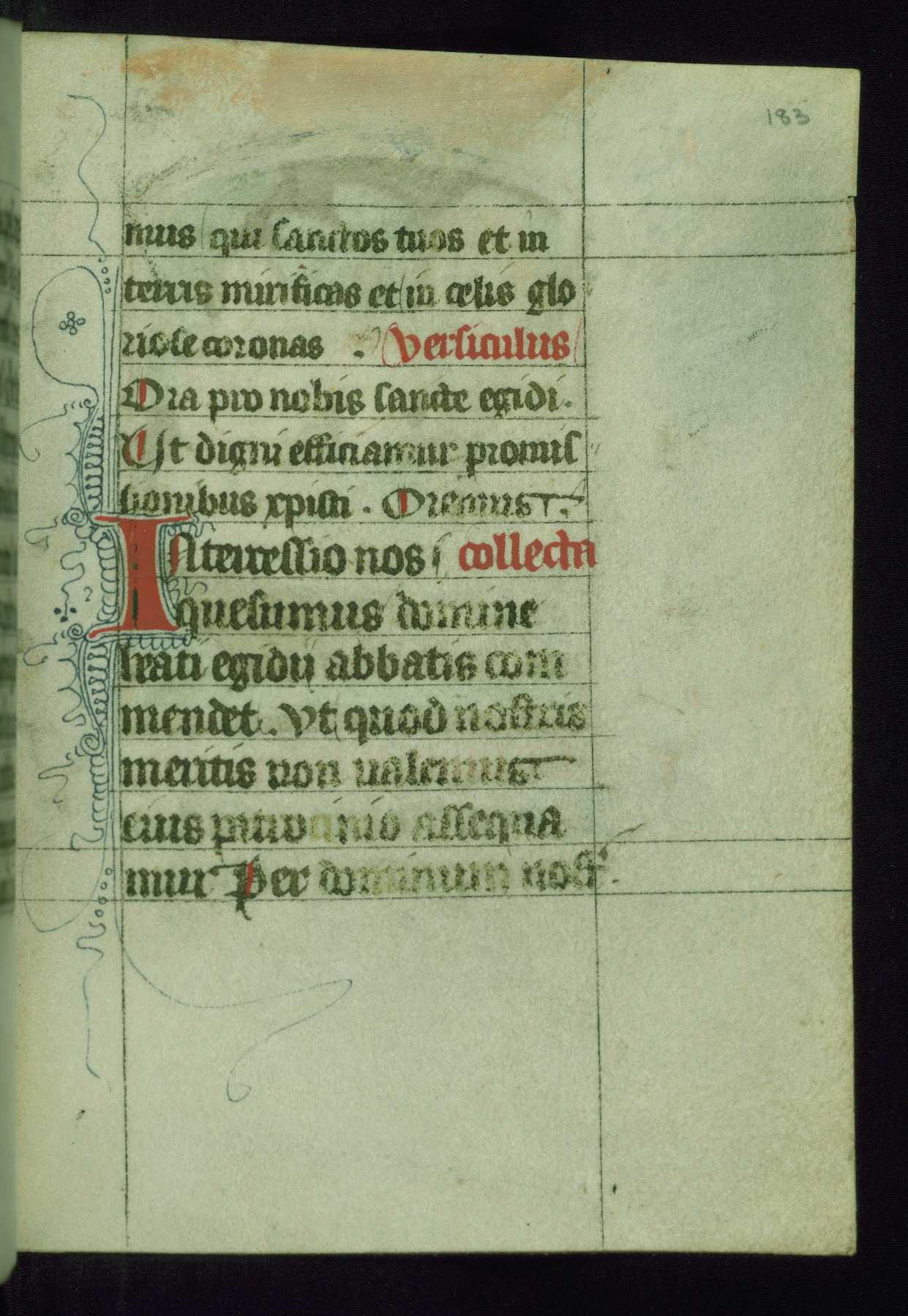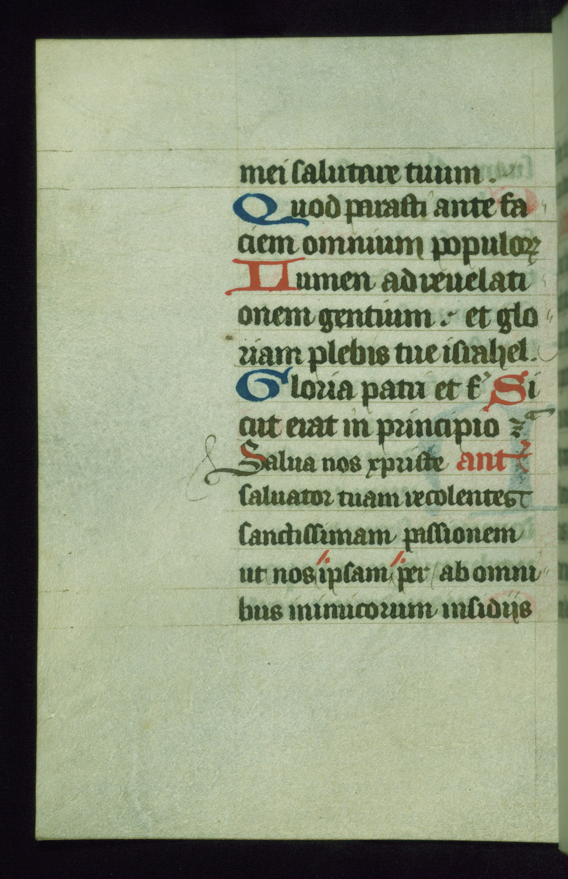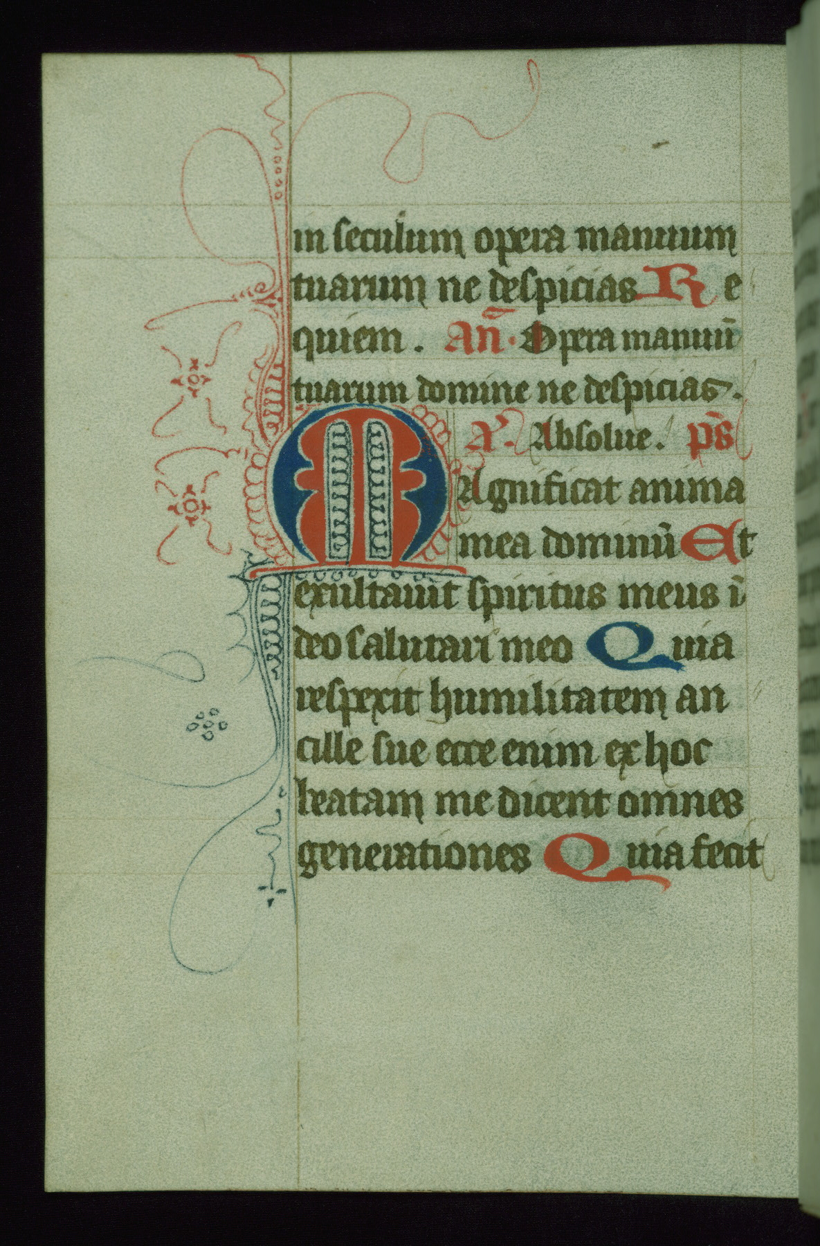 This prayer book was produced ca. 1430-40, likely in Brabant, but the contents of the calendar point to Tournai and Cambrai, and the Office of the Dead is for the use of Liège. North Netherlandish influence, possibly connected with works by the Masters of the Gold Scrolls, is suggested by the style and iconography of its images. The manuscript is notable for its large number of miniatures--forty-eight in total--as well as the sense of narrative within them, and the diversity of the suffrages they illustrate is striking. That the original owner had a strong interest in the Passion is evident in both the choice of texts and the images. The manuscript was well used, and accrued not only additional prayers and suffrages, but devotional objects as well: a pilgrim's badge was once attached to the corner of the image for the suffrage to relics on fol. 160r.