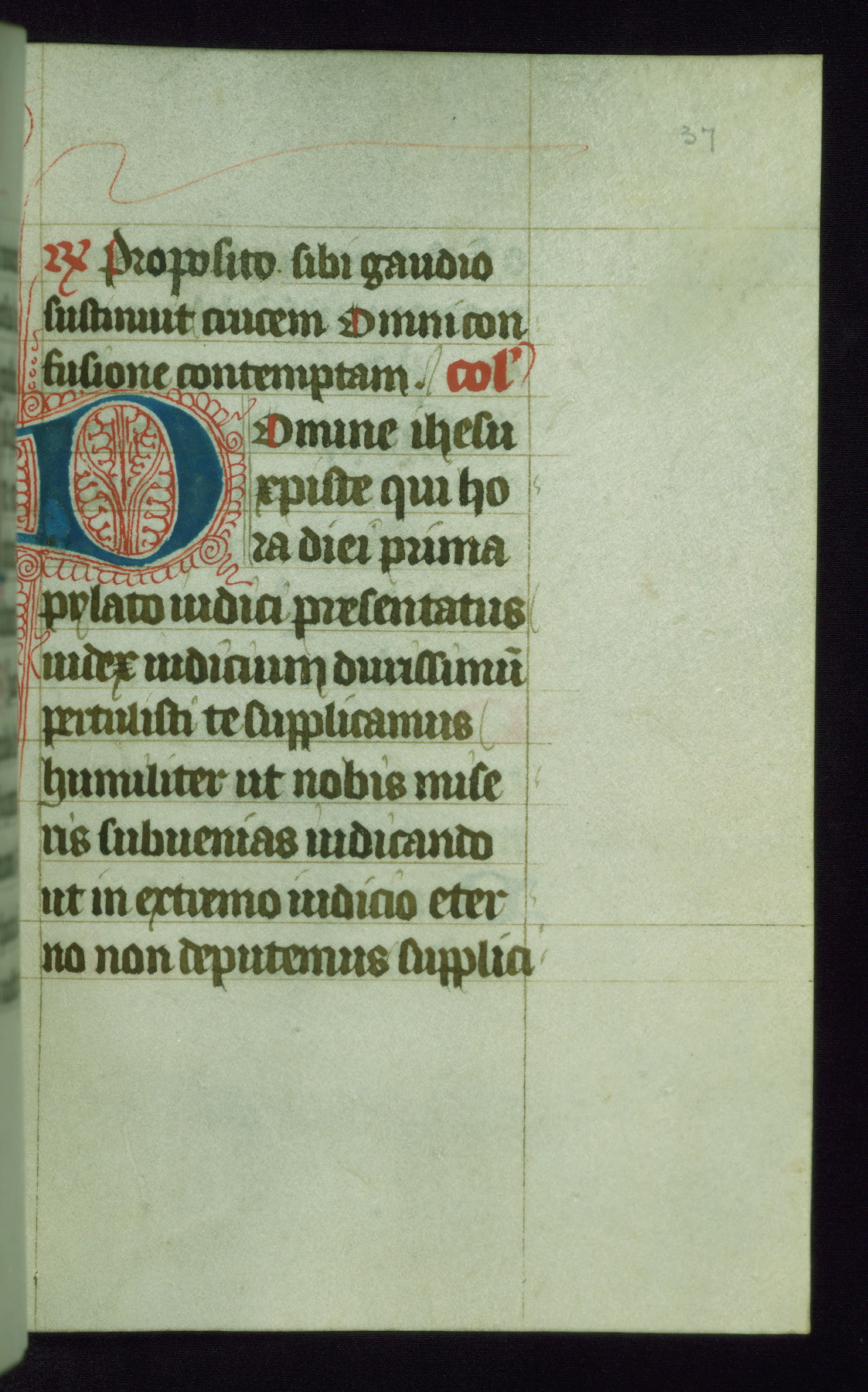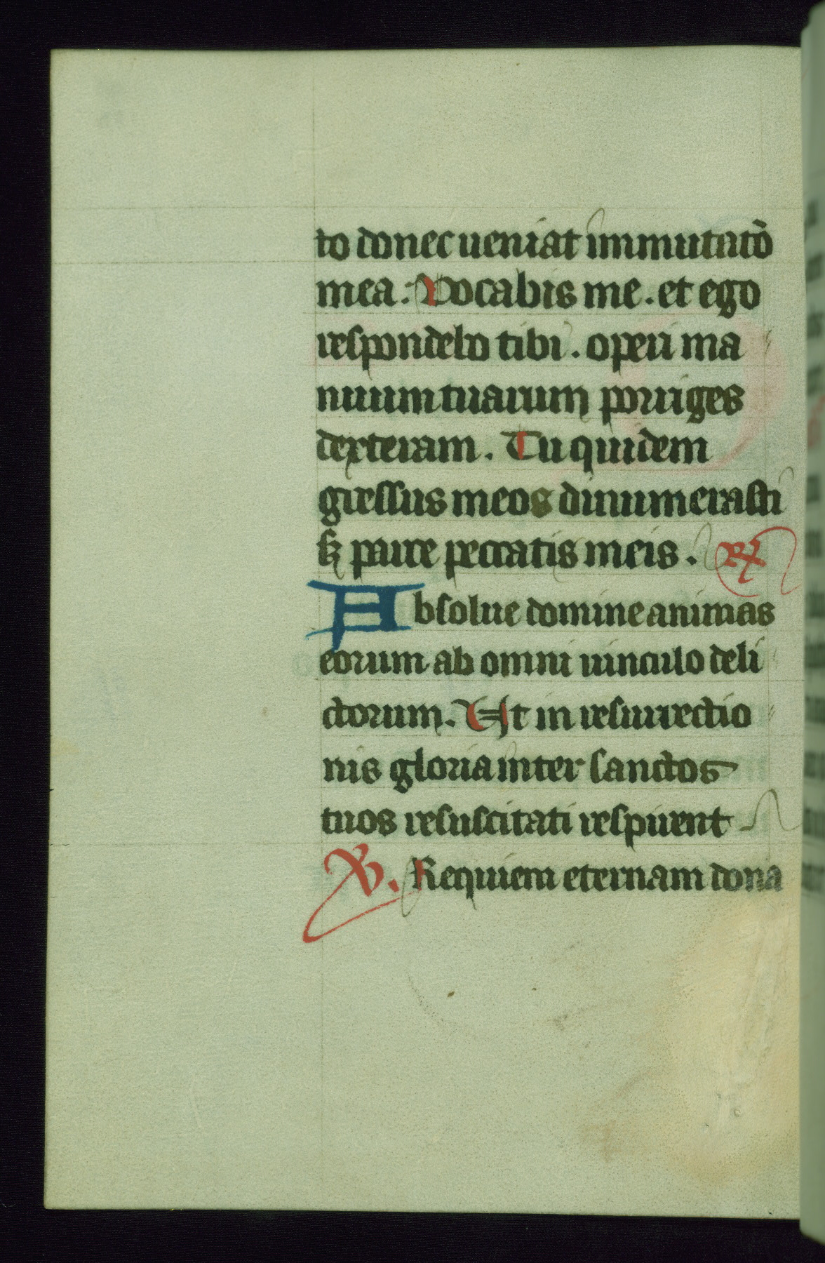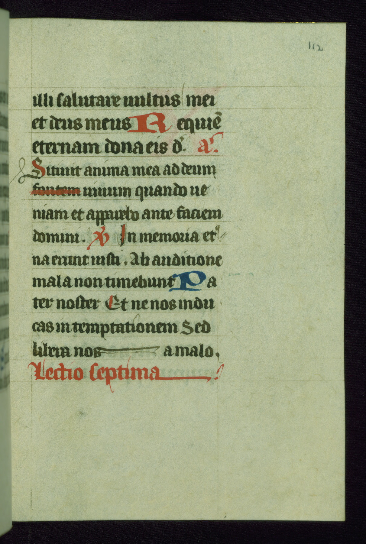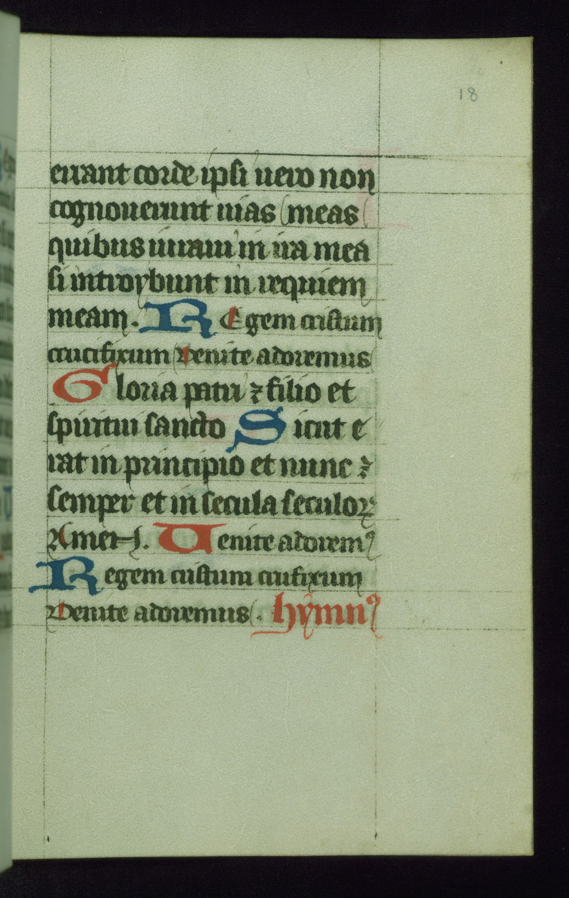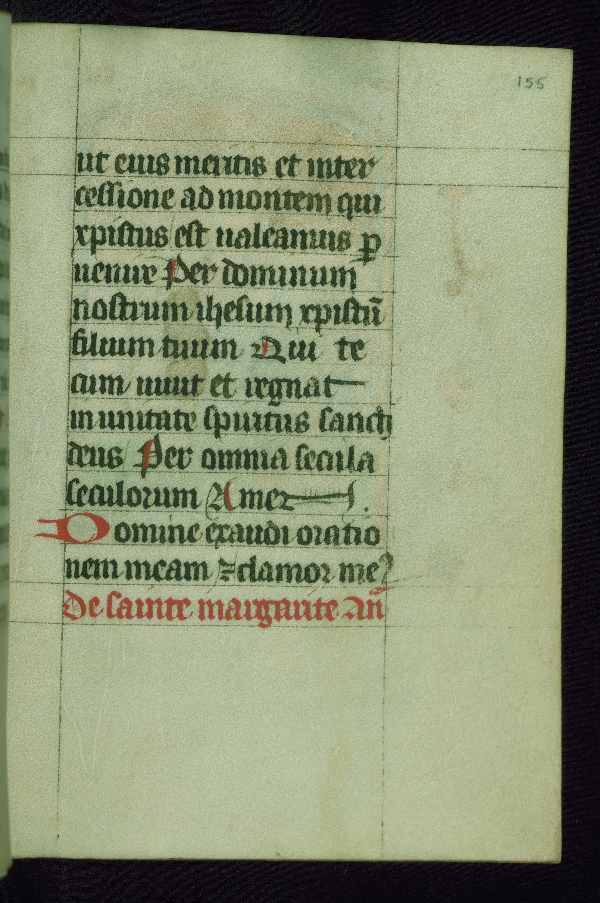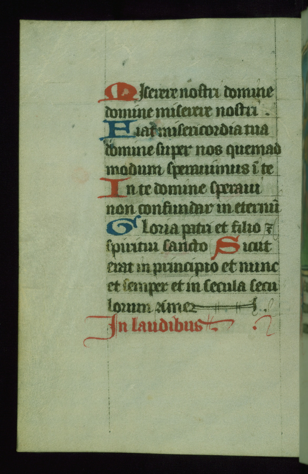 This prayer book was produced ca. 1430-40, likely in Brabant, but the contents of the calendar point to Tournai and Cambrai, and the Office of the Dead is for the use of Liège. North Netherlandish influence, possibly connected with works by the Masters of the Gold Scrolls, is suggested by the style and iconography of its images. The manuscript is notable for its large number of miniatures--forty-eight in total--as well as the sense of narrative within them, and the diversity of the suffrages they illustrate is striking. That the original owner had a strong interest in the Passion is evident in both the choice of texts and the images. The manuscript was well used, and accrued not only additional prayers and suffrages, but devotional objects as well: a pilgrim's badge was once attached to the corner of the image for the suffrage to relics on fol. 160r.