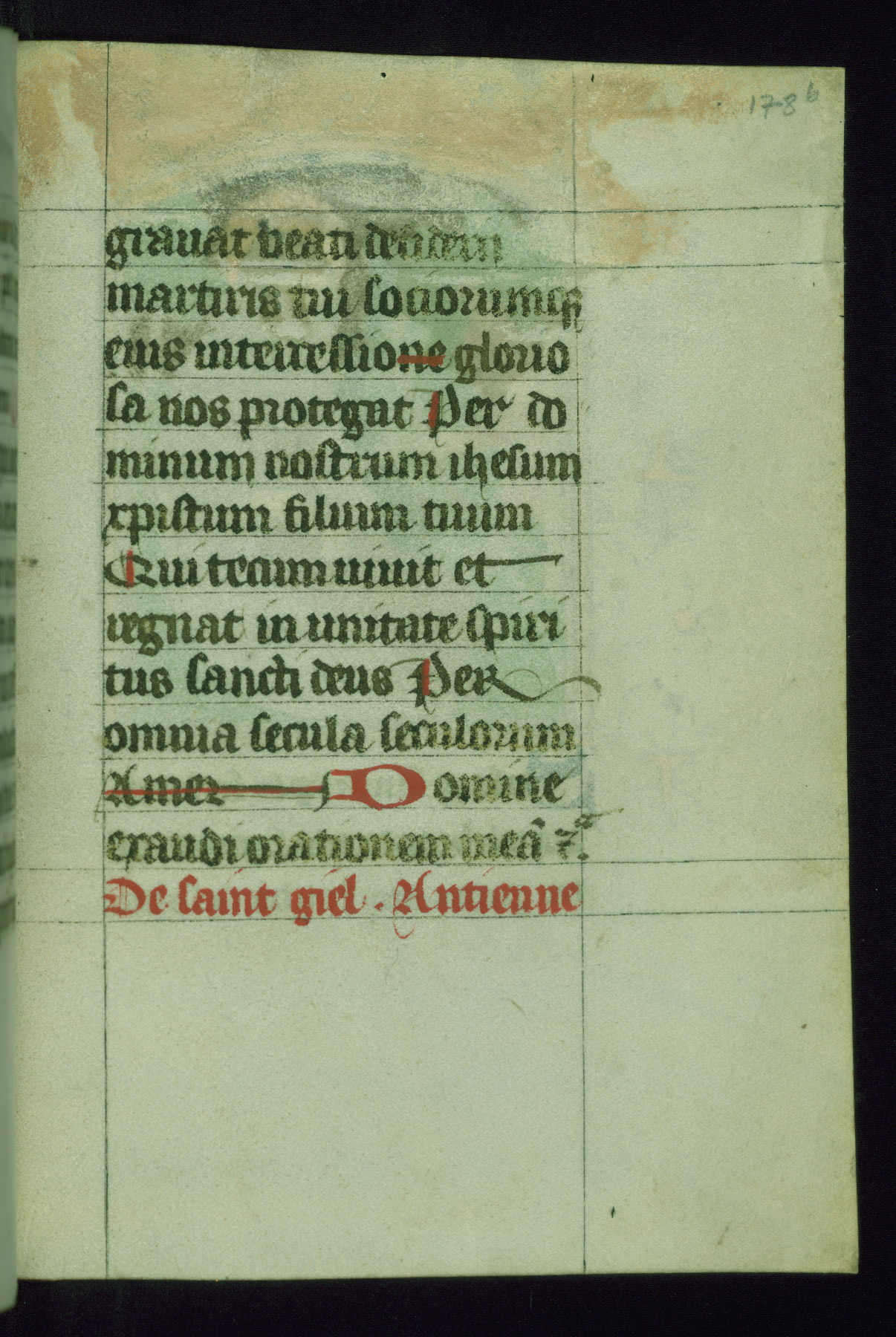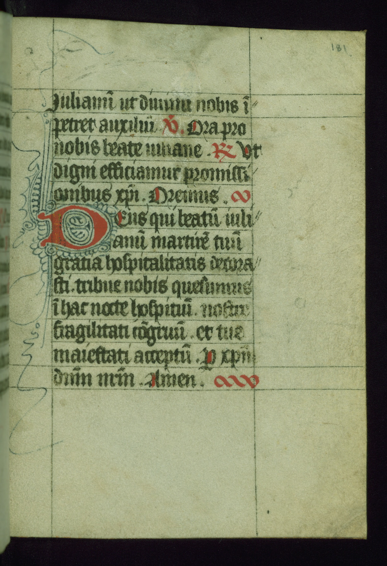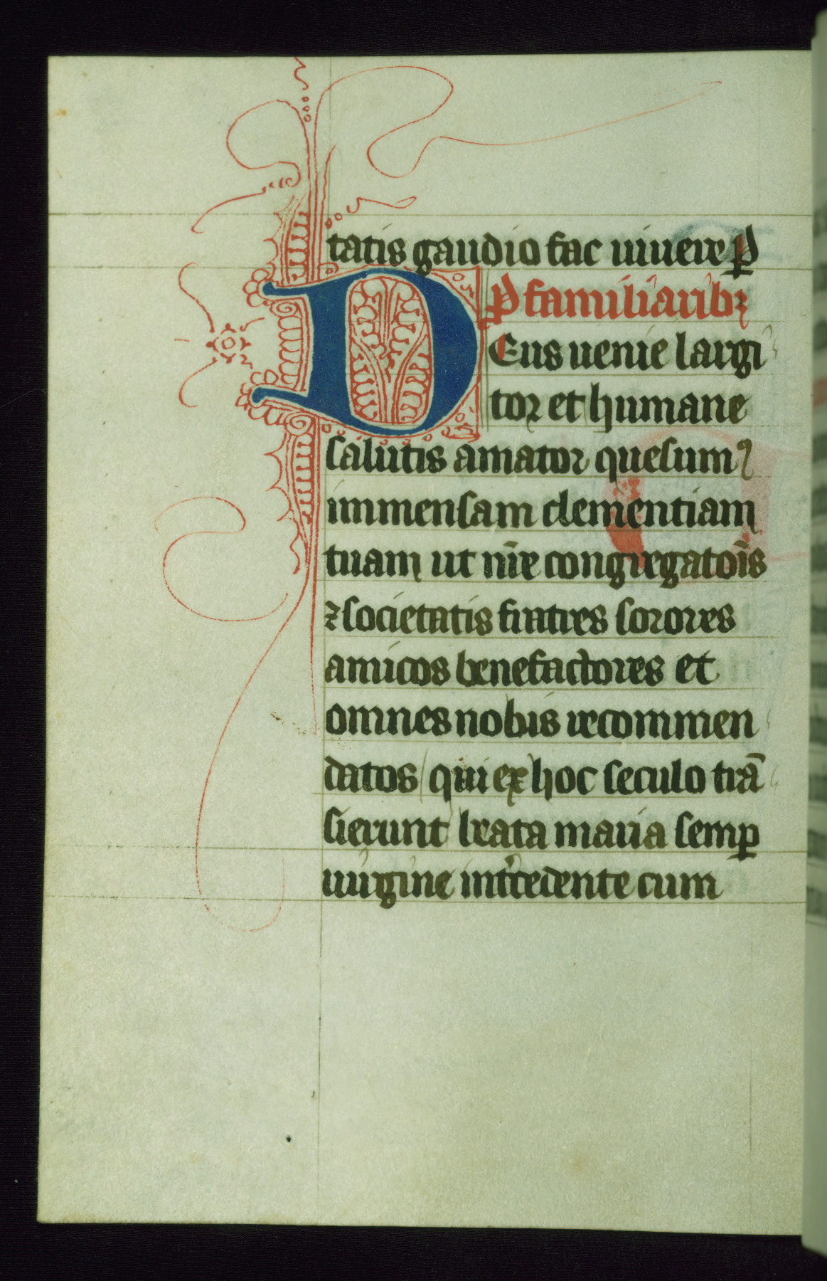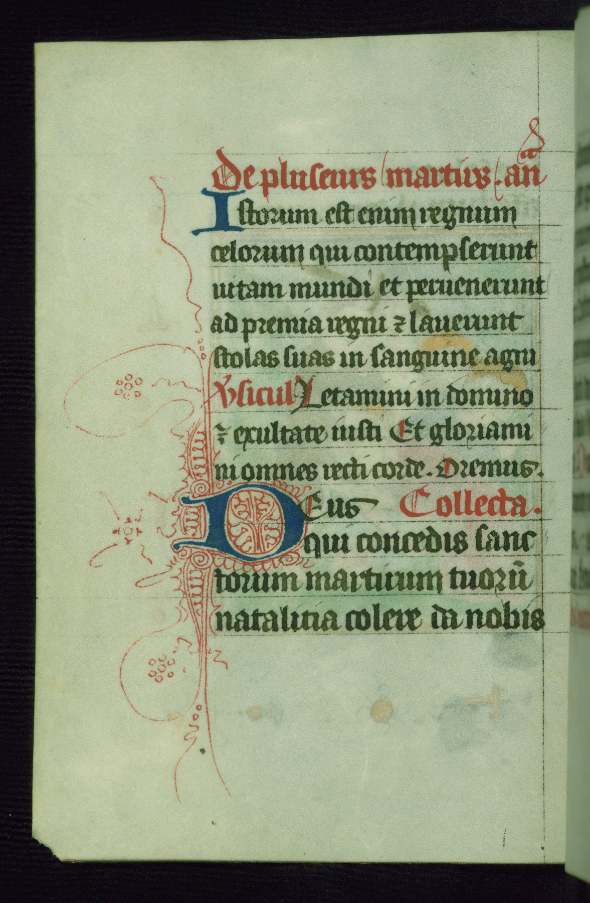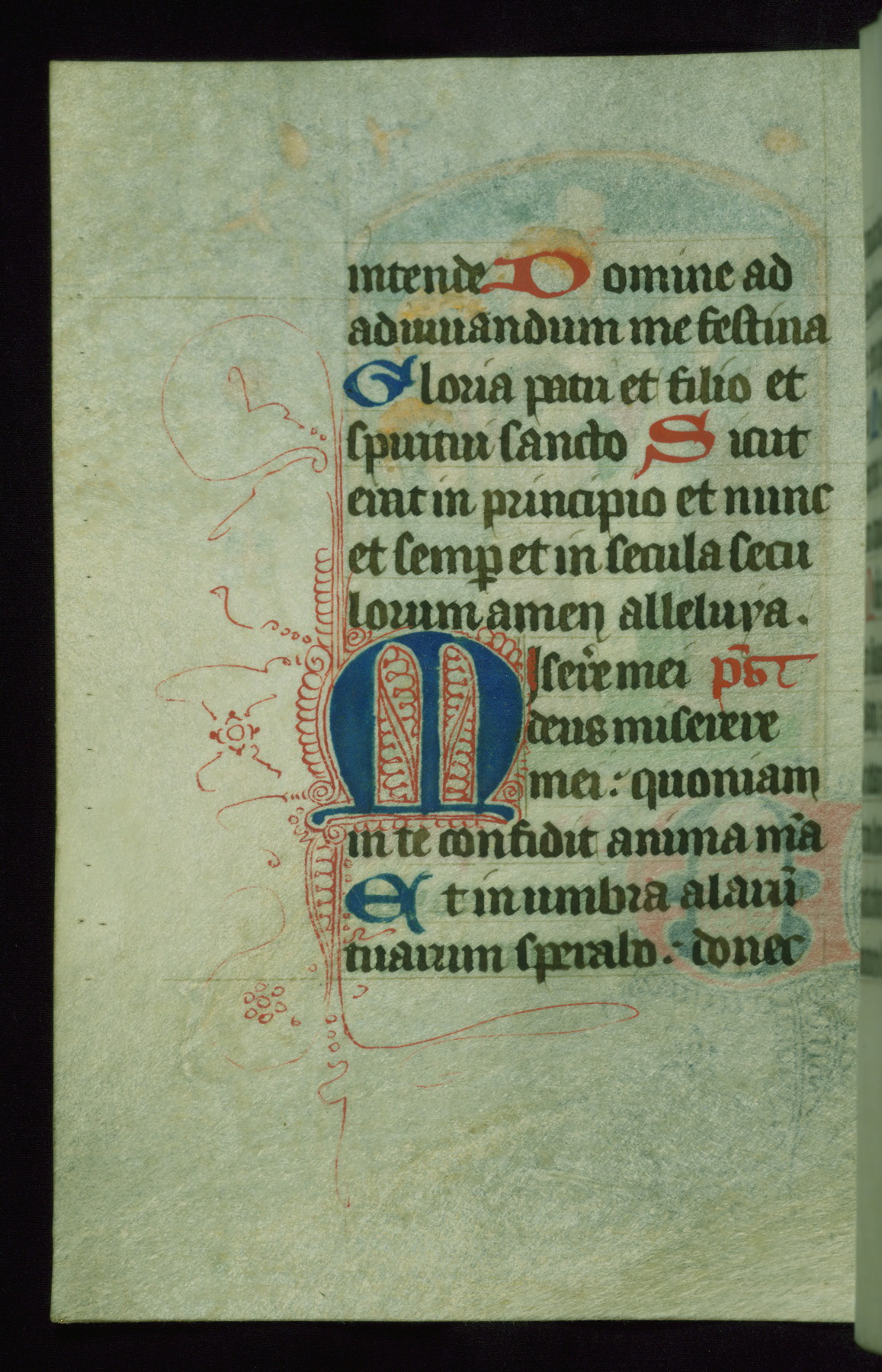 This prayer book was produced ca. 1430-40, likely in Brabant, but the contents of the calendar point to Tournai and Cambrai, and the Office of the Dead is for the use of Liège. North Netherlandish influence, possibly connected with works by the Masters of the Gold Scrolls, is suggested by the style and iconography of its images. The manuscript is notable for its large number of miniatures--forty-eight in total--as well as the sense of narrative within them, and the diversity of the suffrages they illustrate is striking. That the original owner had a strong interest in the Passion is evident in both the choice of texts and the images. The manuscript was well used, and accrued not only additional prayers and suffrages, but devotional objects as well: a pilgrim's badge was once attached to the corner of the image for the suffrage to relics on fol. 160r.
