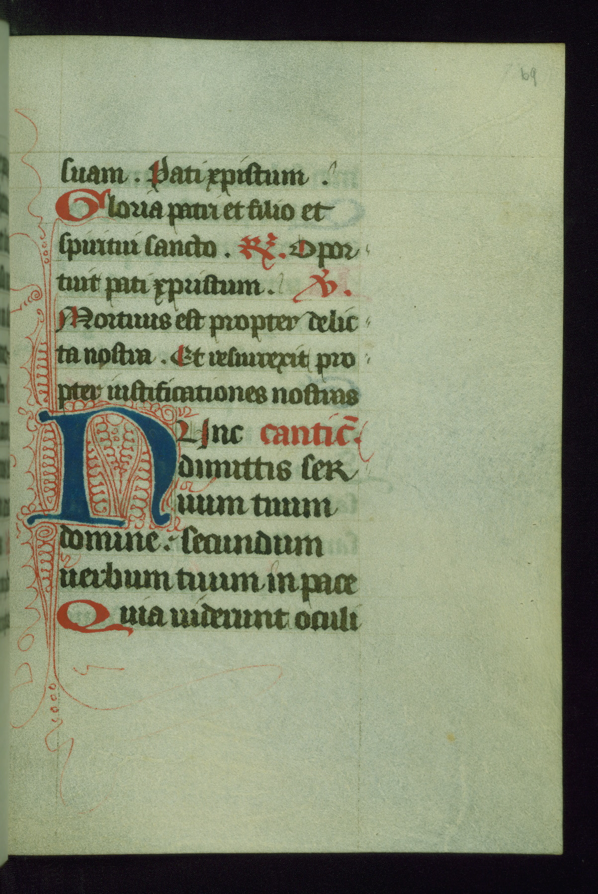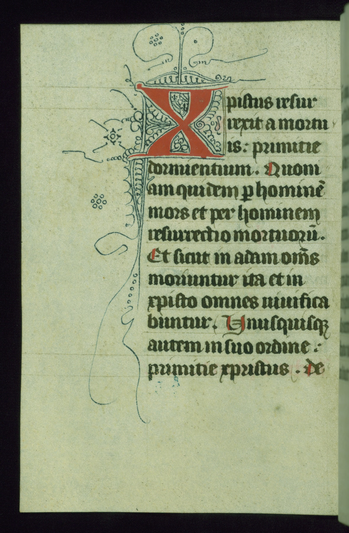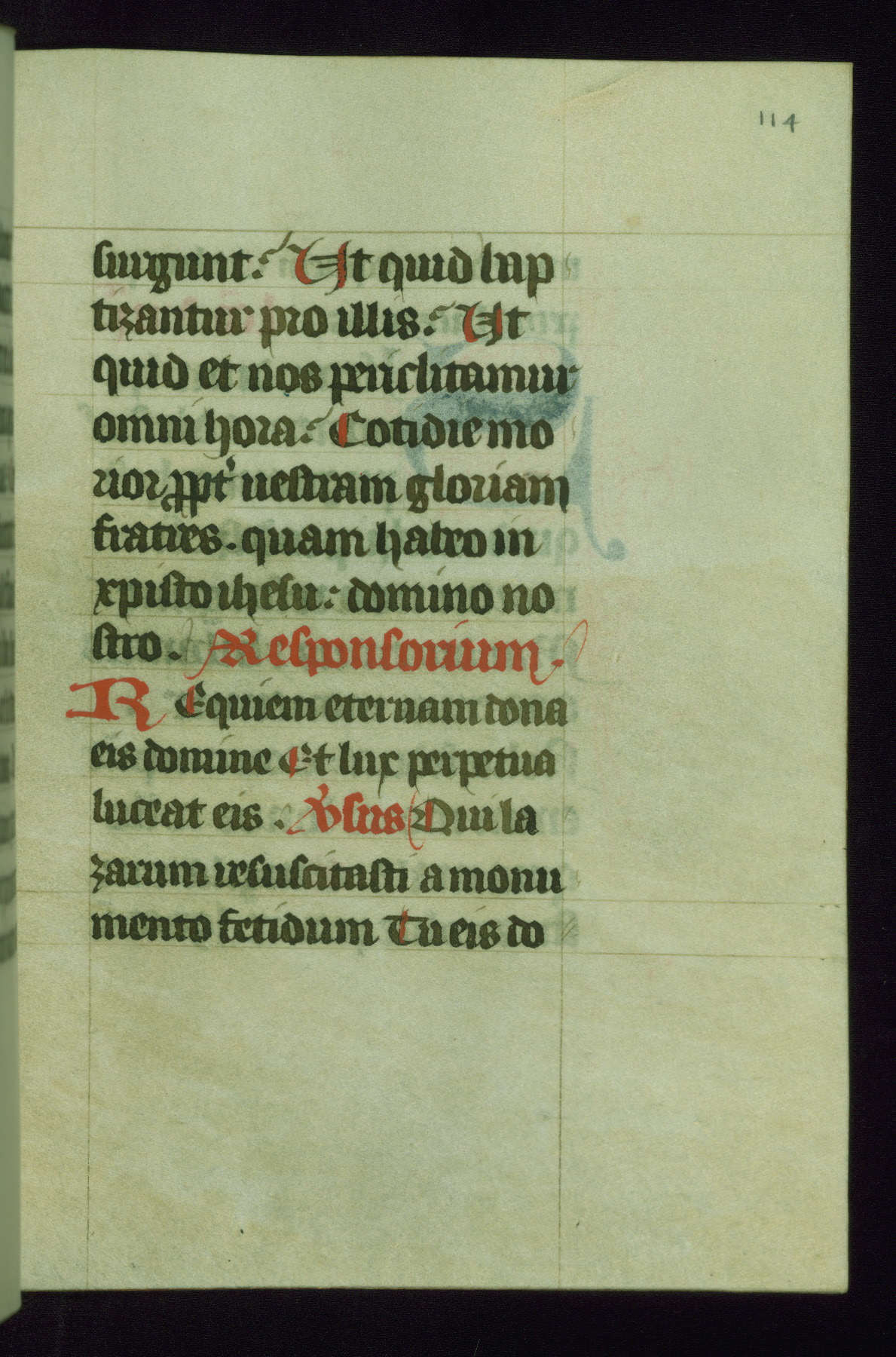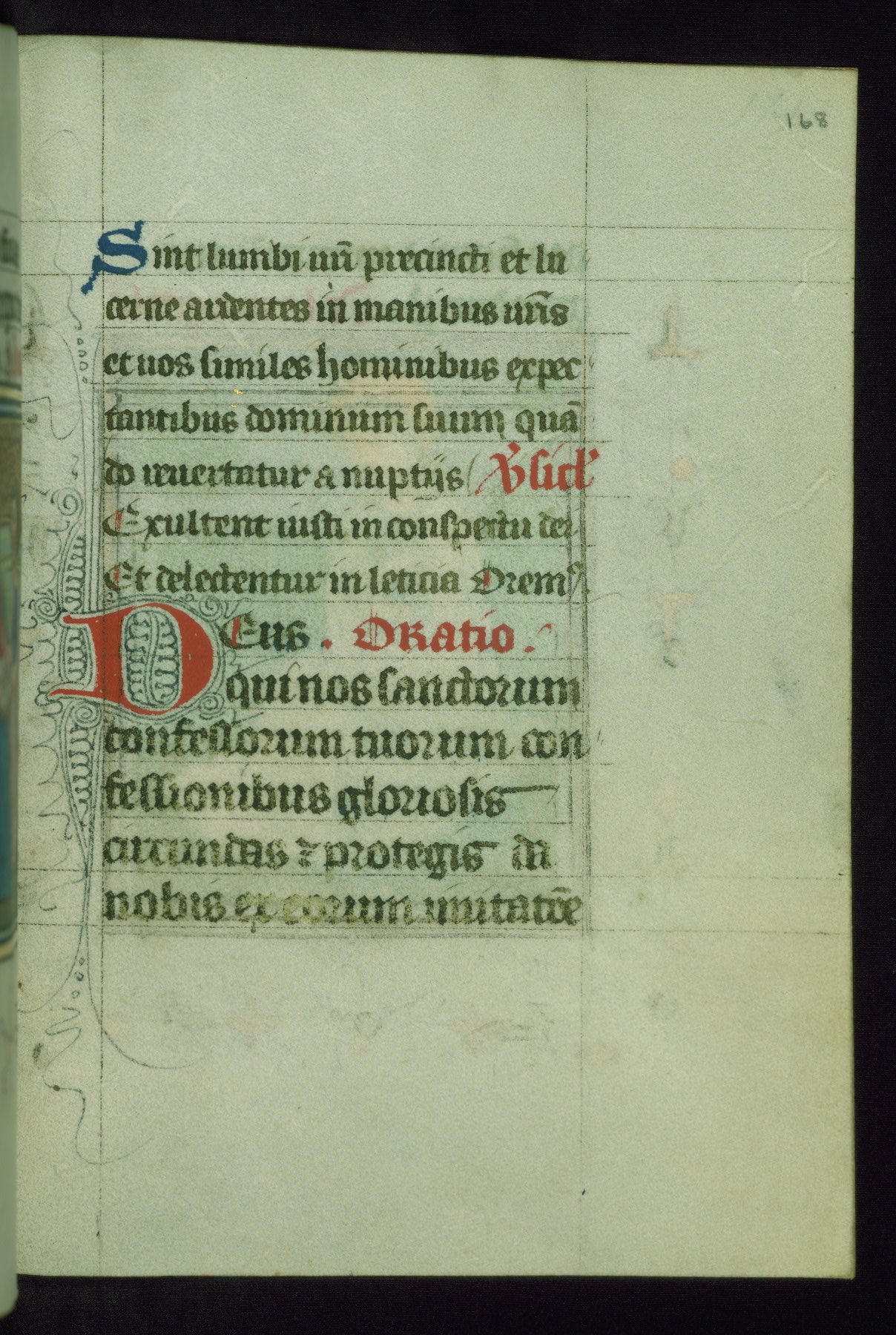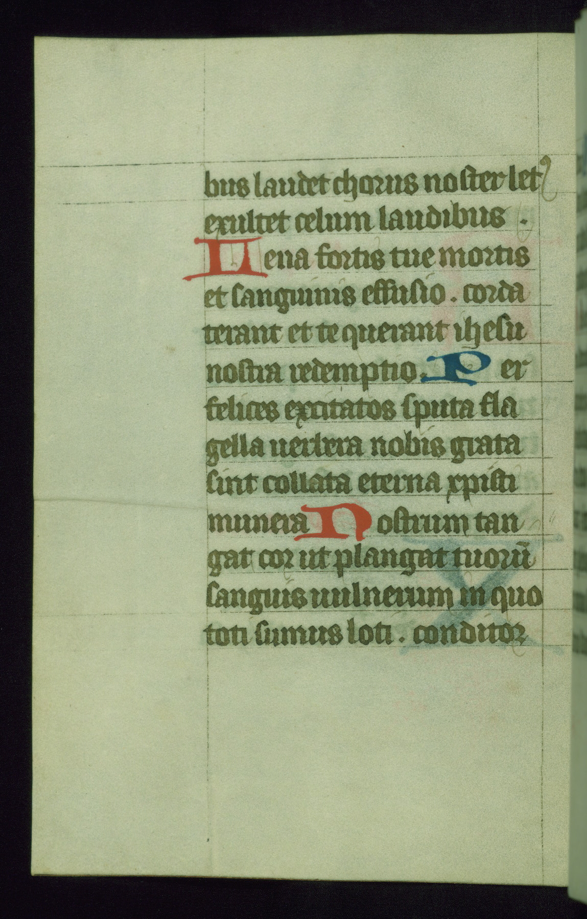 This prayer book was produced ca. 1430-40, likely in Brabant, but the contents of the calendar point to Tournai and Cambrai, and the Office of the Dead is for the use of Liège. North Netherlandish influence, possibly connected with works by the Masters of the Gold Scrolls, is suggested by the style and iconography of its images. The manuscript is notable for its large number of miniatures--forty-eight in total--as well as the sense of narrative within them, and the diversity of the suffrages they illustrate is striking. That the original owner had a strong interest in the Passion is evident in both the choice of texts and the images. The manuscript was well used, and accrued not only additional prayers and suffrages, but devotional objects as well: a pilgrim's badge was once attached to the corner of the image for the suffrage to relics on fol. 160r.