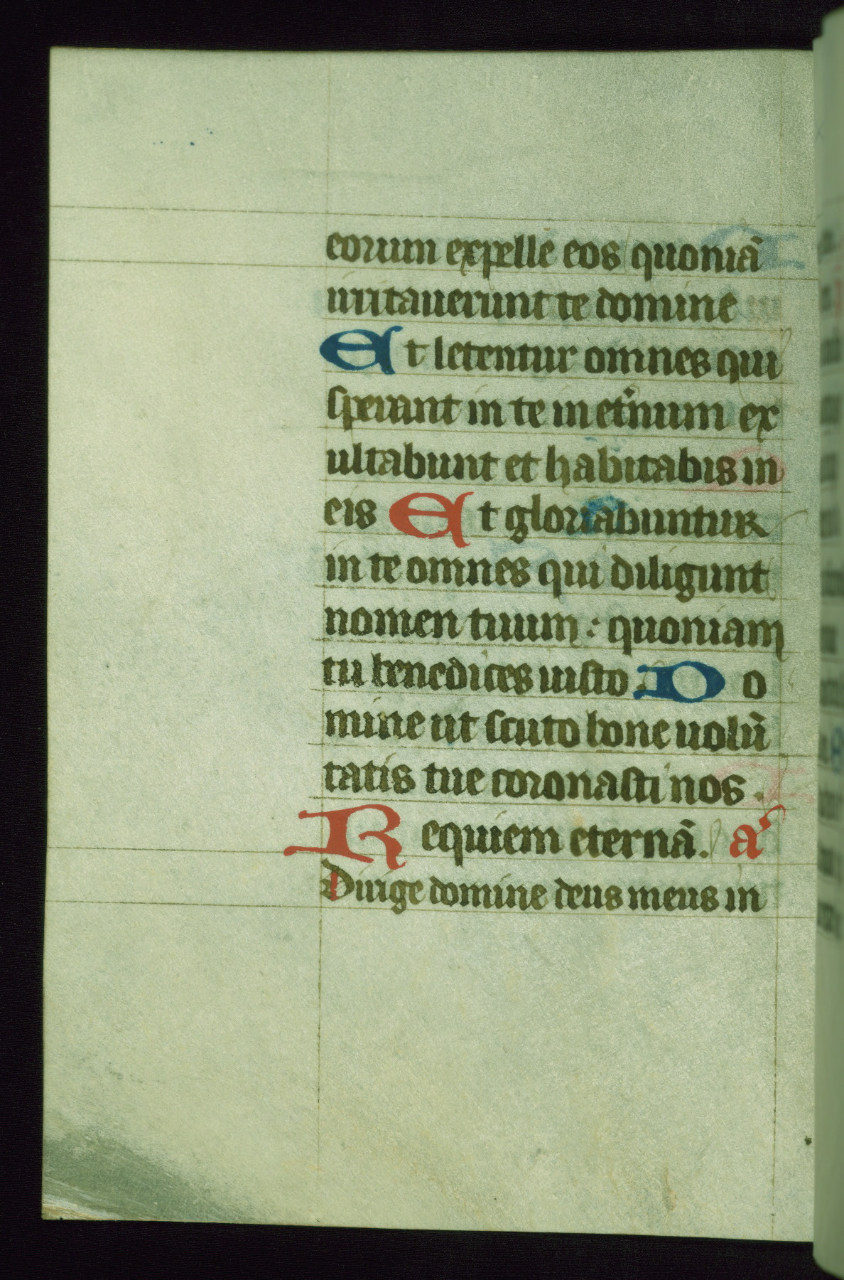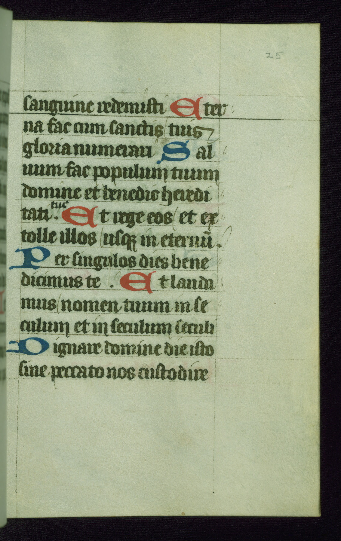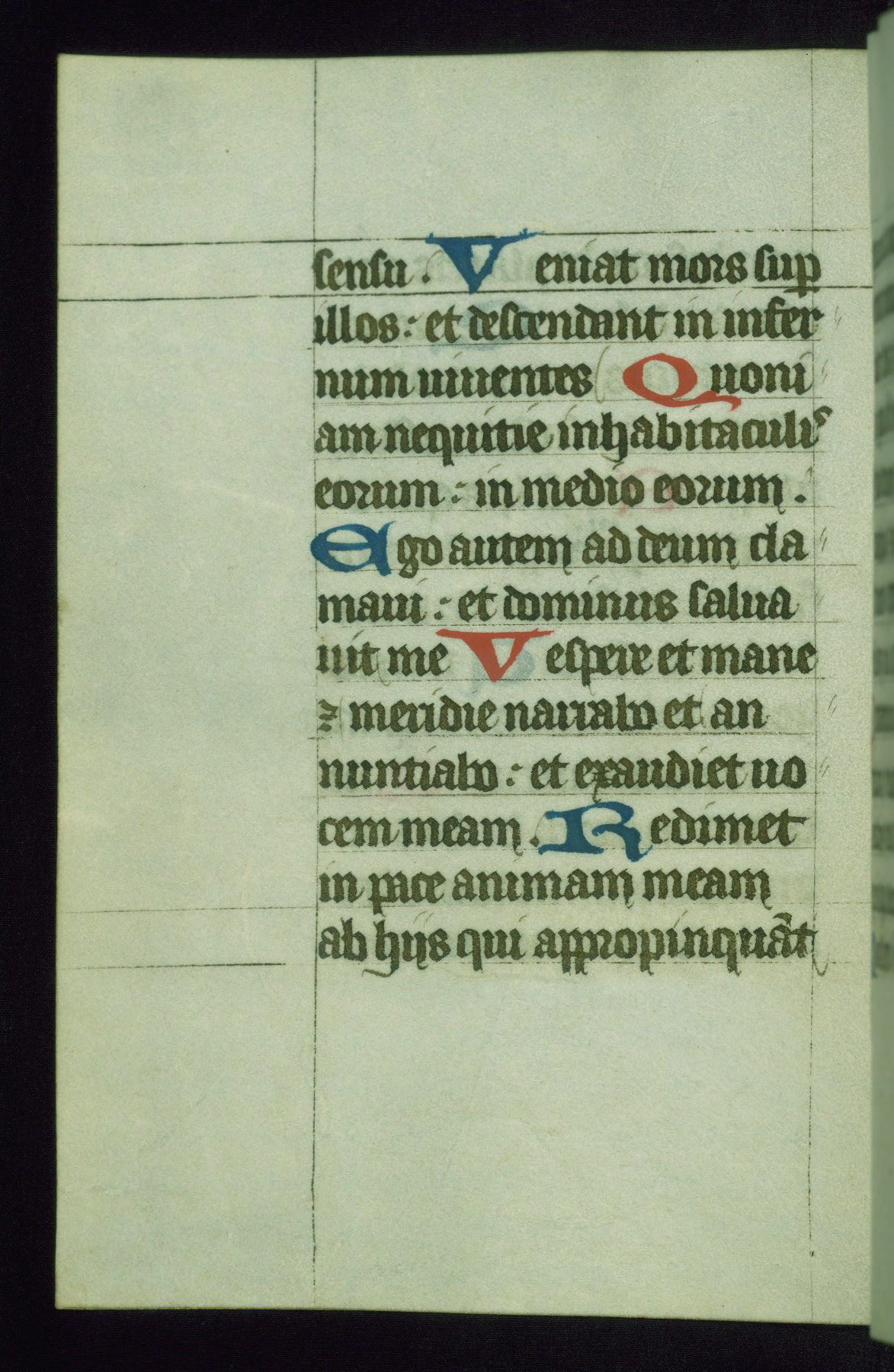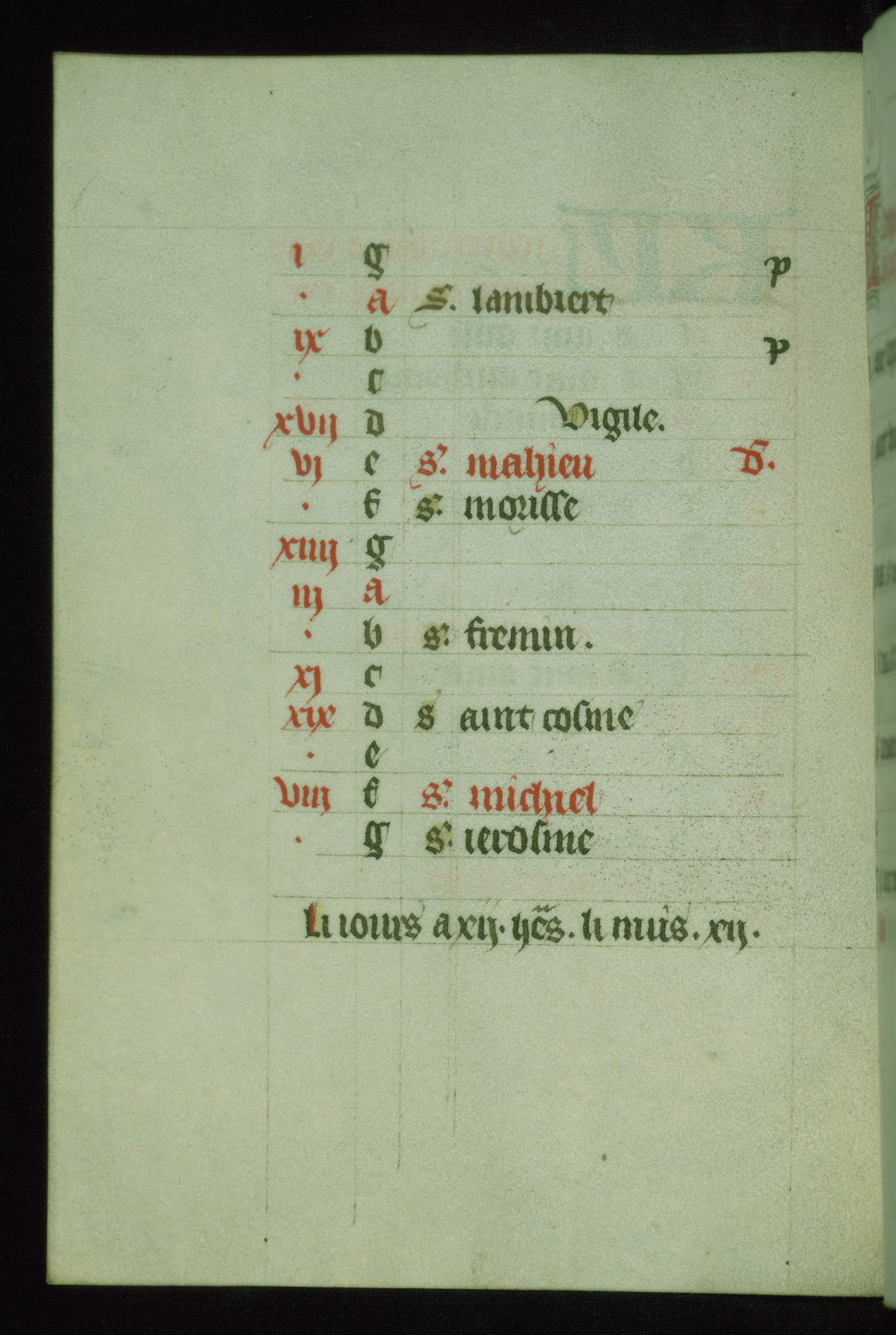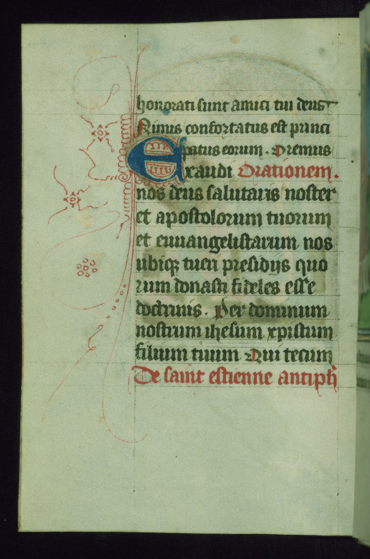 This prayer book was produced ca. 1430-40, likely in Brabant, but the contents of the calendar point to Tournai and Cambrai, and the Office of the Dead is for the use of Liège. North Netherlandish influence, possibly connected with works by the Masters of the Gold Scrolls, is suggested by the style and iconography of its images. The manuscript is notable for its large number of miniatures--forty-eight in total--as well as the sense of narrative within them, and the diversity of the suffrages they illustrate is striking. That the original owner had a strong interest in the Passion is evident in both the choice of texts and the images. The manuscript was well used, and accrued not only additional prayers and suffrages, but devotional objects as well: a pilgrim's badge was once attached to the corner of the image for the suffrage to relics on fol. 160r.