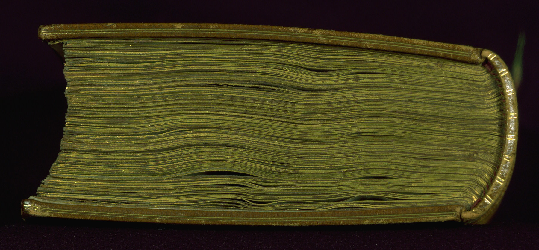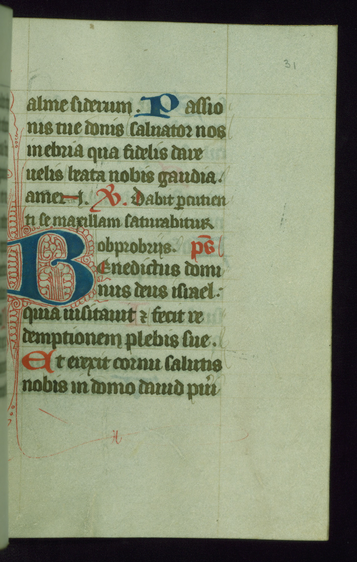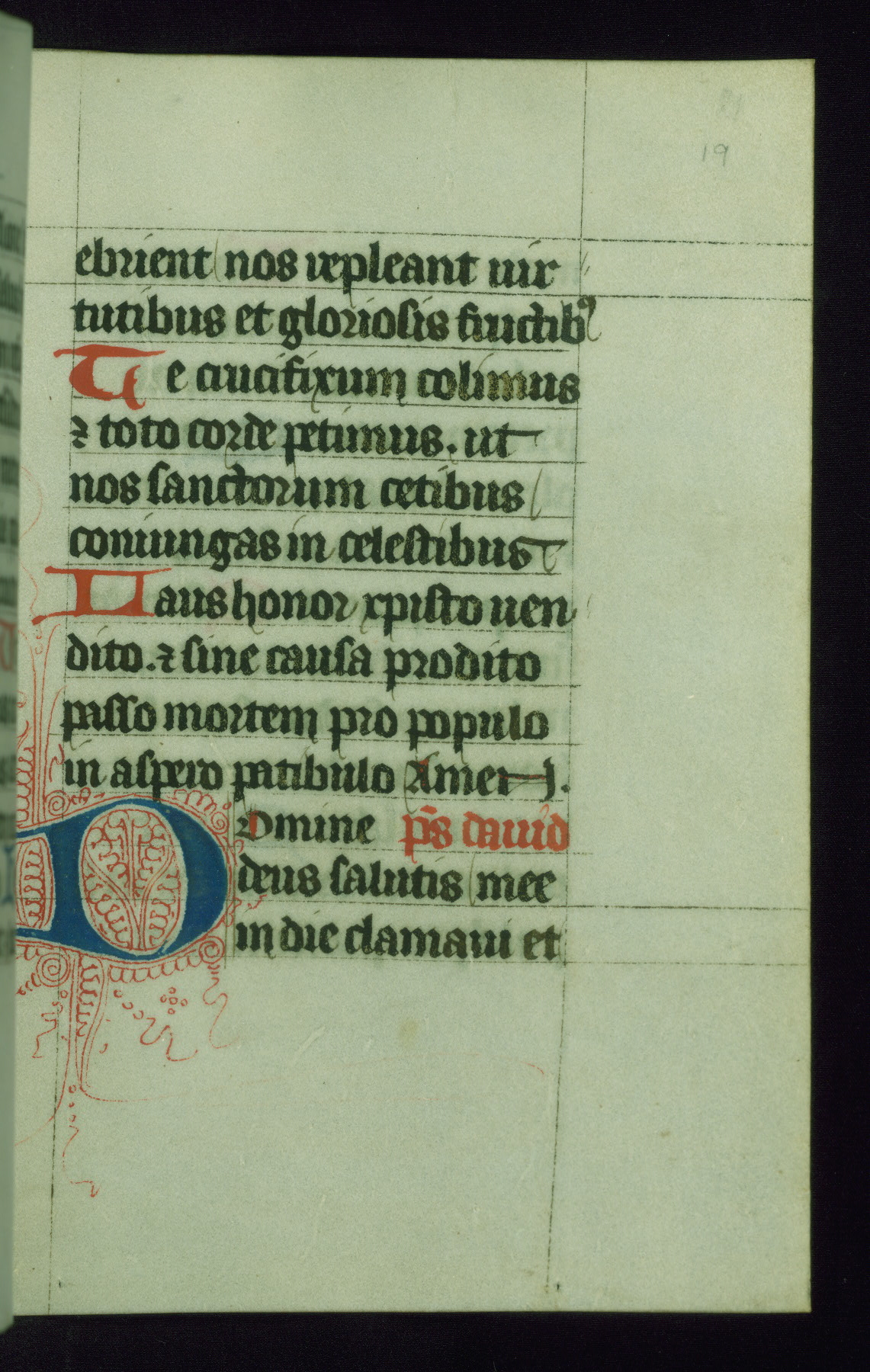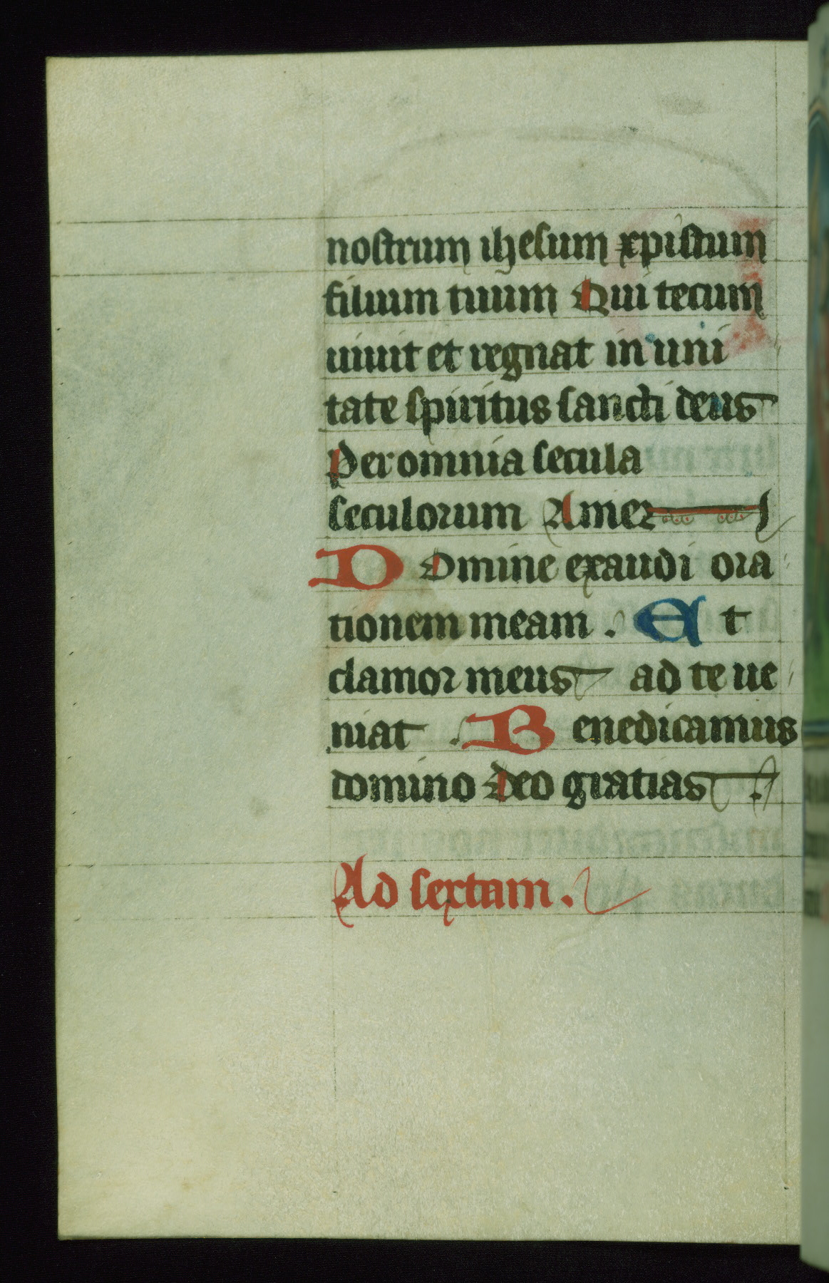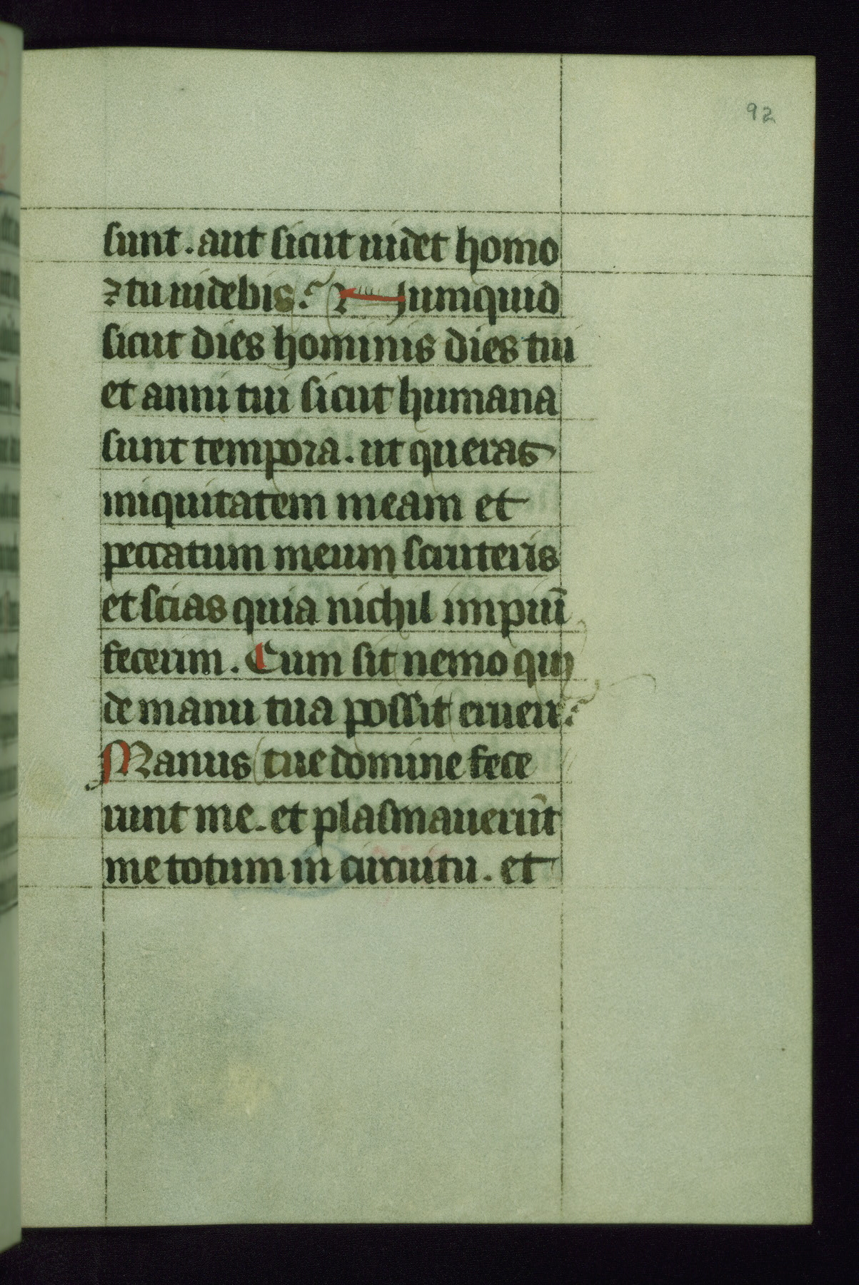 This prayer book was produced ca. 1430-40, likely in Brabant, but the contents of the calendar point to Tournai and Cambrai, and the Office of the Dead is for the use of Liège. North Netherlandish influence, possibly connected with works by the Masters of the Gold Scrolls, is suggested by the style and iconography of its images. The manuscript is notable for its large number of miniatures--forty-eight in total--as well as the sense of narrative within them, and the diversity of the suffrages they illustrate is striking. That the original owner had a strong interest in the Passion is evident in both the choice of texts and the images. The manuscript was well used, and accrued not only additional prayers and suffrages, but devotional objects as well: a pilgrim's badge was once attached to the corner of the image for the suffrage to relics on fol. 160r.