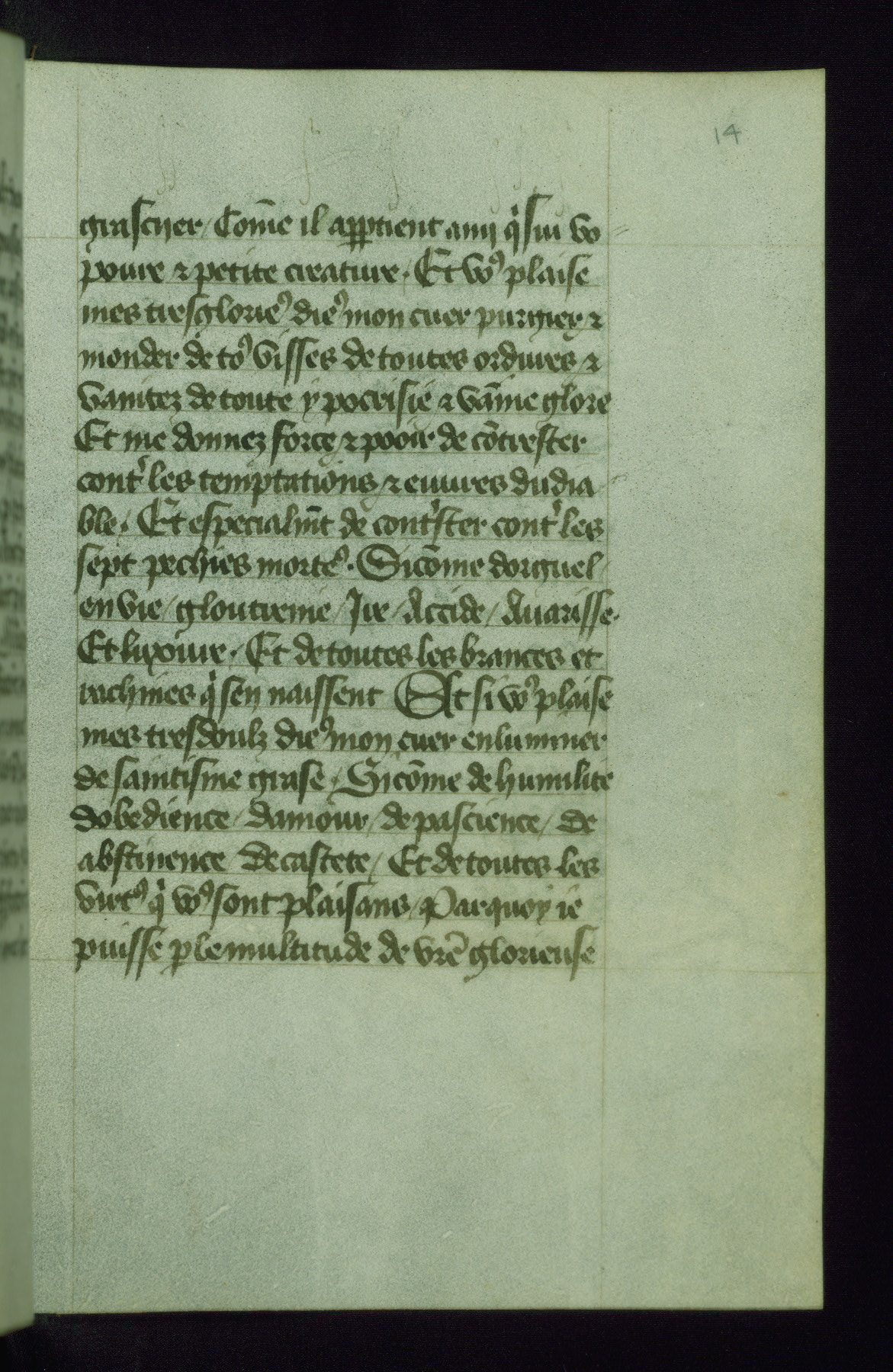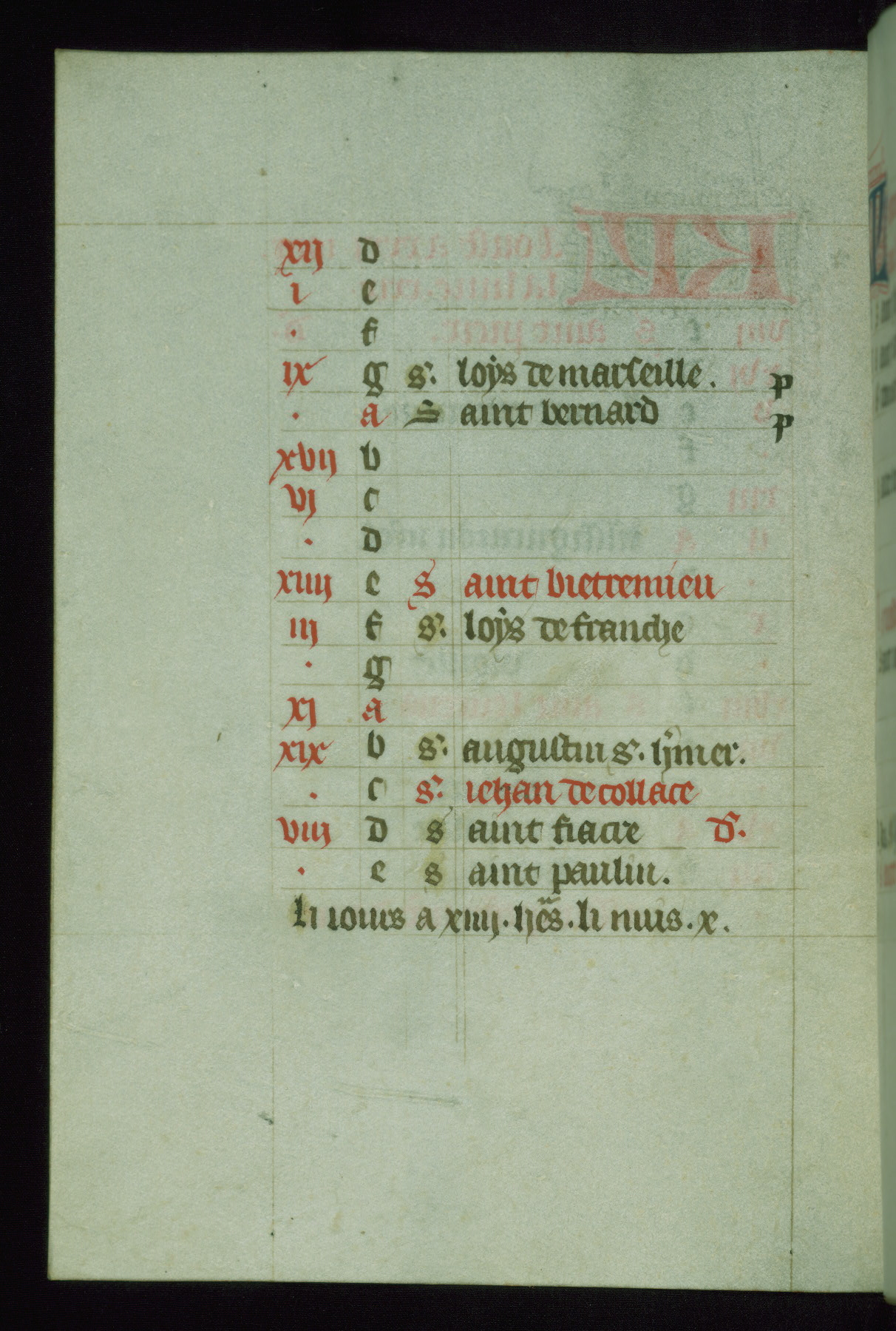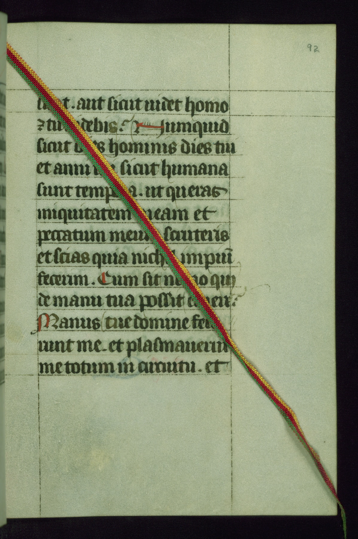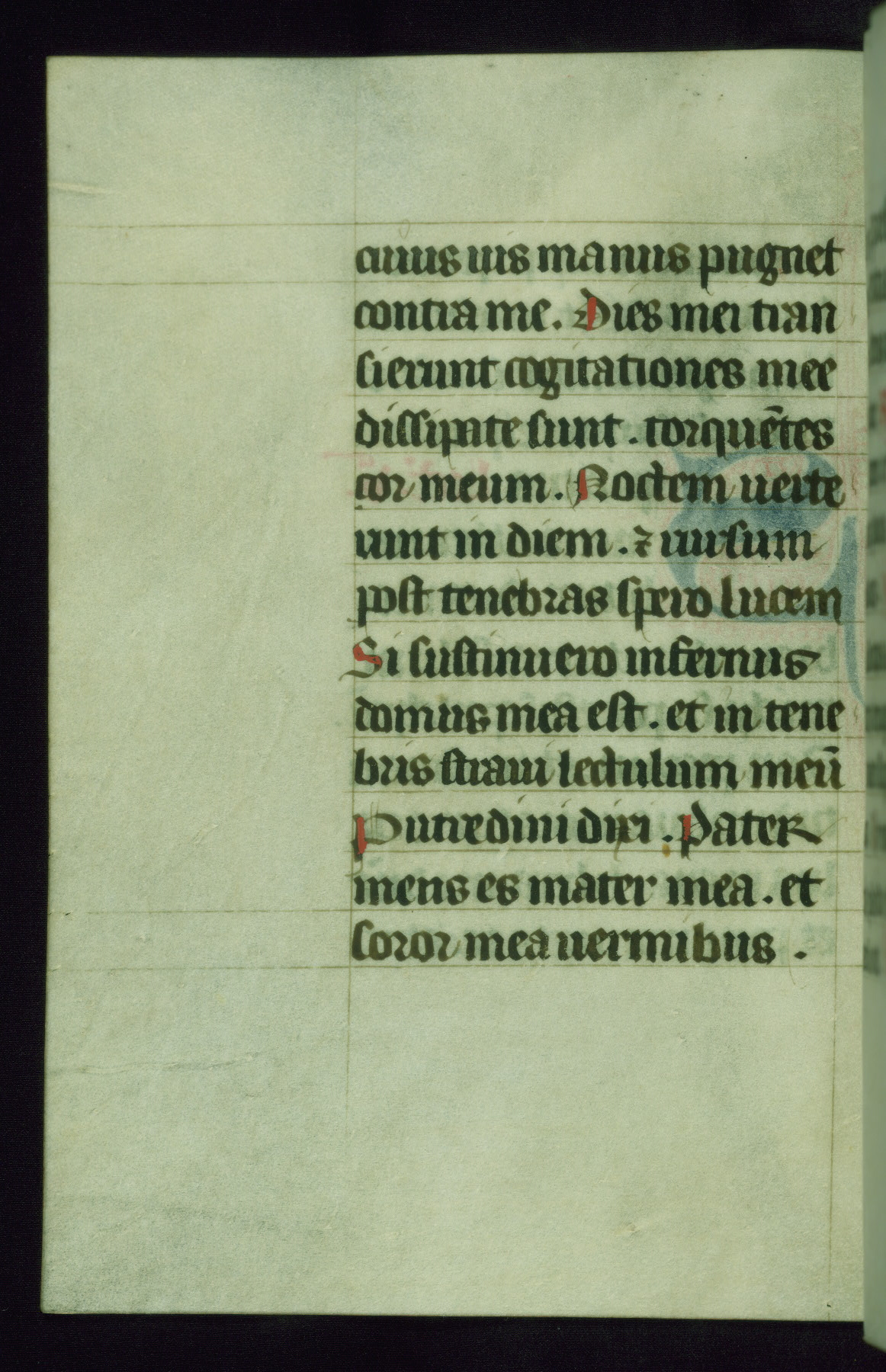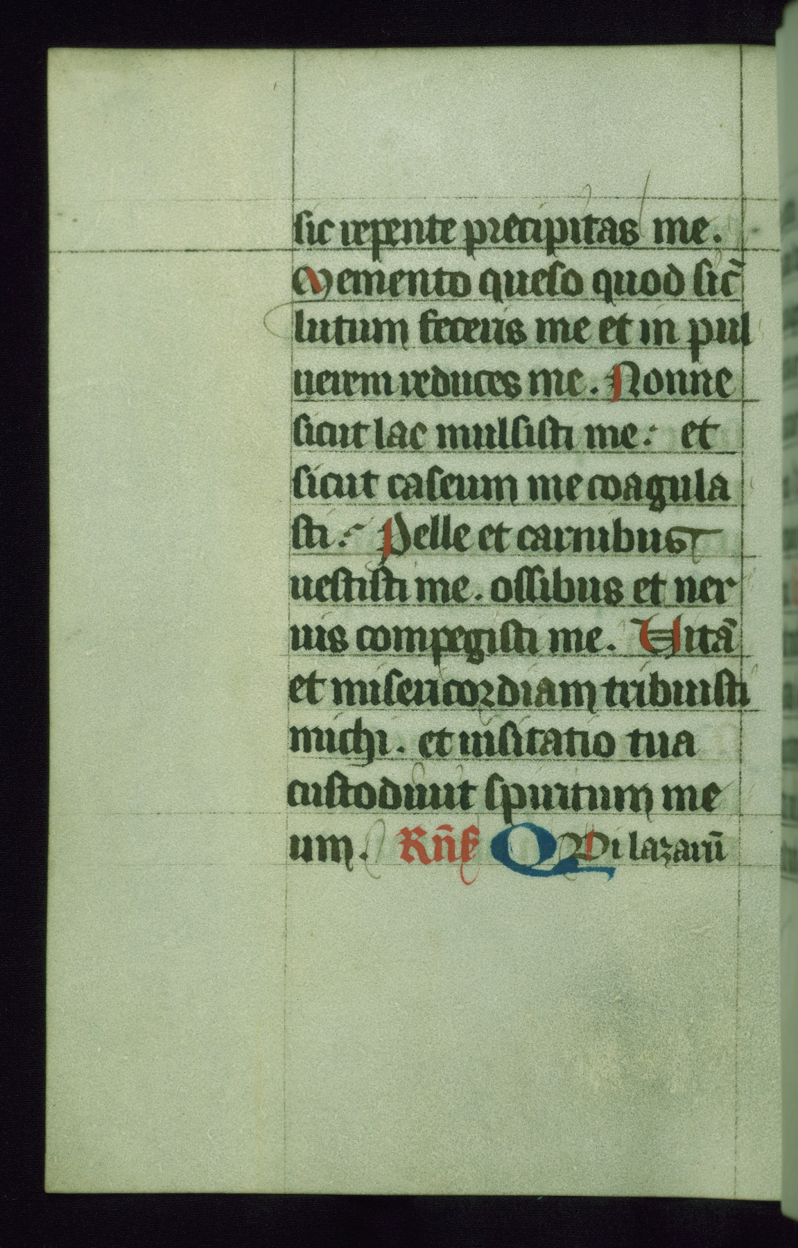 This prayer book was produced ca. 1430-40, likely in Brabant, but the contents of the calendar point to Tournai and Cambrai, and the Office of the Dead is for the use of Liège. North Netherlandish influence, possibly connected with works by the Masters of the Gold Scrolls, is suggested by the style and iconography of its images. The manuscript is notable for its large number of miniatures--forty-eight in total--as well as the sense of narrative within them, and the diversity of the suffrages they illustrate is striking. That the original owner had a strong interest in the Passion is evident in both the choice of texts and the images. The manuscript was well used, and accrued not only additional prayers and suffrages, but devotional objects as well: a pilgrim's badge was once attached to the corner of the image for the suffrage to relics on fol. 160r.