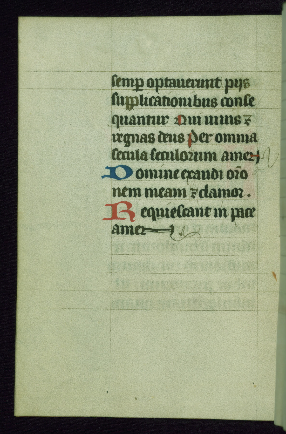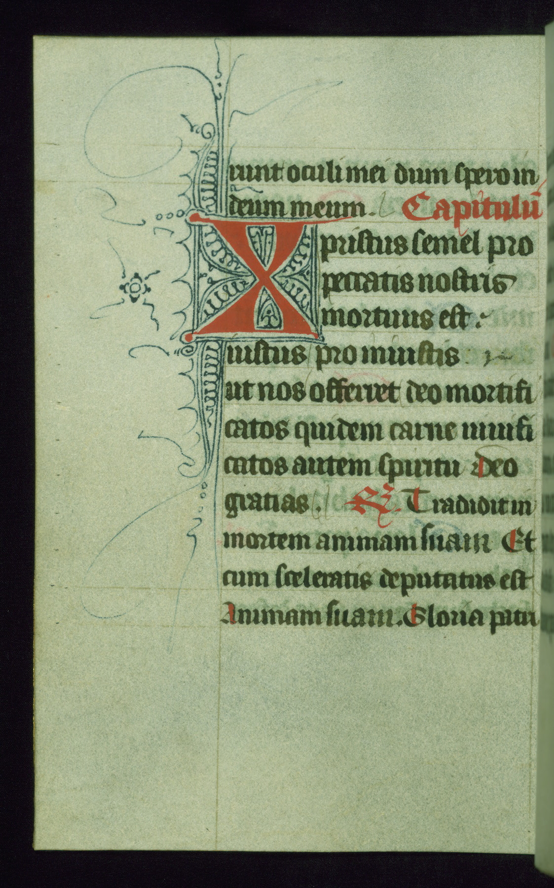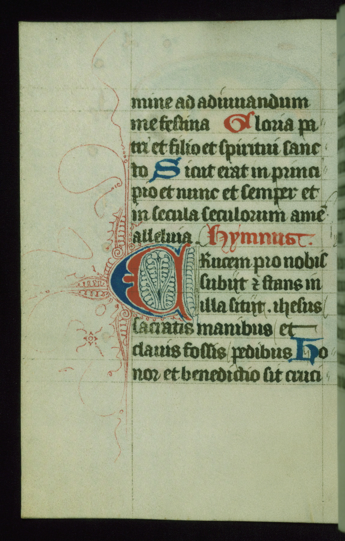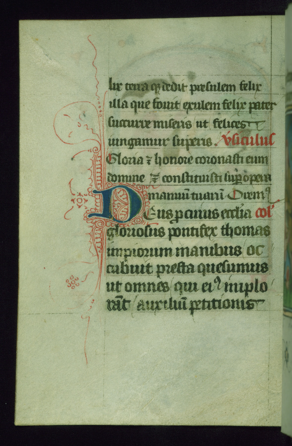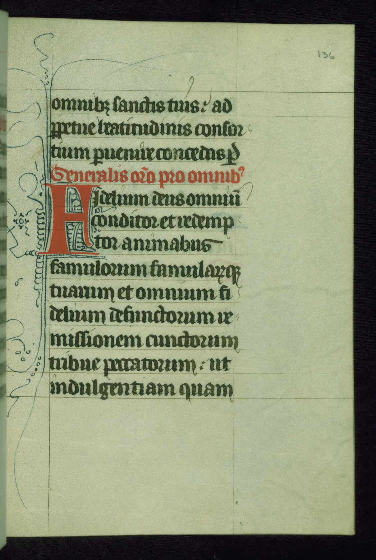 This prayer book was produced ca. 1430-40, likely in Brabant, but the contents of the calendar point to Tournai and Cambrai, and the Office of the Dead is for the use of Liège. North Netherlandish influence, possibly connected with works by the Masters of the Gold Scrolls, is suggested by the style and iconography of its images. The manuscript is notable for its large number of miniatures--forty-eight in total--as well as the sense of narrative within them, and the diversity of the suffrages they illustrate is striking. That the original owner had a strong interest in the Passion is evident in both the choice of texts and the images. The manuscript was well used, and accrued not only additional prayers and suffrages, but devotional objects as well: a pilgrim's badge was once attached to the corner of the image for the suffrage to relics on fol. 160r.