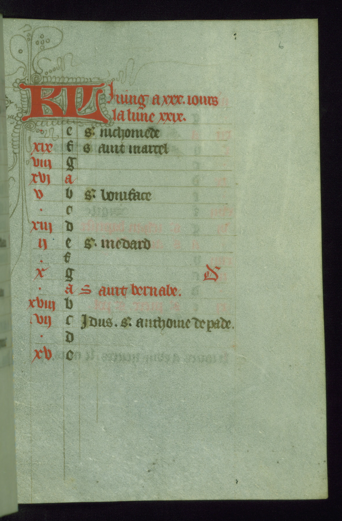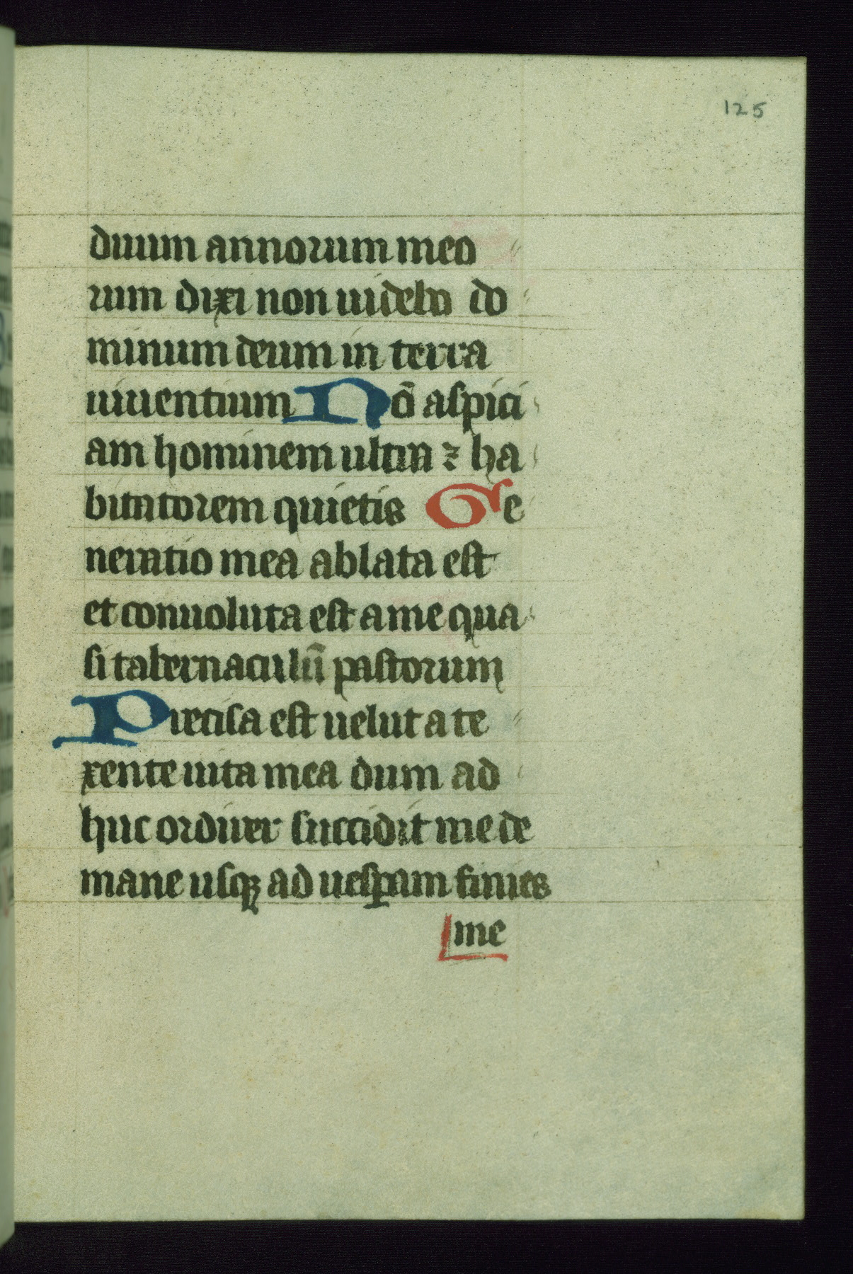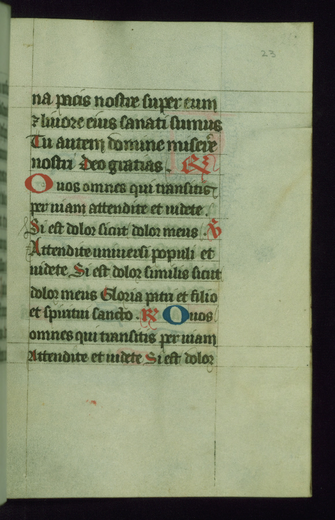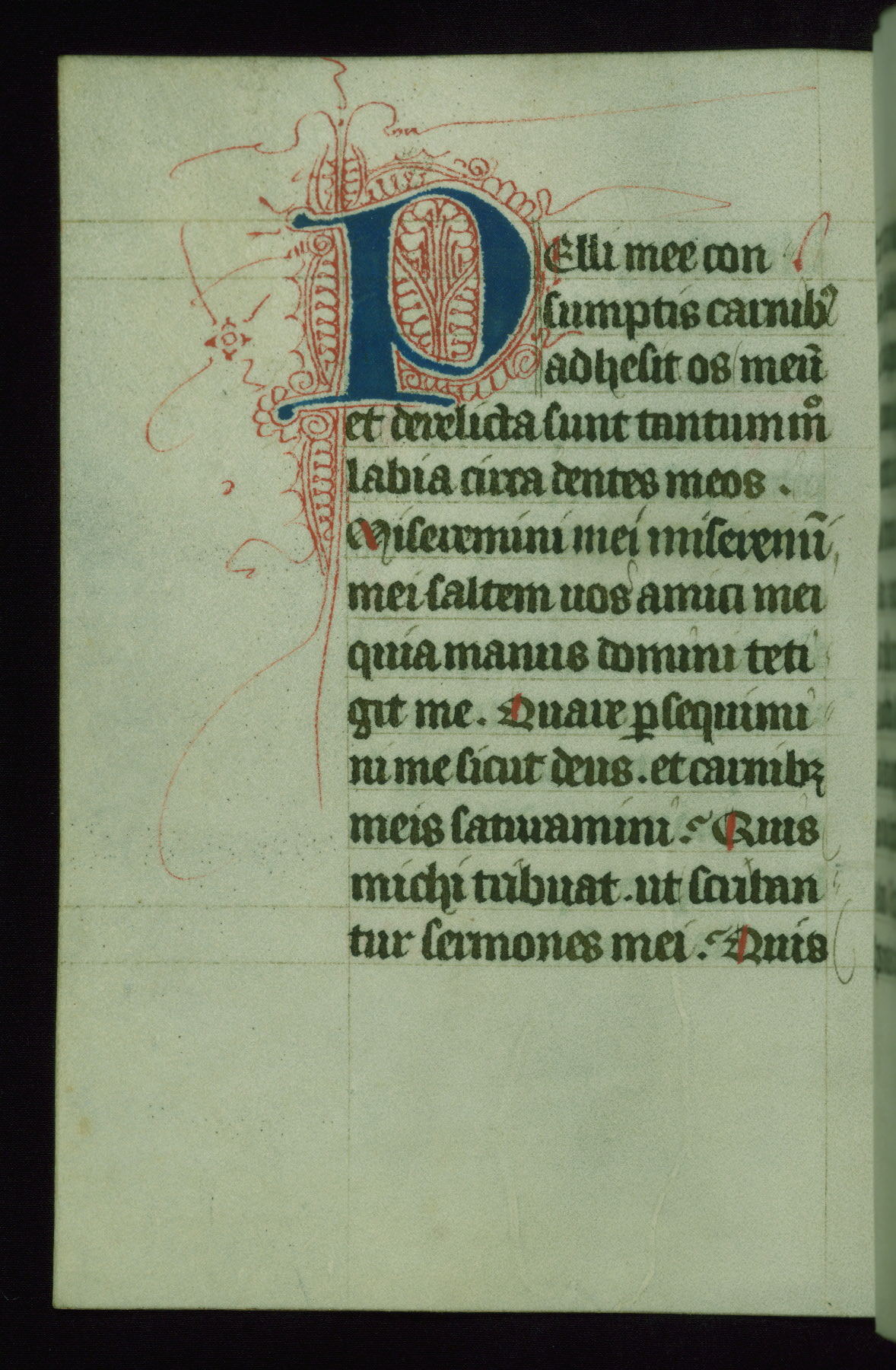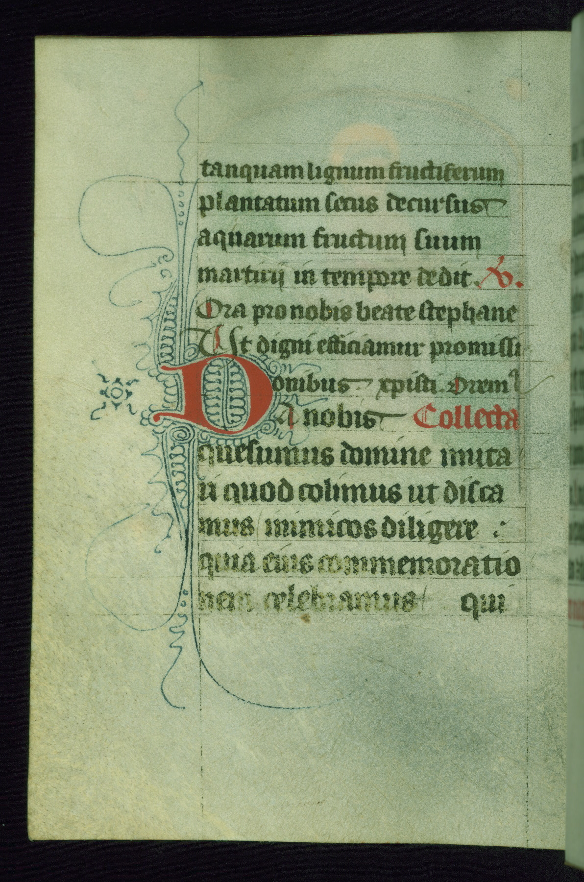 This prayer book was produced ca. 1430-40, likely in Brabant, but the contents of the calendar point to Tournai and Cambrai, and the Office of the Dead is for the use of Liège. North Netherlandish influence, possibly connected with works by the Masters of the Gold Scrolls, is suggested by the style and iconography of its images. The manuscript is notable for its large number of miniatures--forty-eight in total--as well as the sense of narrative within them, and the diversity of the suffrages they illustrate is striking. That the original owner had a strong interest in the Passion is evident in both the choice of texts and the images. The manuscript was well used, and accrued not only additional prayers and suffrages, but devotional objects as well: a pilgrim's badge was once attached to the corner of the image for the suffrage to relics on fol. 160r.