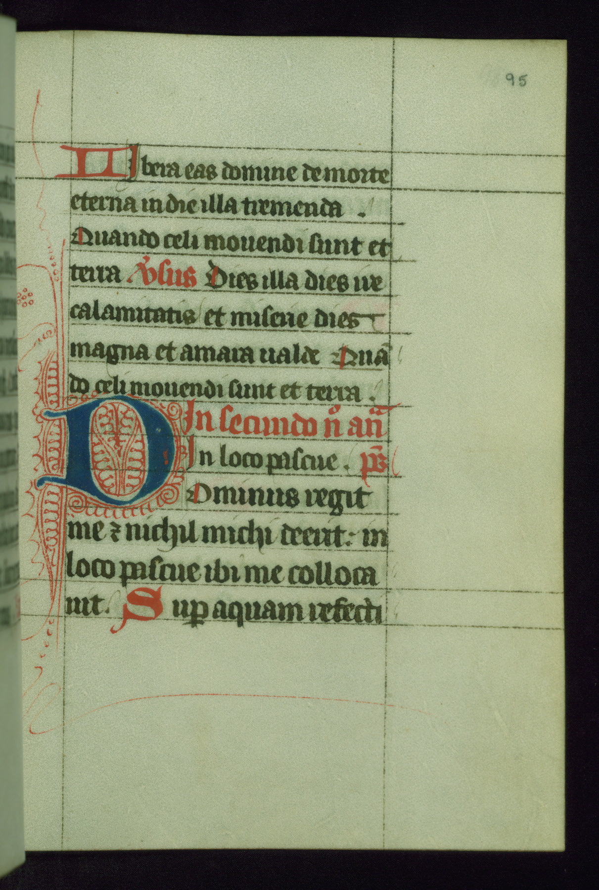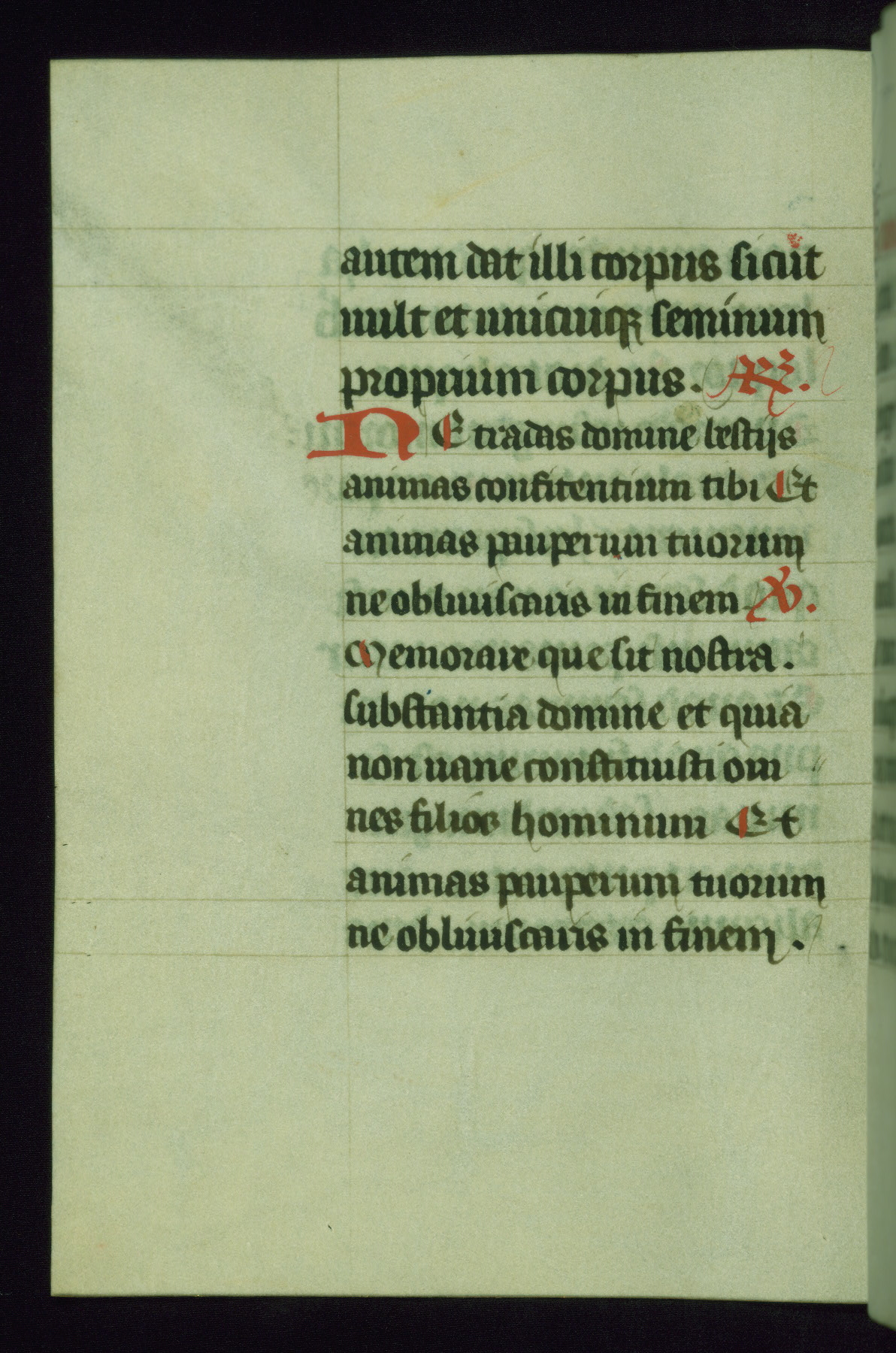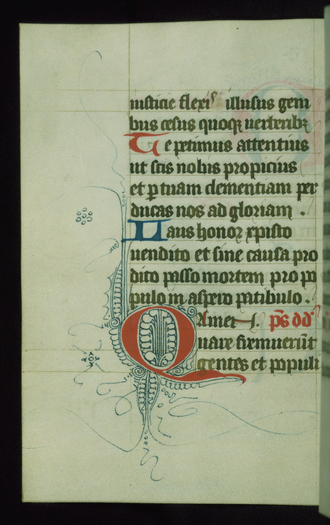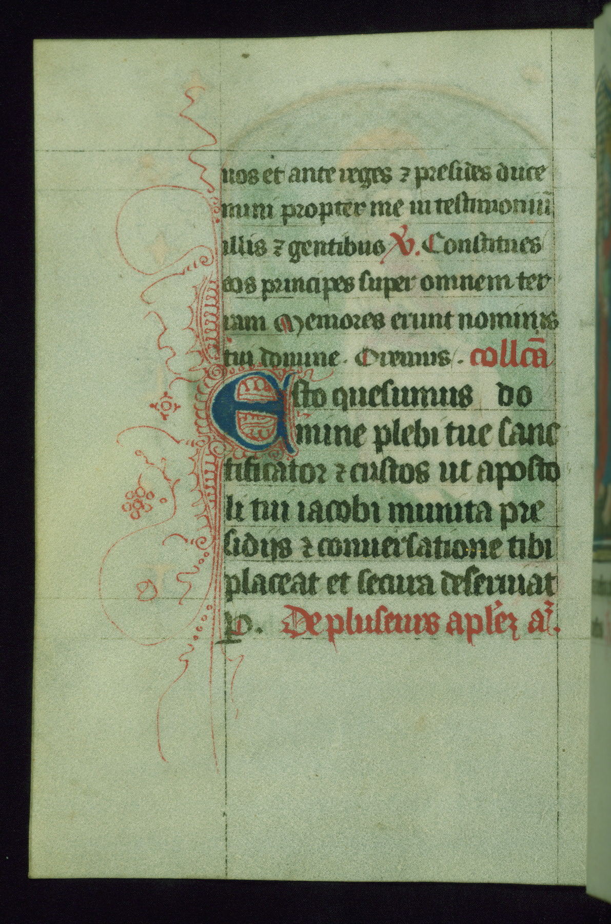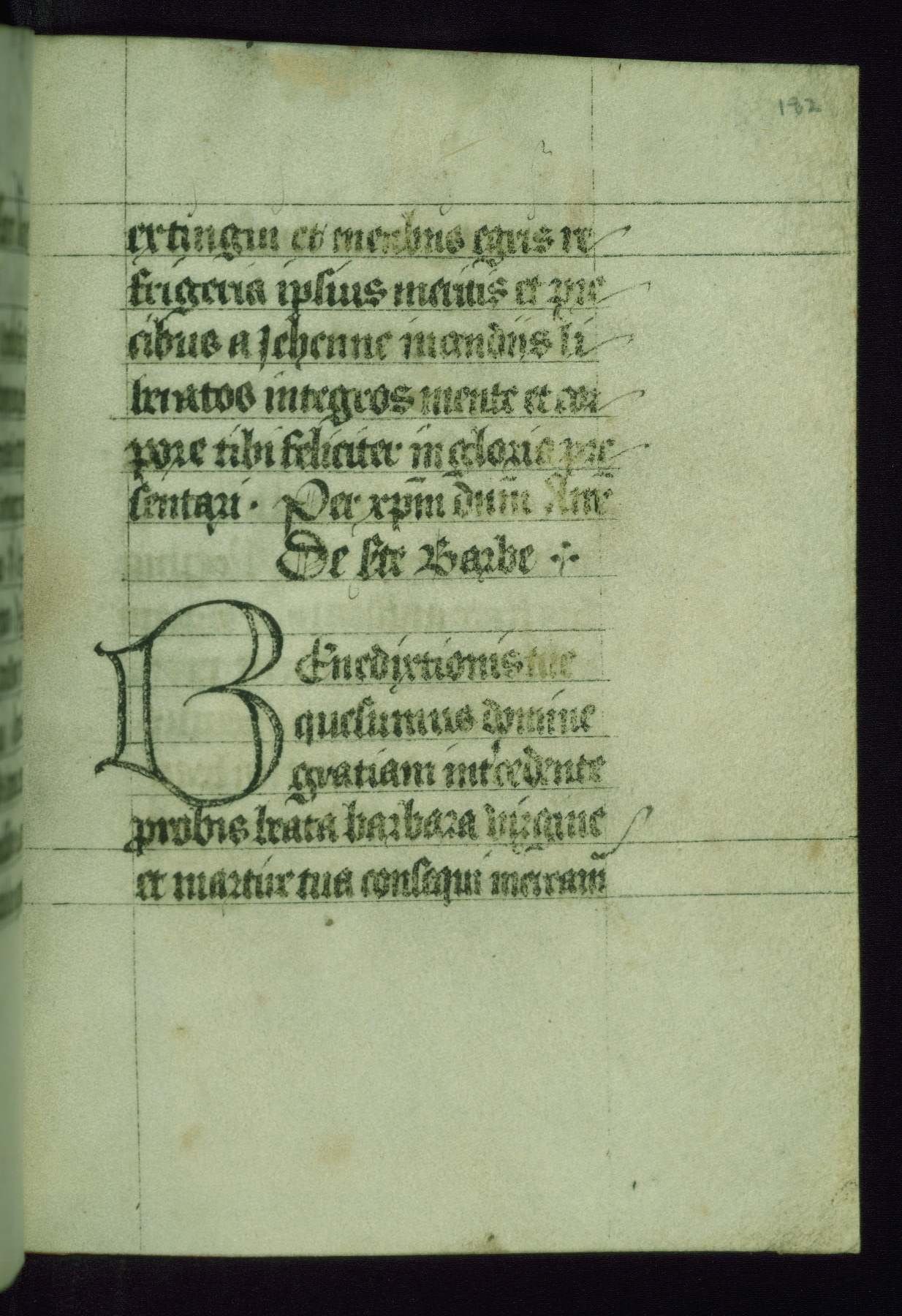This prayer book was produced ca. 1430-40, likely in Brabant, but the contents of the calendar point to Tournai and Cambrai, and the Office of the Dead is for the use of Liège. North Netherlandish influence, possibly connected with works by the Masters of the Gold Scrolls, is suggested by the style and iconography of its images. The manuscript is notable for its large number of miniatures--forty-eight in total--as well as the sense of narrative within them, and the diversity of the suffrages they illustrate is striking. That the original owner had a strong interest in the Passion is evident in both the choice of texts and the images. The manuscript was well used, and accrued not only additional prayers and suffrages, but devotional objects as well: a pilgrim's badge was once attached to the corner of the image for the suffrage to relics on fol. 160r.