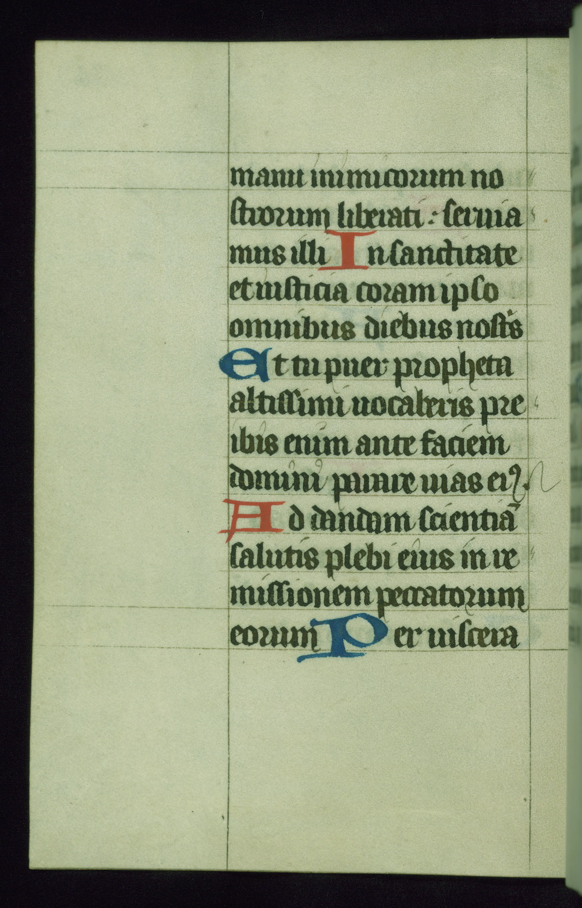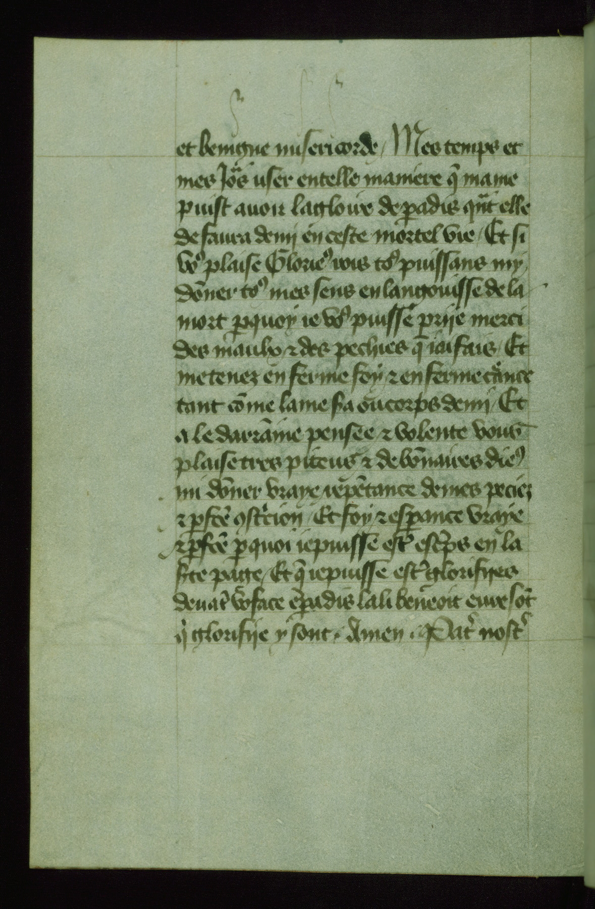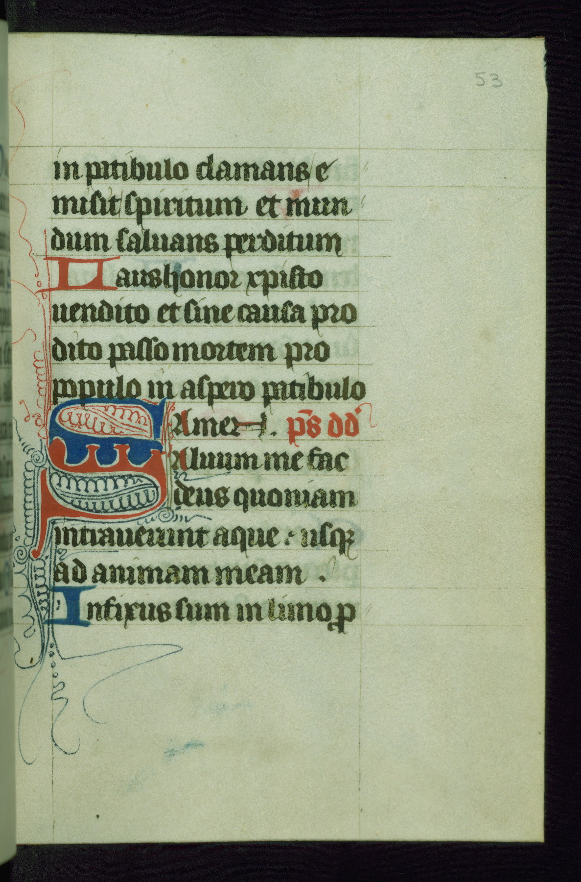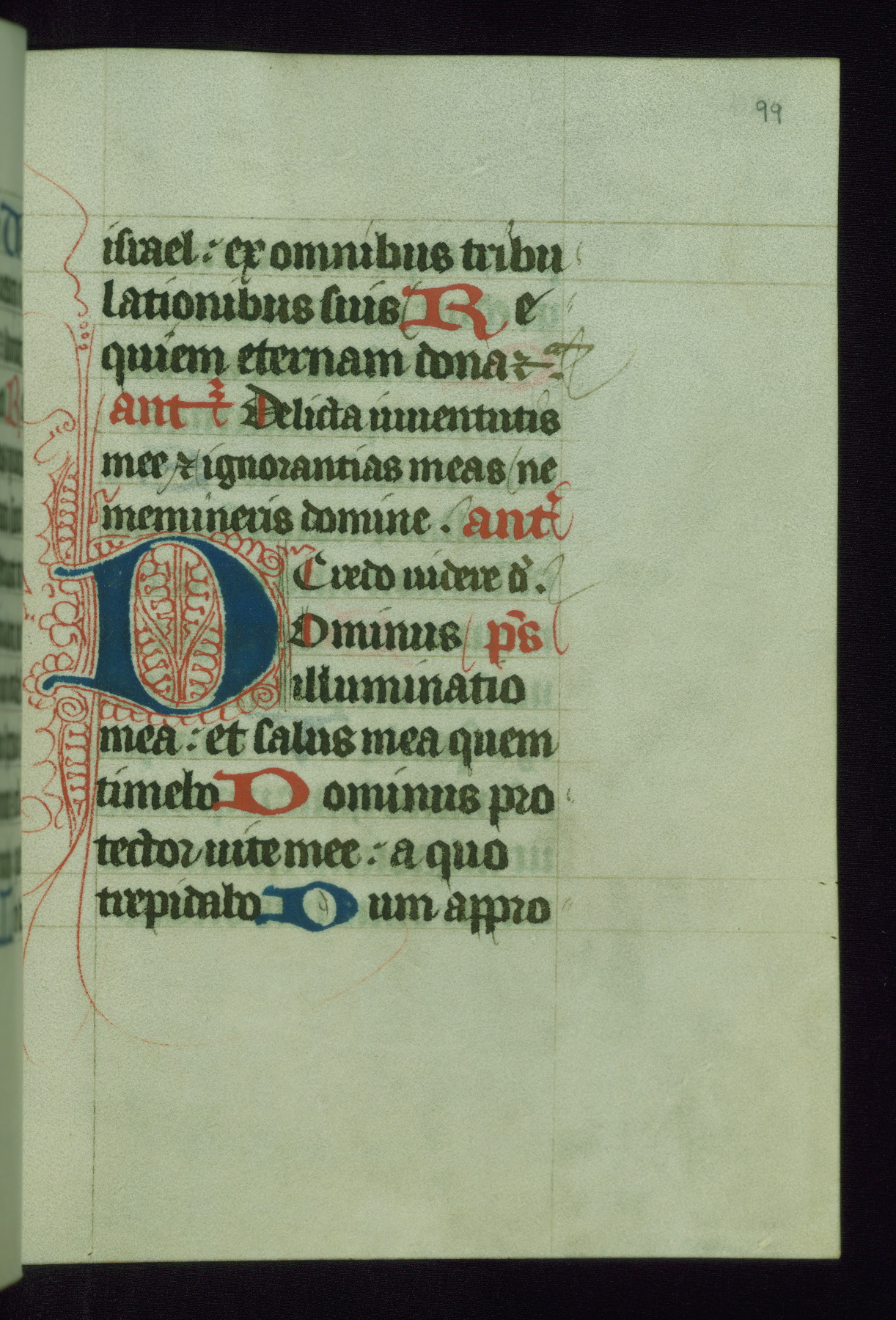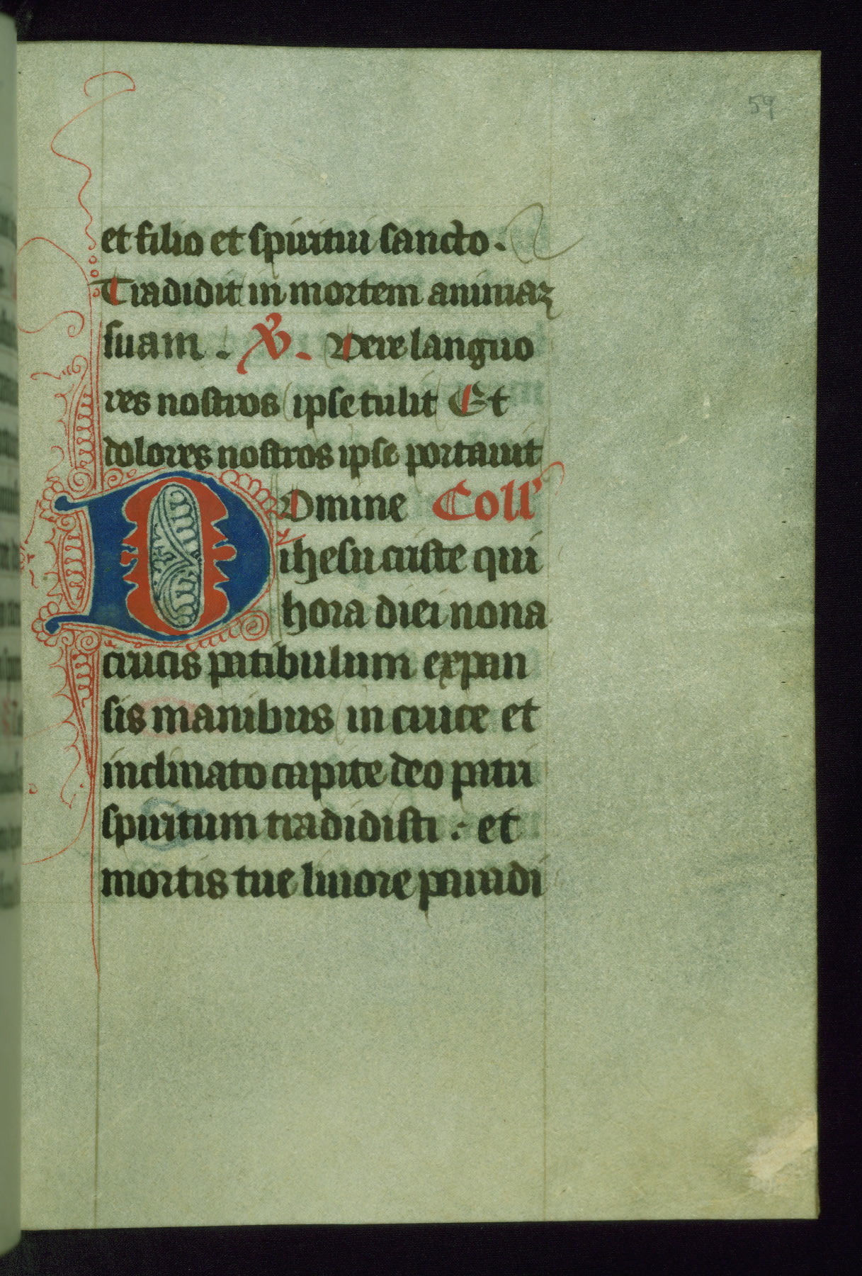 This prayer book was produced ca. 1430-40, likely in Brabant, but the contents of the calendar point to Tournai and Cambrai, and the Office of the Dead is for the use of Liège. North Netherlandish influence, possibly connected with works by the Masters of the Gold Scrolls, is suggested by the style and iconography of its images. The manuscript is notable for its large number of miniatures--forty-eight in total--as well as the sense of narrative within them, and the diversity of the suffrages they illustrate is striking. That the original owner had a strong interest in the Passion is evident in both the choice of texts and the images. The manuscript was well used, and accrued not only additional prayers and suffrages, but devotional objects as well: a pilgrim's badge was once attached to the corner of the image for the suffrage to relics on fol. 160r.