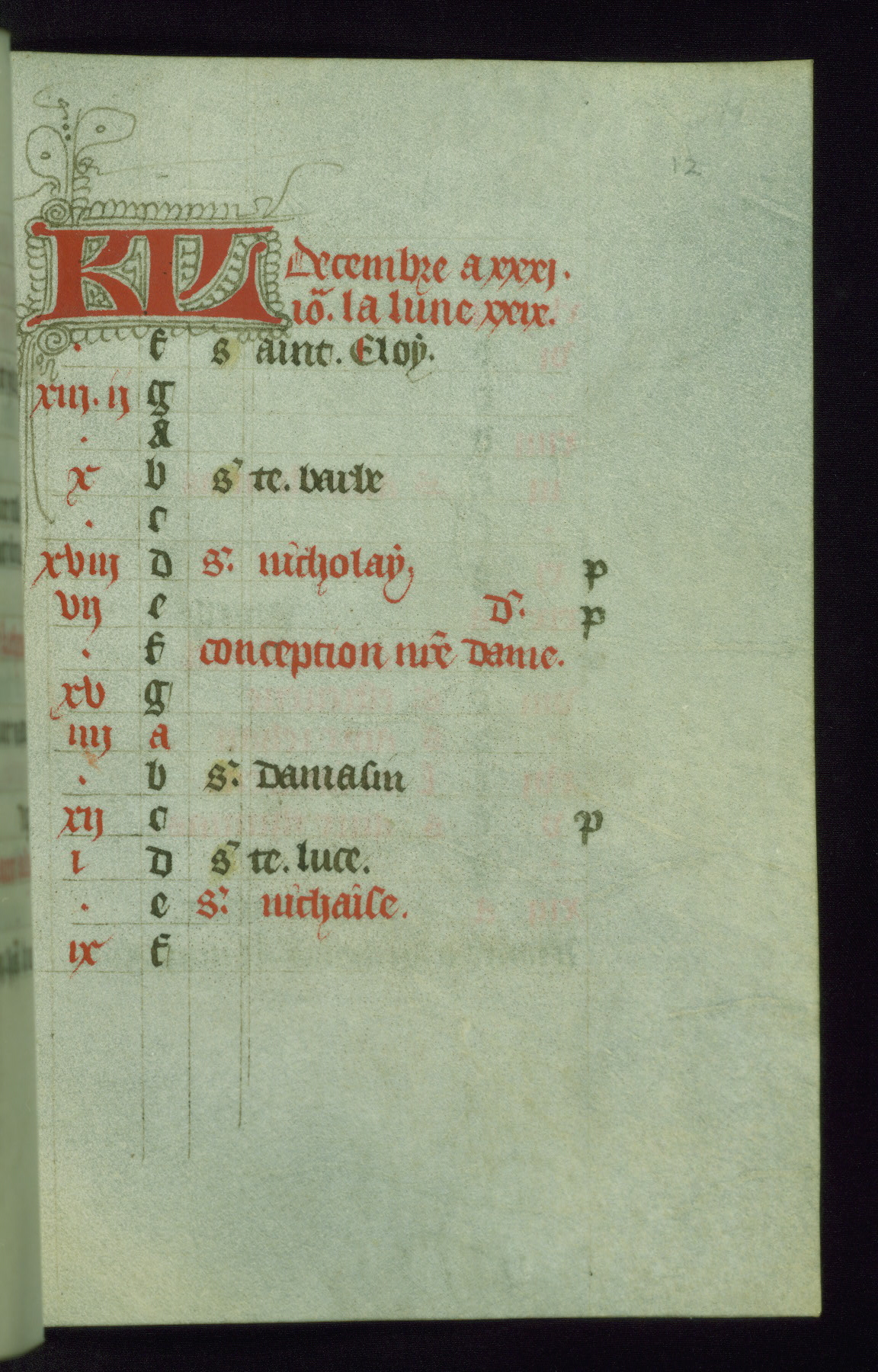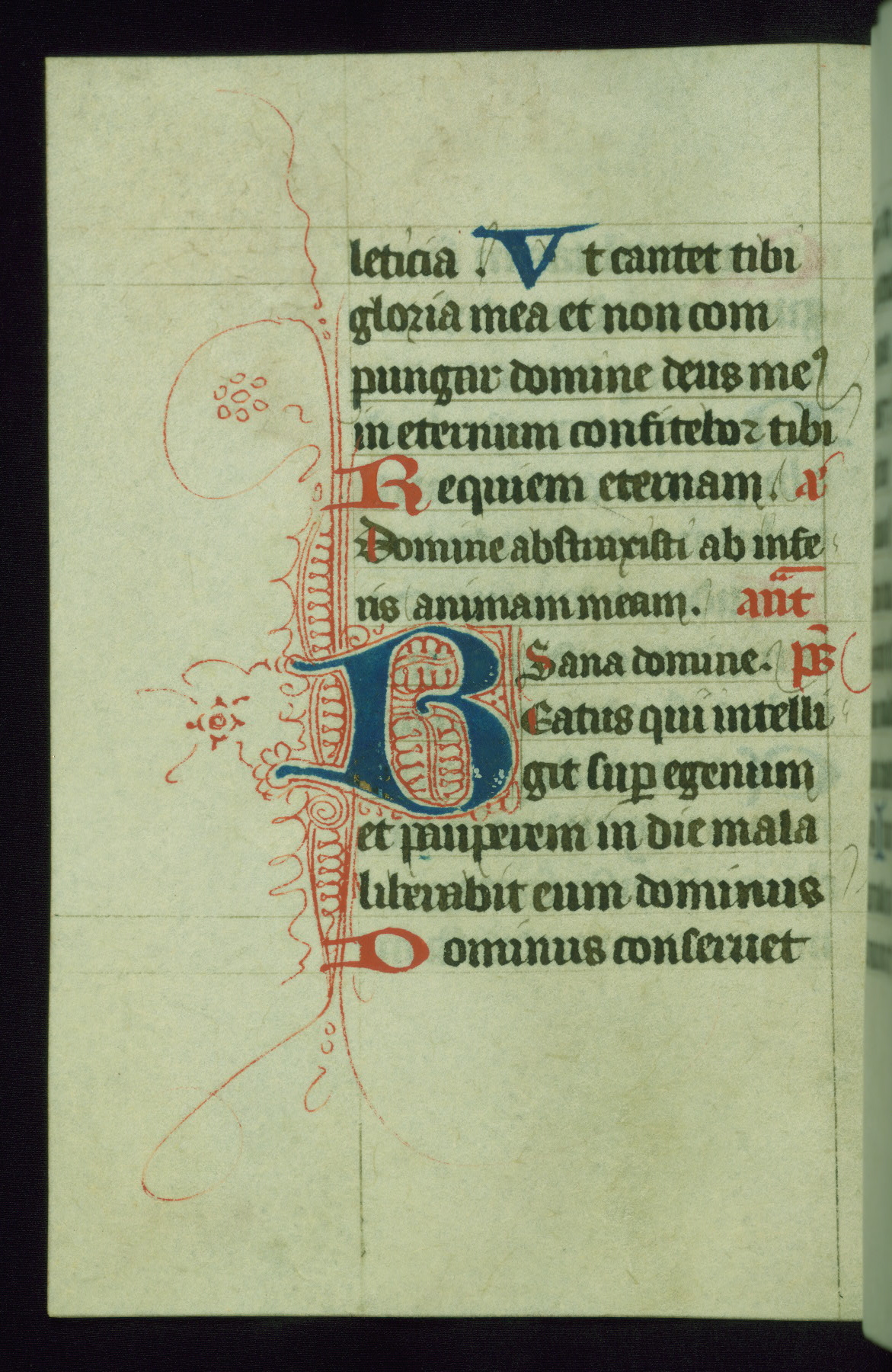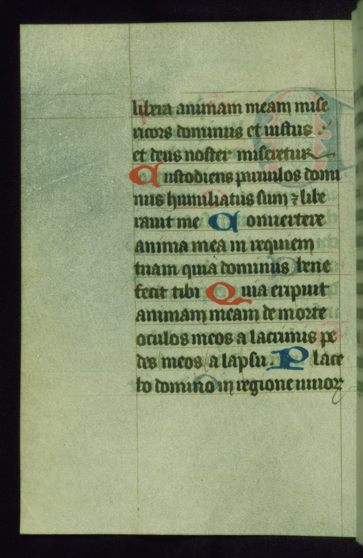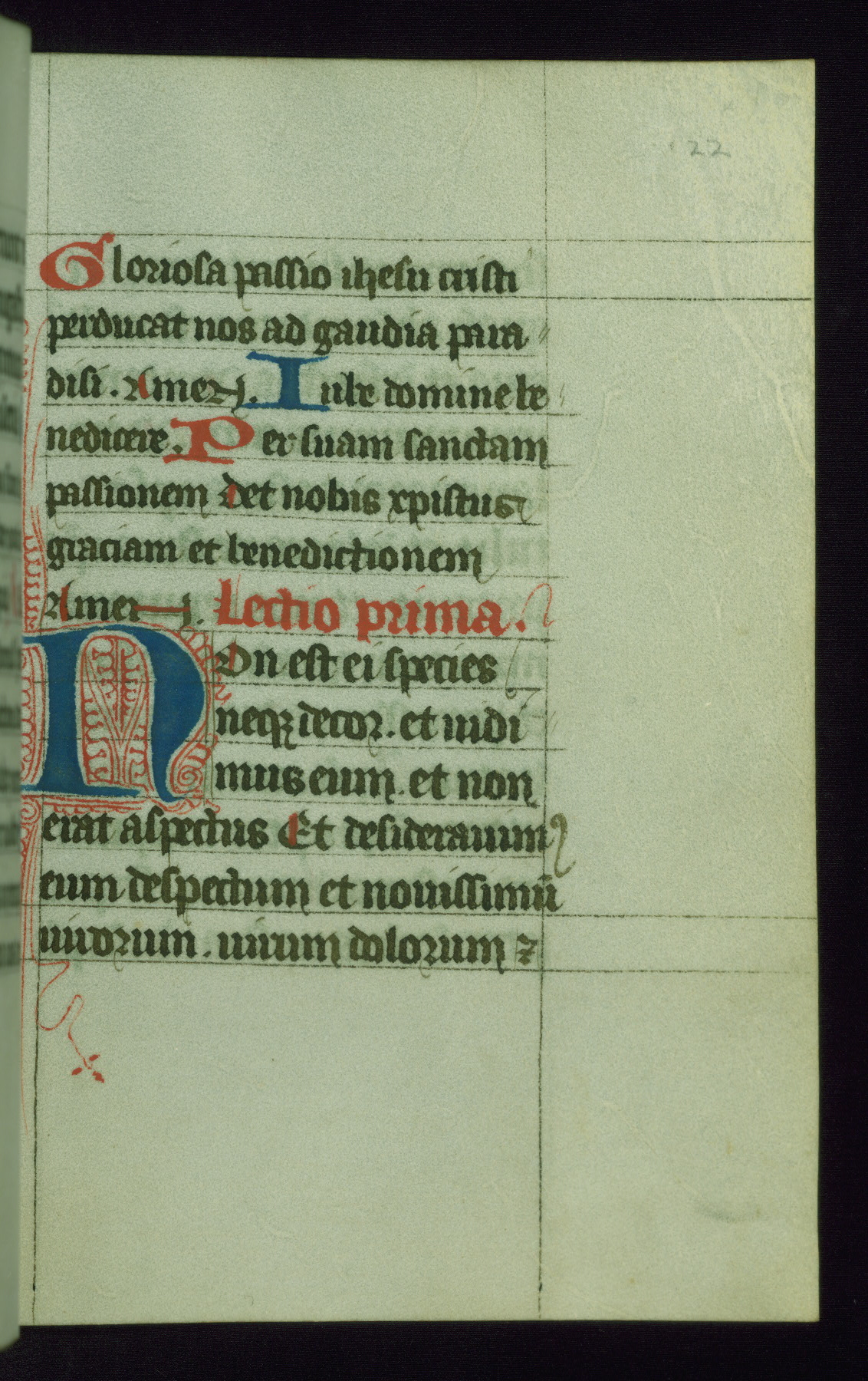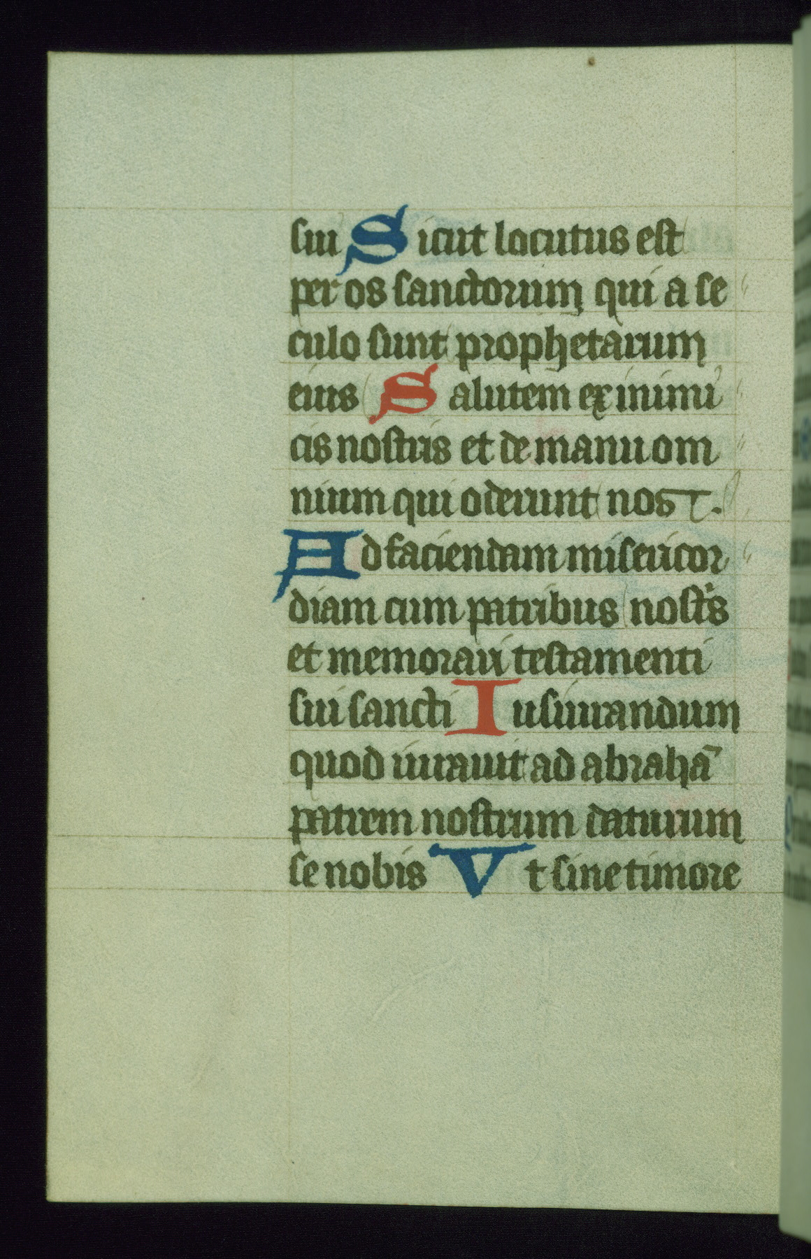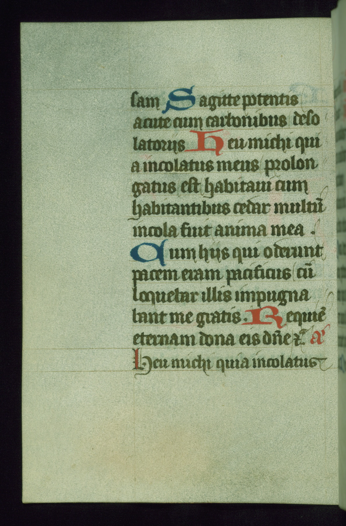 This prayer book was produced ca. 1430-40, likely in Brabant, but the contents of the calendar point to Tournai and Cambrai, and the Office of the Dead is for the use of Liège. North Netherlandish influence, possibly connected with works by the Masters of the Gold Scrolls, is suggested by the style and iconography of its images. The manuscript is notable for its large number of miniatures--forty-eight in total--as well as the sense of narrative within them, and the diversity of the suffrages they illustrate is striking. That the original owner had a strong interest in the Passion is evident in both the choice of texts and the images. The manuscript was well used, and accrued not only additional prayers and suffrages, but devotional objects as well: a pilgrim's badge was once attached to the corner of the image for the suffrage to relics on fol. 160r.