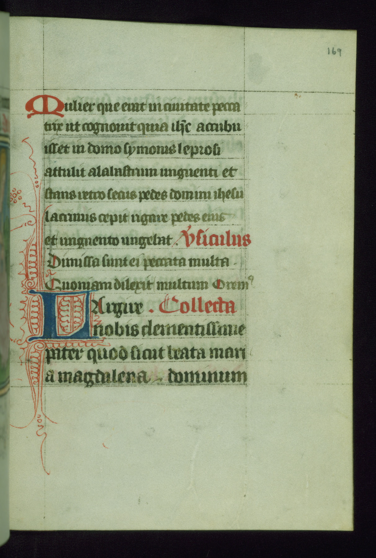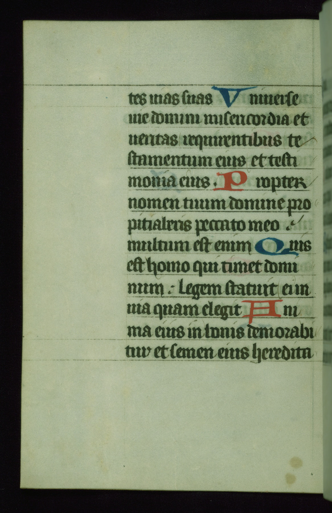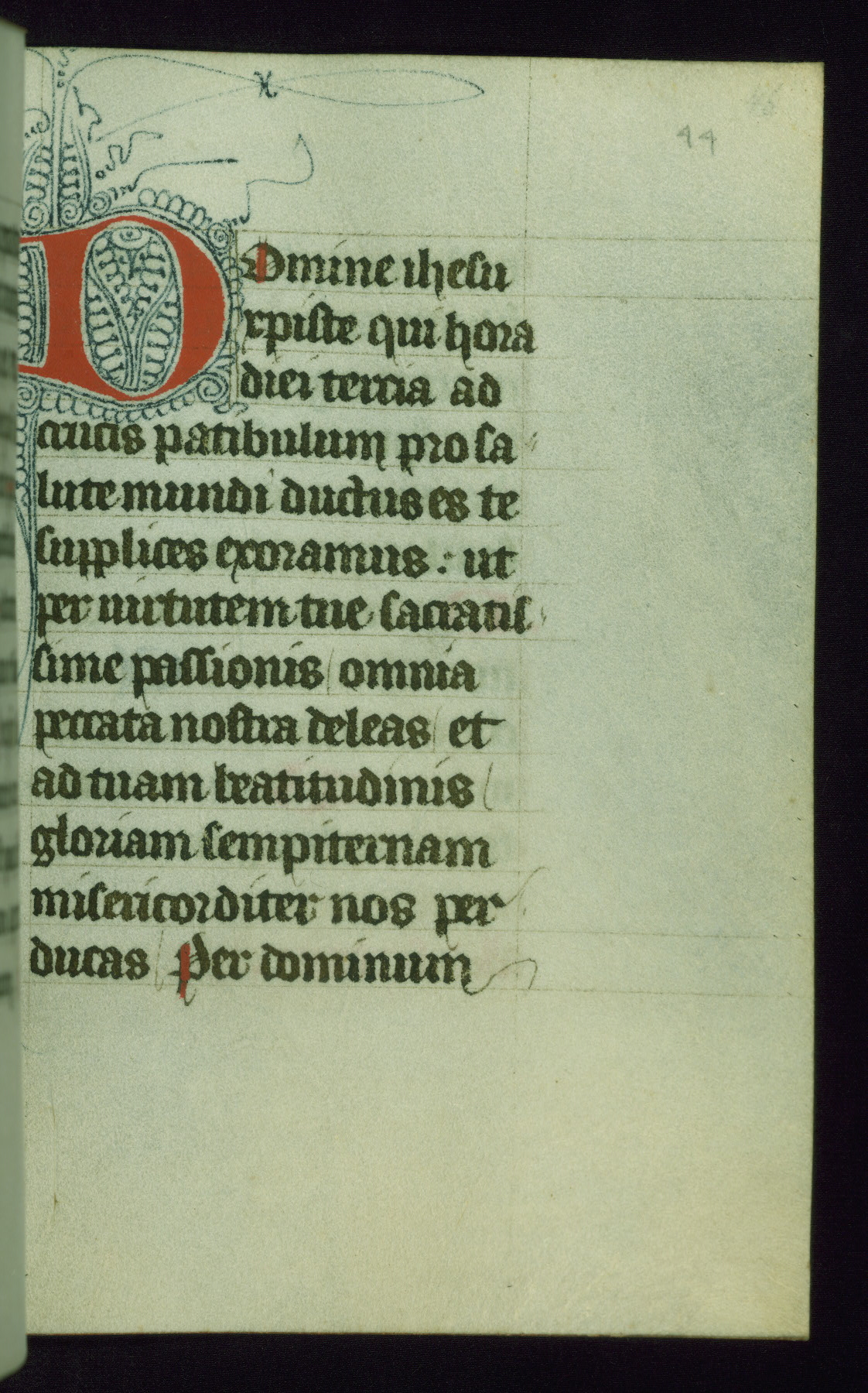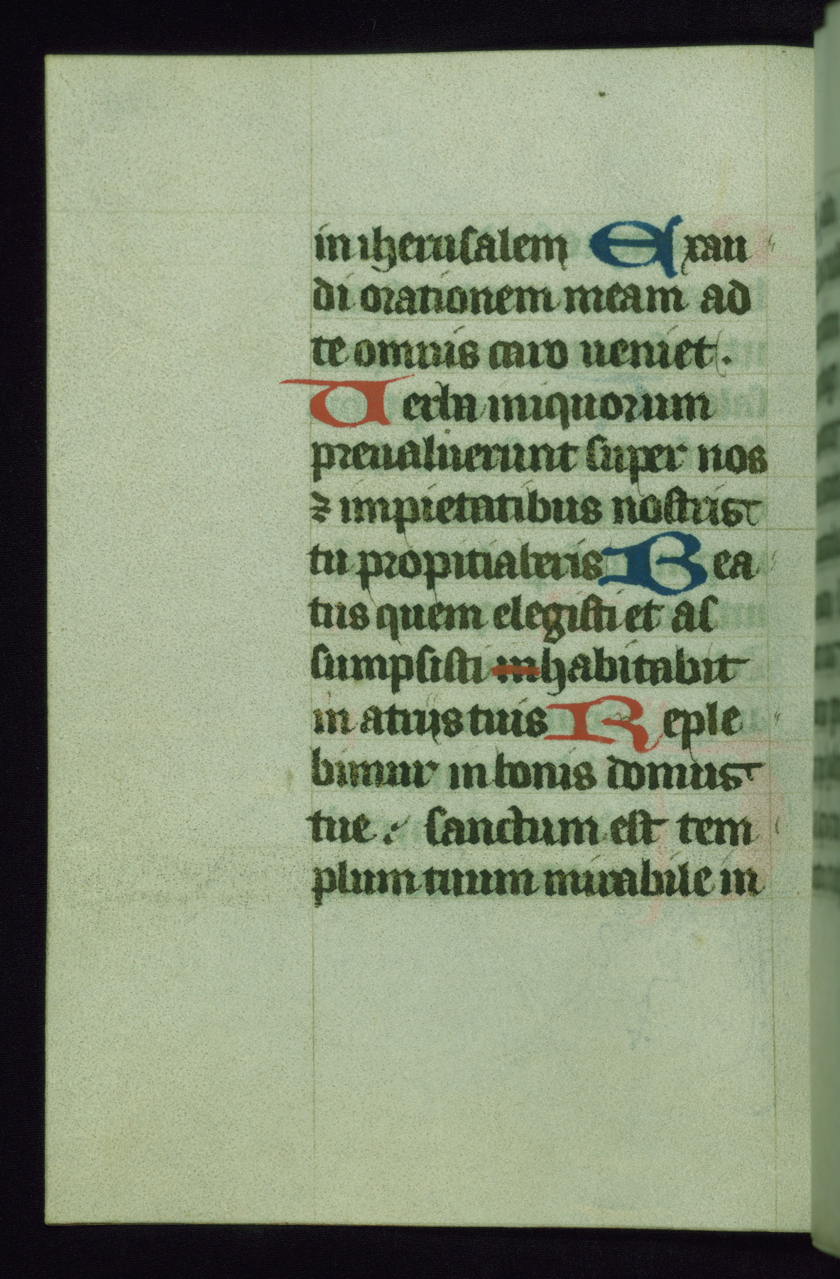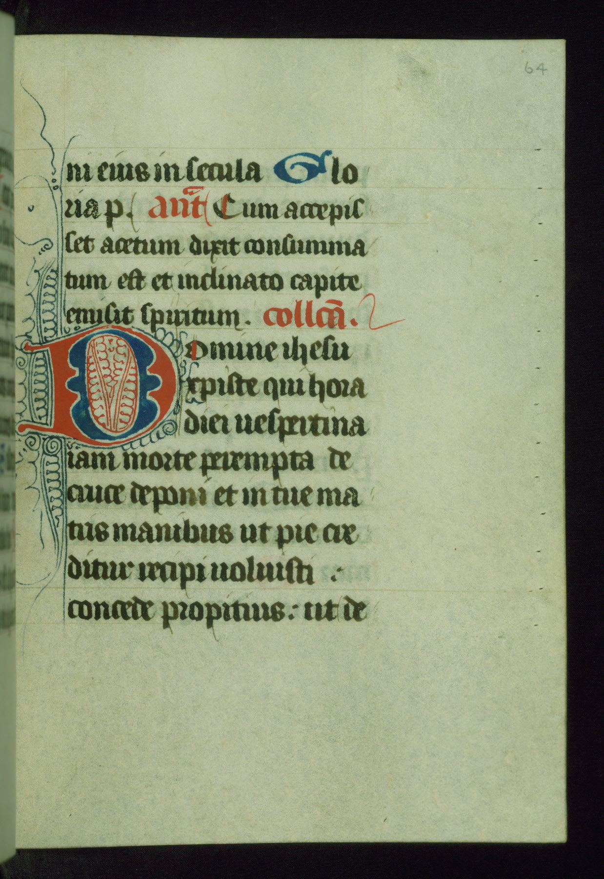 This prayer book was produced ca. 1430-40, likely in Brabant, but the contents of the calendar point to Tournai and Cambrai, and the Office of the Dead is for the use of Liège. North Netherlandish influence, possibly connected with works by the Masters of the Gold Scrolls, is suggested by the style and iconography of its images. The manuscript is notable for its large number of miniatures--forty-eight in total--as well as the sense of narrative within them, and the diversity of the suffrages they illustrate is striking. That the original owner had a strong interest in the Passion is evident in both the choice of texts and the images. The manuscript was well used, and accrued not only additional prayers and suffrages, but devotional objects as well: a pilgrim's badge was once attached to the corner of the image for the suffrage to relics on fol. 160r.
