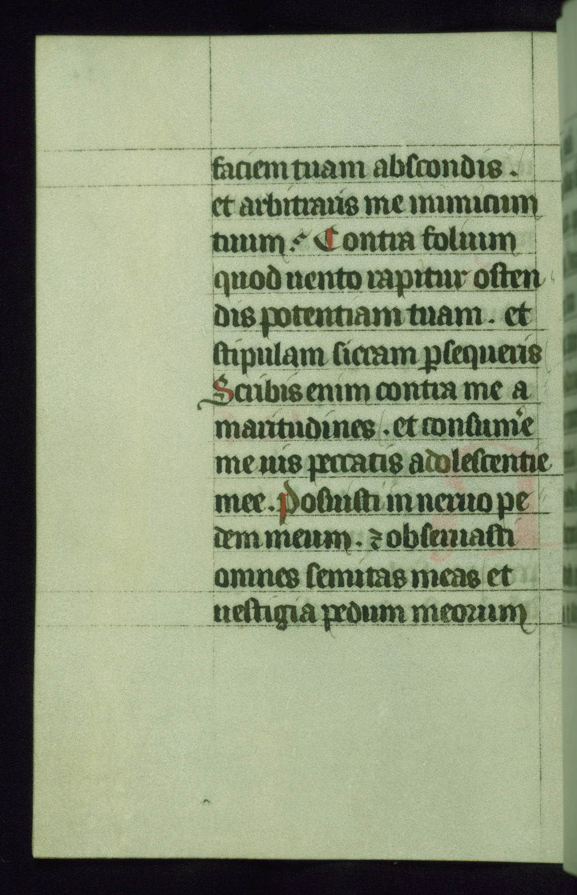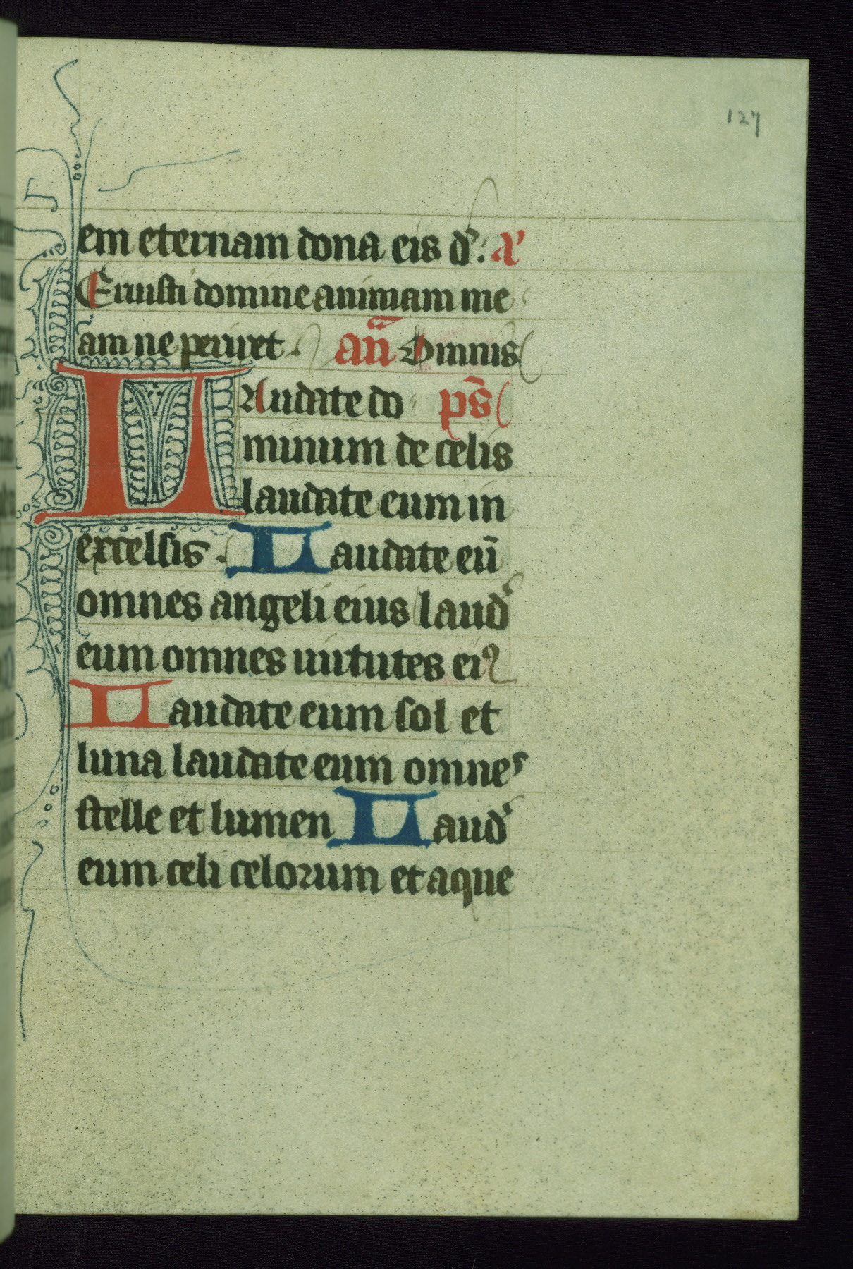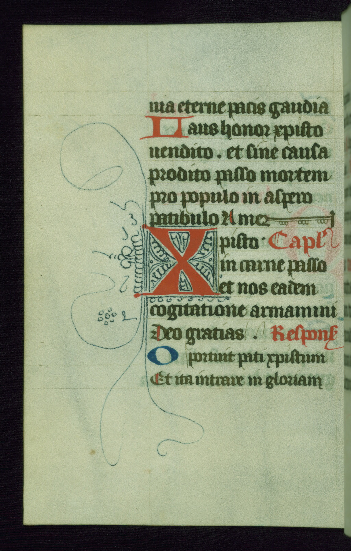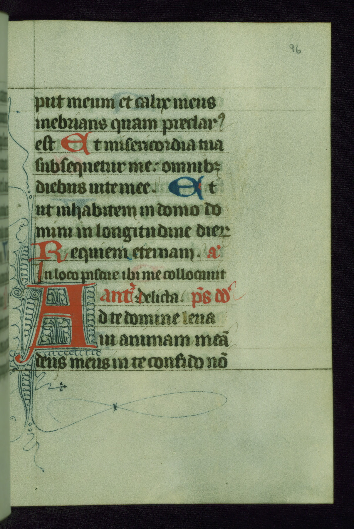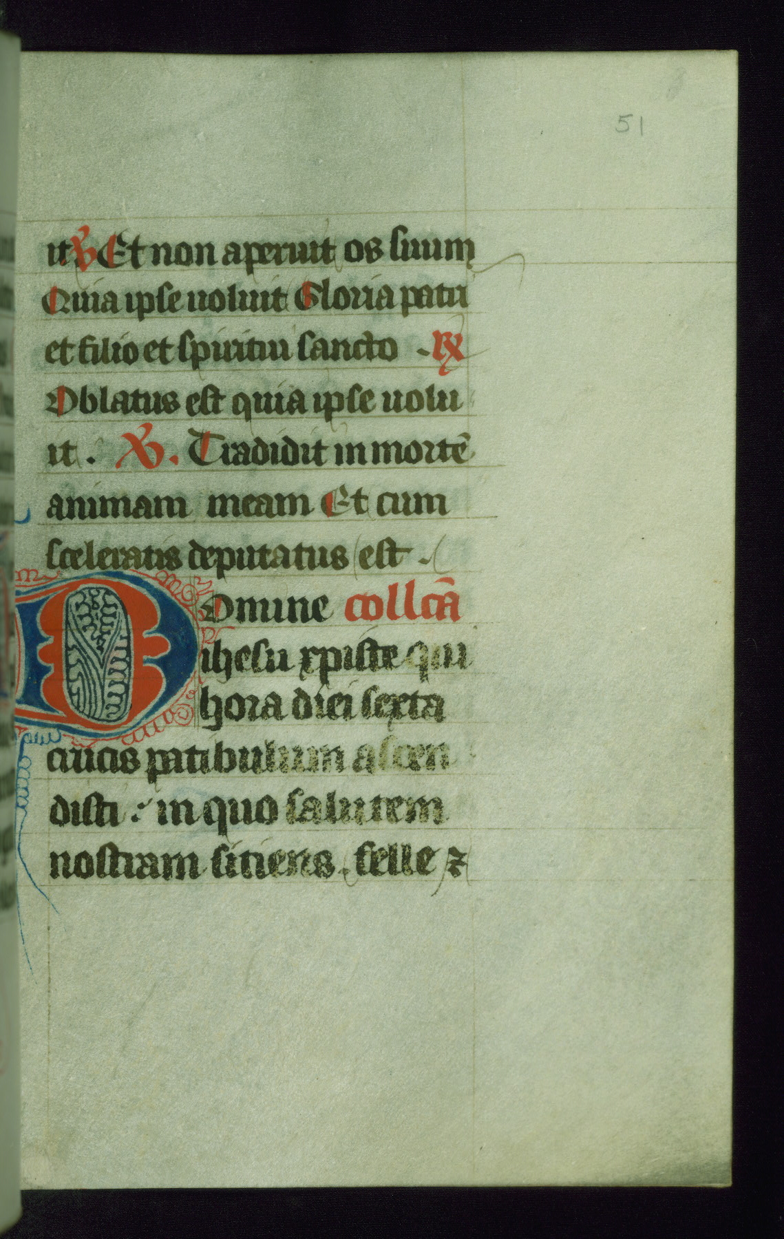 This prayer book was produced ca. 1430-40, likely in Brabant, but the contents of the calendar point to Tournai and Cambrai, and the Office of the Dead is for the use of Liège. North Netherlandish influence, possibly connected with works by the Masters of the Gold Scrolls, is suggested by the style and iconography of its images. The manuscript is notable for its large number of miniatures--forty-eight in total--as well as the sense of narrative within them, and the diversity of the suffrages they illustrate is striking. That the original owner had a strong interest in the Passion is evident in both the choice of texts and the images. The manuscript was well used, and accrued not only additional prayers and suffrages, but devotional objects as well: a pilgrim's badge was once attached to the corner of the image for the suffrage to relics on fol. 160r.