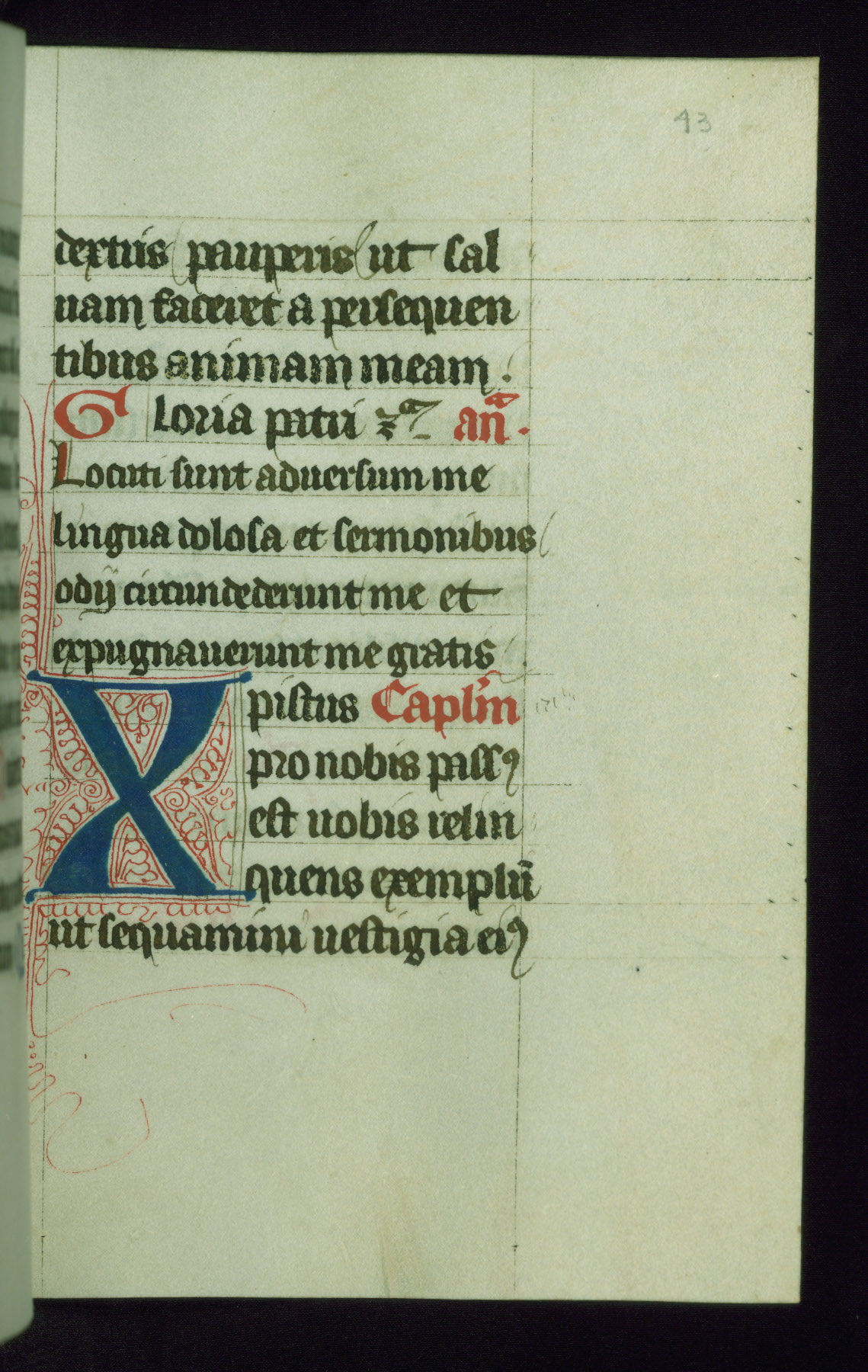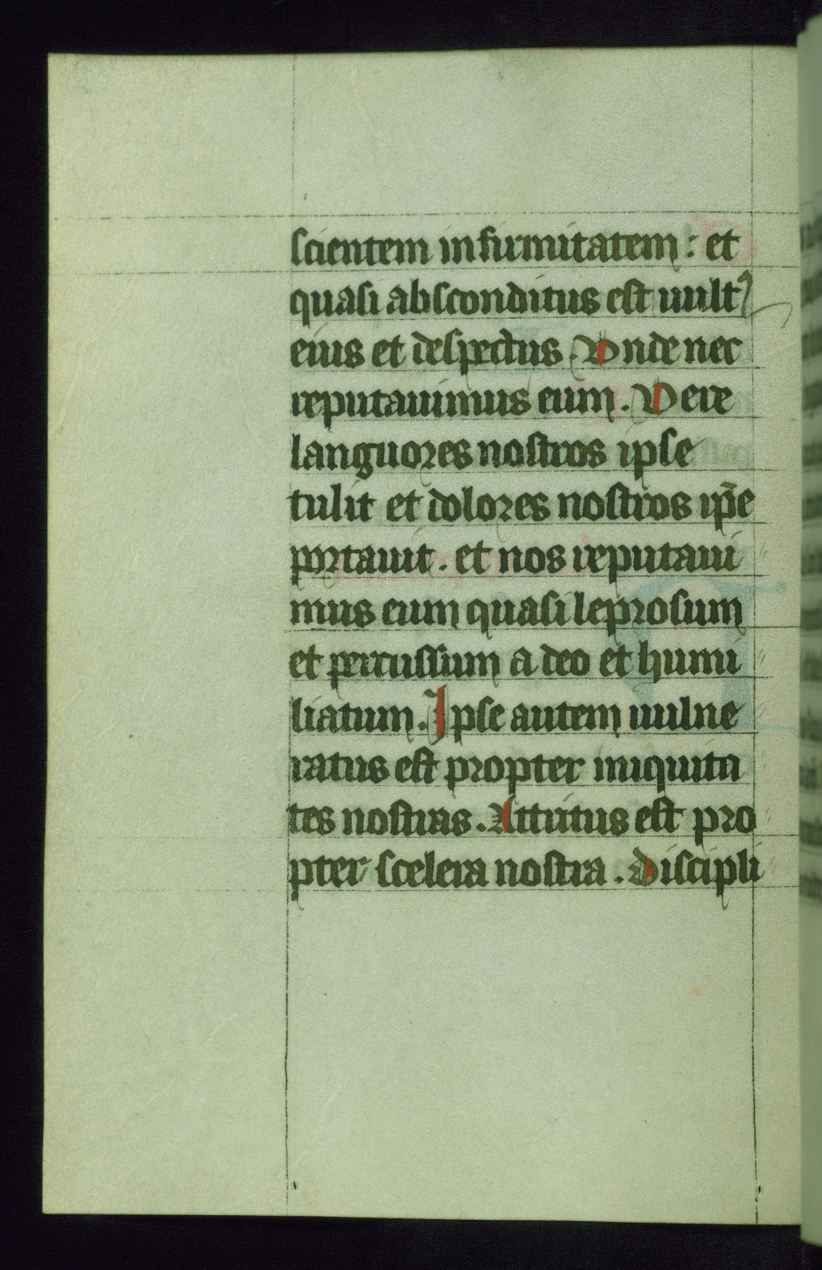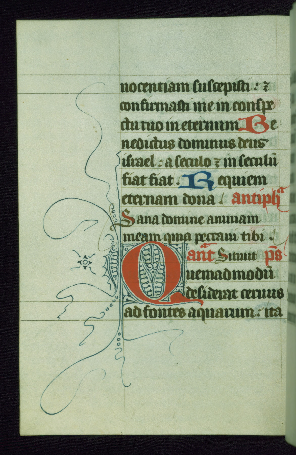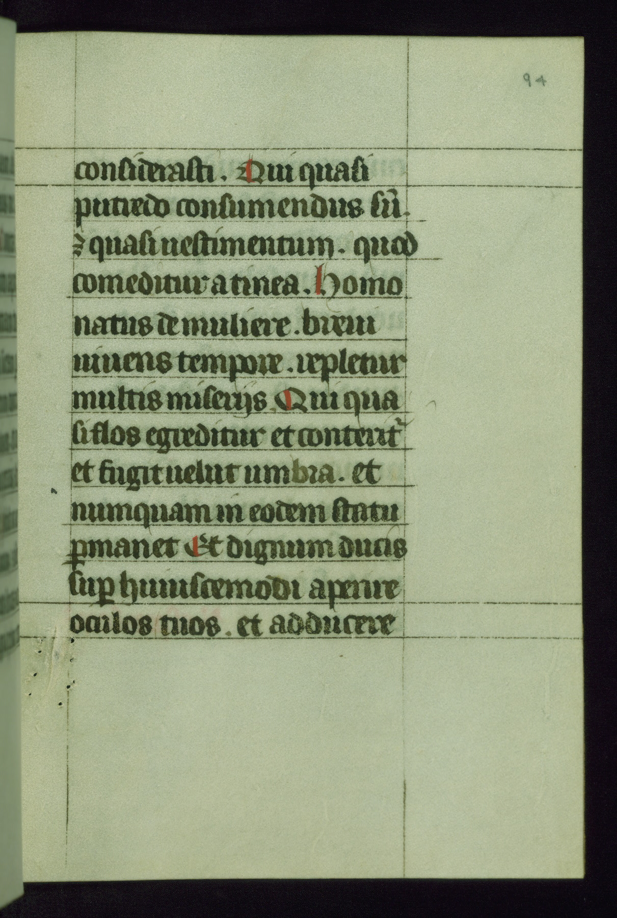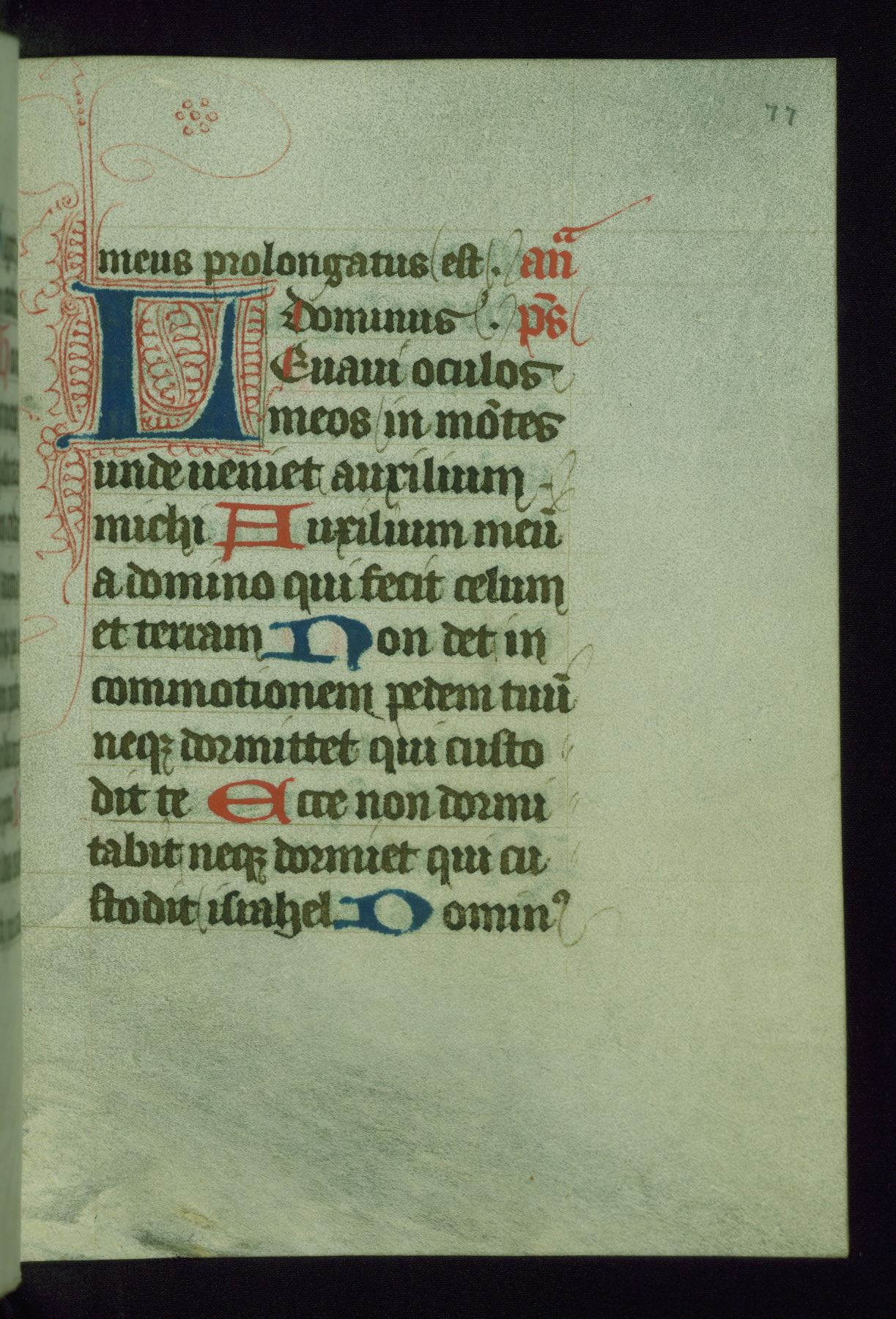 This prayer book was produced ca. 1430-40, likely in Brabant, but the contents of the calendar point to Tournai and Cambrai, and the Office of the Dead is for the use of Liège. North Netherlandish influence, possibly connected with works by the Masters of the Gold Scrolls, is suggested by the style and iconography of its images. The manuscript is notable for its large number of miniatures--forty-eight in total--as well as the sense of narrative within them, and the diversity of the suffrages they illustrate is striking. That the original owner had a strong interest in the Passion is evident in both the choice of texts and the images. The manuscript was well used, and accrued not only additional prayers and suffrages, but devotional objects as well: a pilgrim's badge was once attached to the corner of the image for the suffrage to relics on fol. 160r.
