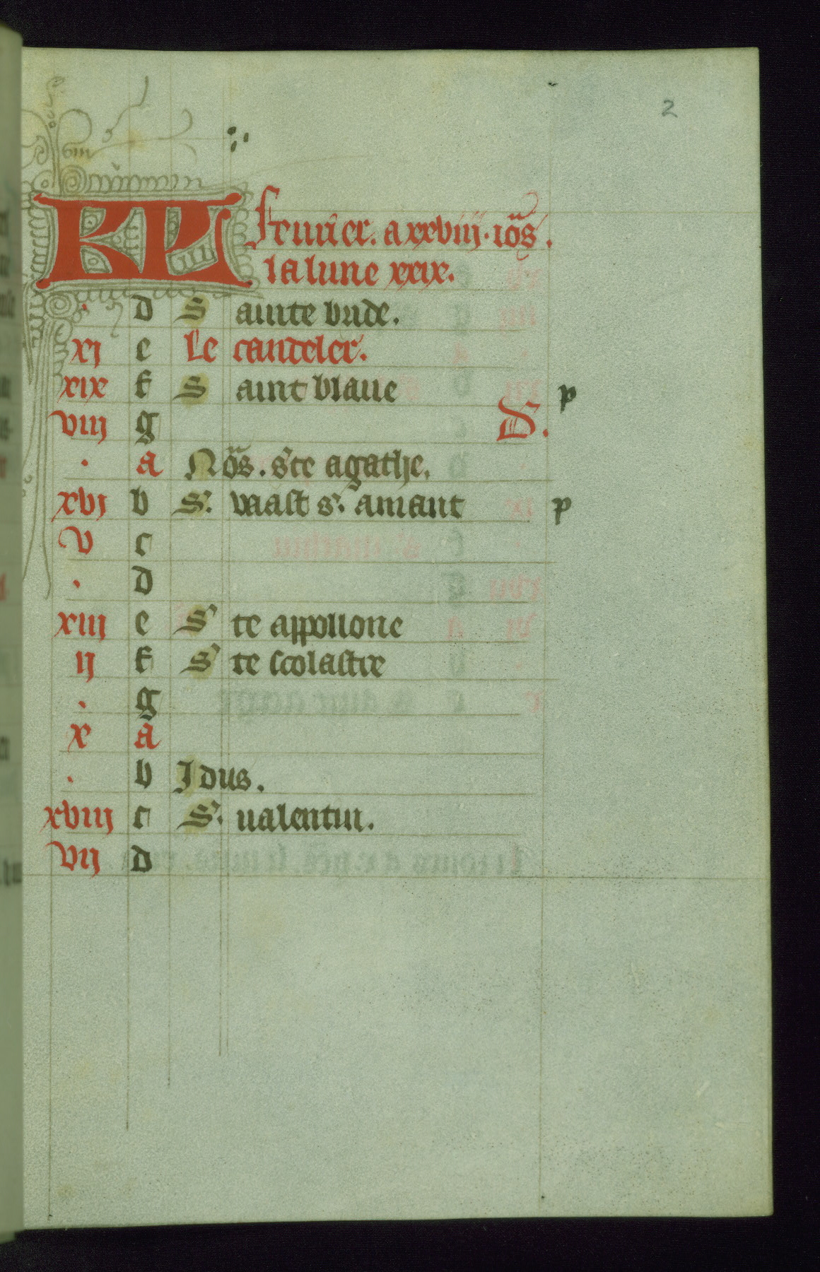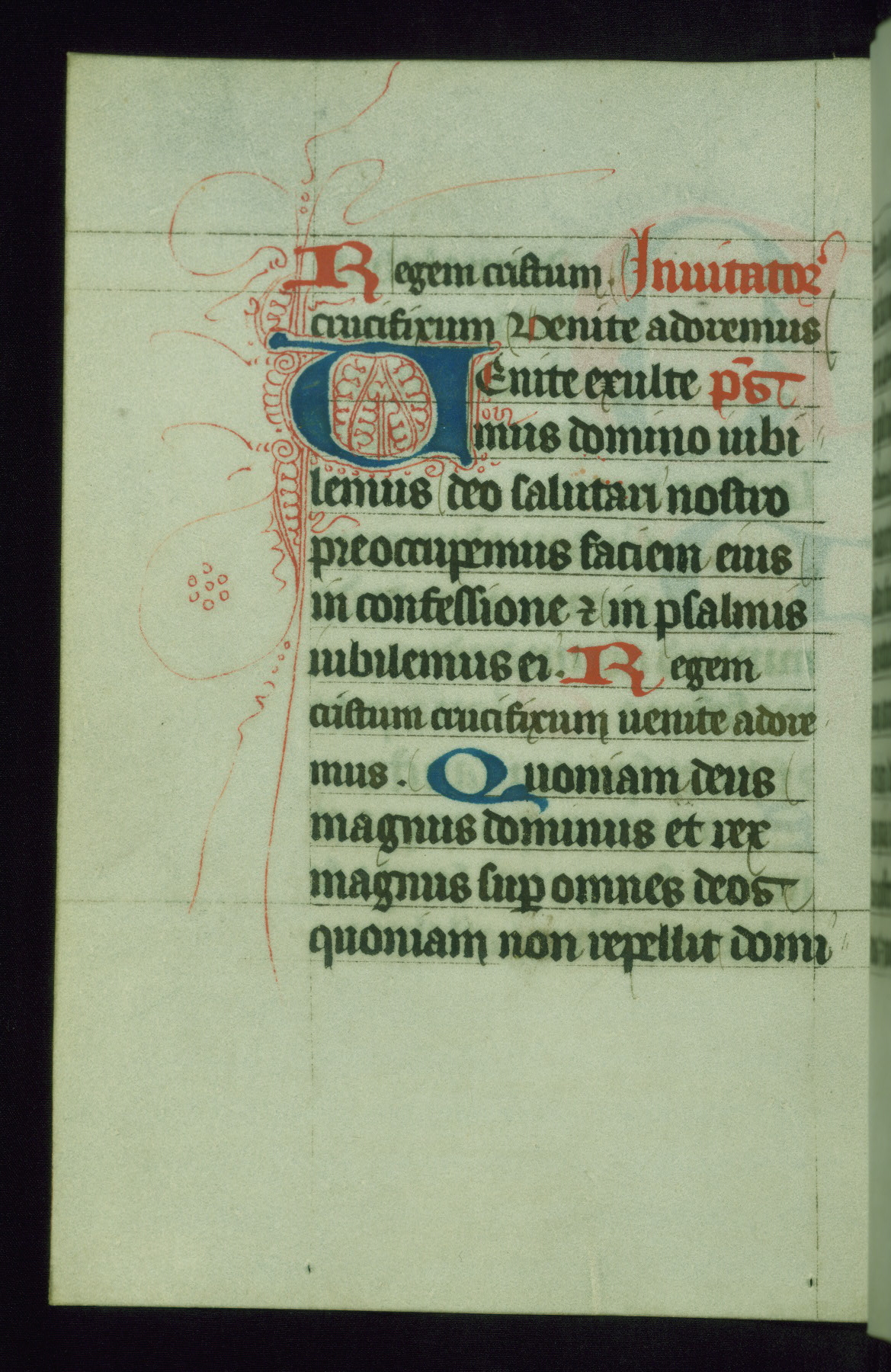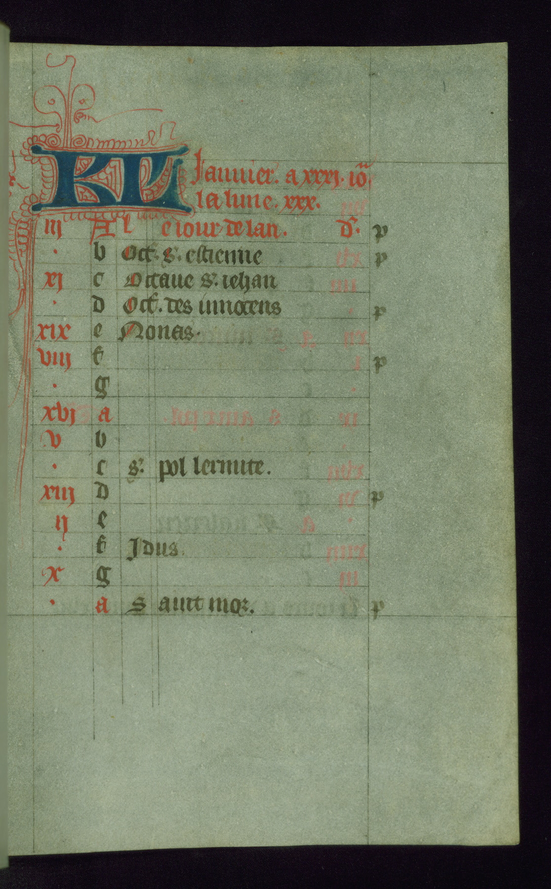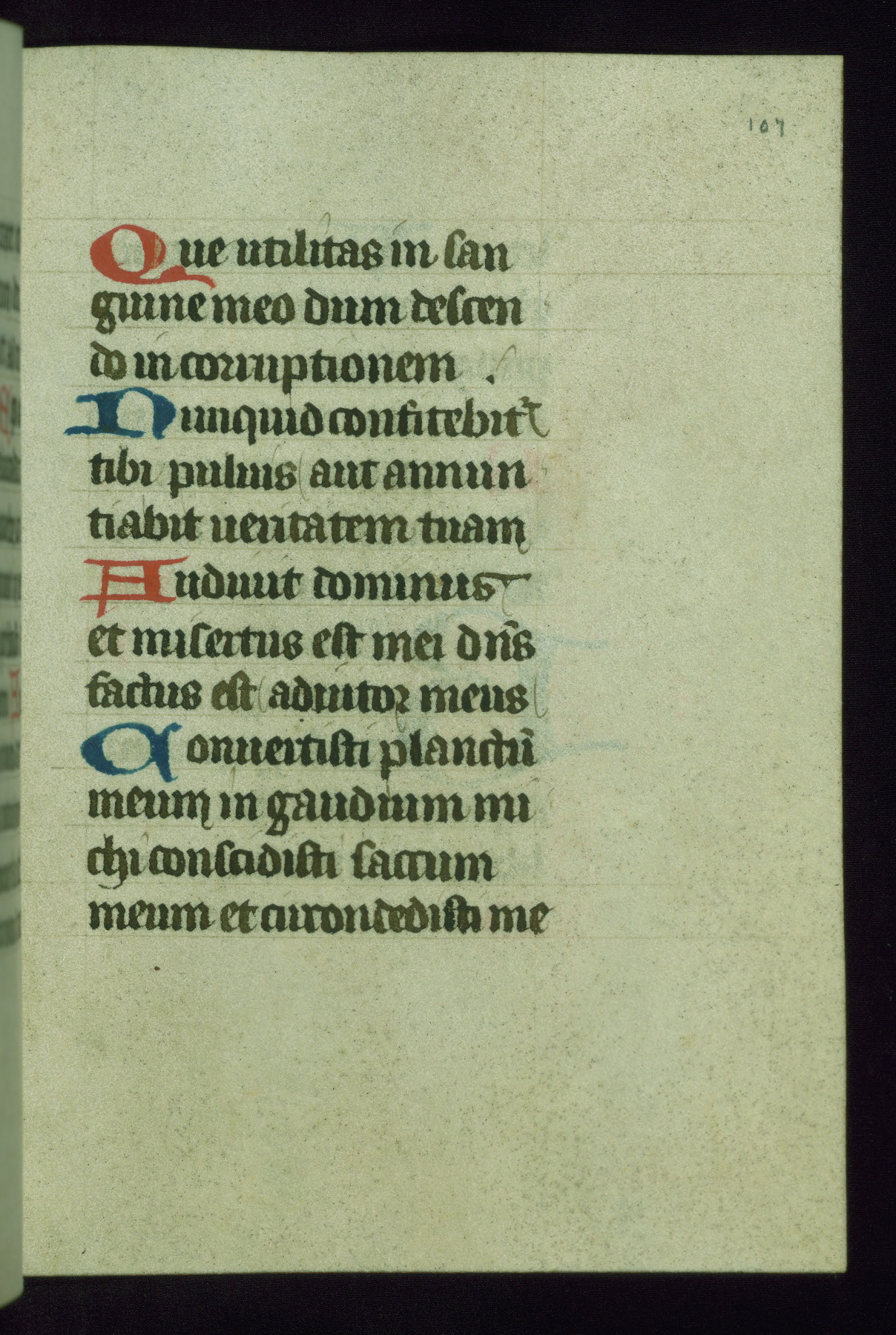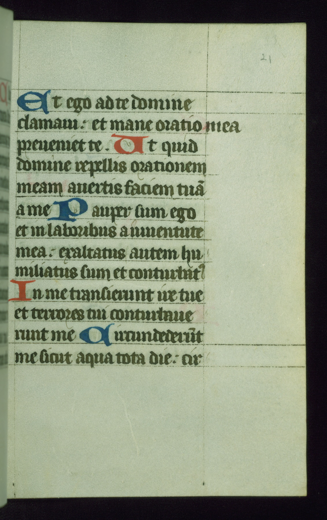 This prayer book was produced ca. 1430-40, likely in Brabant, but the contents of the calendar point to Tournai and Cambrai, and the Office of the Dead is for the use of Liège. North Netherlandish influence, possibly connected with works by the Masters of the Gold Scrolls, is suggested by the style and iconography of its images. The manuscript is notable for its large number of miniatures--forty-eight in total--as well as the sense of narrative within them, and the diversity of the suffrages they illustrate is striking. That the original owner had a strong interest in the Passion is evident in both the choice of texts and the images. The manuscript was well used, and accrued not only additional prayers and suffrages, but devotional objects as well: a pilgrim's badge was once attached to the corner of the image for the suffrage to relics on fol. 160r.