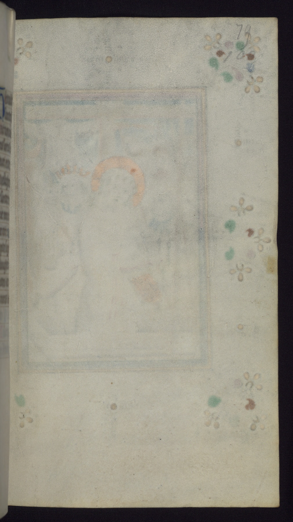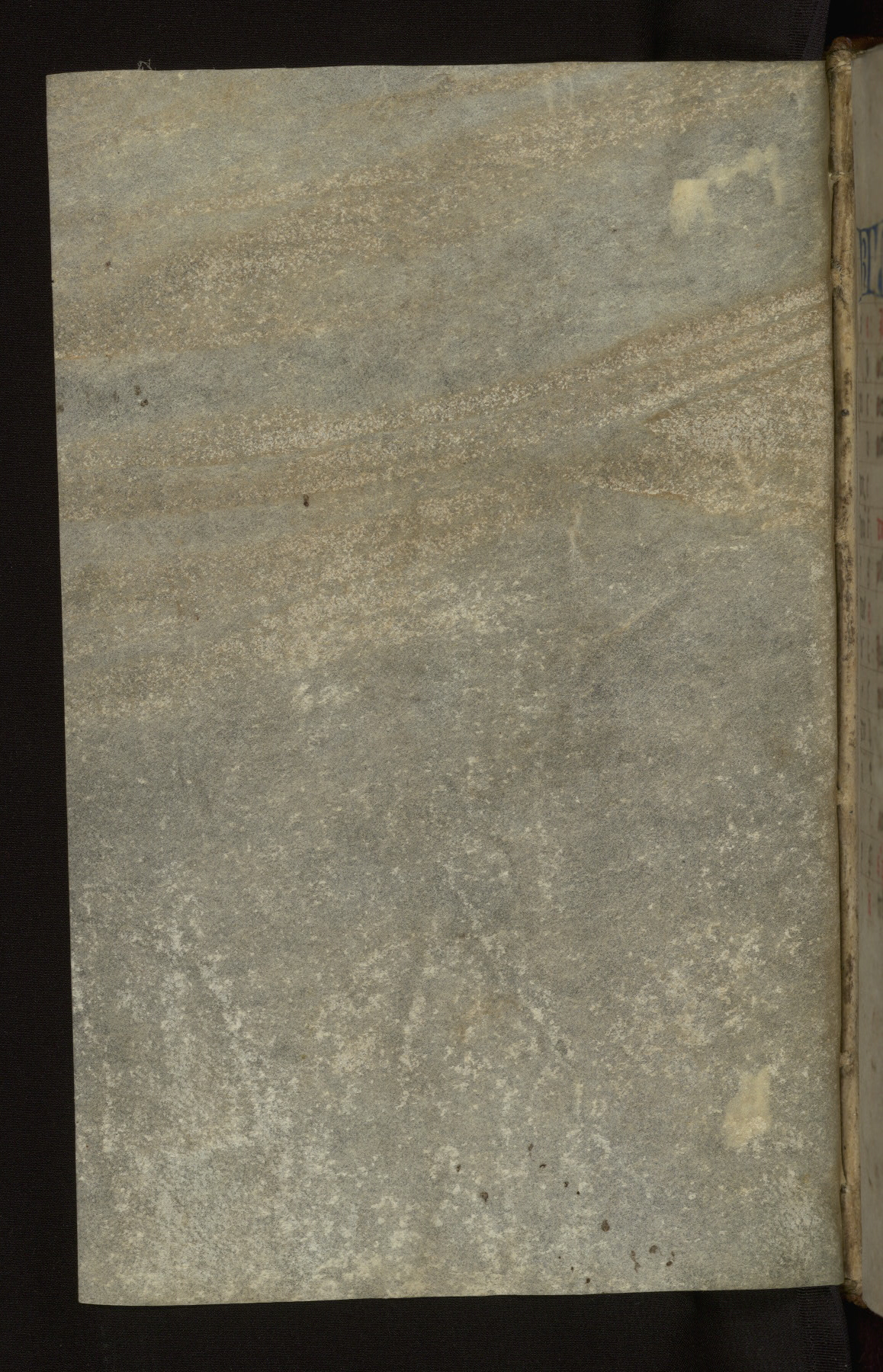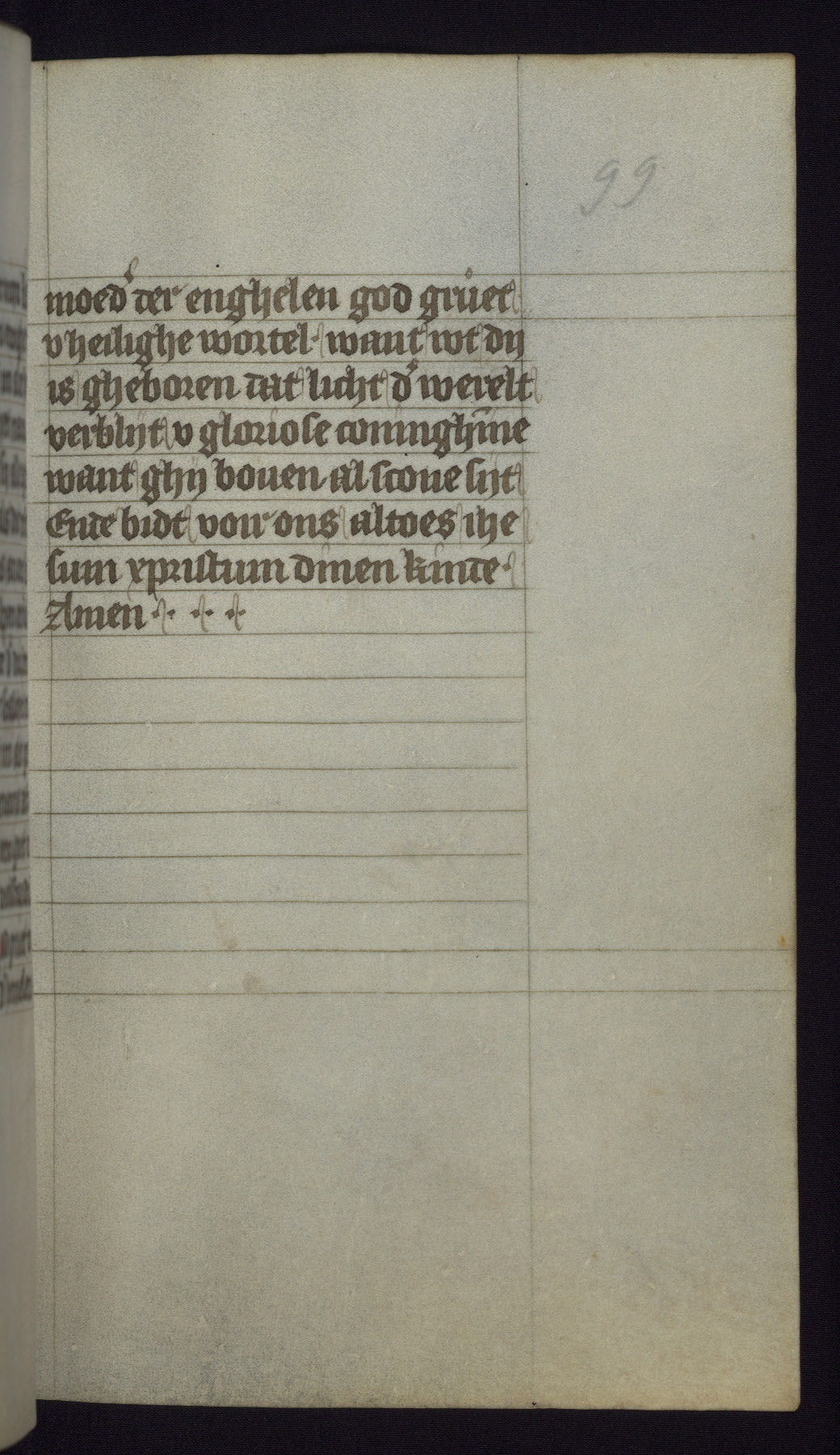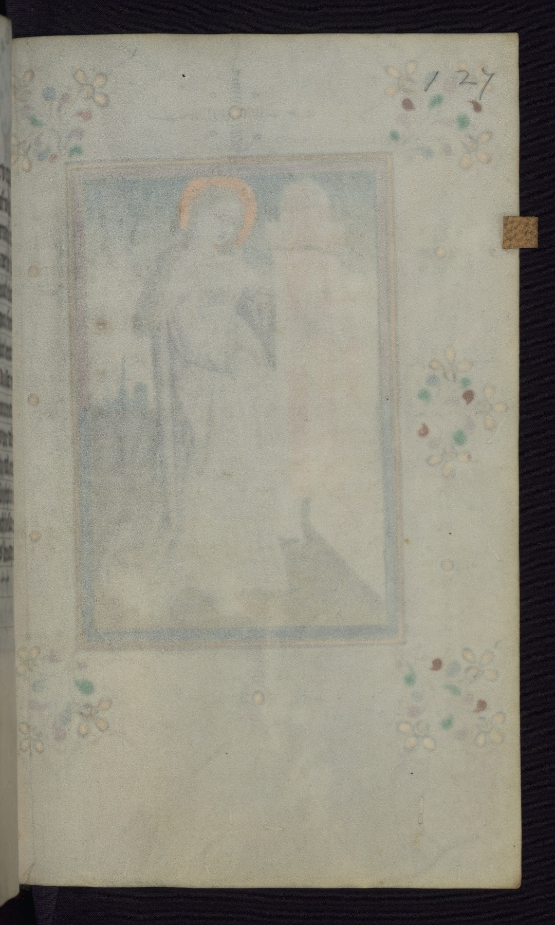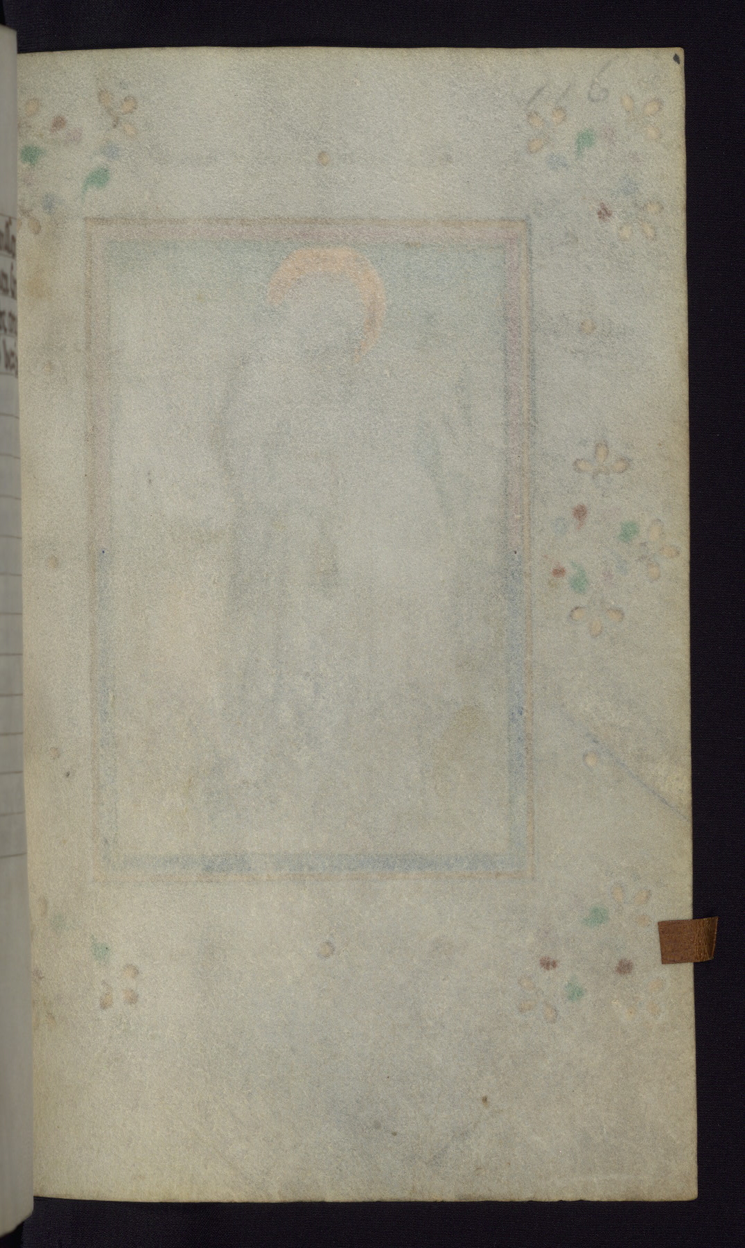 This mid-fifteenth-century illuminated book of hours is written entirely in Dutch on fine parchment and is remarkable for its eighteen grisaille miniatures. This technique, wherein the figures are modeled primarily in a gray wash, became a favorite in the Netherlands. The hand behind the miniatures in this manuscript has been identified with a group of artists known as the Masters of the Delft Grisailles. The manuscript has been grouped with more than a dozen related works, including New York, Pierpont Morgan Library Ms. M.349; London, Victoria and Albert Museum, Geo. Reid Ms. 32; Leiden, Bibliotheek der Rijksuniversiteit BPL 224; Brussels, Bibliothèque Royale Ms. 21696; Antwerp, Plantin Moretus Ms. 49; and The Hague, Koninklijke Bibliotheek Ms. 74 G 35. The manuscript comprises 152 folios and is almost completely intact, lacking only two miniatures. It retains its original brown leather binding decorated with mythological beasts and a now illegible inscription. The calendar is for the use of Utrecht, which helps localize its original ownership, as might a mostly erased ownership inscription that has been partially recovered. Good impressions of two circular pilgrim badges, now removed, are visible on fol. 112v.