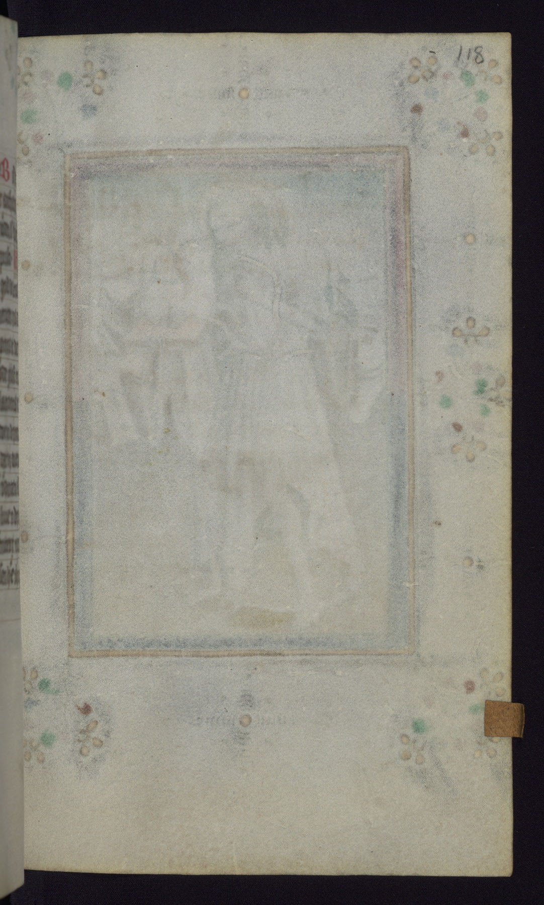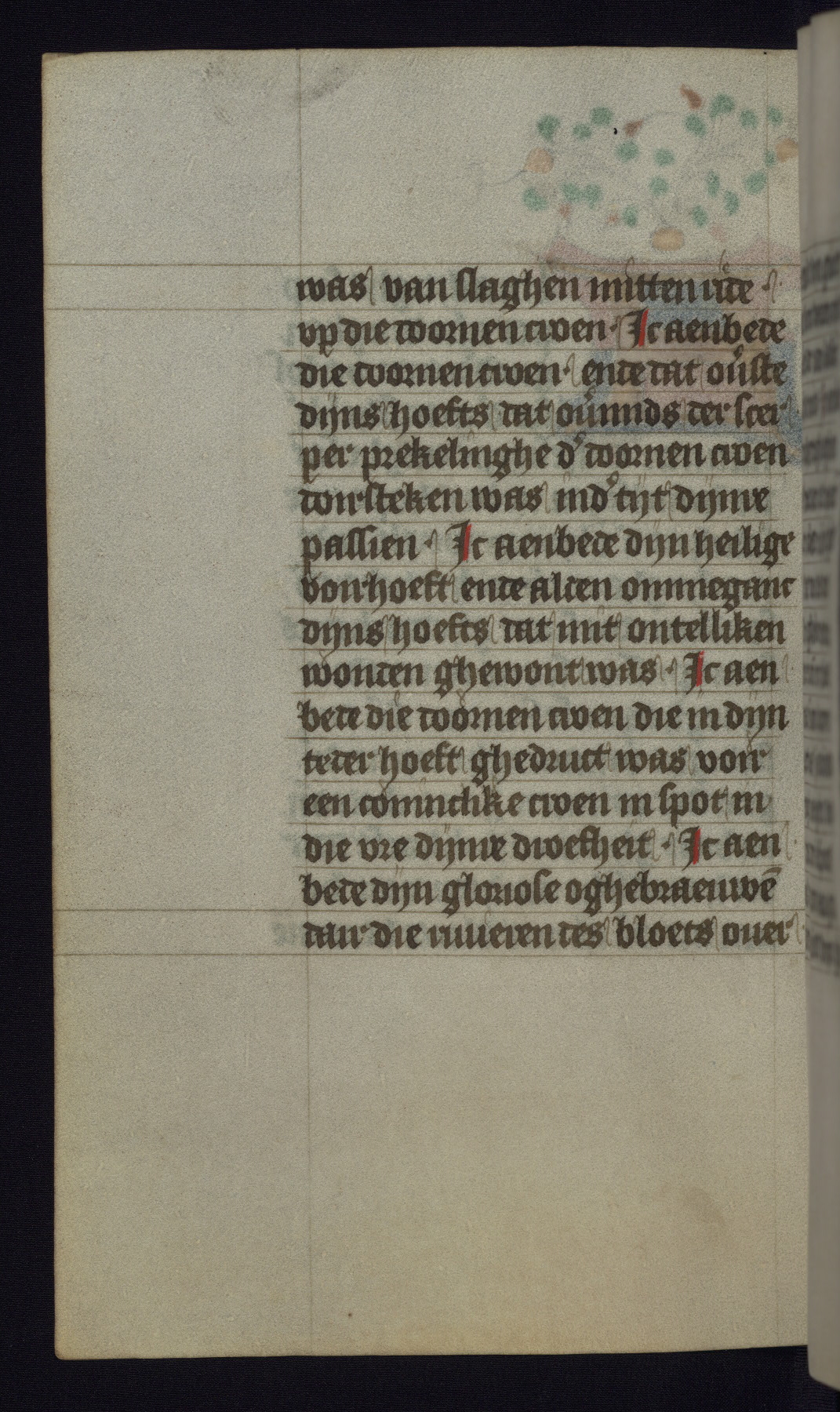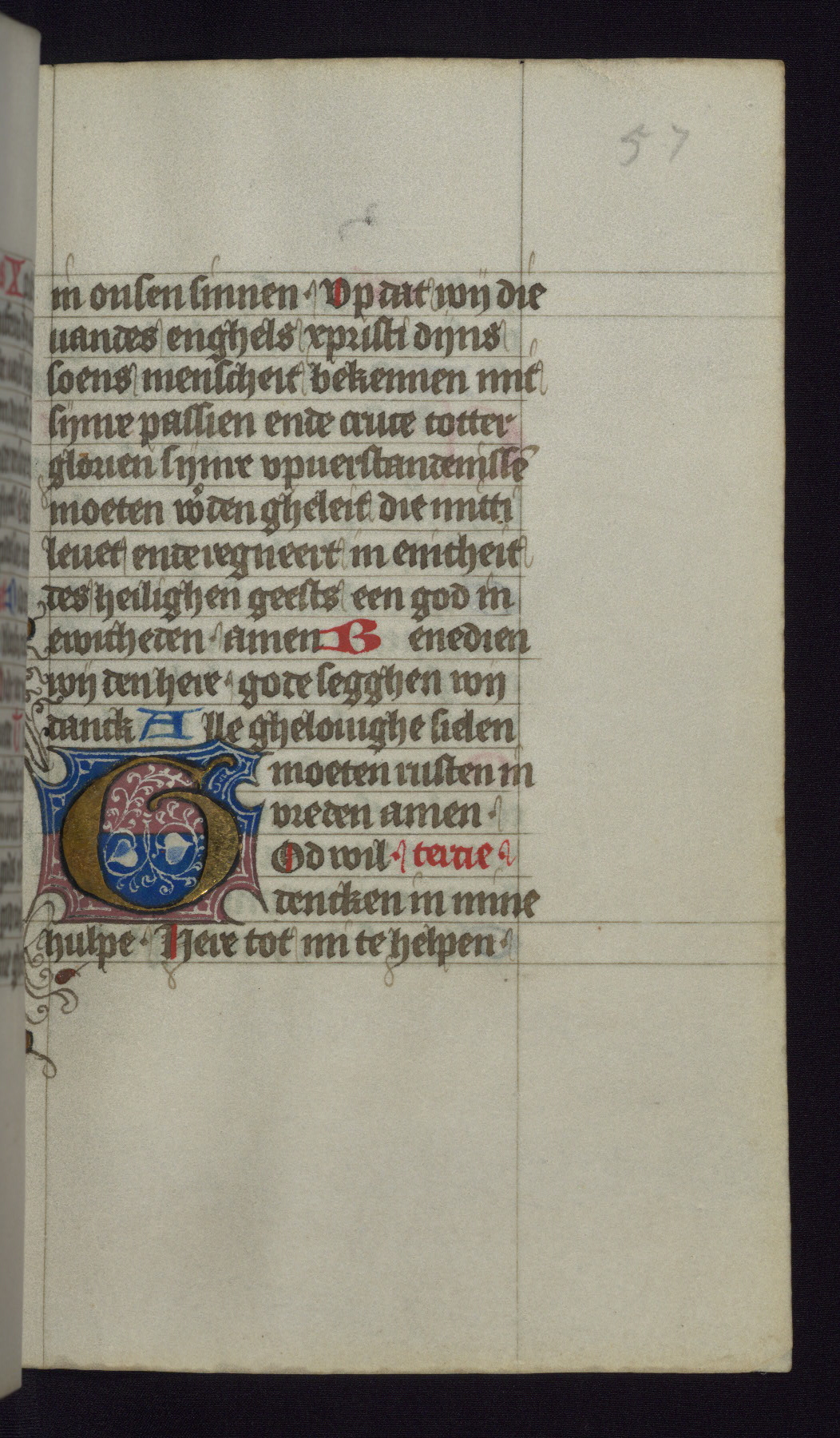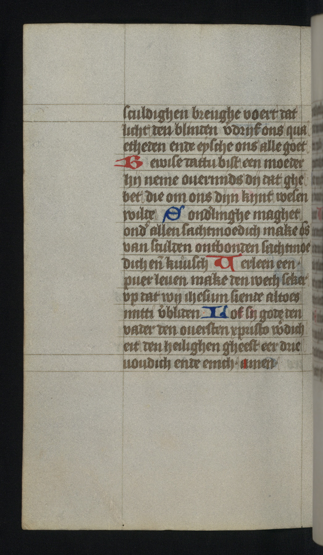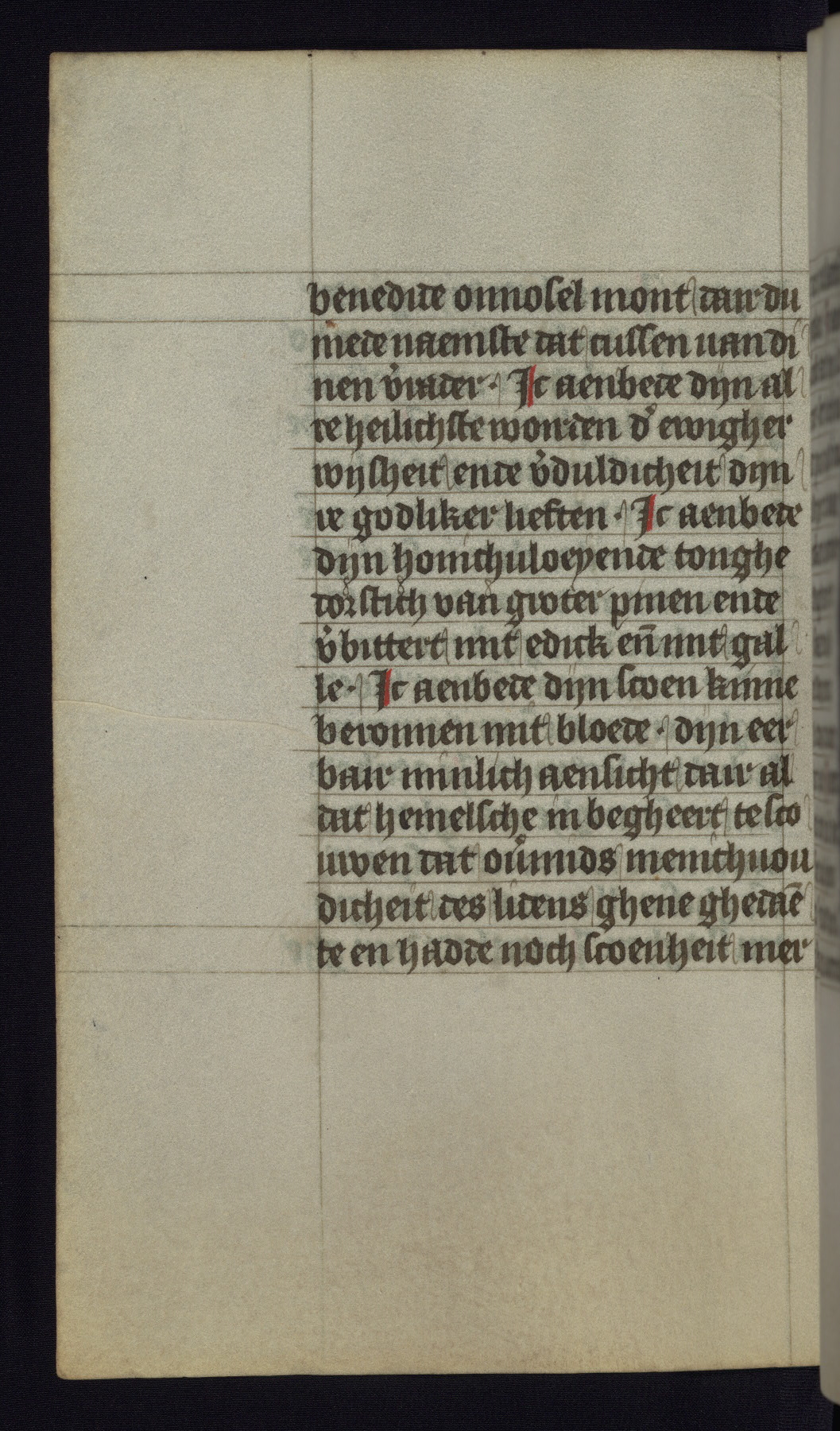 This mid-fifteenth-century illuminated book of hours is written entirely in Dutch on fine parchment and is remarkable for its eighteen grisaille miniatures. This technique, wherein the figures are modeled primarily in a gray wash, became a favorite in the Netherlands. The hand behind the miniatures in this manuscript has been identified with a group of artists known as the Masters of the Delft Grisailles. The manuscript has been grouped with more than a dozen related works, including New York, Pierpont Morgan Library Ms. M.349; London, Victoria and Albert Museum, Geo. Reid Ms. 32; Leiden, Bibliotheek der Rijksuniversiteit BPL 224; Brussels, Bibliothèque Royale Ms. 21696; Antwerp, Plantin Moretus Ms. 49; and The Hague, Koninklijke Bibliotheek Ms. 74 G 35. The manuscript comprises 152 folios and is almost completely intact, lacking only two miniatures. It retains its original brown leather binding decorated with mythological beasts and a now illegible inscription. The calendar is for the use of Utrecht, which helps localize its original ownership, as might a mostly erased ownership inscription that has been partially recovered. Good impressions of two circular pilgrim badges, now removed, are visible on fol. 112v.