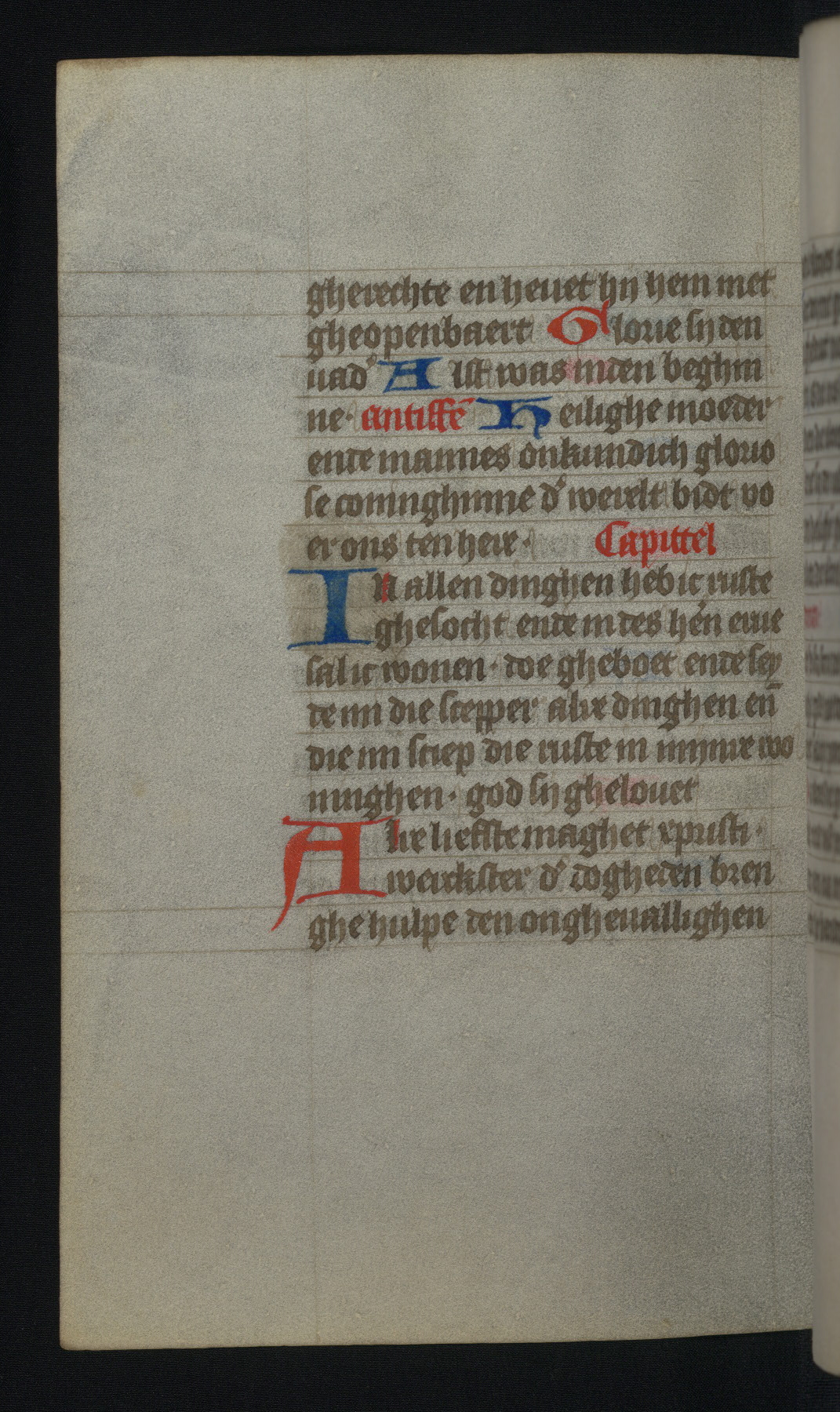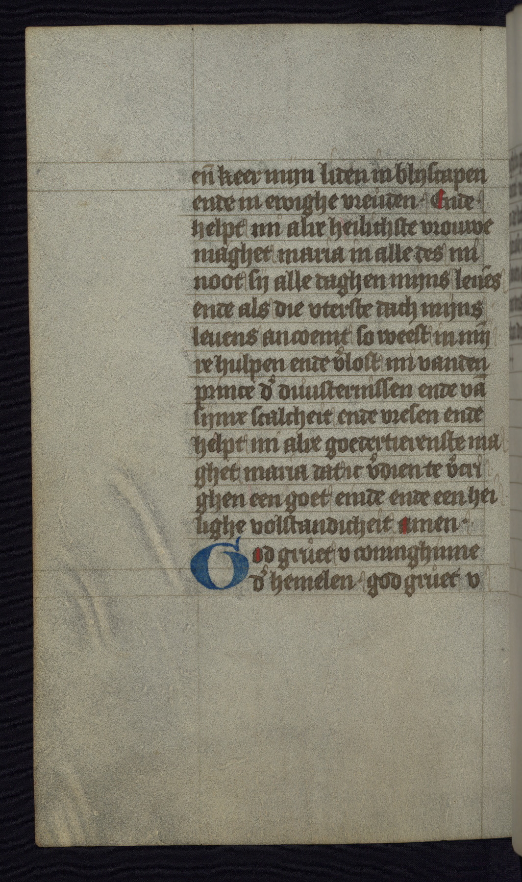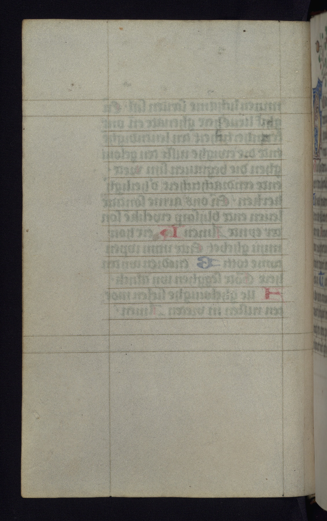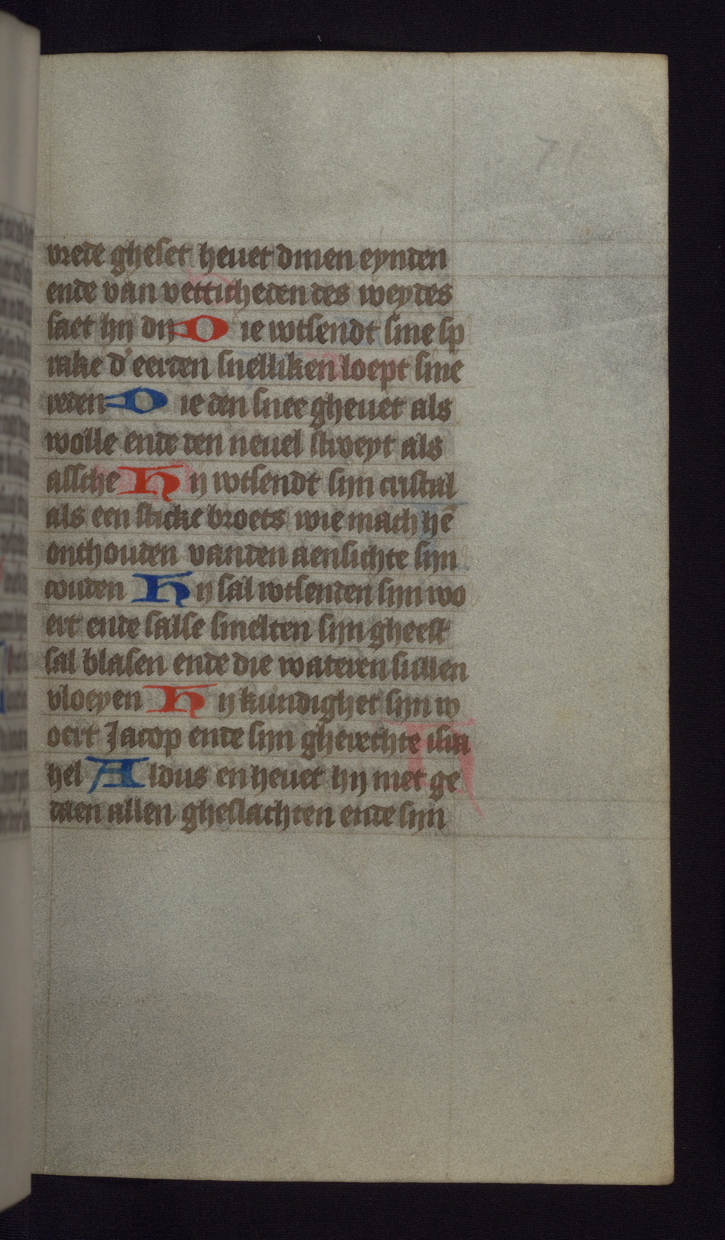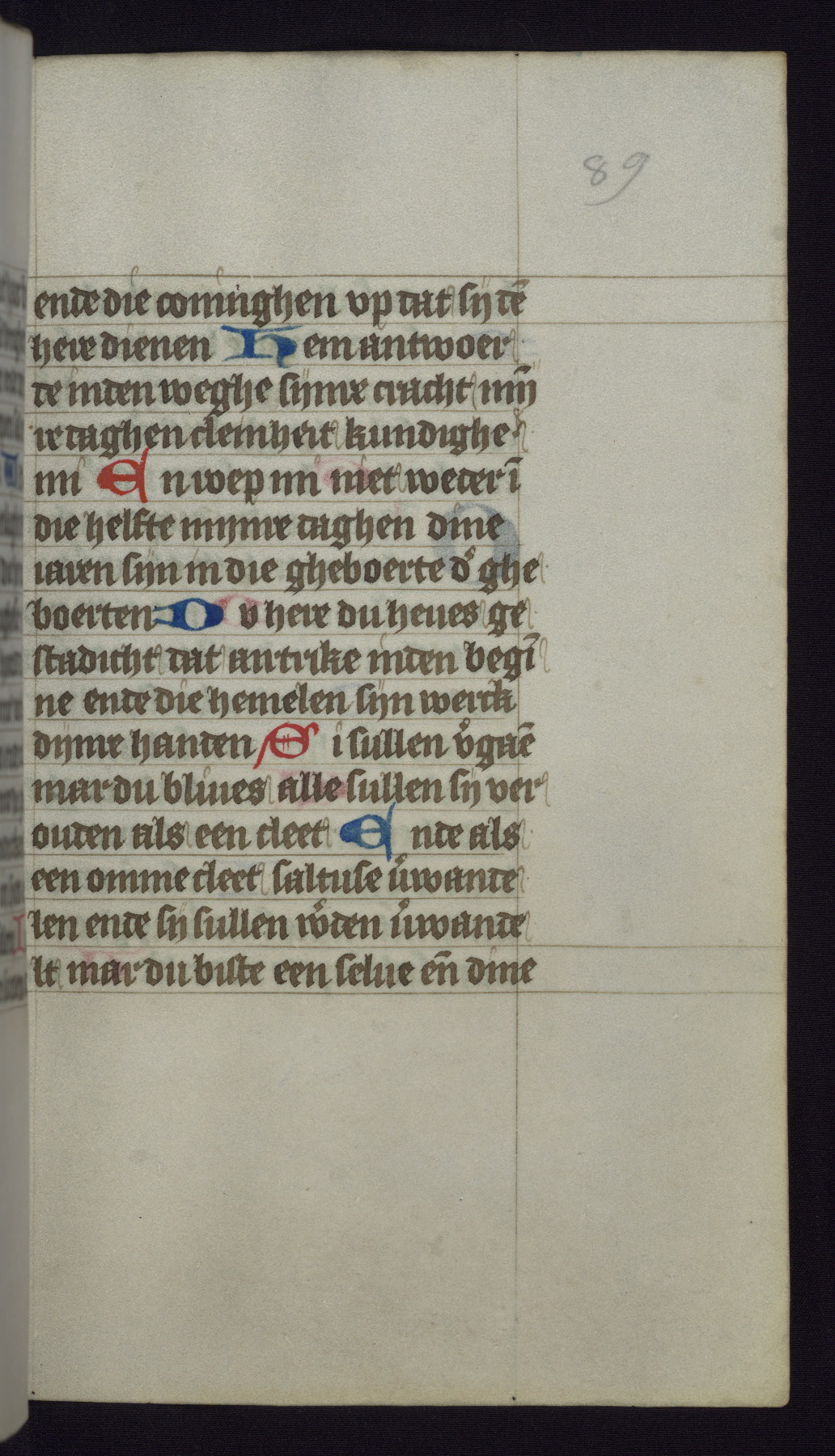 This mid-fifteenth-century illuminated book of hours is written entirely in Dutch on fine parchment and is remarkable for its eighteen grisaille miniatures. This technique, wherein the figures are modeled primarily in a gray wash, became a favorite in the Netherlands. The hand behind the miniatures in this manuscript has been identified with a group of artists known as the Masters of the Delft Grisailles. The manuscript has been grouped with more than a dozen related works, including New York, Pierpont Morgan Library Ms. M.349; London, Victoria and Albert Museum, Geo. Reid Ms. 32; Leiden, Bibliotheek der Rijksuniversiteit BPL 224; Brussels, Bibliothèque Royale Ms. 21696; Antwerp, Plantin Moretus Ms. 49; and The Hague, Koninklijke Bibliotheek Ms. 74 G 35. The manuscript comprises 152 folios and is almost completely intact, lacking only two miniatures. It retains its original brown leather binding decorated with mythological beasts and a now illegible inscription. The calendar is for the use of Utrecht, which helps localize its original ownership, as might a mostly erased ownership inscription that has been partially recovered. Good impressions of two circular pilgrim badges, now removed, are visible on fol. 112v.