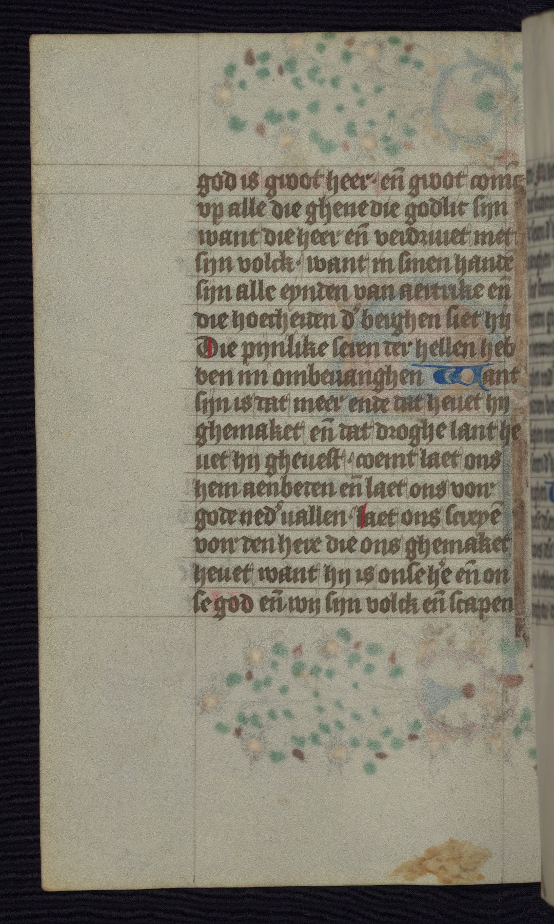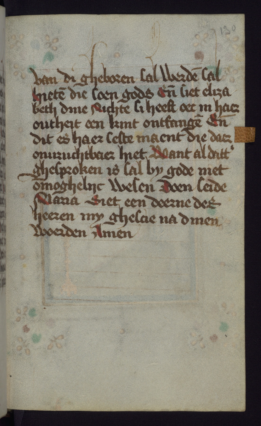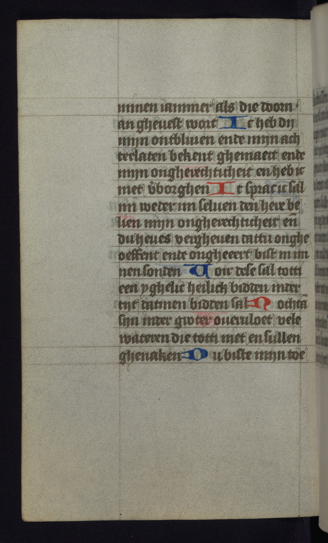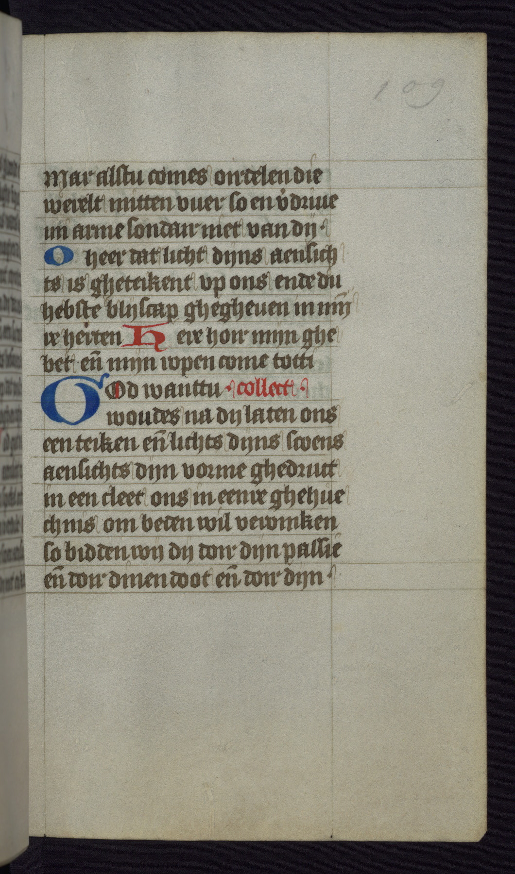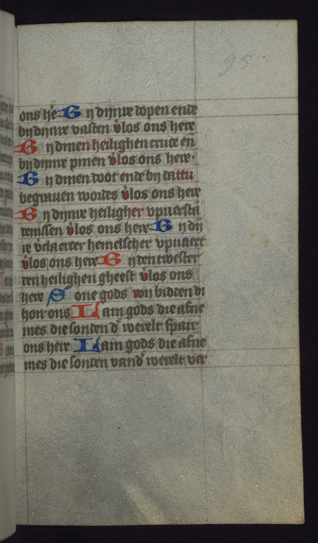This mid-fifteenth-century illuminated book of hours is written entirely in Dutch on fine parchment and is remarkable for its eighteen grisaille miniatures. This technique, wherein the figures are modeled primarily in a gray wash, became a favorite in the Netherlands. The hand behind the miniatures in this manuscript has been identified with a group of artists known as the Masters of the Delft Grisailles. The manuscript has been grouped with more than a dozen related works, including New York, Pierpont Morgan Library Ms. M.349; London, Victoria and Albert Museum, Geo. Reid Ms. 32; Leiden, Bibliotheek der Rijksuniversiteit BPL 224; Brussels, Bibliothèque Royale Ms. 21696; Antwerp, Plantin Moretus Ms. 49; and The Hague, Koninklijke Bibliotheek Ms. 74 G 35. The manuscript comprises 152 folios and is almost completely intact, lacking only two miniatures. It retains its original brown leather binding decorated with mythological beasts and a now illegible inscription. The calendar is for the use of Utrecht, which helps localize its original ownership, as might a mostly erased ownership inscription that has been partially recovered. Good impressions of two circular pilgrim badges, now removed, are visible on fol. 112v.