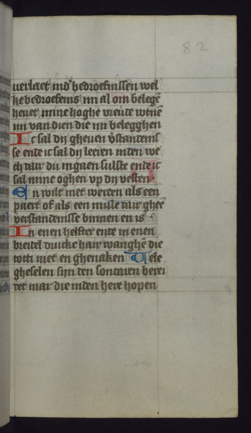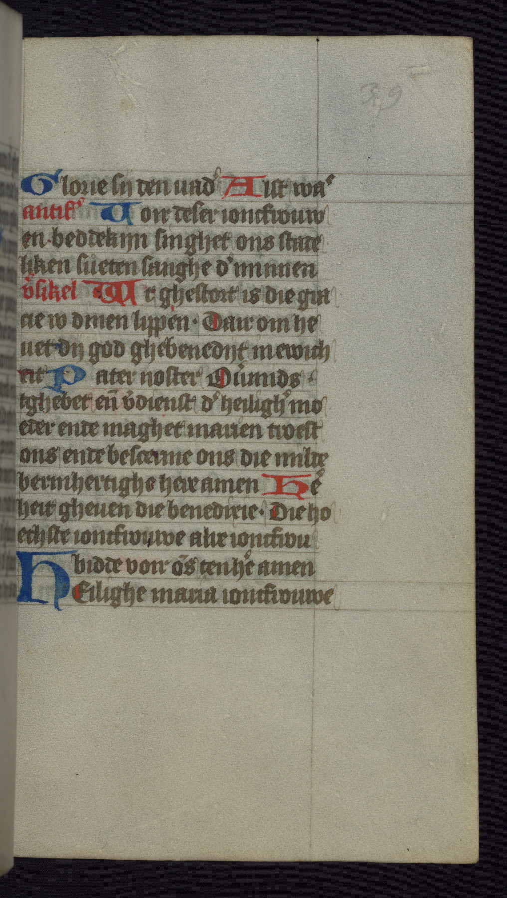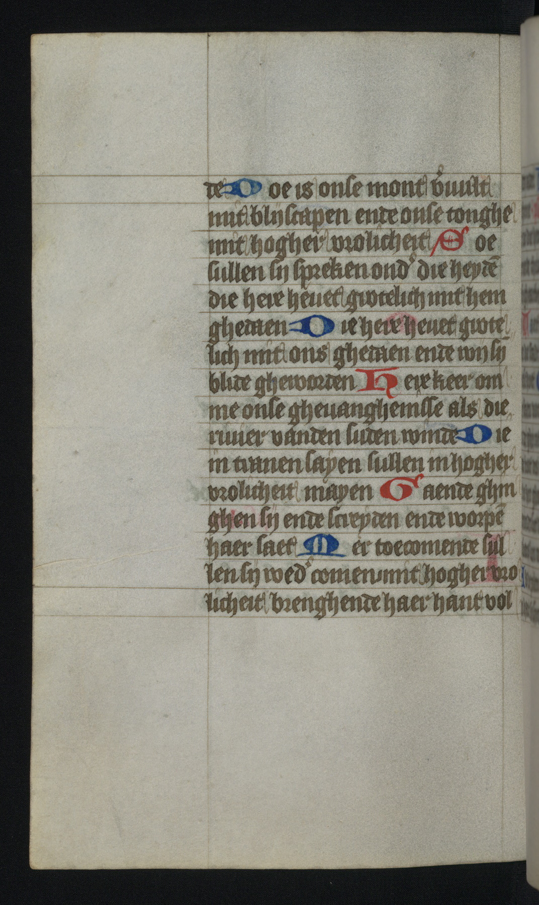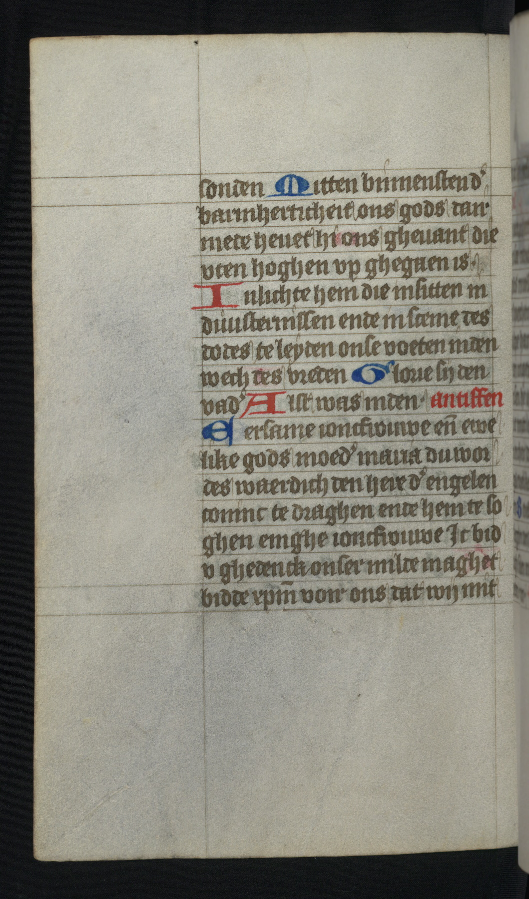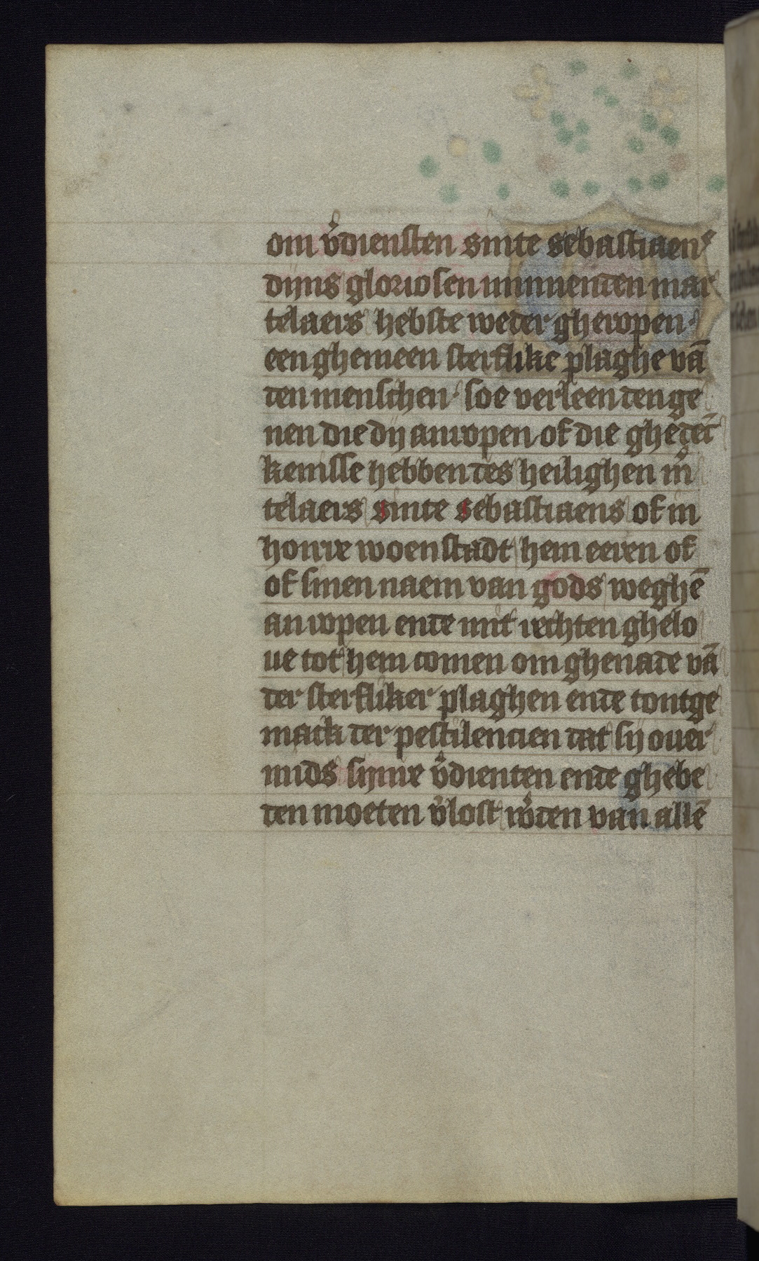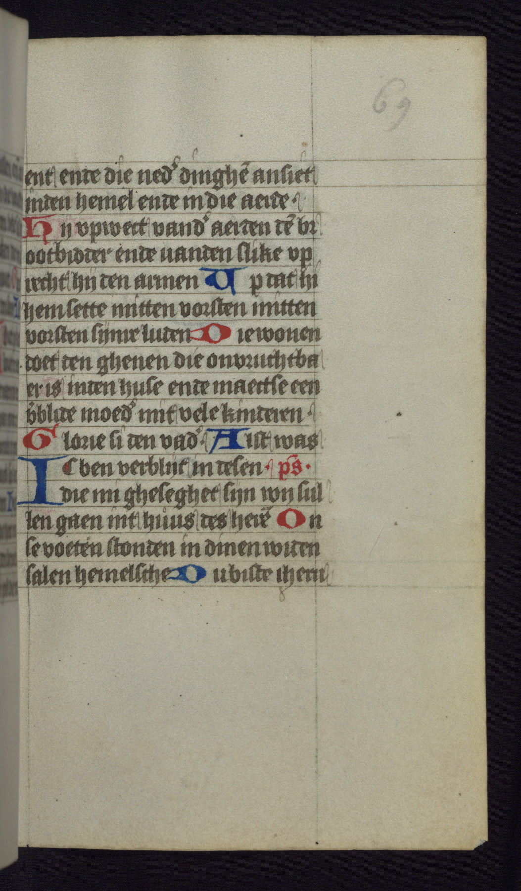 This mid-fifteenth-century illuminated book of hours is written entirely in Dutch on fine parchment and is remarkable for its eighteen grisaille miniatures. This technique, wherein the figures are modeled primarily in a gray wash, became a favorite in the Netherlands. The hand behind the miniatures in this manuscript has been identified with a group of artists known as the Masters of the Delft Grisailles. The manuscript has been grouped with more than a dozen related works, including New York, Pierpont Morgan Library Ms. M.349; London, Victoria and Albert Museum, Geo. Reid Ms. 32; Leiden, Bibliotheek der Rijksuniversiteit BPL 224; Brussels, Bibliothèque Royale Ms. 21696; Antwerp, Plantin Moretus Ms. 49; and The Hague, Koninklijke Bibliotheek Ms. 74 G 35. The manuscript comprises 152 folios and is almost completely intact, lacking only two miniatures. It retains its original brown leather binding decorated with mythological beasts and a now illegible inscription. The calendar is for the use of Utrecht, which helps localize its original ownership, as might a mostly erased ownership inscription that has been partially recovered. Good impressions of two circular pilgrim badges, now removed, are visible on fol. 112v.