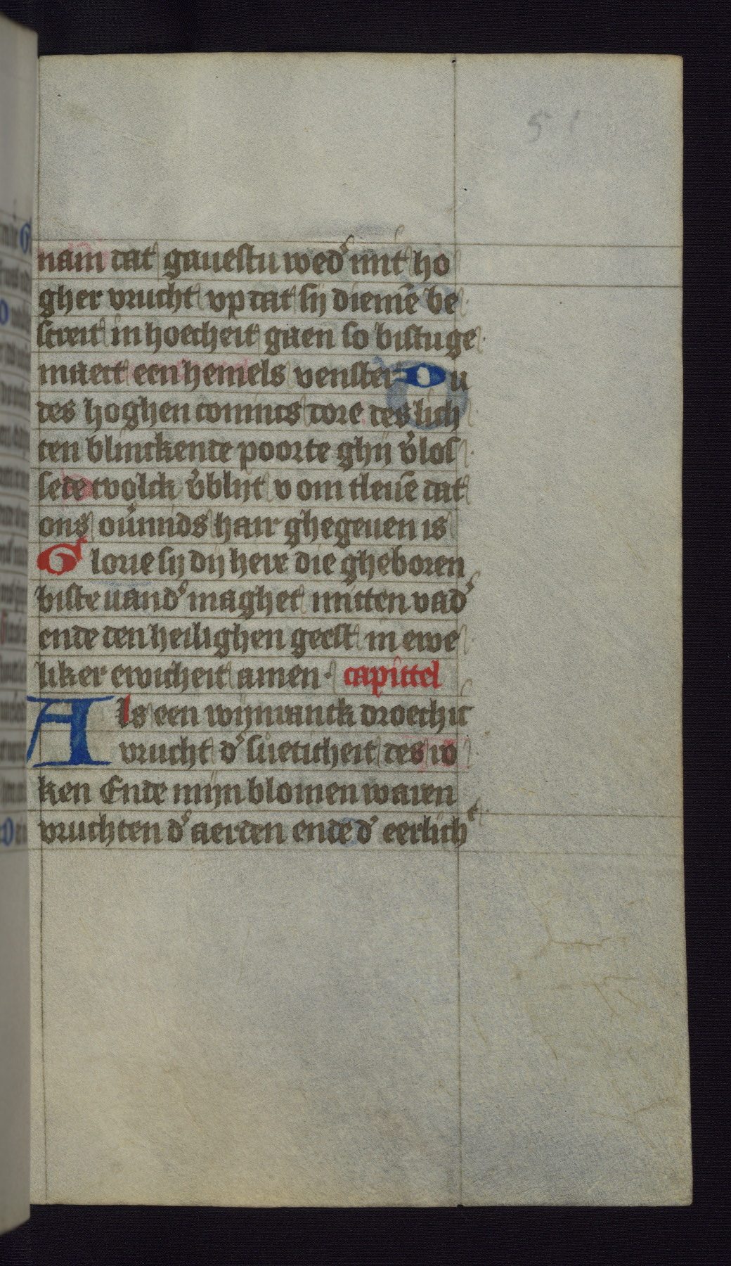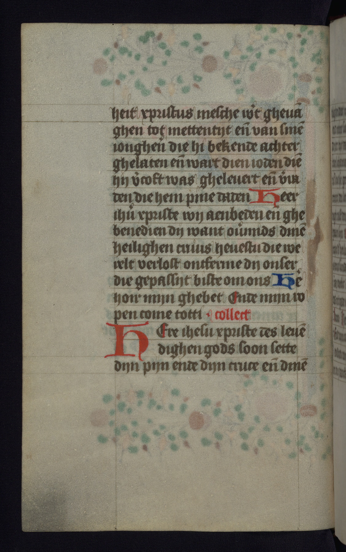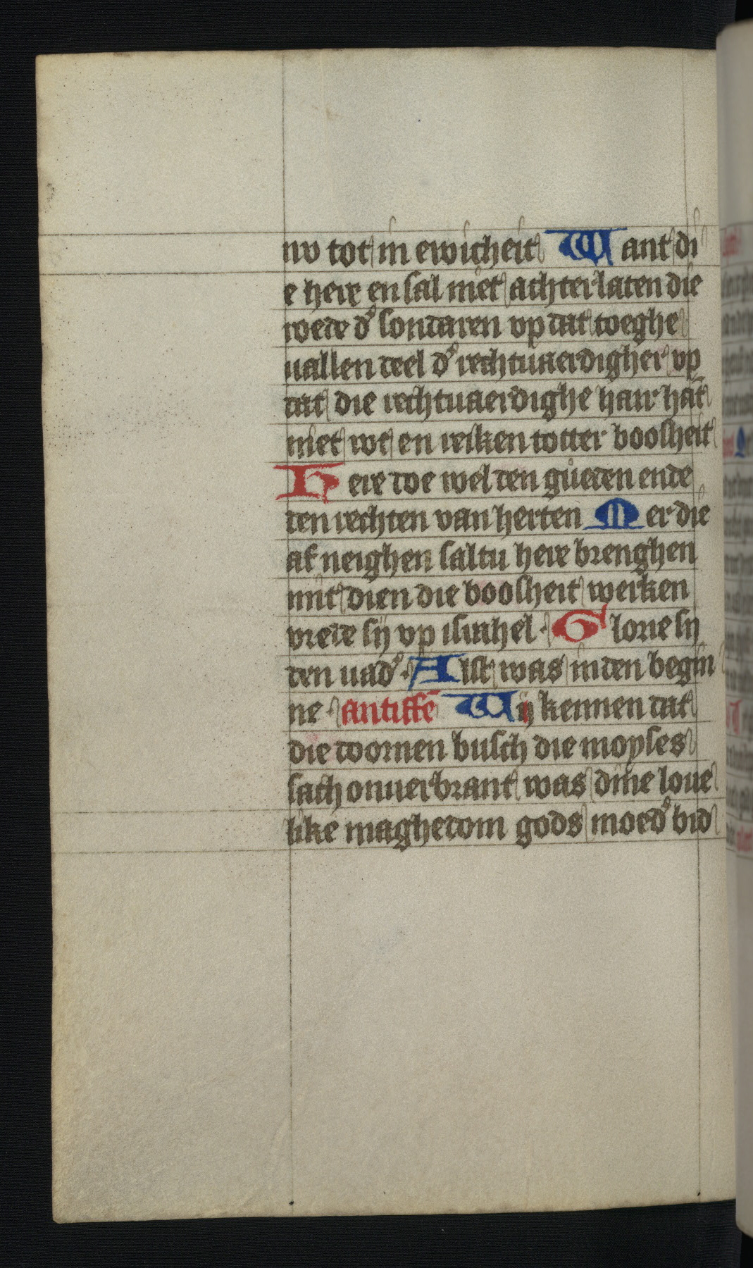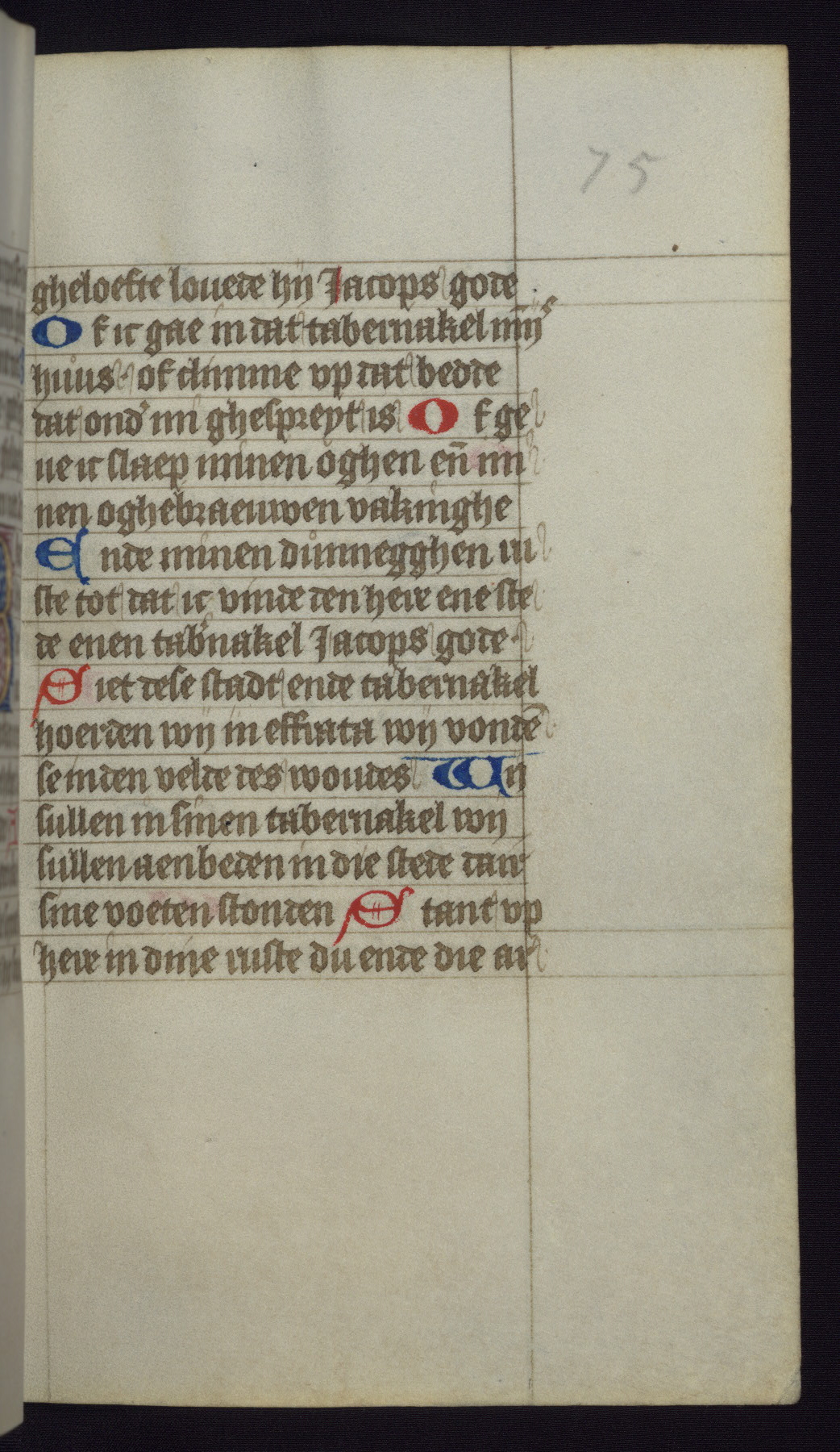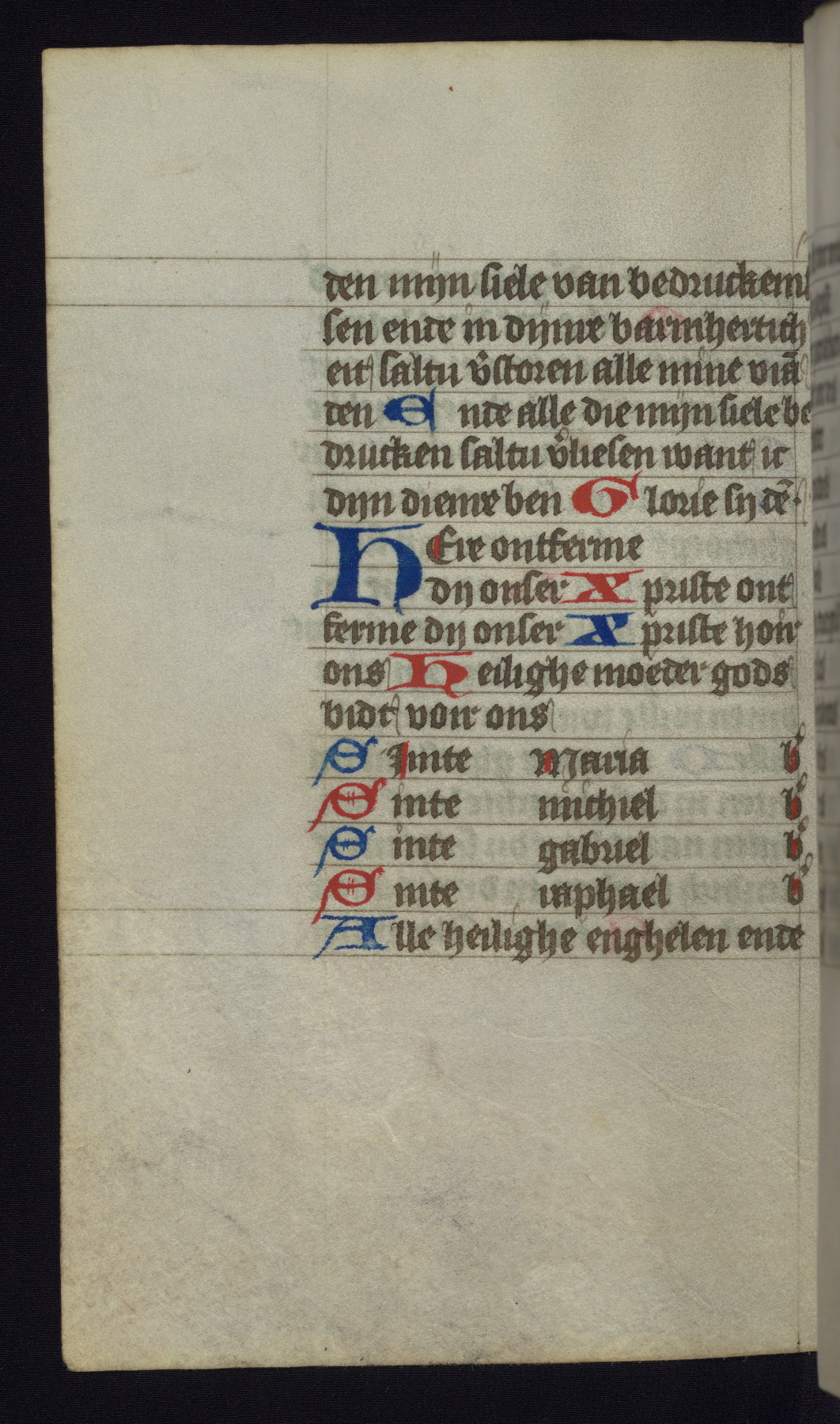 This mid-fifteenth-century illuminated book of hours is written entirely in Dutch on fine parchment and is remarkable for its eighteen grisaille miniatures. This technique, wherein the figures are modeled primarily in a gray wash, became a favorite in the Netherlands. The hand behind the miniatures in this manuscript has been identified with a group of artists known as the Masters of the Delft Grisailles. The manuscript has been grouped with more than a dozen related works, including New York, Pierpont Morgan Library Ms. M.349; London, Victoria and Albert Museum, Geo. Reid Ms. 32; Leiden, Bibliotheek der Rijksuniversiteit BPL 224; Brussels, Bibliothèque Royale Ms. 21696; Antwerp, Plantin Moretus Ms. 49; and The Hague, Koninklijke Bibliotheek Ms. 74 G 35. The manuscript comprises 152 folios and is almost completely intact, lacking only two miniatures. It retains its original brown leather binding decorated with mythological beasts and a now illegible inscription. The calendar is for the use of Utrecht, which helps localize its original ownership, as might a mostly erased ownership inscription that has been partially recovered. Good impressions of two circular pilgrim badges, now removed, are visible on fol. 112v.