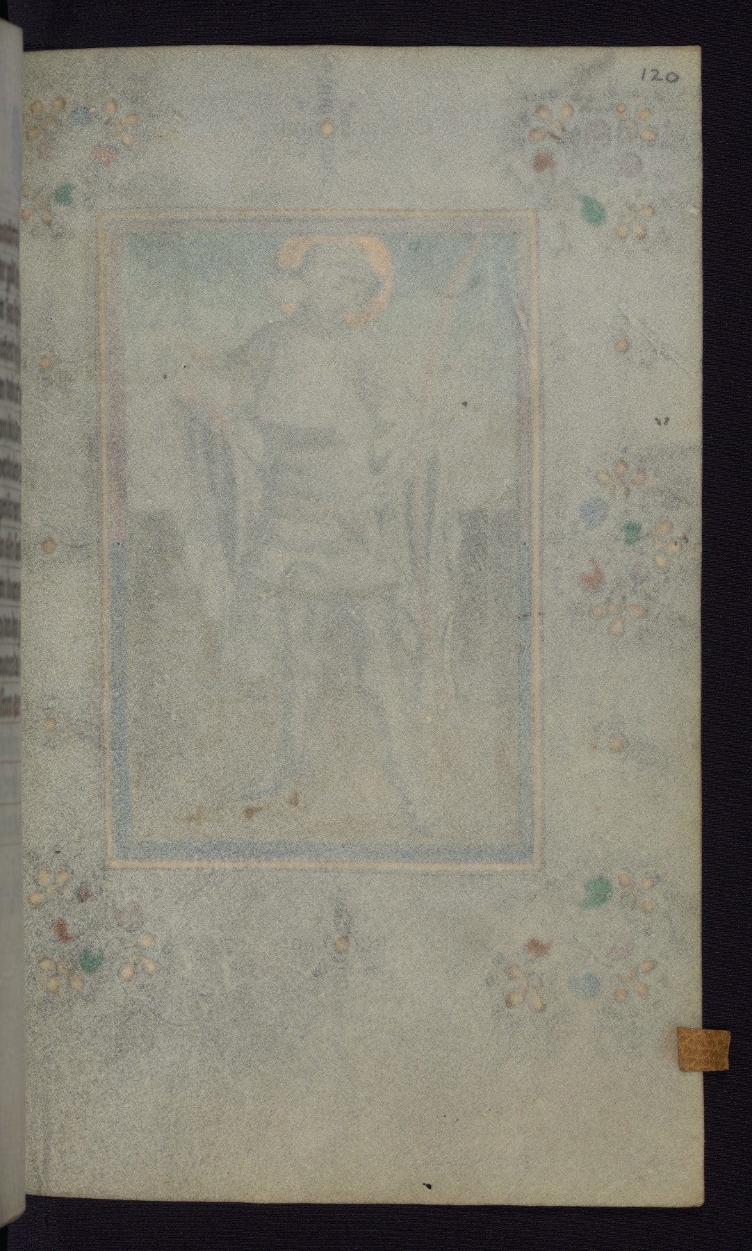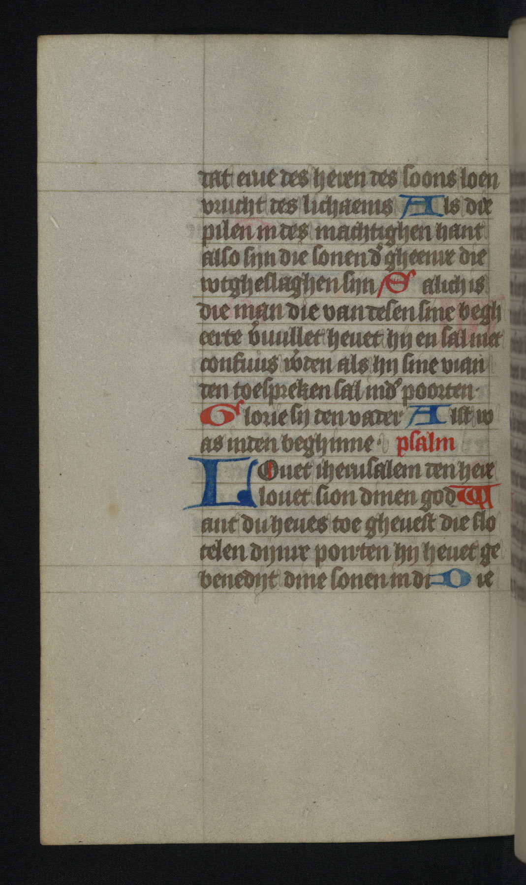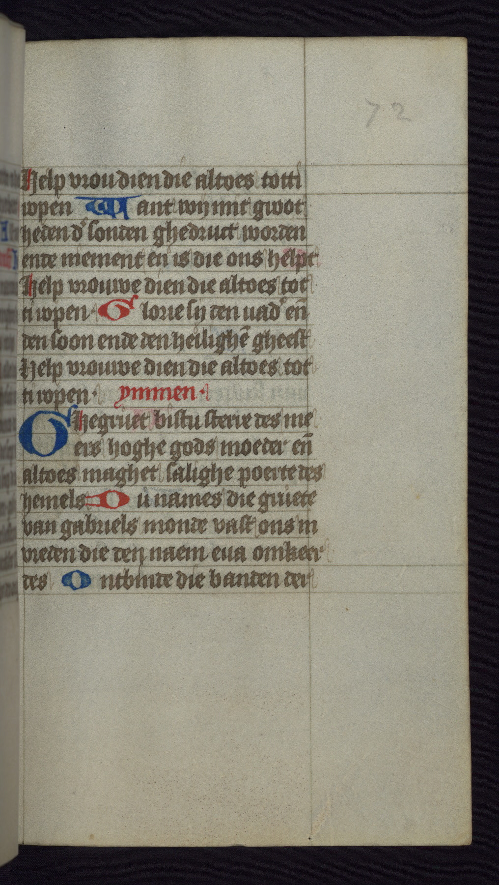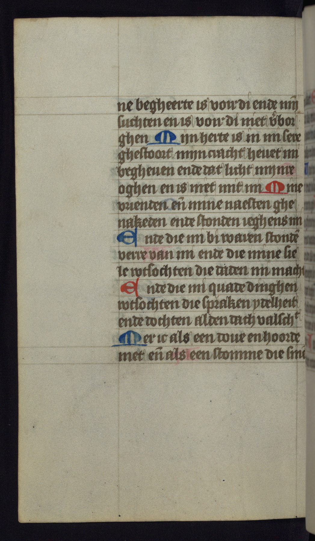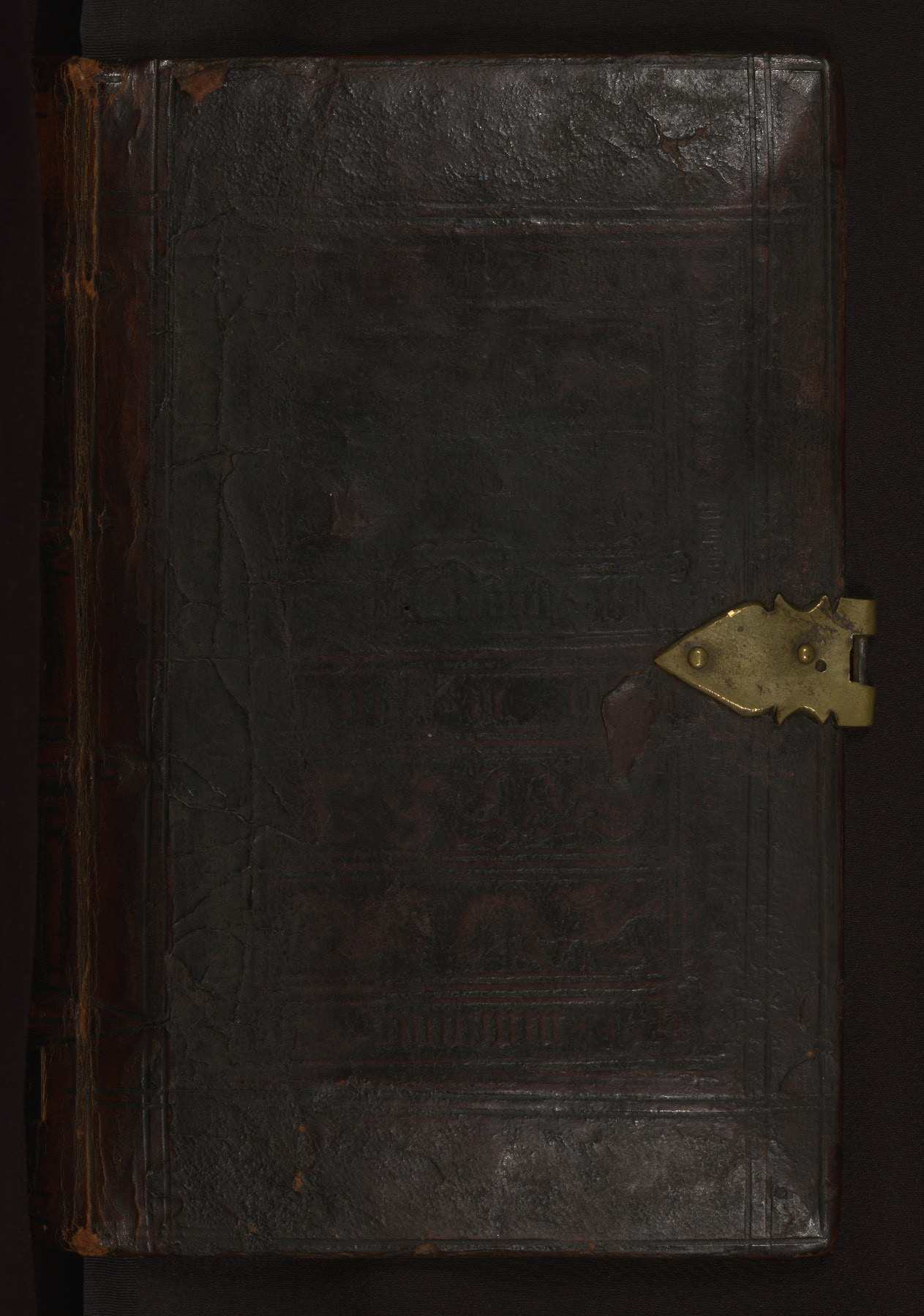 This mid-fifteenth-century illuminated book of hours is written entirely in Dutch on fine parchment and is remarkable for its eighteen grisaille miniatures. This technique, wherein the figures are modeled primarily in a gray wash, became a favorite in the Netherlands. The hand behind the miniatures in this manuscript has been identified with a group of artists known as the Masters of the Delft Grisailles. The manuscript has been grouped with more than a dozen related works, including New York, Pierpont Morgan Library Ms. M.349; London, Victoria and Albert Museum, Geo. Reid Ms. 32; Leiden, Bibliotheek der Rijksuniversiteit BPL 224; Brussels, Bibliothèque Royale Ms. 21696; Antwerp, Plantin Moretus Ms. 49; and The Hague, Koninklijke Bibliotheek Ms. 74 G 35. The manuscript comprises 152 folios and is almost completely intact, lacking only two miniatures. It retains its original brown leather binding decorated with mythological beasts and a now illegible inscription. The calendar is for the use of Utrecht, which helps localize its original ownership, as might a mostly erased ownership inscription that has been partially recovered. Good impressions of two circular pilgrim badges, now removed, are visible on fol. 112v.