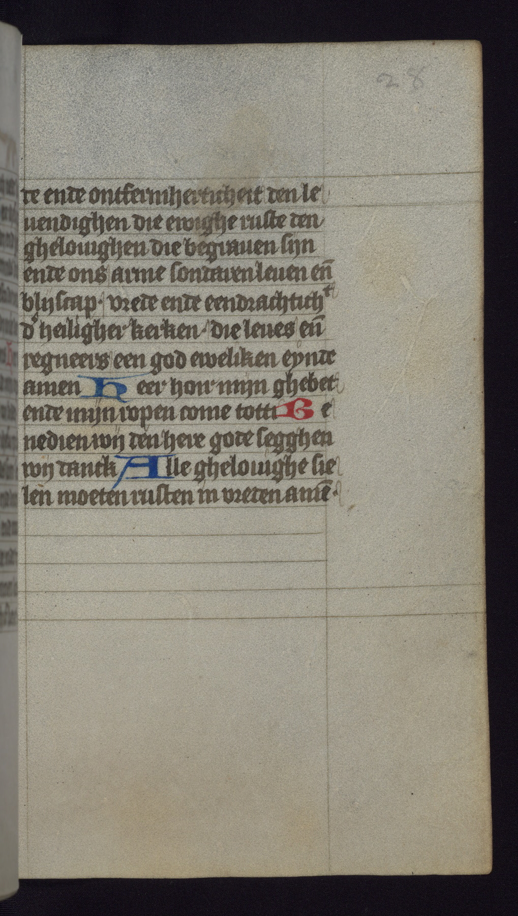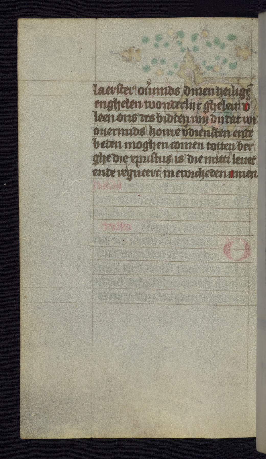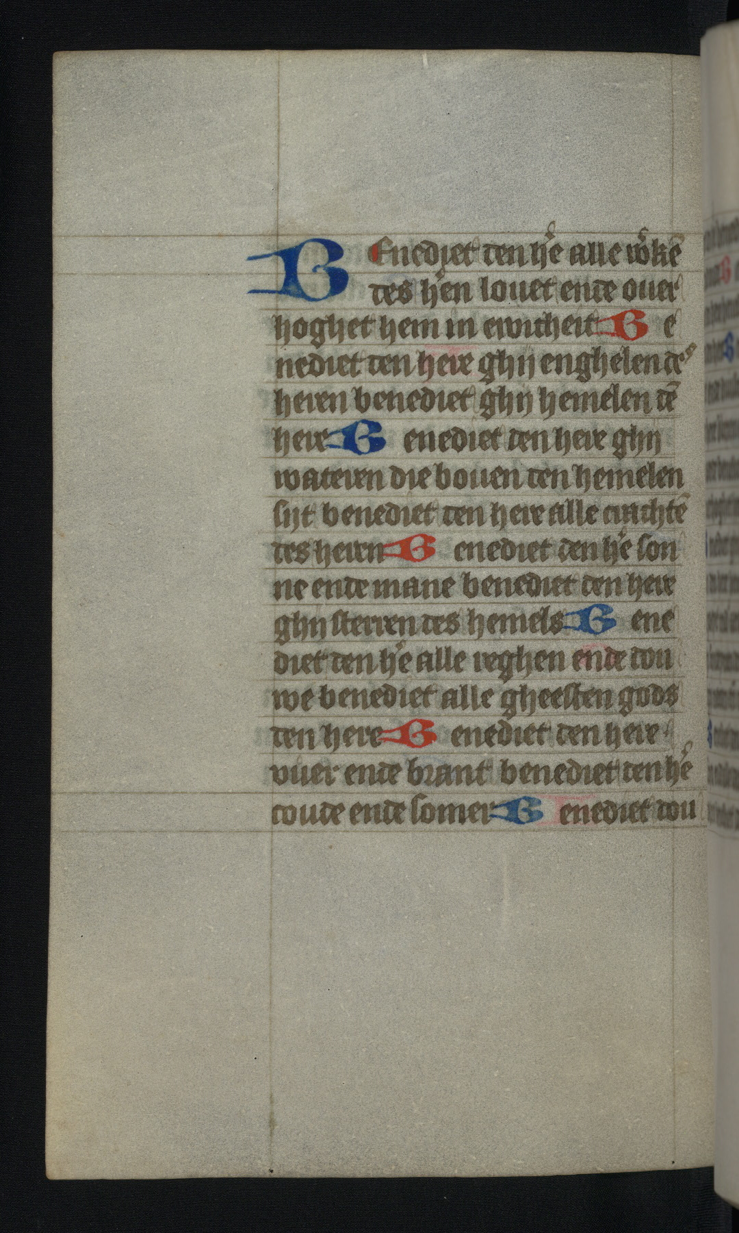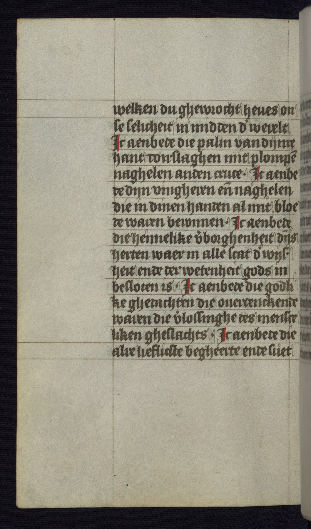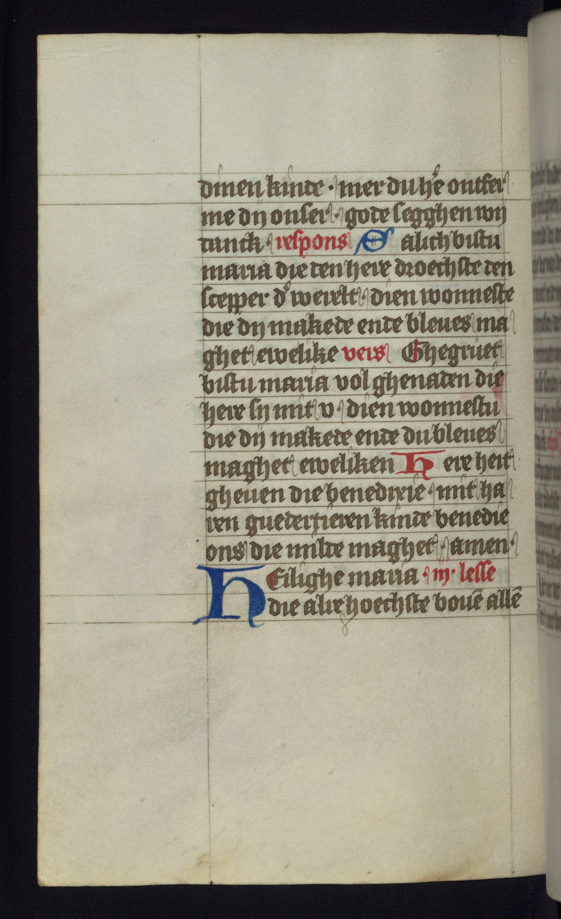 This mid-fifteenth-century illuminated book of hours is written entirely in Dutch on fine parchment and is remarkable for its eighteen grisaille miniatures. This technique, wherein the figures are modeled primarily in a gray wash, became a favorite in the Netherlands. The hand behind the miniatures in this manuscript has been identified with a group of artists known as the Masters of the Delft Grisailles. The manuscript has been grouped with more than a dozen related works, including New York, Pierpont Morgan Library Ms. M.349; London, Victoria and Albert Museum, Geo. Reid Ms. 32; Leiden, Bibliotheek der Rijksuniversiteit BPL 224; Brussels, Bibliothèque Royale Ms. 21696; Antwerp, Plantin Moretus Ms. 49; and The Hague, Koninklijke Bibliotheek Ms. 74 G 35. The manuscript comprises 152 folios and is almost completely intact, lacking only two miniatures. It retains its original brown leather binding decorated with mythological beasts and a now illegible inscription. The calendar is for the use of Utrecht, which helps localize its original ownership, as might a mostly erased ownership inscription that has been partially recovered. Good impressions of two circular pilgrim badges, now removed, are visible on fol. 112v.