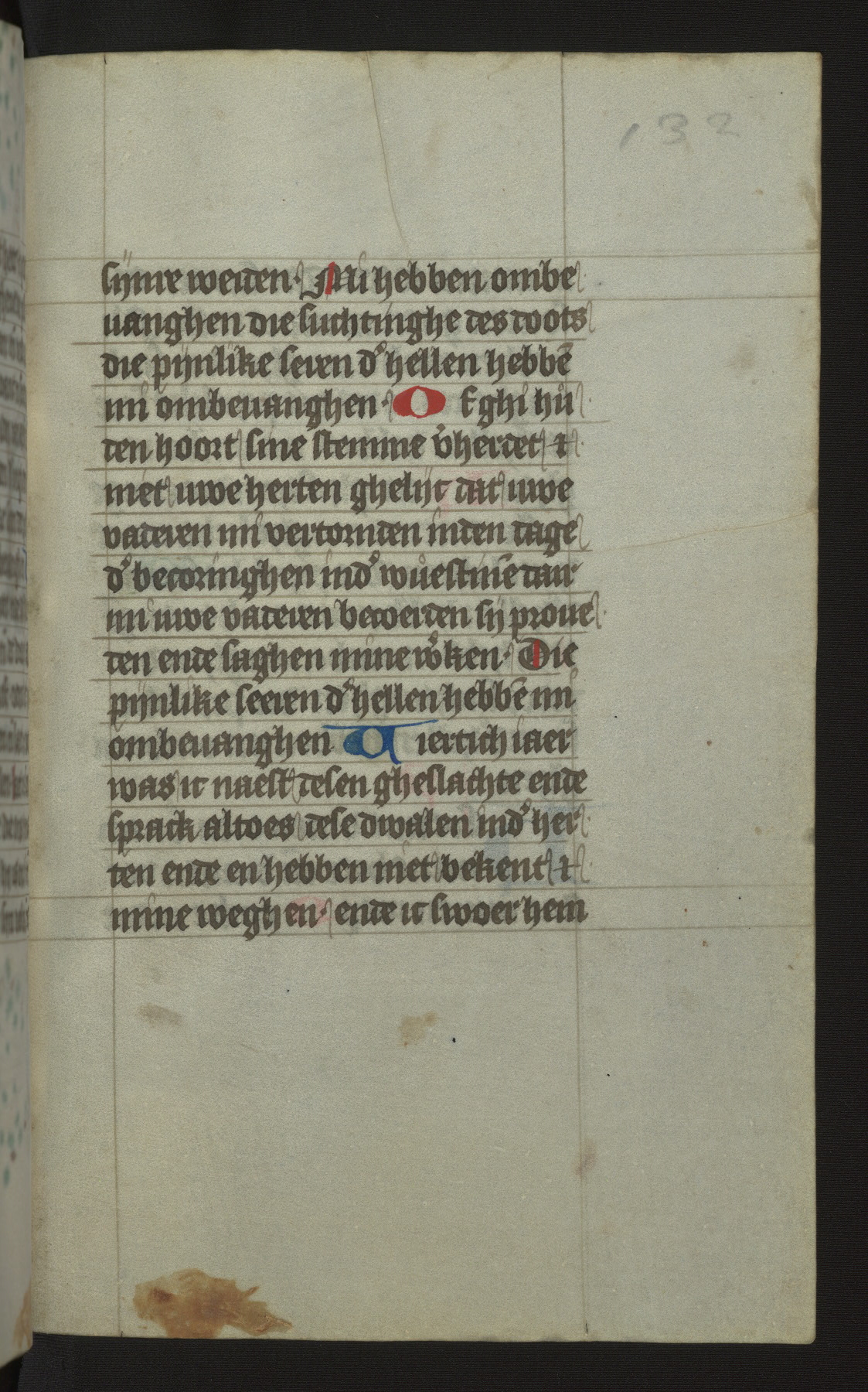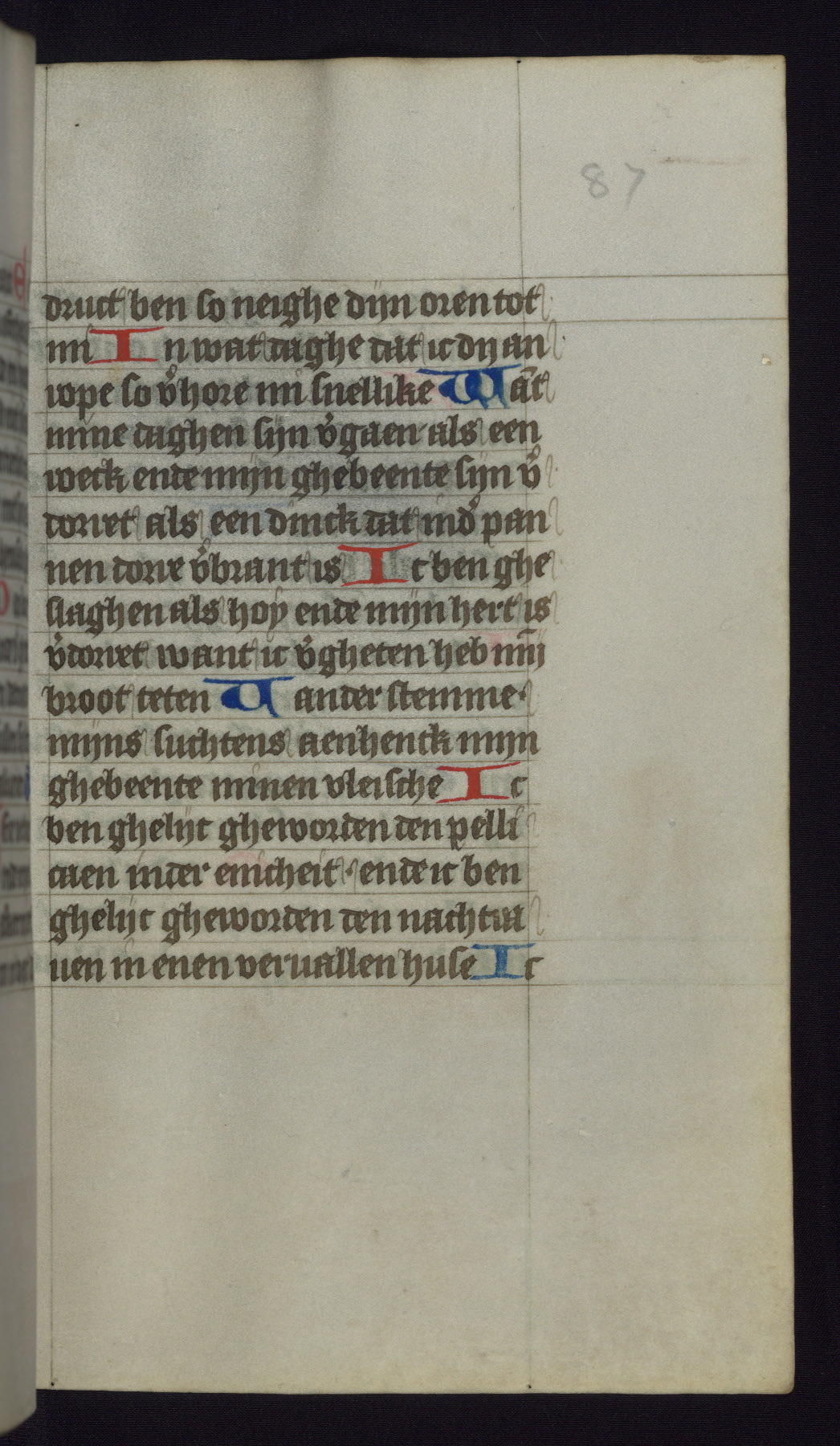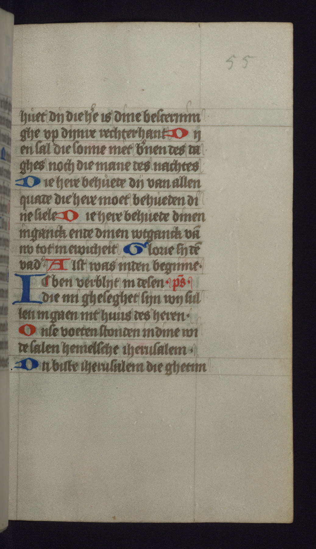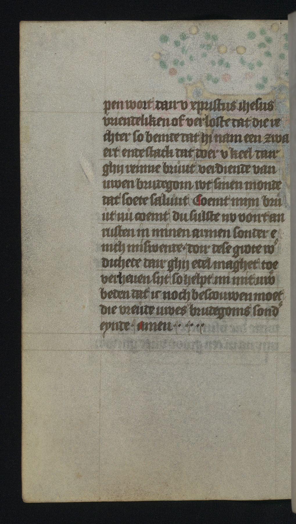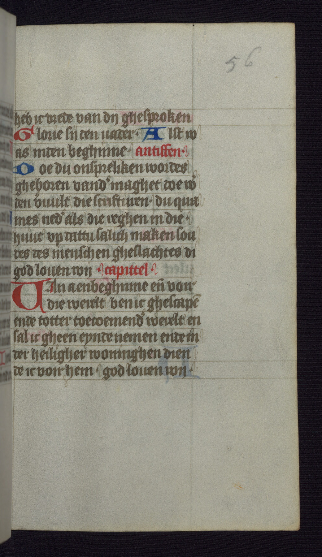 This mid-fifteenth-century illuminated book of hours is written entirely in Dutch on fine parchment and is remarkable for its eighteen grisaille miniatures. This technique, wherein the figures are modeled primarily in a gray wash, became a favorite in the Netherlands. The hand behind the miniatures in this manuscript has been identified with a group of artists known as the Masters of the Delft Grisailles. The manuscript has been grouped with more than a dozen related works, including New York, Pierpont Morgan Library Ms. M.349; London, Victoria and Albert Museum, Geo. Reid Ms. 32; Leiden, Bibliotheek der Rijksuniversiteit BPL 224; Brussels, Bibliothèque Royale Ms. 21696; Antwerp, Plantin Moretus Ms. 49; and The Hague, Koninklijke Bibliotheek Ms. 74 G 35. The manuscript comprises 152 folios and is almost completely intact, lacking only two miniatures. It retains its original brown leather binding decorated with mythological beasts and a now illegible inscription. The calendar is for the use of Utrecht, which helps localize its original ownership, as might a mostly erased ownership inscription that has been partially recovered. Good impressions of two circular pilgrim badges, now removed, are visible on fol. 112v.