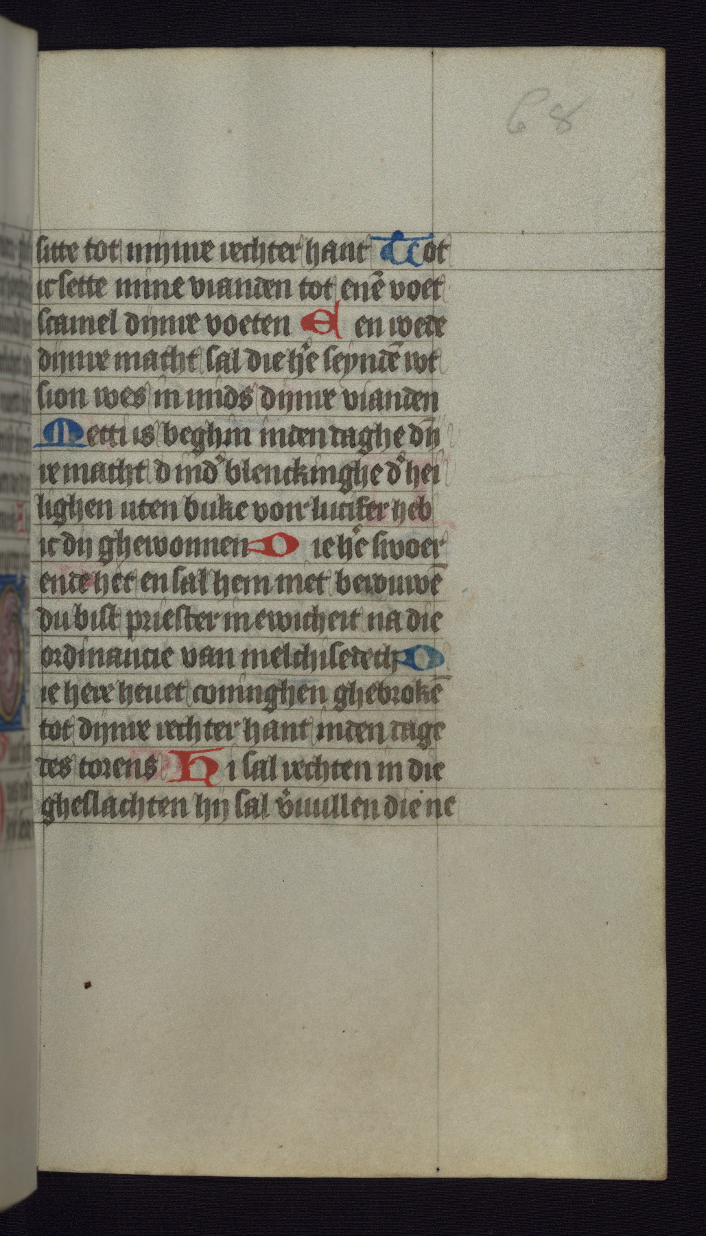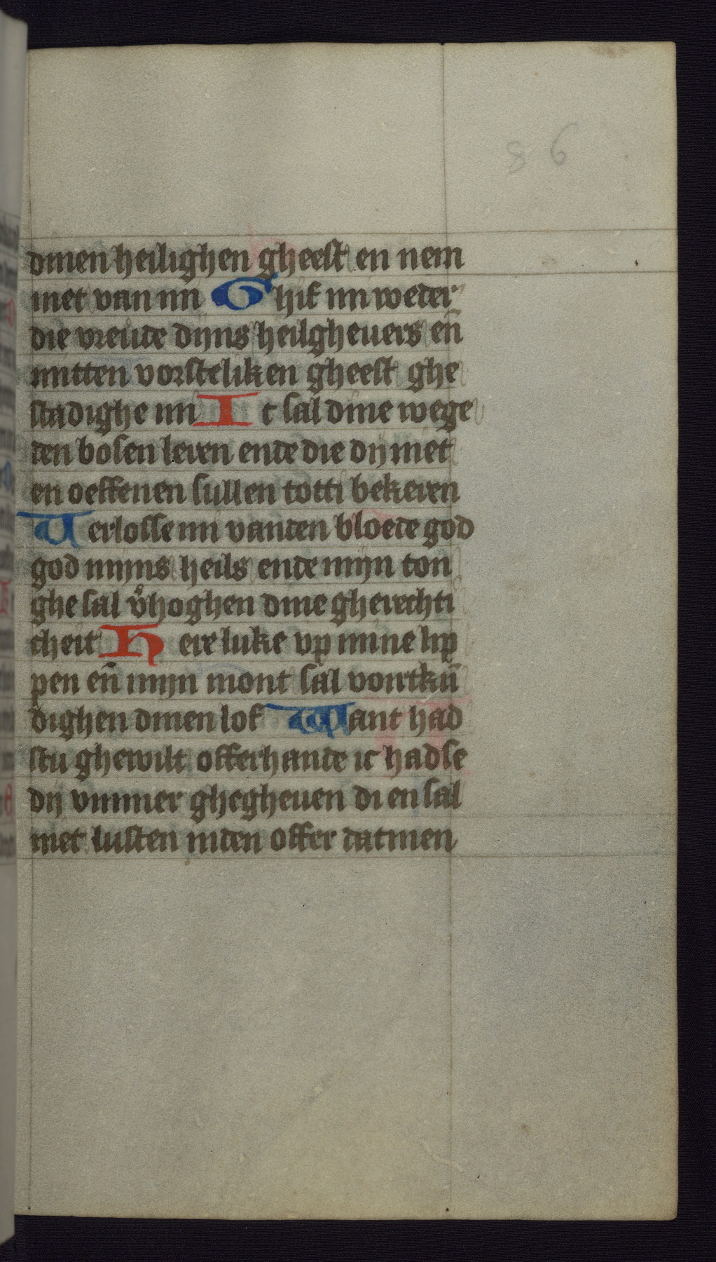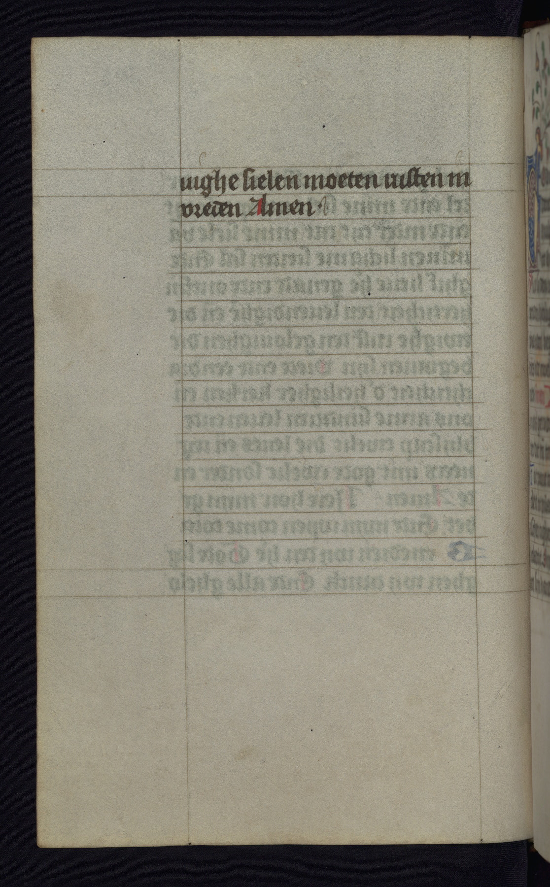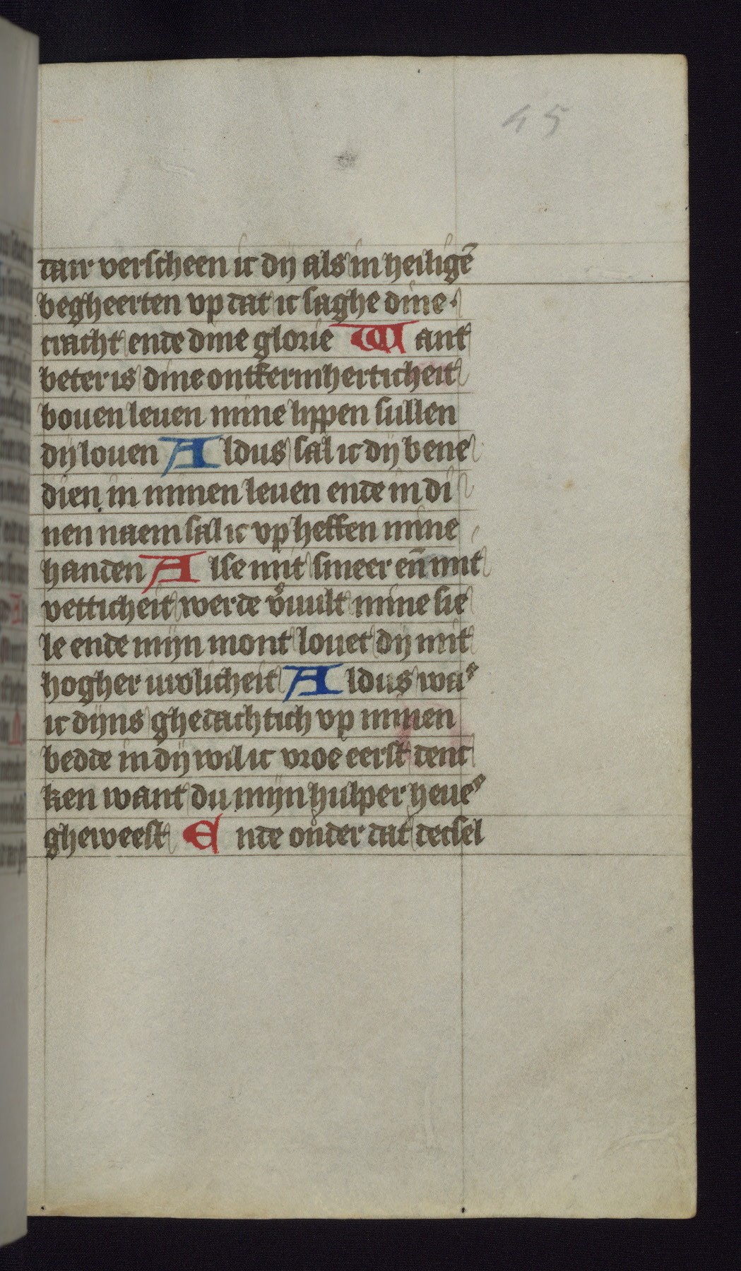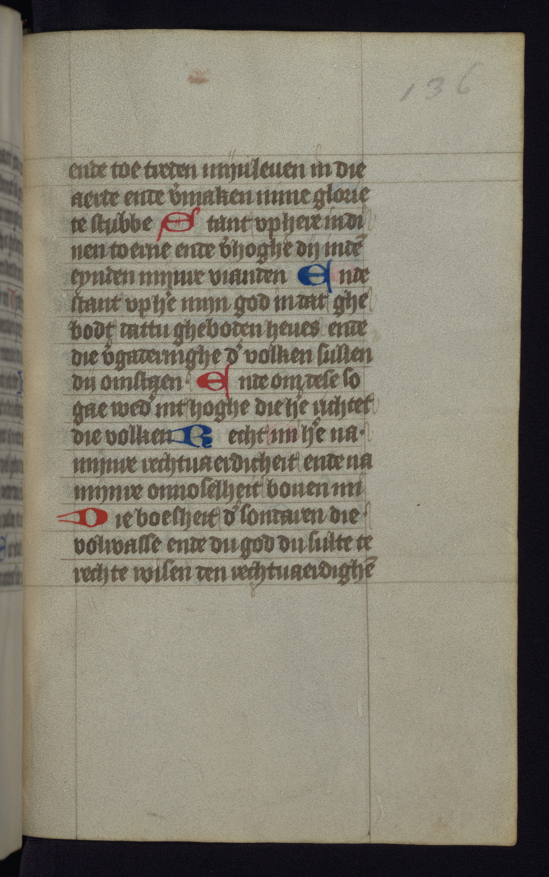 This mid-fifteenth-century illuminated book of hours is written entirely in Dutch on fine parchment and is remarkable for its eighteen grisaille miniatures. This technique, wherein the figures are modeled primarily in a gray wash, became a favorite in the Netherlands. The hand behind the miniatures in this manuscript has been identified with a group of artists known as the Masters of the Delft Grisailles. The manuscript has been grouped with more than a dozen related works, including New York, Pierpont Morgan Library Ms. M.349; London, Victoria and Albert Museum, Geo. Reid Ms. 32; Leiden, Bibliotheek der Rijksuniversiteit BPL 224; Brussels, Bibliothèque Royale Ms. 21696; Antwerp, Plantin Moretus Ms. 49; and The Hague, Koninklijke Bibliotheek Ms. 74 G 35. The manuscript comprises 152 folios and is almost completely intact, lacking only two miniatures. It retains its original brown leather binding decorated with mythological beasts and a now illegible inscription. The calendar is for the use of Utrecht, which helps localize its original ownership, as might a mostly erased ownership inscription that has been partially recovered. Good impressions of two circular pilgrim badges, now removed, are visible on fol. 112v.