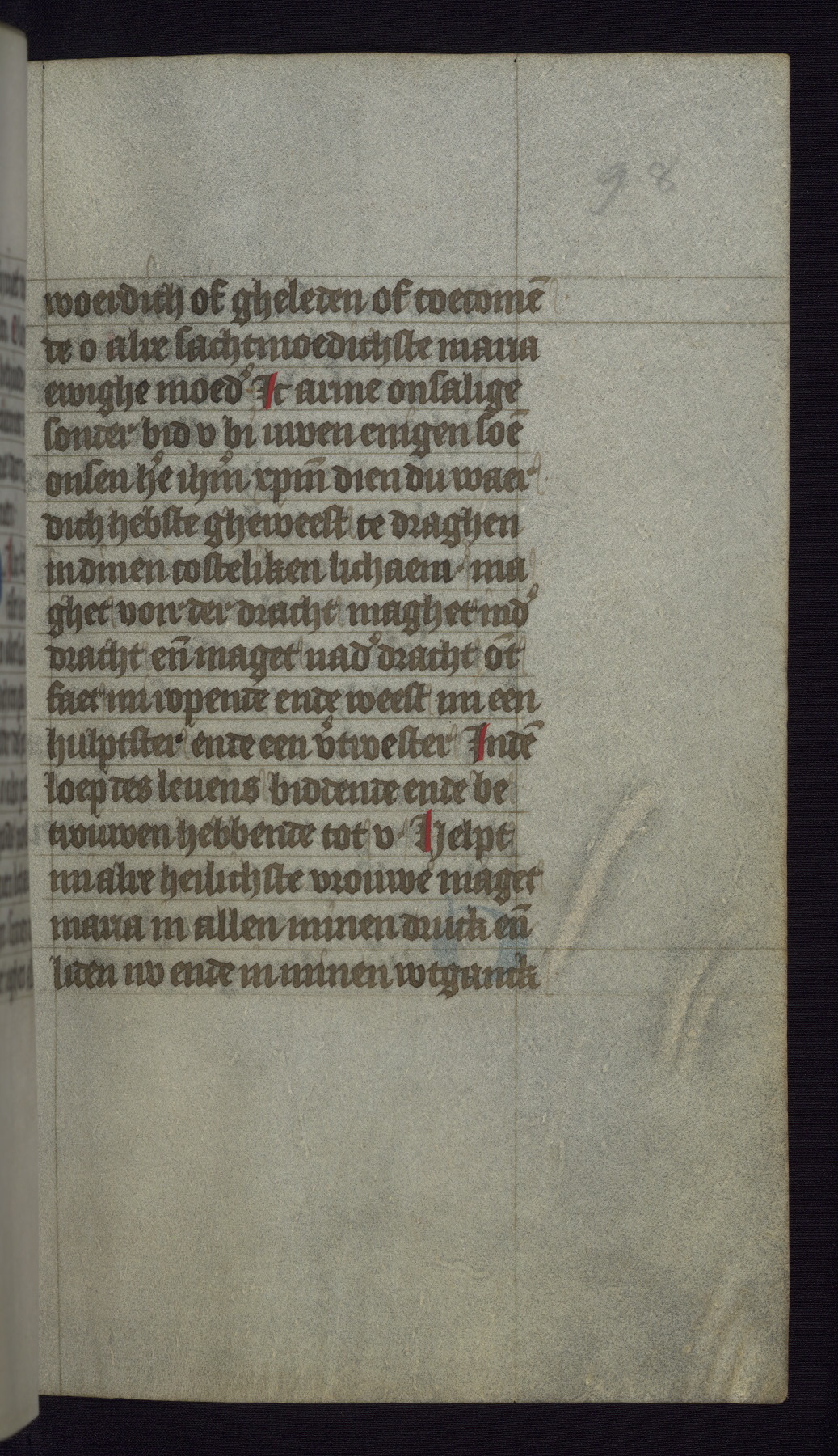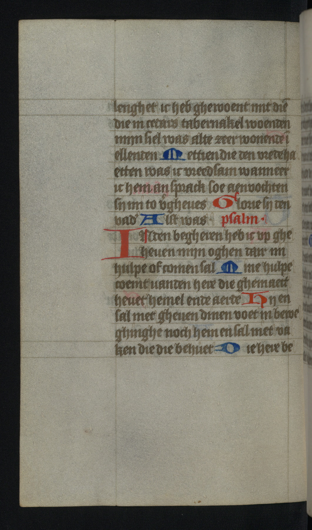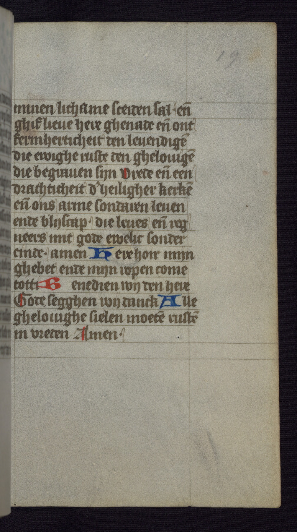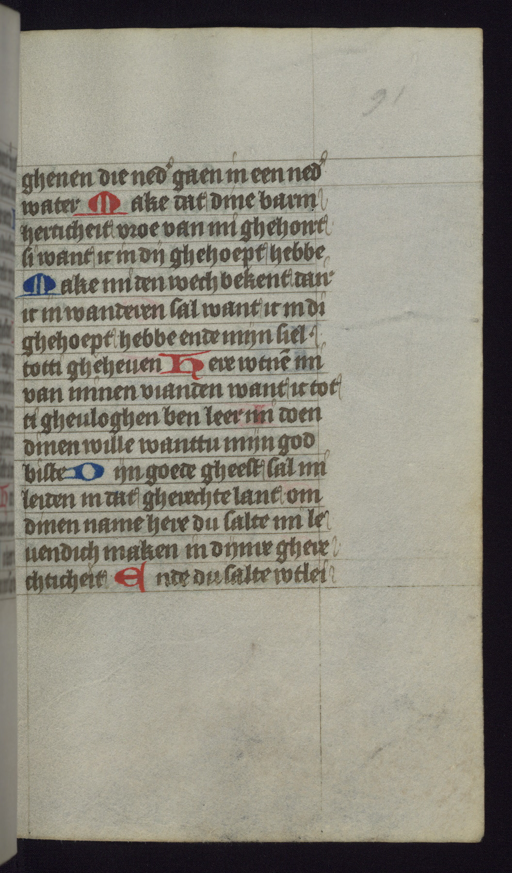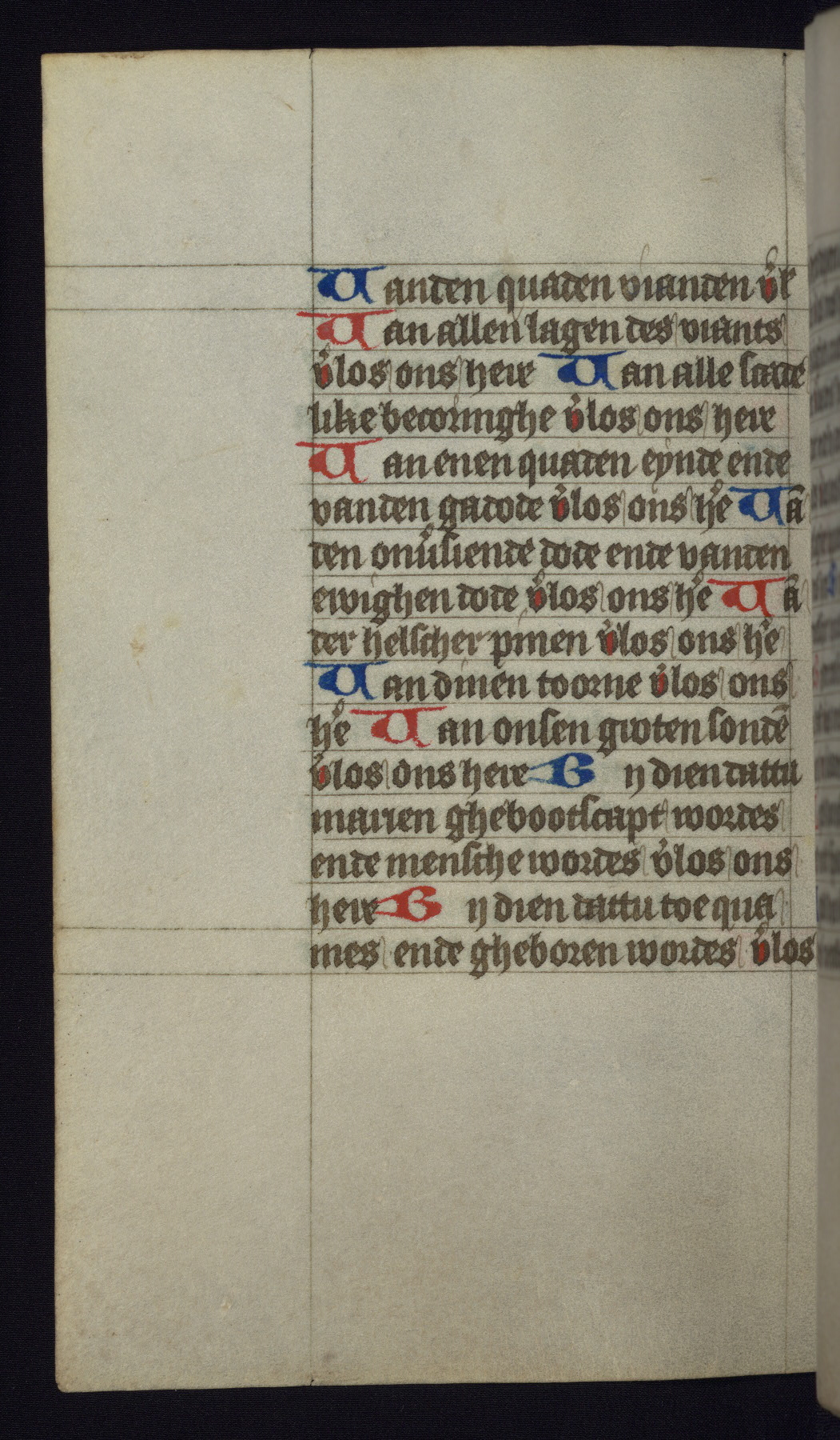 This mid-fifteenth-century illuminated book of hours is written entirely in Dutch on fine parchment and is remarkable for its eighteen grisaille miniatures. This technique, wherein the figures are modeled primarily in a gray wash, became a favorite in the Netherlands. The hand behind the miniatures in this manuscript has been identified with a group of artists known as the Masters of the Delft Grisailles. The manuscript has been grouped with more than a dozen related works, including New York, Pierpont Morgan Library Ms. M.349; London, Victoria and Albert Museum, Geo. Reid Ms. 32; Leiden, Bibliotheek der Rijksuniversiteit BPL 224; Brussels, Bibliothèque Royale Ms. 21696; Antwerp, Plantin Moretus Ms. 49; and The Hague, Koninklijke Bibliotheek Ms. 74 G 35. The manuscript comprises 152 folios and is almost completely intact, lacking only two miniatures. It retains its original brown leather binding decorated with mythological beasts and a now illegible inscription. The calendar is for the use of Utrecht, which helps localize its original ownership, as might a mostly erased ownership inscription that has been partially recovered. Good impressions of two circular pilgrim badges, now removed, are visible on fol. 112v.