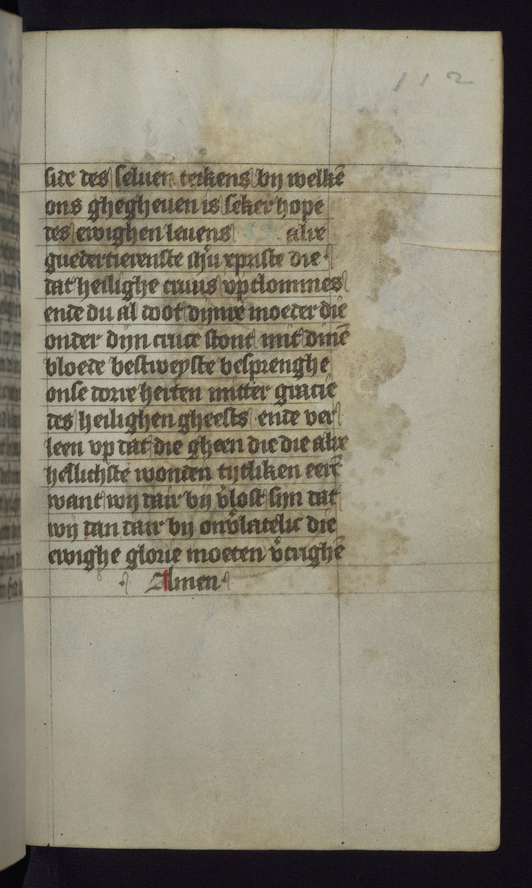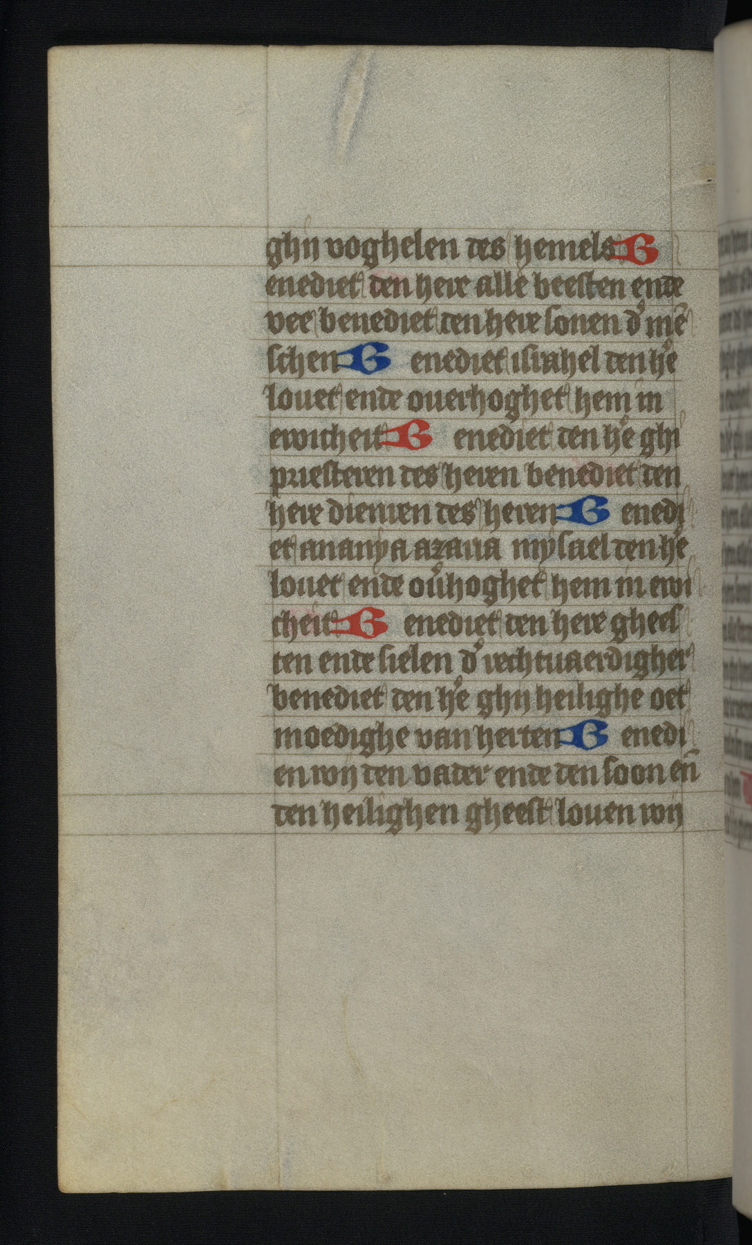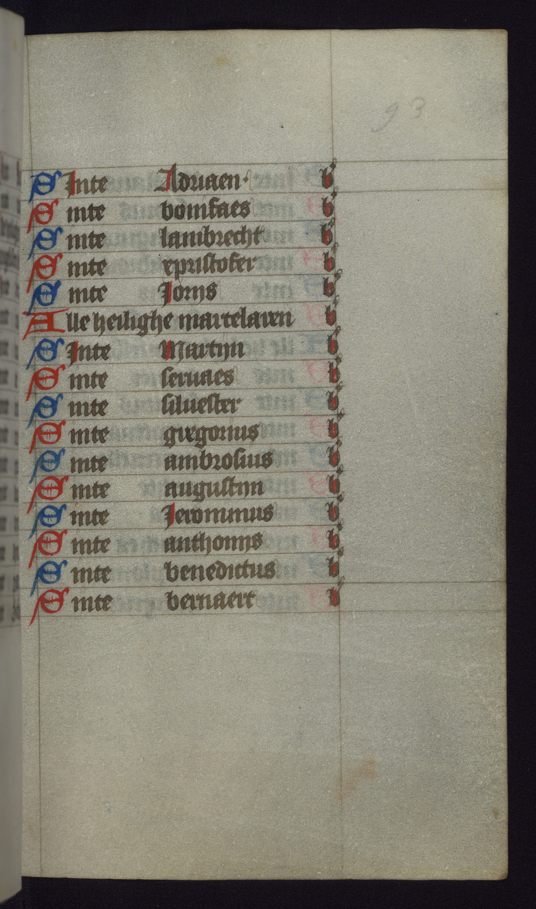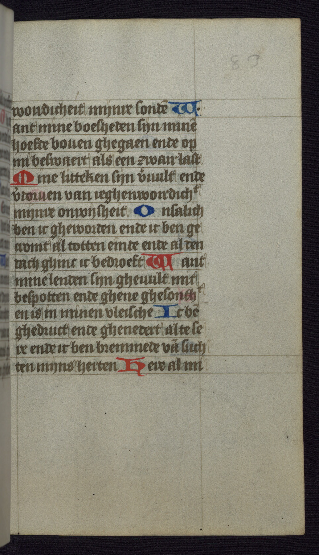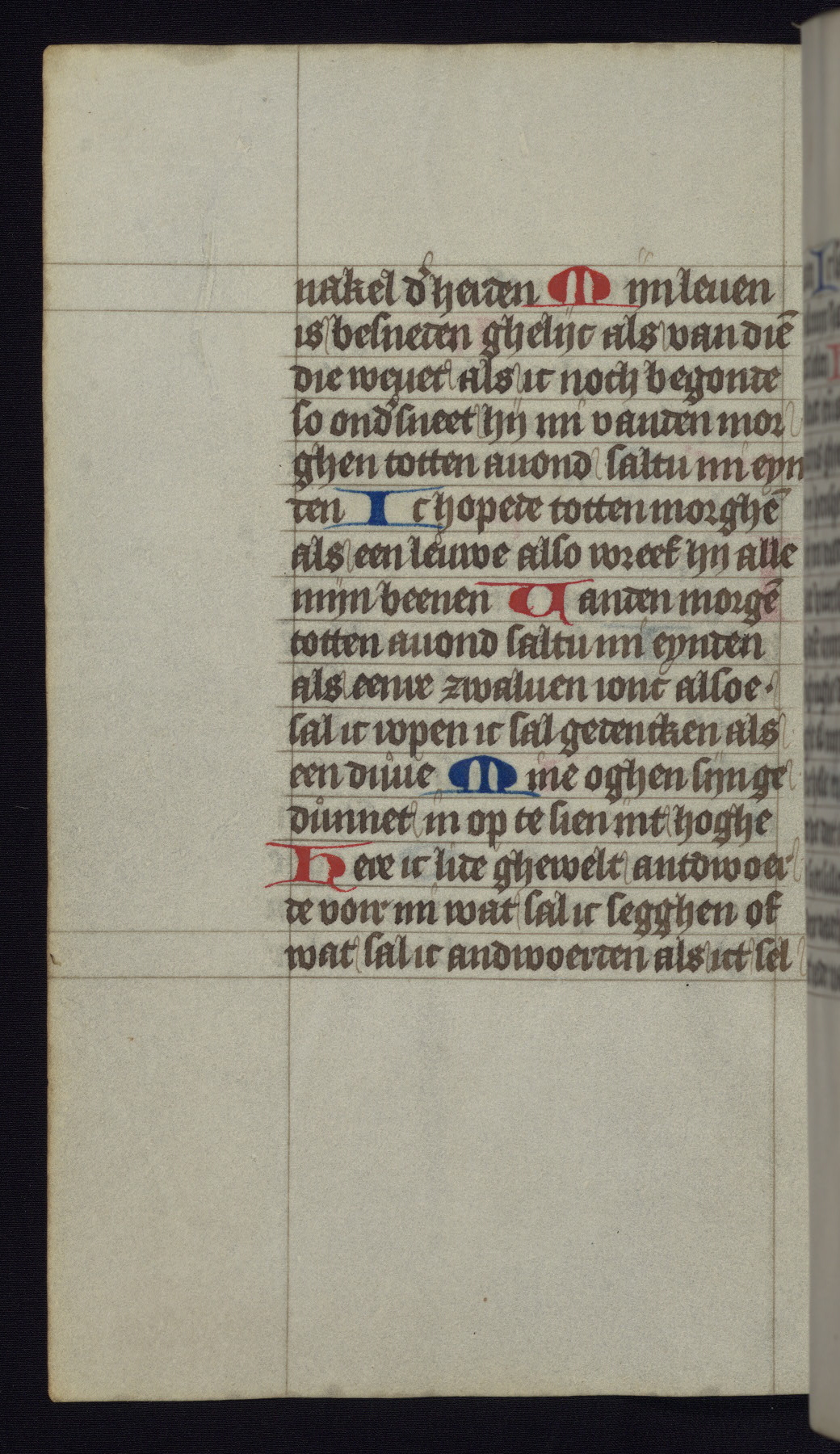 This mid-fifteenth-century illuminated book of hours is written entirely in Dutch on fine parchment and is remarkable for its eighteen grisaille miniatures. This technique, wherein the figures are modeled primarily in a gray wash, became a favorite in the Netherlands. The hand behind the miniatures in this manuscript has been identified with a group of artists known as the Masters of the Delft Grisailles. The manuscript has been grouped with more than a dozen related works, including New York, Pierpont Morgan Library Ms. M.349; London, Victoria and Albert Museum, Geo. Reid Ms. 32; Leiden, Bibliotheek der Rijksuniversiteit BPL 224; Brussels, Bibliothèque Royale Ms. 21696; Antwerp, Plantin Moretus Ms. 49; and The Hague, Koninklijke Bibliotheek Ms. 74 G 35. The manuscript comprises 152 folios and is almost completely intact, lacking only two miniatures. It retains its original brown leather binding decorated with mythological beasts and a now illegible inscription. The calendar is for the use of Utrecht, which helps localize its original ownership, as might a mostly erased ownership inscription that has been partially recovered. Good impressions of two circular pilgrim badges, now removed, are visible on fol. 112v.