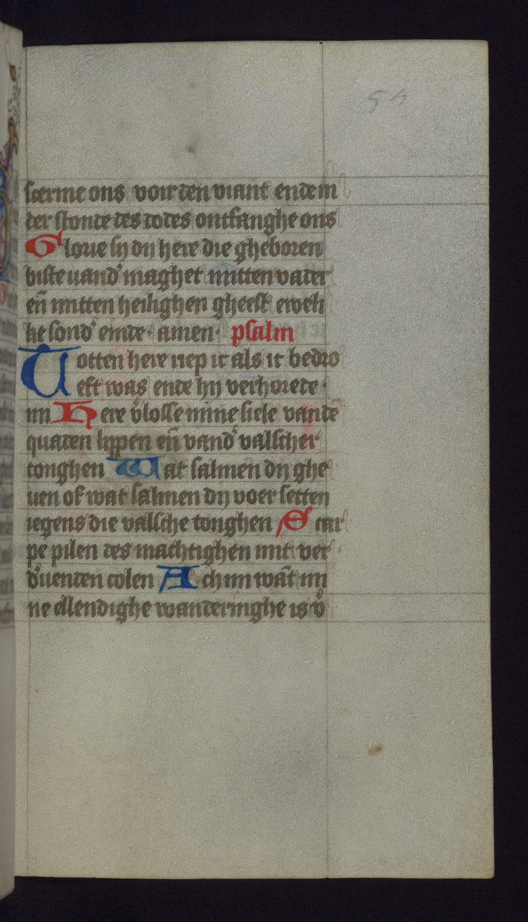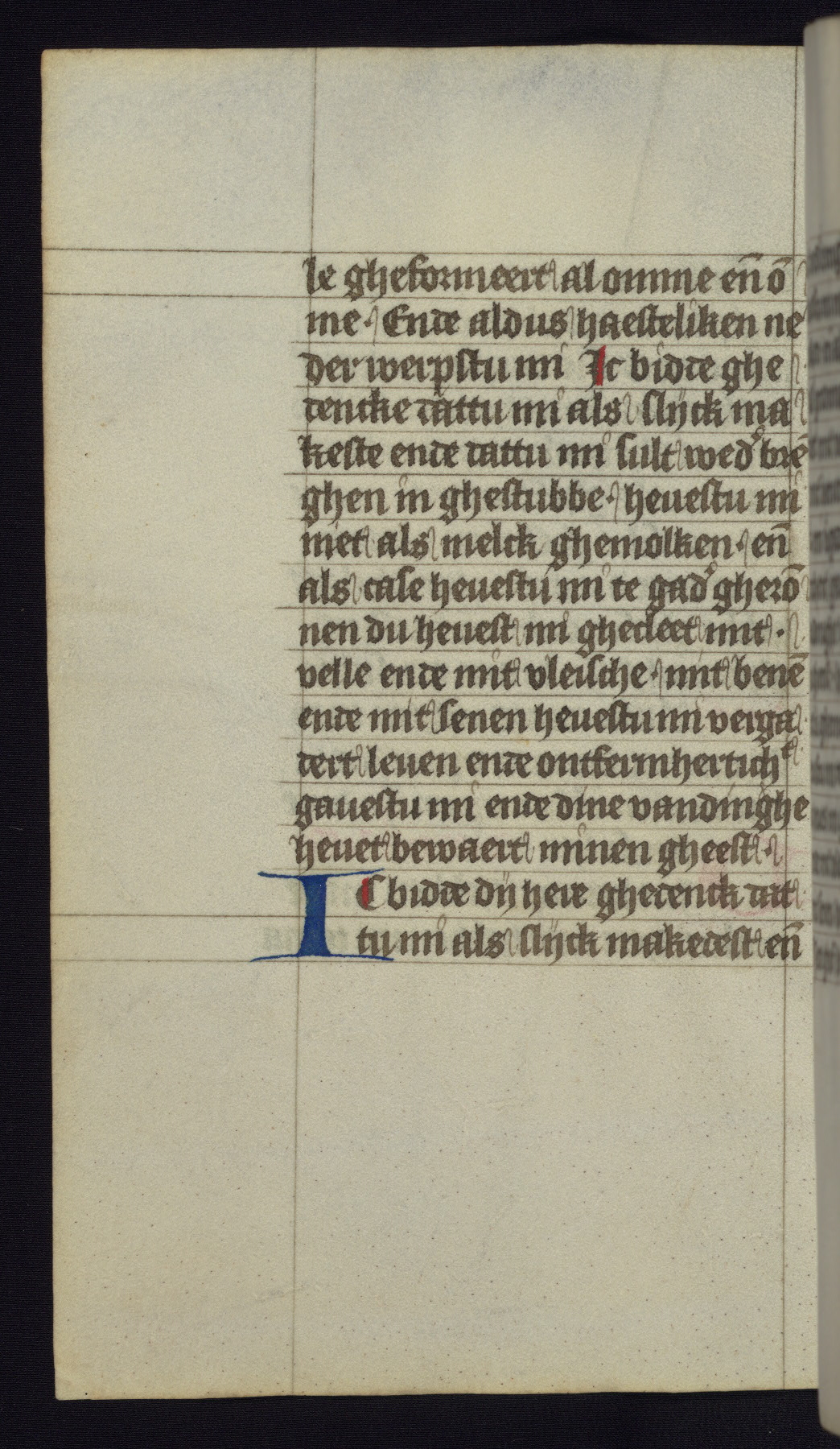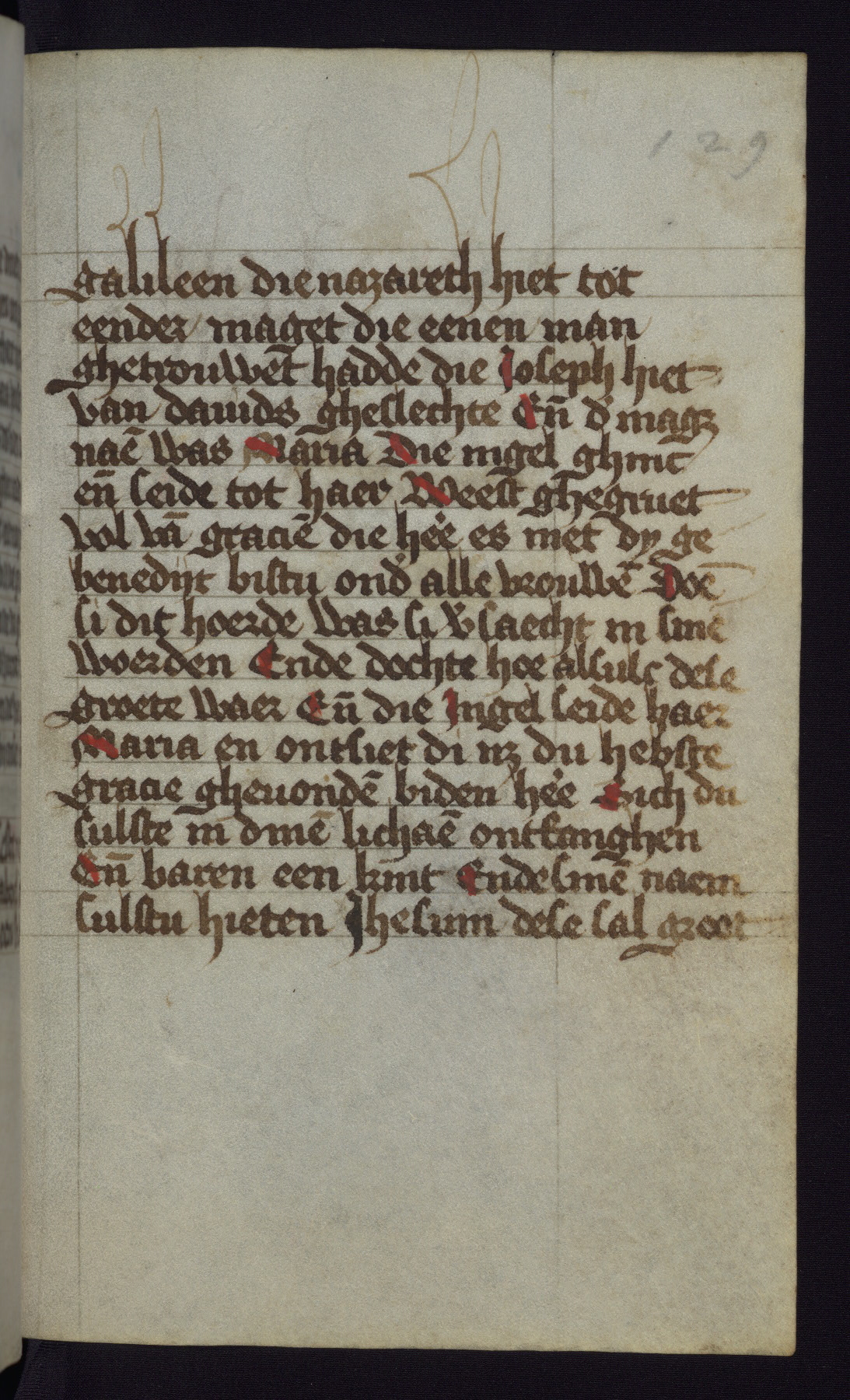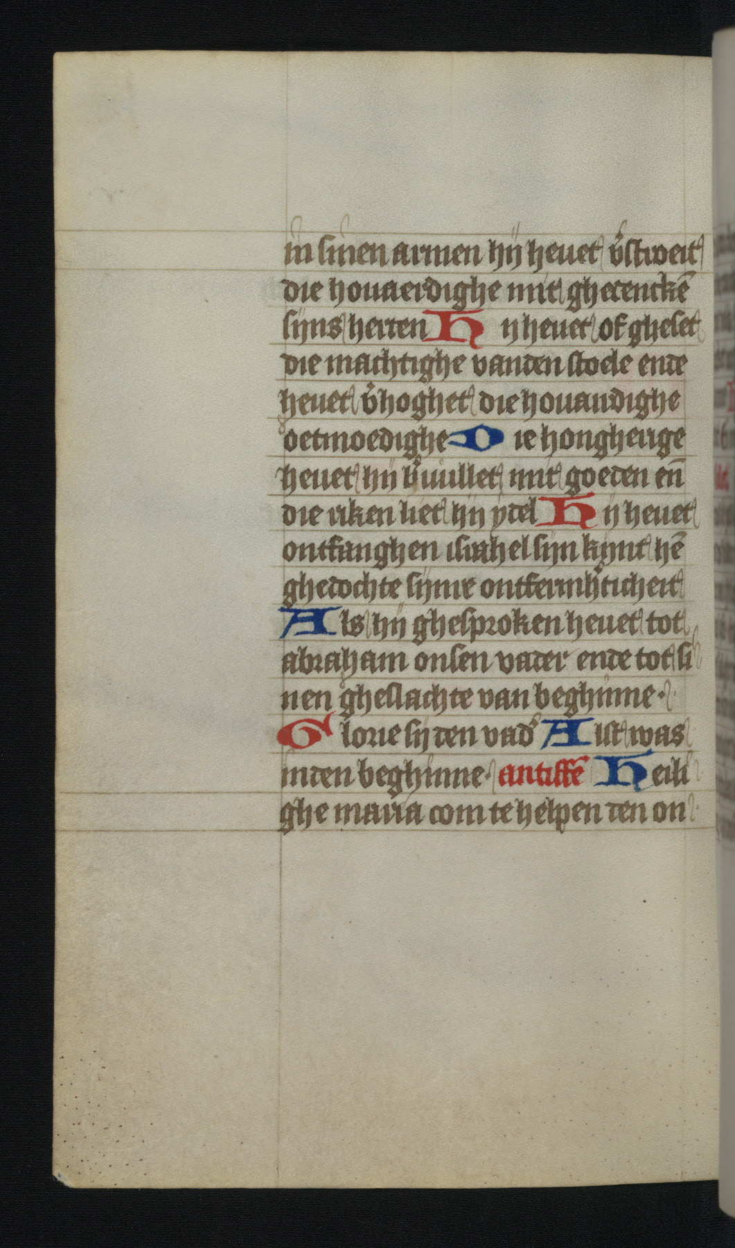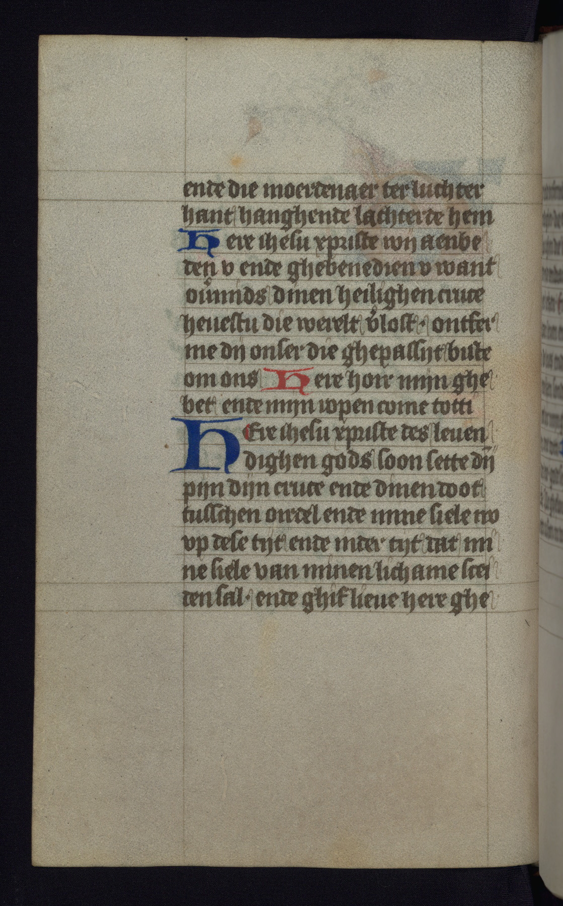 This mid-fifteenth-century illuminated book of hours is written entirely in Dutch on fine parchment and is remarkable for its eighteen grisaille miniatures. This technique, wherein the figures are modeled primarily in a gray wash, became a favorite in the Netherlands. The hand behind the miniatures in this manuscript has been identified with a group of artists known as the Masters of the Delft Grisailles. The manuscript has been grouped with more than a dozen related works, including New York, Pierpont Morgan Library Ms. M.349; London, Victoria and Albert Museum, Geo. Reid Ms. 32; Leiden, Bibliotheek der Rijksuniversiteit BPL 224; Brussels, Bibliothèque Royale Ms. 21696; Antwerp, Plantin Moretus Ms. 49; and The Hague, Koninklijke Bibliotheek Ms. 74 G 35. The manuscript comprises 152 folios and is almost completely intact, lacking only two miniatures. It retains its original brown leather binding decorated with mythological beasts and a now illegible inscription. The calendar is for the use of Utrecht, which helps localize its original ownership, as might a mostly erased ownership inscription that has been partially recovered. Good impressions of two circular pilgrim badges, now removed, are visible on fol. 112v.