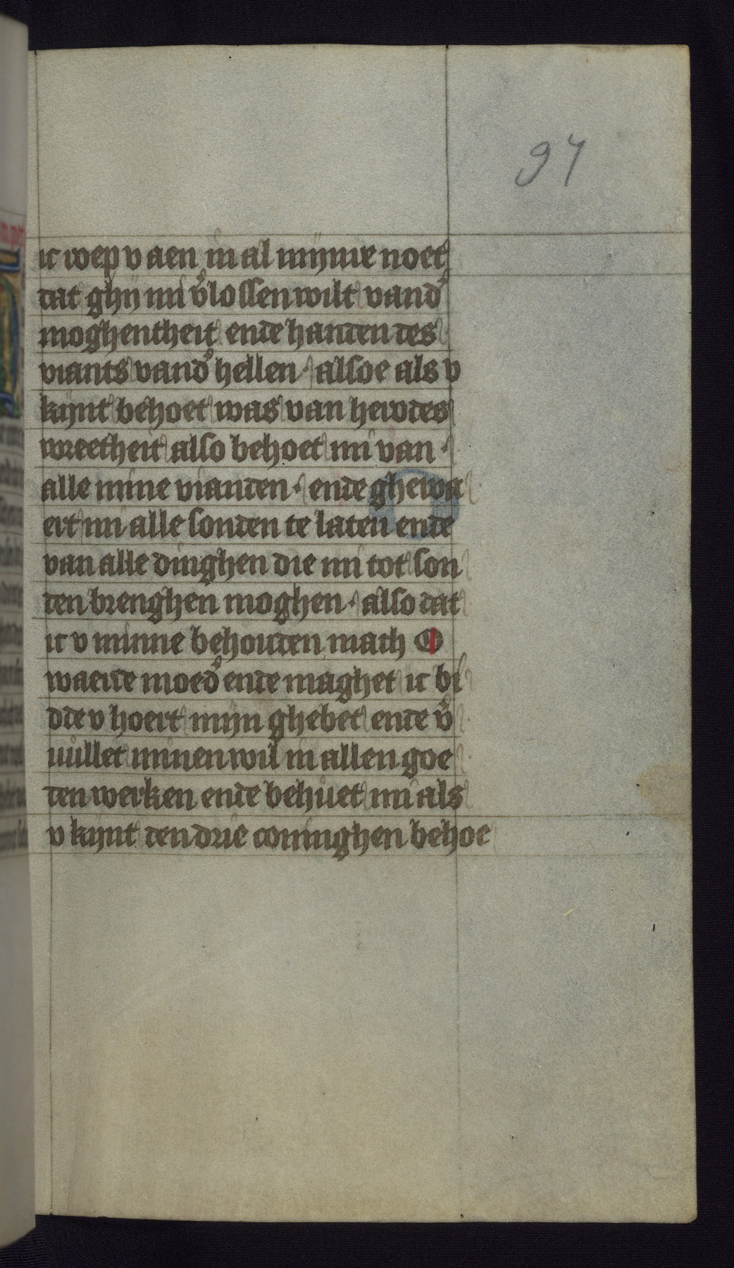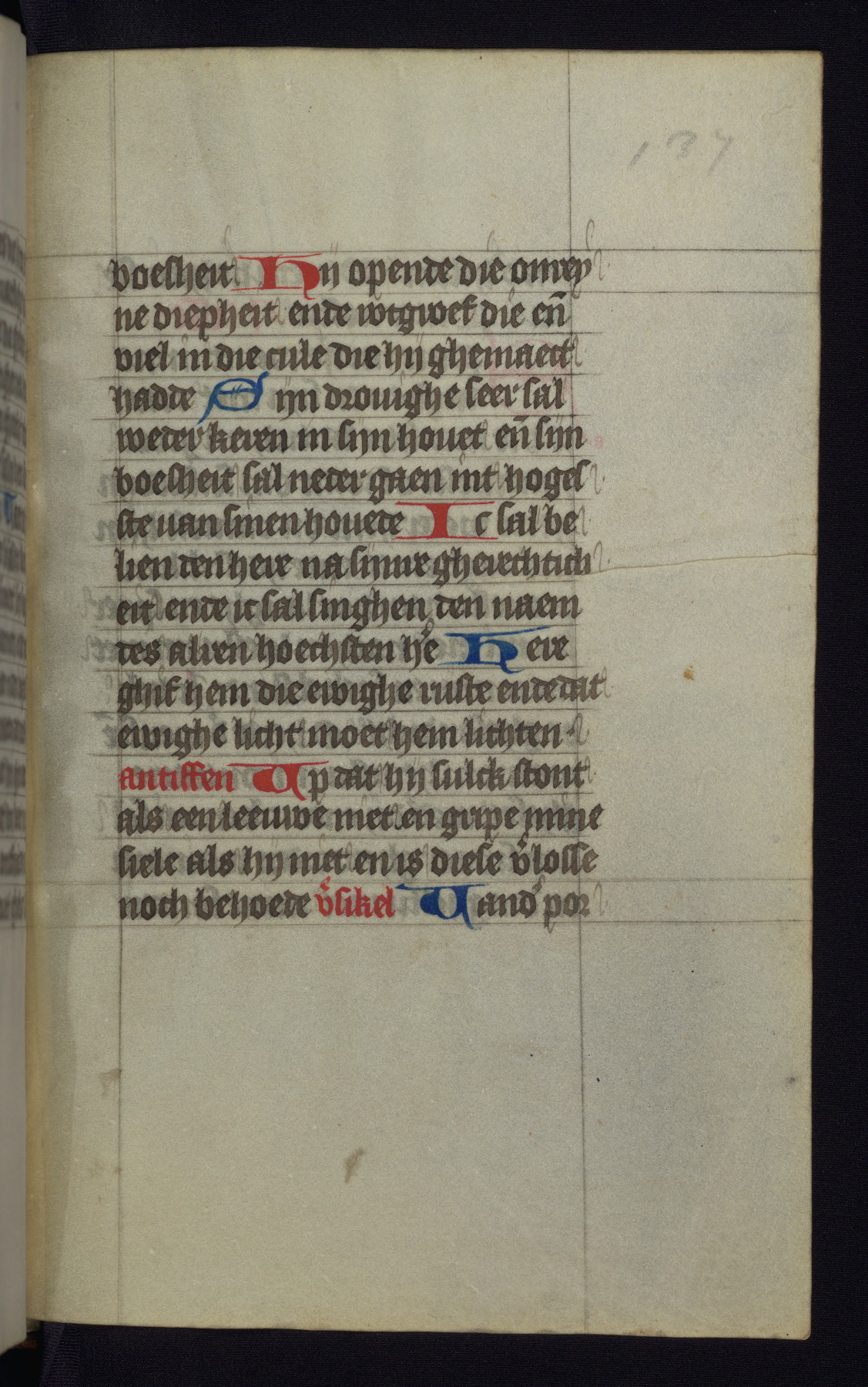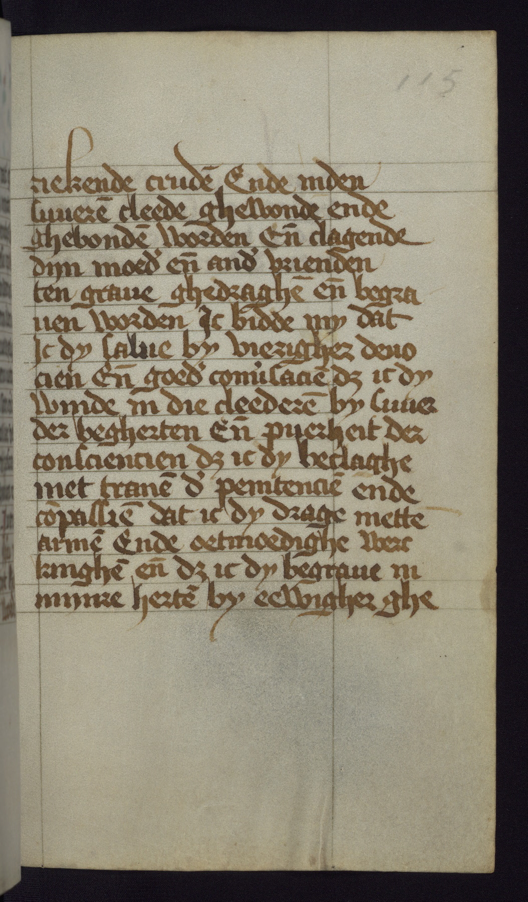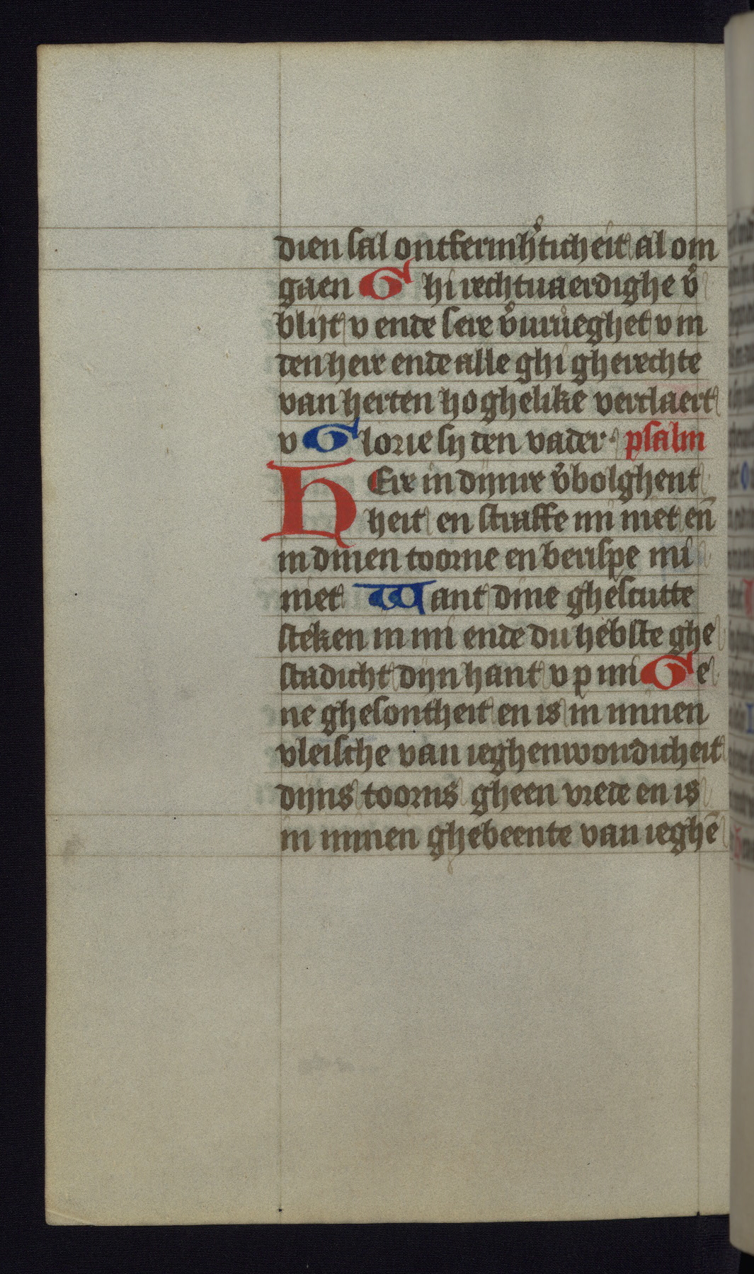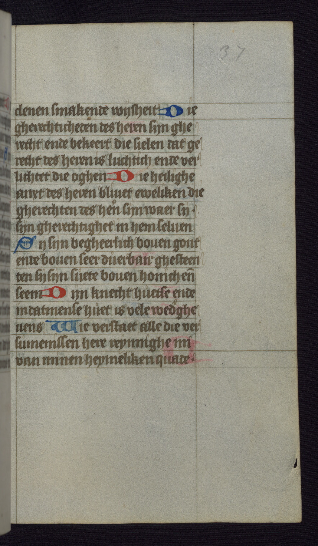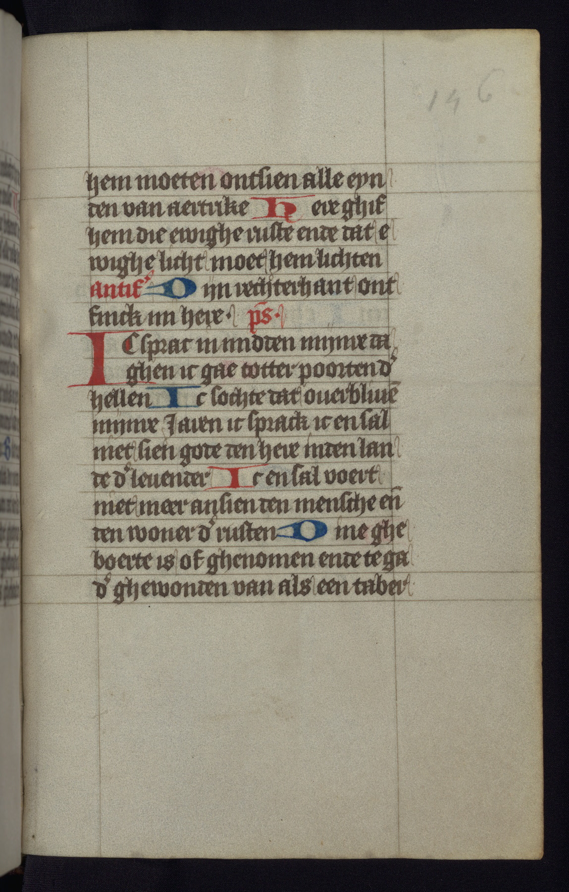 This mid-fifteenth-century illuminated book of hours is written entirely in Dutch on fine parchment and is remarkable for its eighteen grisaille miniatures. This technique, wherein the figures are modeled primarily in a gray wash, became a favorite in the Netherlands. The hand behind the miniatures in this manuscript has been identified with a group of artists known as the Masters of the Delft Grisailles. The manuscript has been grouped with more than a dozen related works, including New York, Pierpont Morgan Library Ms. M.349; London, Victoria and Albert Museum, Geo. Reid Ms. 32; Leiden, Bibliotheek der Rijksuniversiteit BPL 224; Brussels, Bibliothèque Royale Ms. 21696; Antwerp, Plantin Moretus Ms. 49; and The Hague, Koninklijke Bibliotheek Ms. 74 G 35. The manuscript comprises 152 folios and is almost completely intact, lacking only two miniatures. It retains its original brown leather binding decorated with mythological beasts and a now illegible inscription. The calendar is for the use of Utrecht, which helps localize its original ownership, as might a mostly erased ownership inscription that has been partially recovered. Good impressions of two circular pilgrim badges, now removed, are visible on fol. 112v.