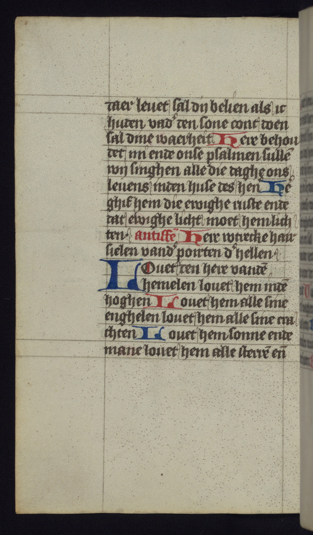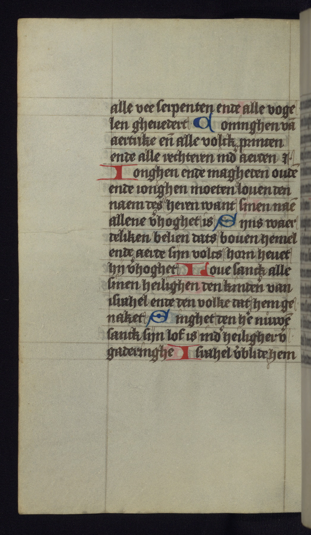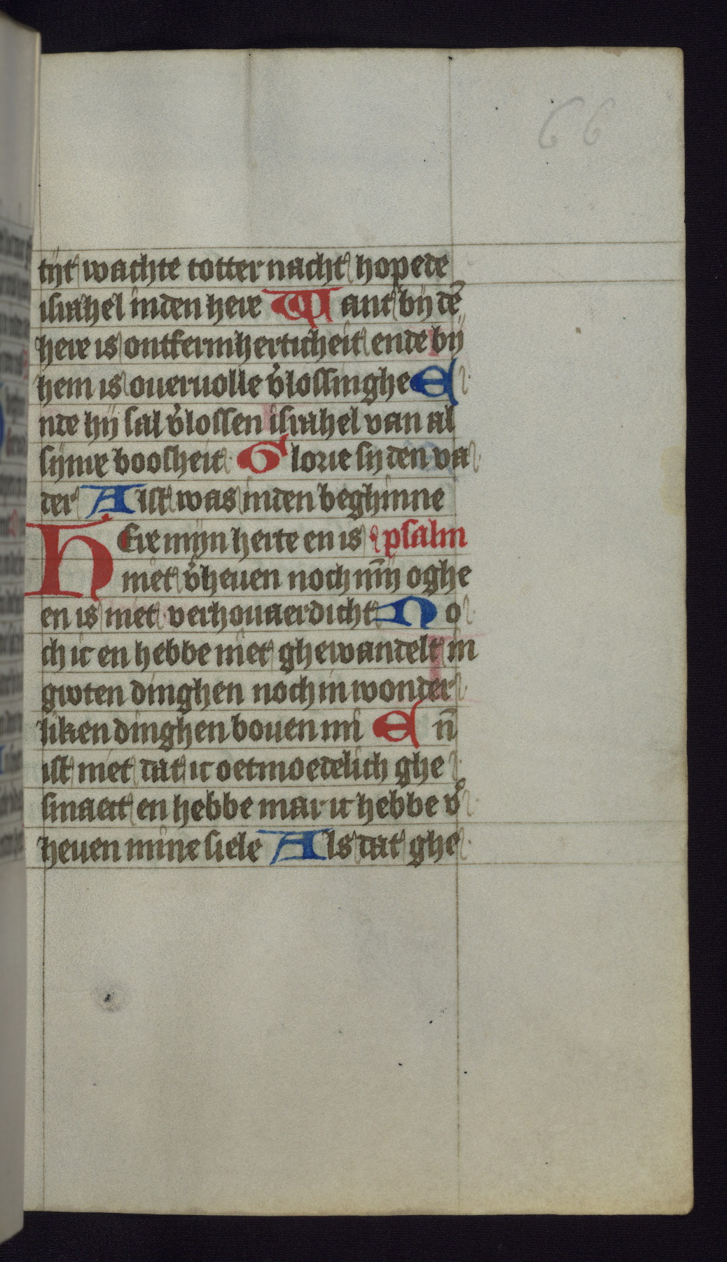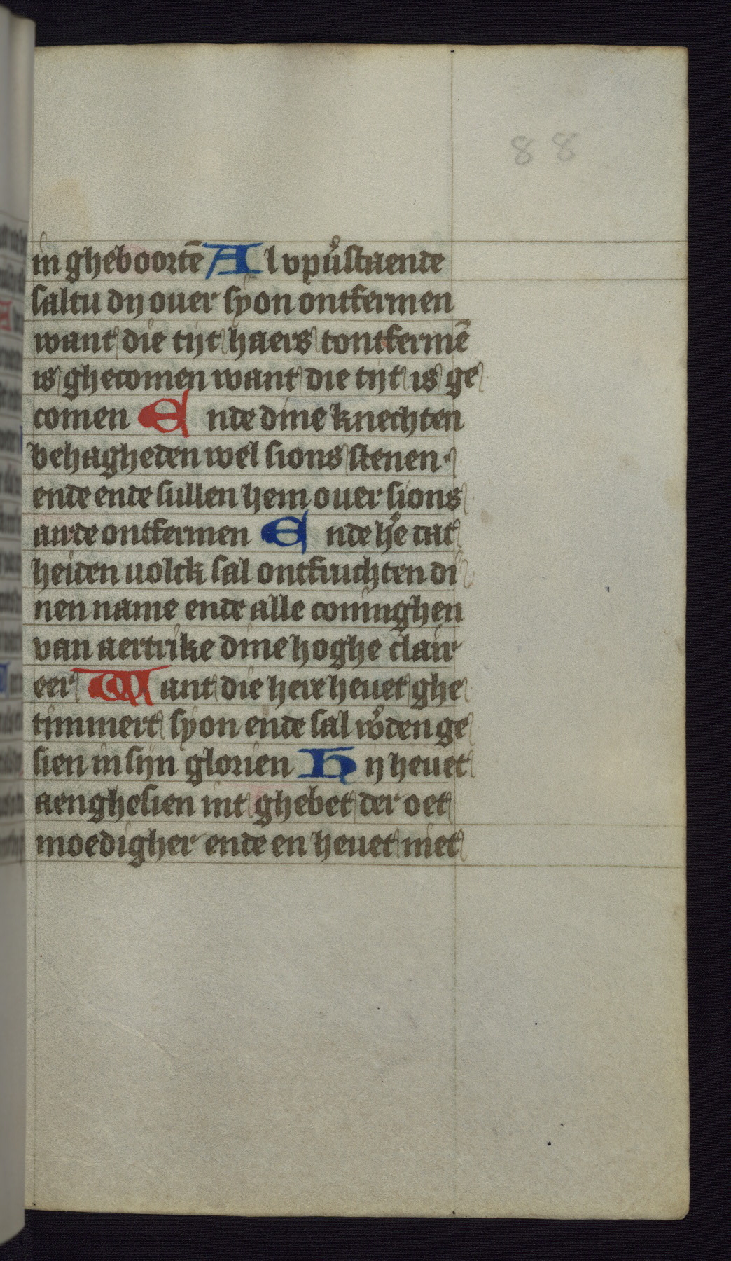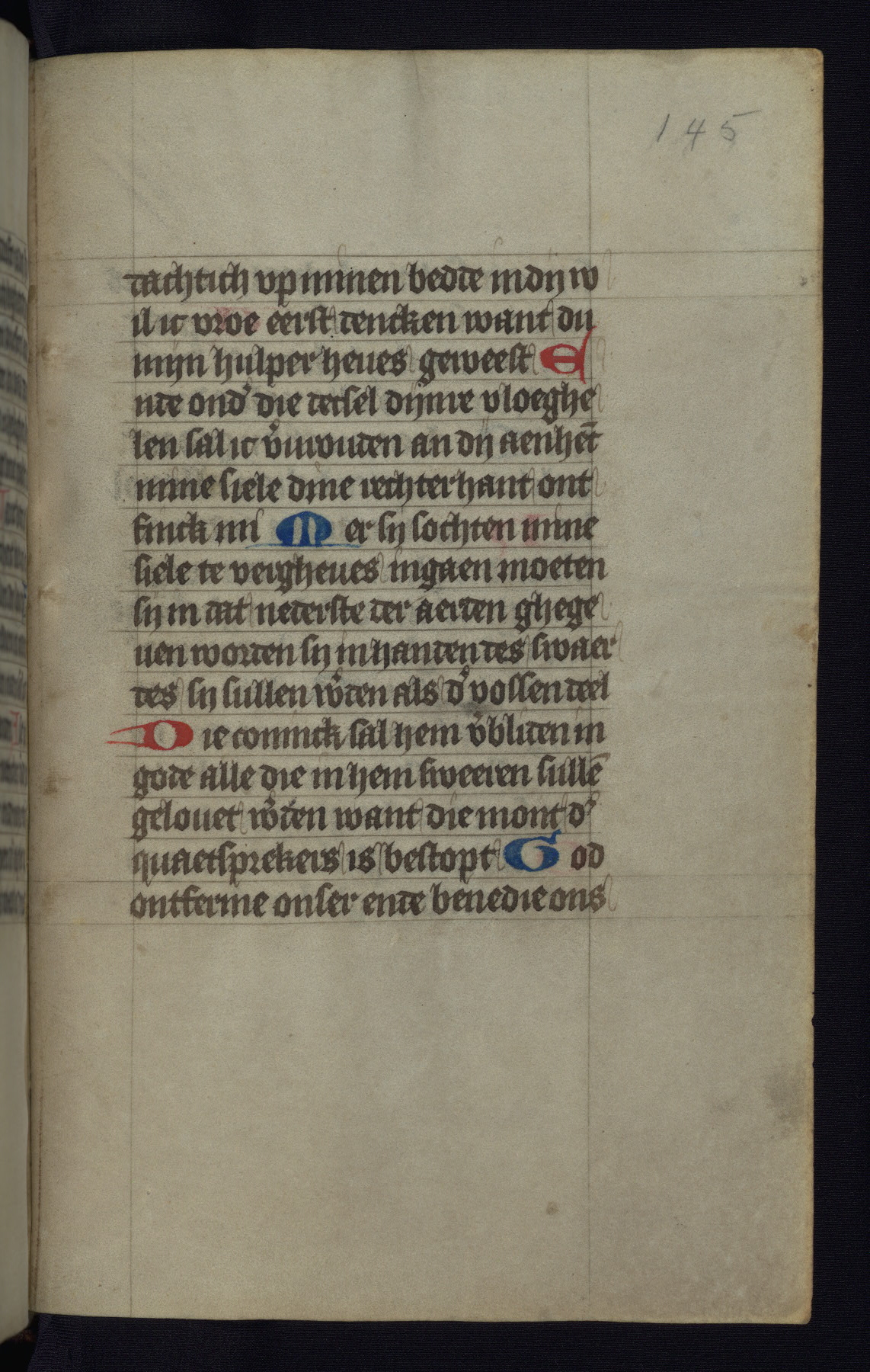 This mid-fifteenth-century illuminated book of hours is written entirely in Dutch on fine parchment and is remarkable for its eighteen grisaille miniatures. This technique, wherein the figures are modeled primarily in a gray wash, became a favorite in the Netherlands. The hand behind the miniatures in this manuscript has been identified with a group of artists known as the Masters of the Delft Grisailles. The manuscript has been grouped with more than a dozen related works, including New York, Pierpont Morgan Library Ms. M.349; London, Victoria and Albert Museum, Geo. Reid Ms. 32; Leiden, Bibliotheek der Rijksuniversiteit BPL 224; Brussels, Bibliothèque Royale Ms. 21696; Antwerp, Plantin Moretus Ms. 49; and The Hague, Koninklijke Bibliotheek Ms. 74 G 35. The manuscript comprises 152 folios and is almost completely intact, lacking only two miniatures. It retains its original brown leather binding decorated with mythological beasts and a now illegible inscription. The calendar is for the use of Utrecht, which helps localize its original ownership, as might a mostly erased ownership inscription that has been partially recovered. Good impressions of two circular pilgrim badges, now removed, are visible on fol. 112v.