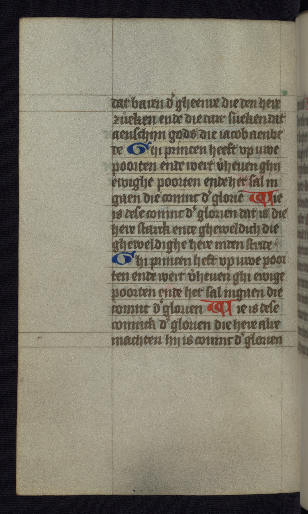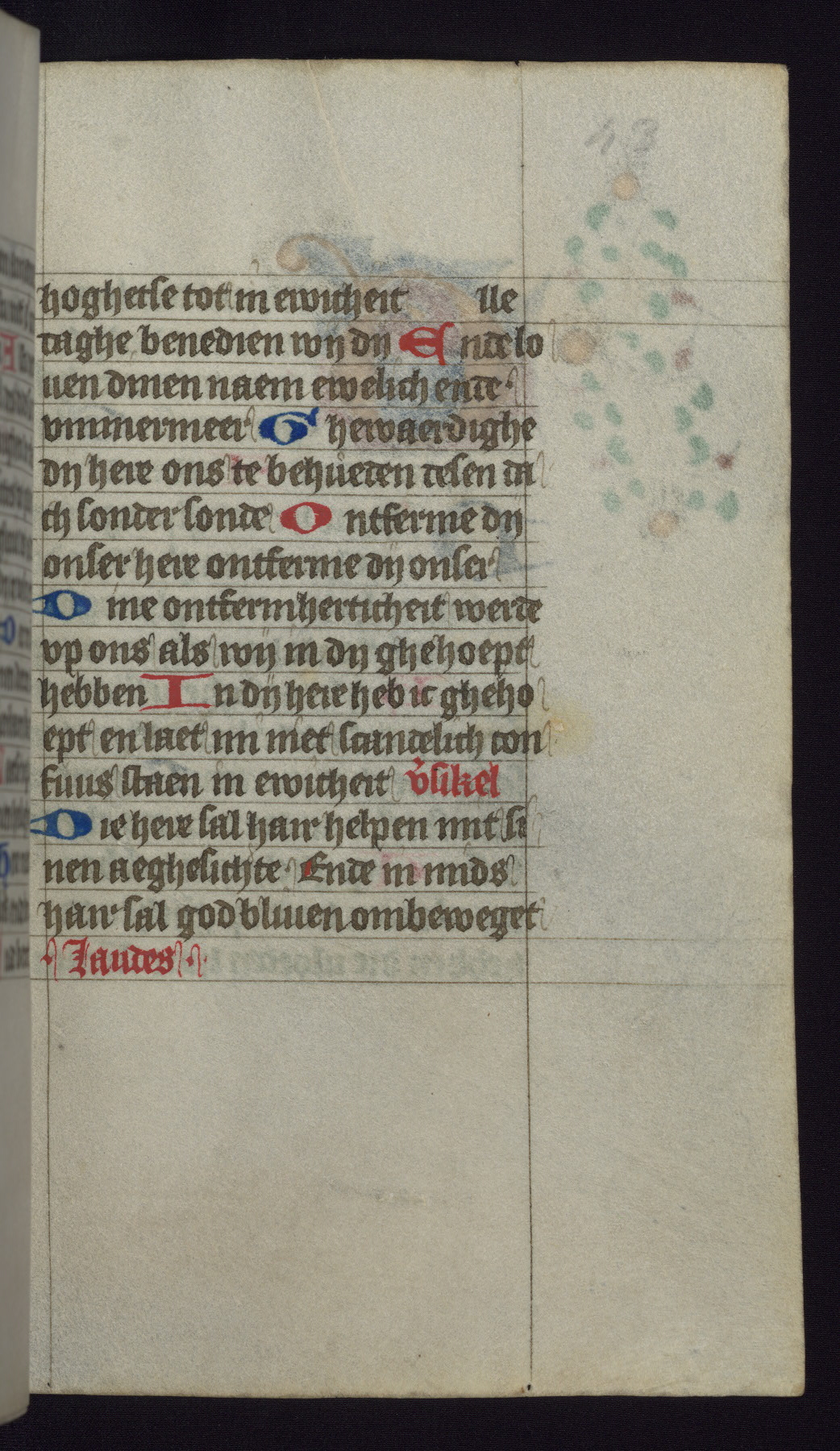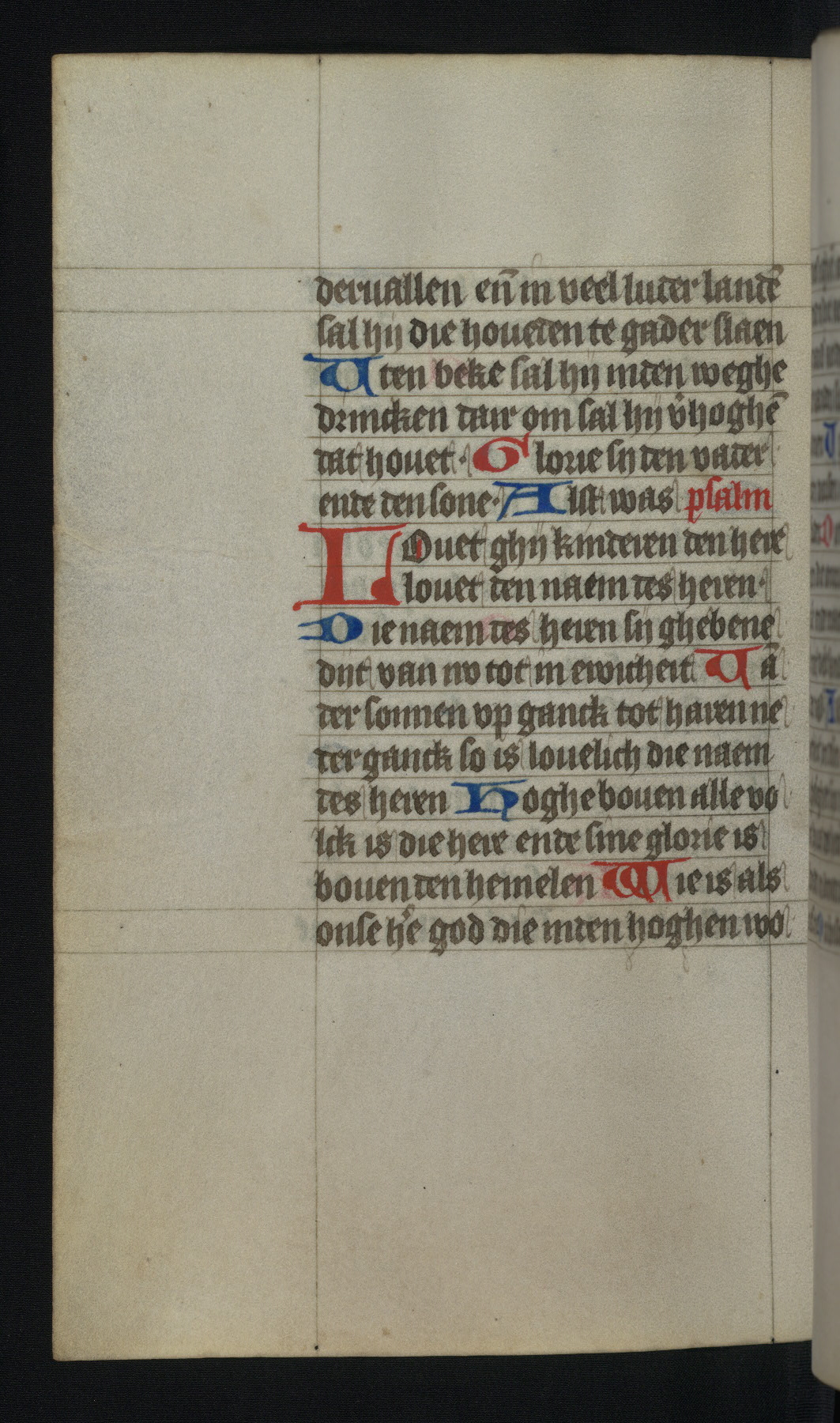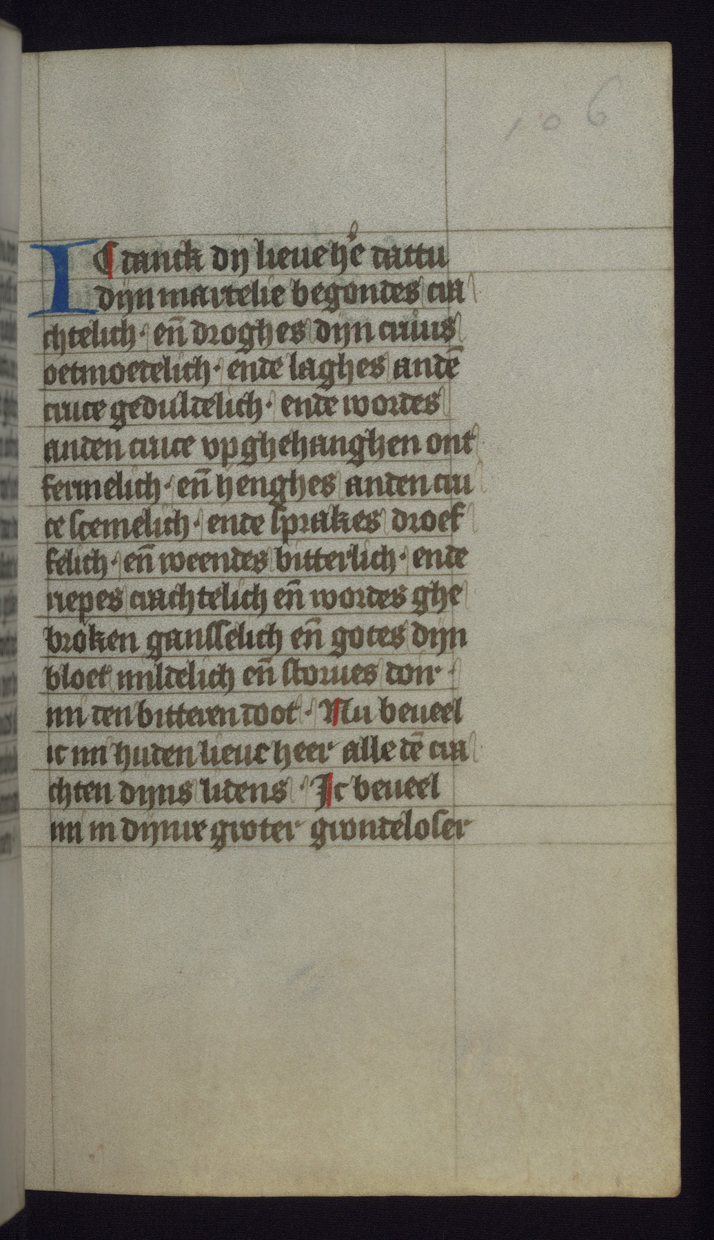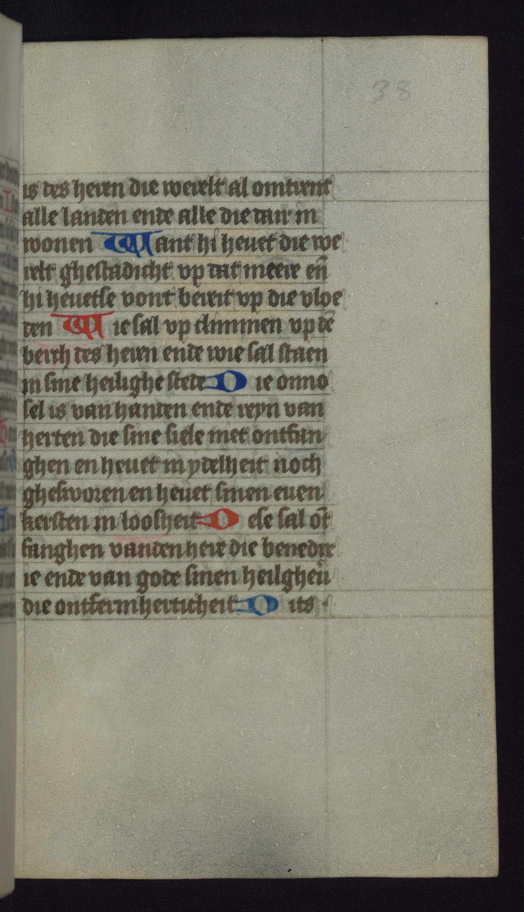 This mid-fifteenth-century illuminated book of hours is written entirely in Dutch on fine parchment and is remarkable for its eighteen grisaille miniatures. This technique, wherein the figures are modeled primarily in a gray wash, became a favorite in the Netherlands. The hand behind the miniatures in this manuscript has been identified with a group of artists known as the Masters of the Delft Grisailles. The manuscript has been grouped with more than a dozen related works, including New York, Pierpont Morgan Library Ms. M.349; London, Victoria and Albert Museum, Geo. Reid Ms. 32; Leiden, Bibliotheek der Rijksuniversiteit BPL 224; Brussels, Bibliothèque Royale Ms. 21696; Antwerp, Plantin Moretus Ms. 49; and The Hague, Koninklijke Bibliotheek Ms. 74 G 35. The manuscript comprises 152 folios and is almost completely intact, lacking only two miniatures. It retains its original brown leather binding decorated with mythological beasts and a now illegible inscription. The calendar is for the use of Utrecht, which helps localize its original ownership, as might a mostly erased ownership inscription that has been partially recovered. Good impressions of two circular pilgrim badges, now removed, are visible on fol. 112v.