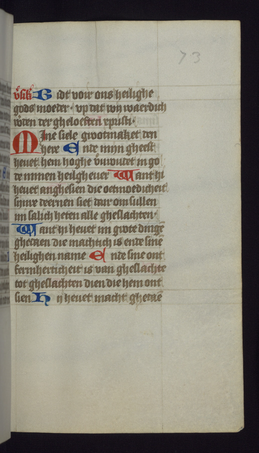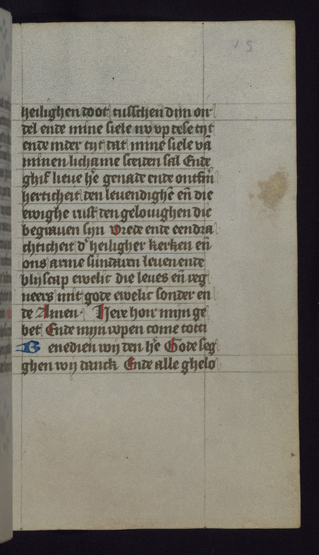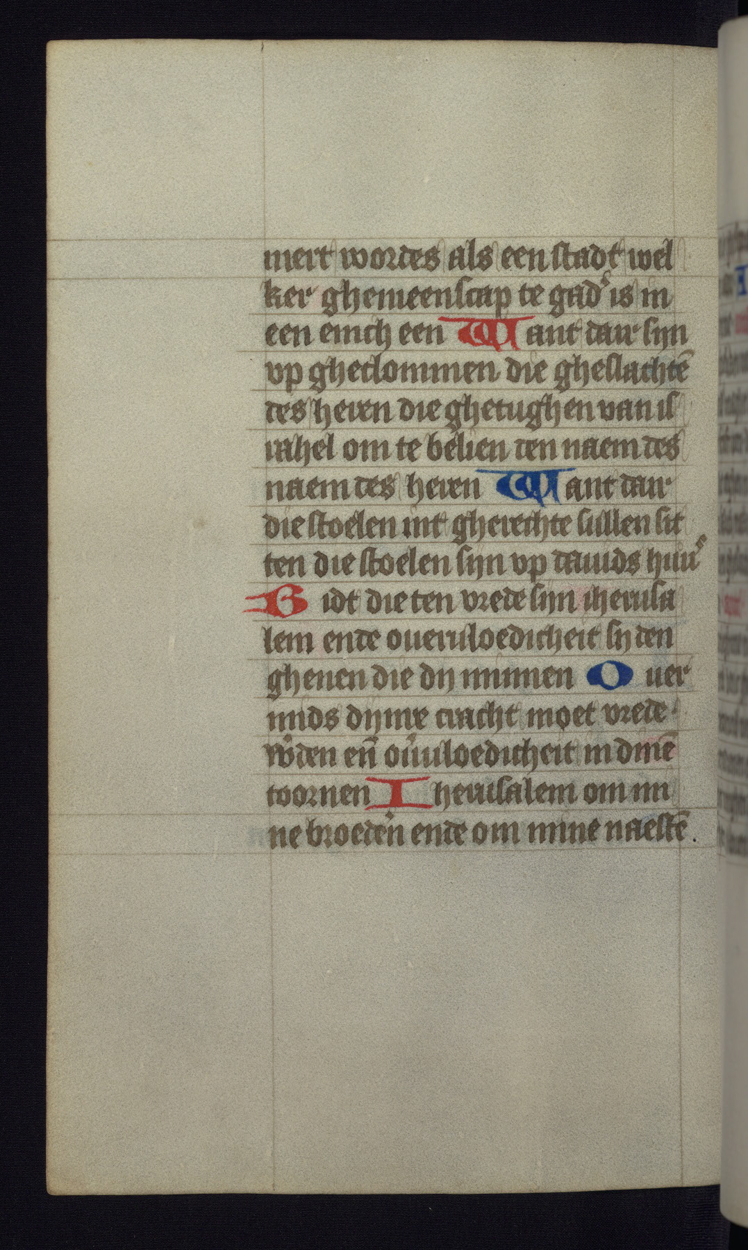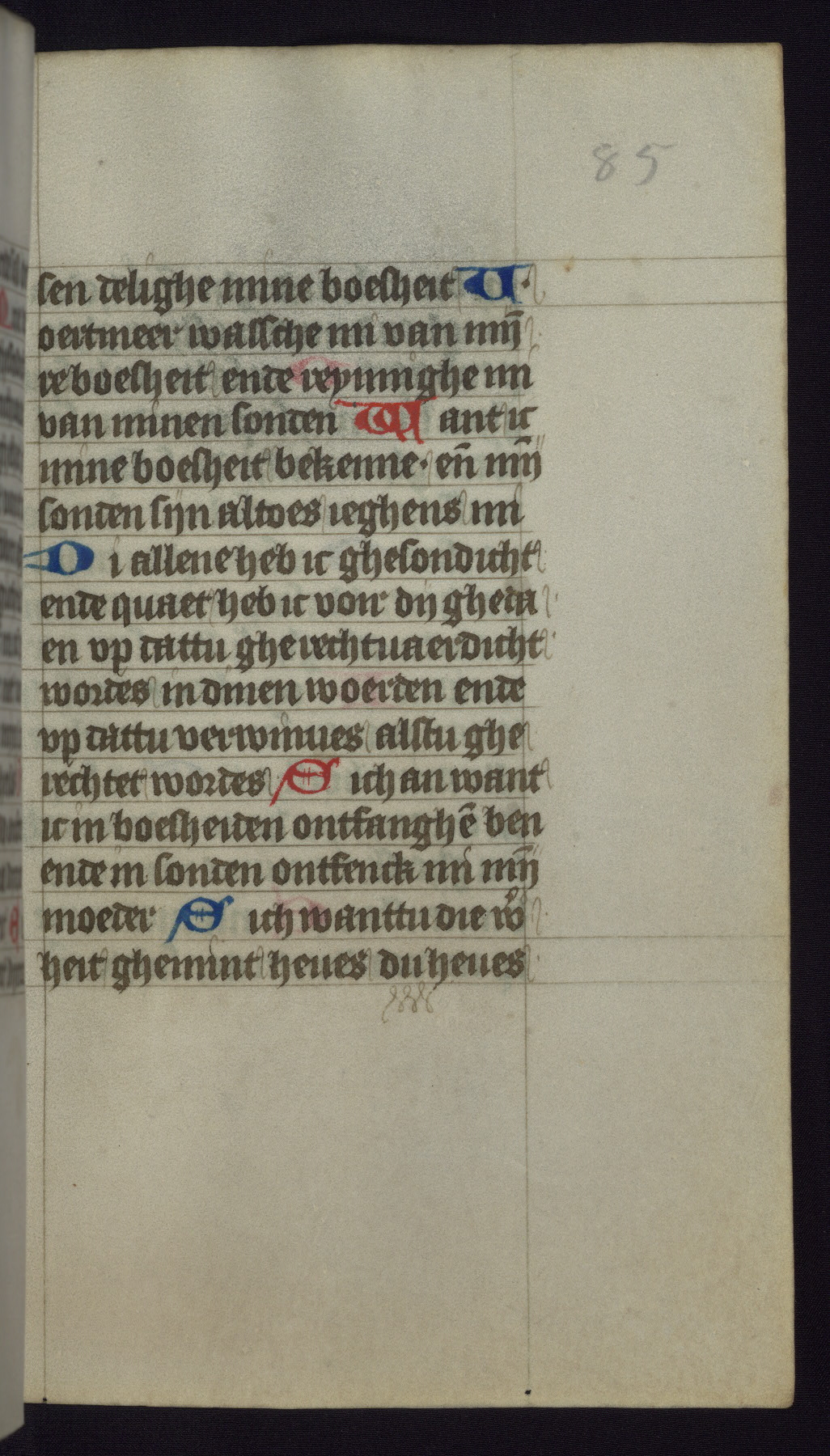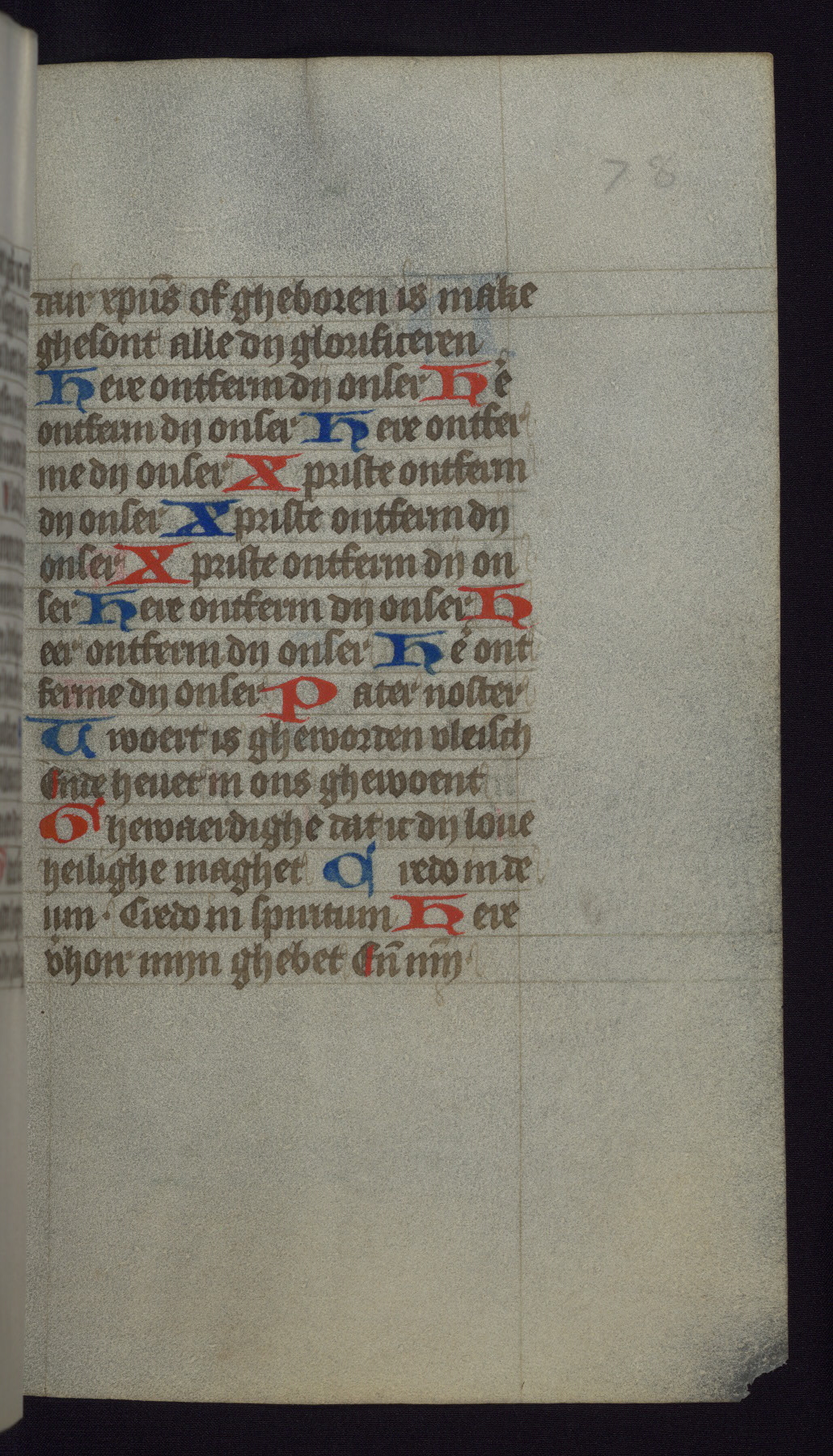 This mid-fifteenth-century illuminated book of hours is written entirely in Dutch on fine parchment and is remarkable for its eighteen grisaille miniatures. This technique, wherein the figures are modeled primarily in a gray wash, became a favorite in the Netherlands. The hand behind the miniatures in this manuscript has been identified with a group of artists known as the Masters of the Delft Grisailles. The manuscript has been grouped with more than a dozen related works, including New York, Pierpont Morgan Library Ms. M.349; London, Victoria and Albert Museum, Geo. Reid Ms. 32; Leiden, Bibliotheek der Rijksuniversiteit BPL 224; Brussels, Bibliothèque Royale Ms. 21696; Antwerp, Plantin Moretus Ms. 49; and The Hague, Koninklijke Bibliotheek Ms. 74 G 35. The manuscript comprises 152 folios and is almost completely intact, lacking only two miniatures. It retains its original brown leather binding decorated with mythological beasts and a now illegible inscription. The calendar is for the use of Utrecht, which helps localize its original ownership, as might a mostly erased ownership inscription that has been partially recovered. Good impressions of two circular pilgrim badges, now removed, are visible on fol. 112v.