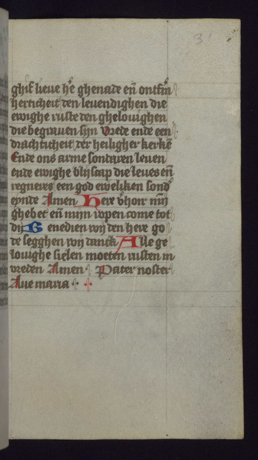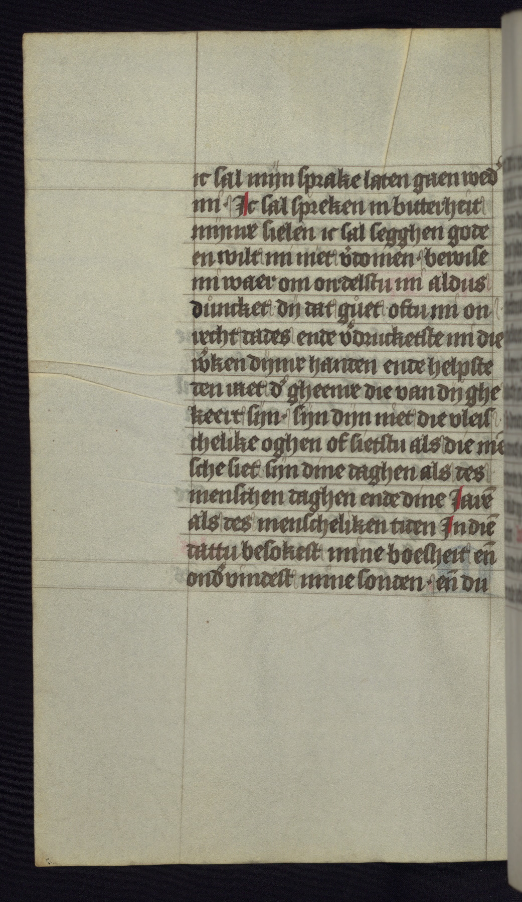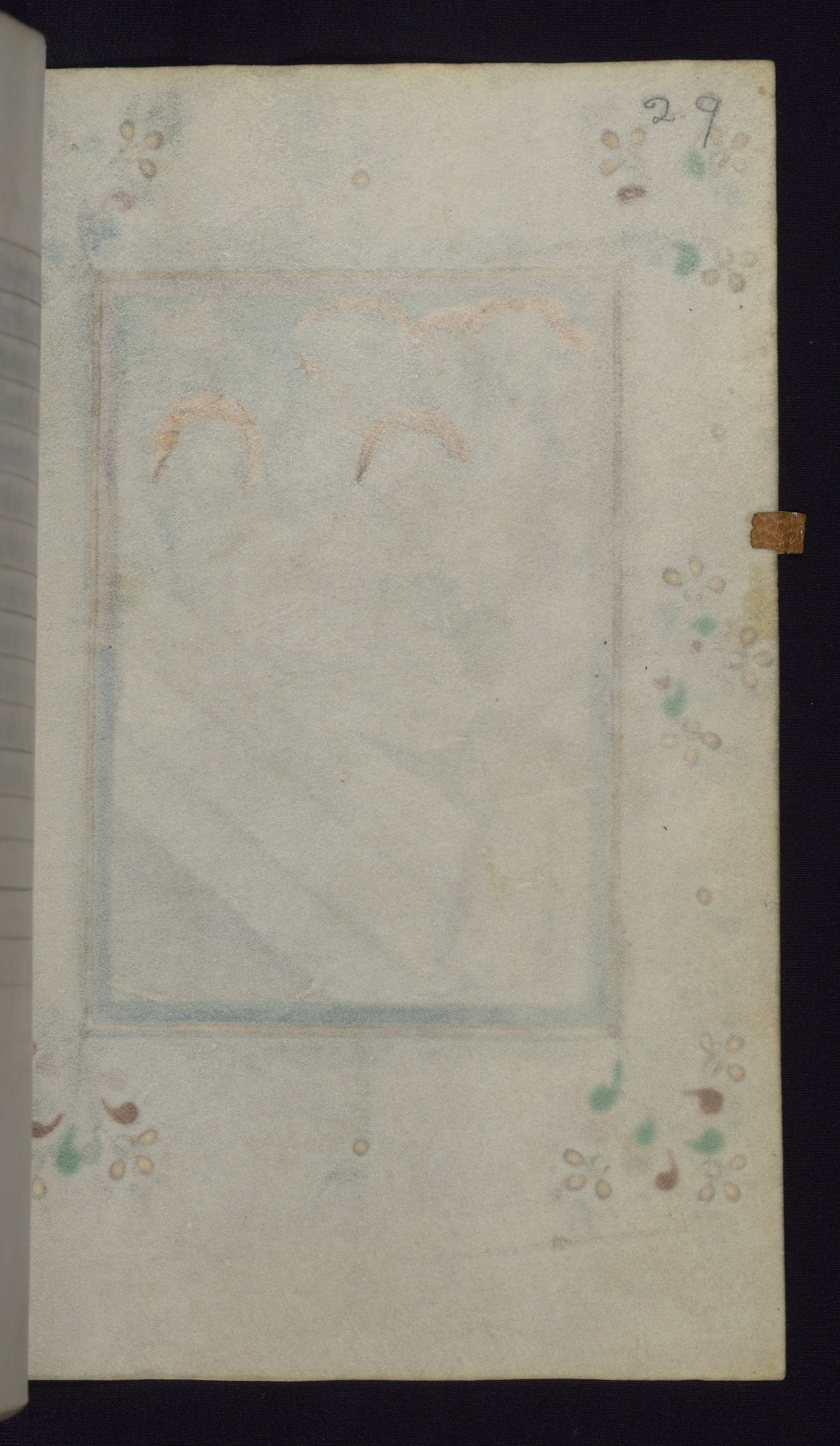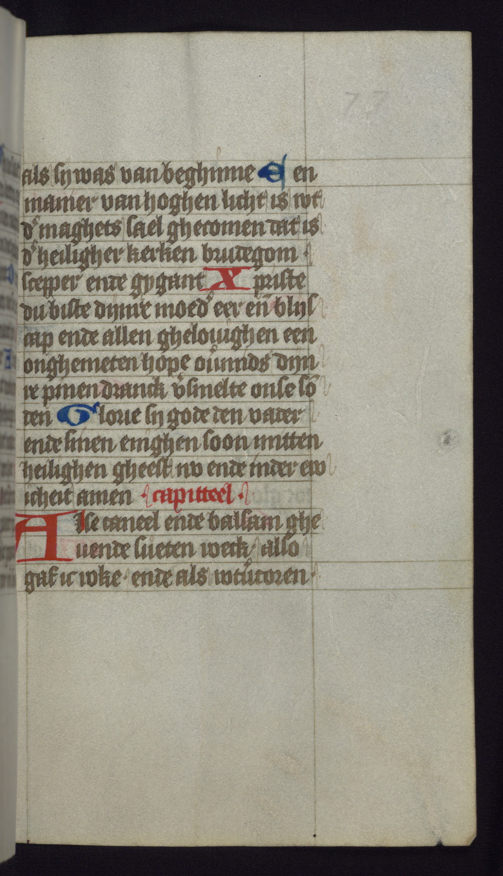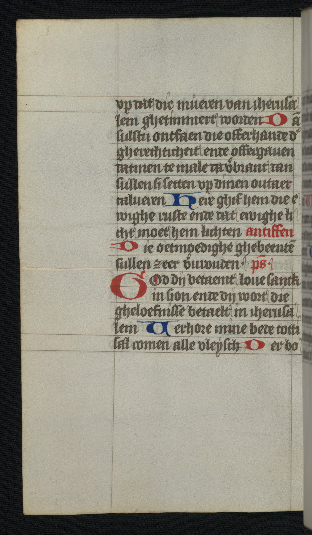 This mid-fifteenth-century illuminated book of hours is written entirely in Dutch on fine parchment and is remarkable for its eighteen grisaille miniatures. This technique, wherein the figures are modeled primarily in a gray wash, became a favorite in the Netherlands. The hand behind the miniatures in this manuscript has been identified with a group of artists known as the Masters of the Delft Grisailles. The manuscript has been grouped with more than a dozen related works, including New York, Pierpont Morgan Library Ms. M.349; London, Victoria and Albert Museum, Geo. Reid Ms. 32; Leiden, Bibliotheek der Rijksuniversiteit BPL 224; Brussels, Bibliothèque Royale Ms. 21696; Antwerp, Plantin Moretus Ms. 49; and The Hague, Koninklijke Bibliotheek Ms. 74 G 35. The manuscript comprises 152 folios and is almost completely intact, lacking only two miniatures. It retains its original brown leather binding decorated with mythological beasts and a now illegible inscription. The calendar is for the use of Utrecht, which helps localize its original ownership, as might a mostly erased ownership inscription that has been partially recovered. Good impressions of two circular pilgrim badges, now removed, are visible on fol. 112v.