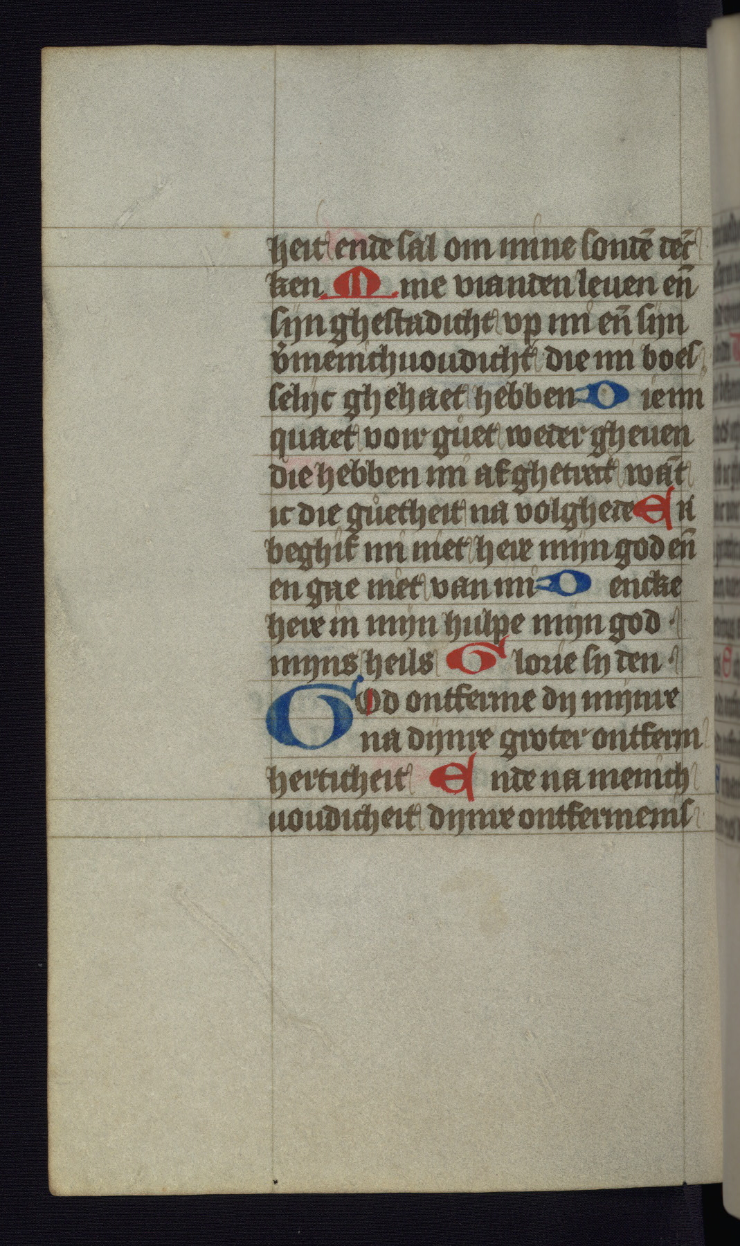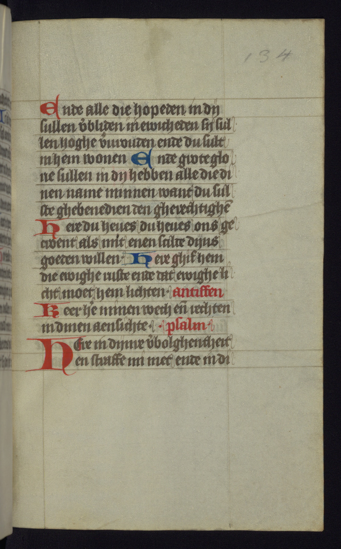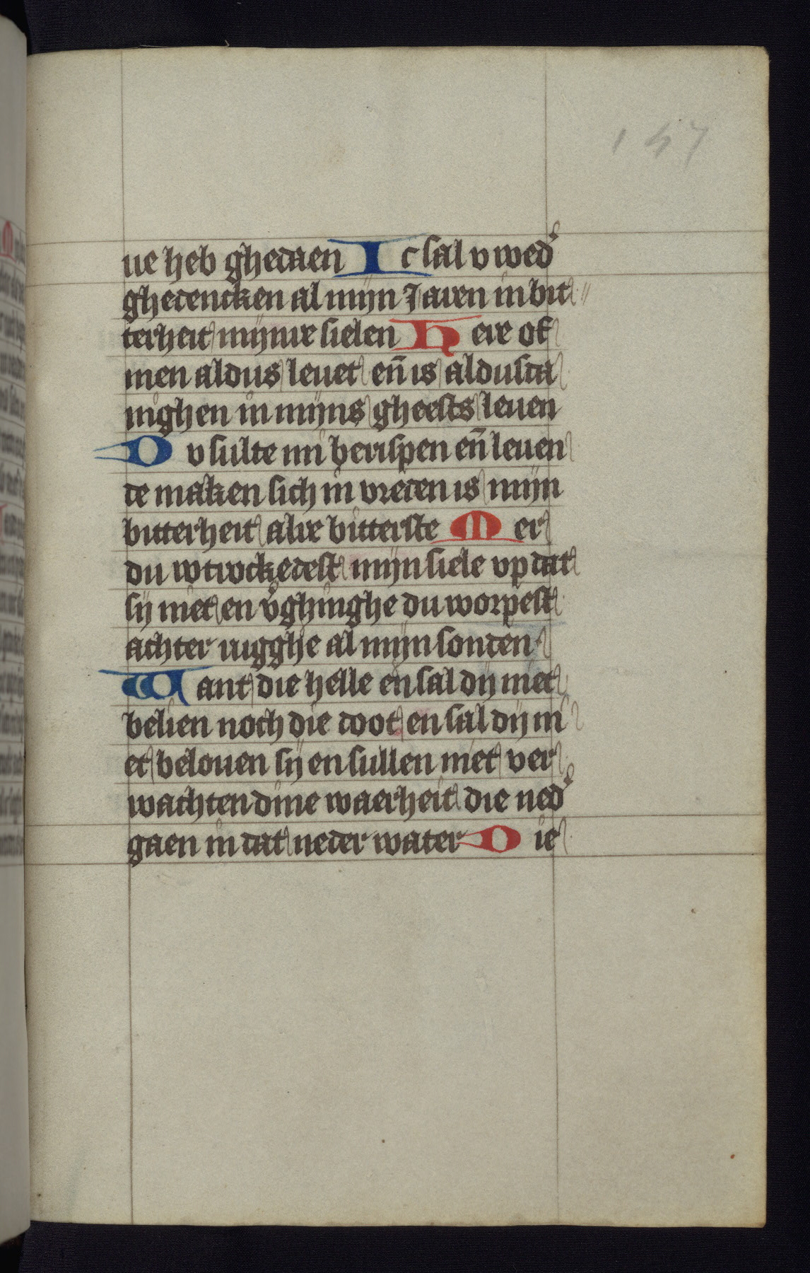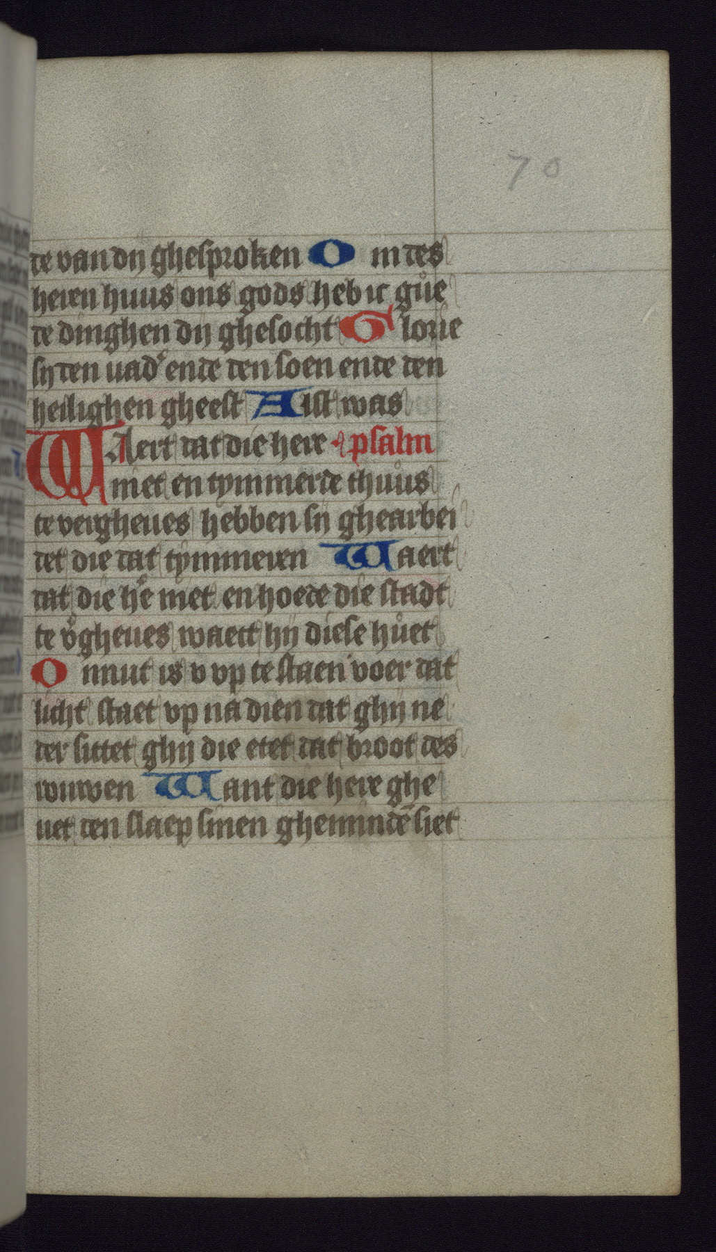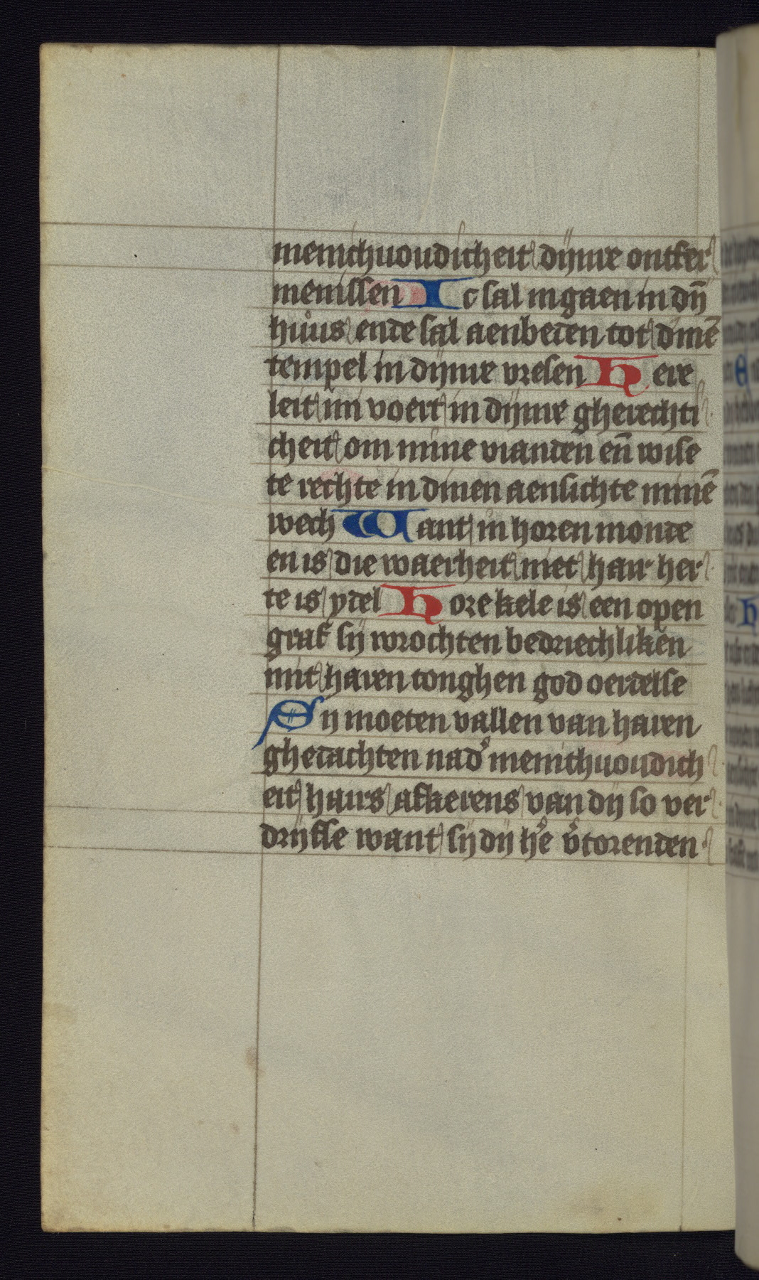 This mid-fifteenth-century illuminated book of hours is written entirely in Dutch on fine parchment and is remarkable for its eighteen grisaille miniatures. This technique, wherein the figures are modeled primarily in a gray wash, became a favorite in the Netherlands. The hand behind the miniatures in this manuscript has been identified with a group of artists known as the Masters of the Delft Grisailles. The manuscript has been grouped with more than a dozen related works, including New York, Pierpont Morgan Library Ms. M.349; London, Victoria and Albert Museum, Geo. Reid Ms. 32; Leiden, Bibliotheek der Rijksuniversiteit BPL 224; Brussels, Bibliothèque Royale Ms. 21696; Antwerp, Plantin Moretus Ms. 49; and The Hague, Koninklijke Bibliotheek Ms. 74 G 35. The manuscript comprises 152 folios and is almost completely intact, lacking only two miniatures. It retains its original brown leather binding decorated with mythological beasts and a now illegible inscription. The calendar is for the use of Utrecht, which helps localize its original ownership, as might a mostly erased ownership inscription that has been partially recovered. Good impressions of two circular pilgrim badges, now removed, are visible on fol. 112v.