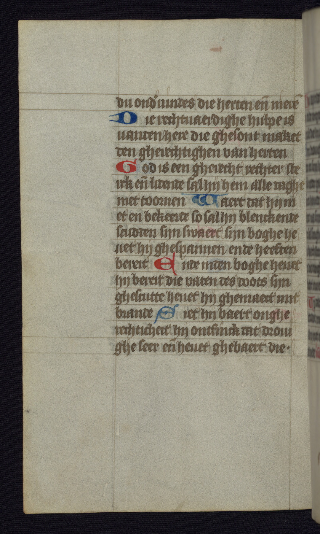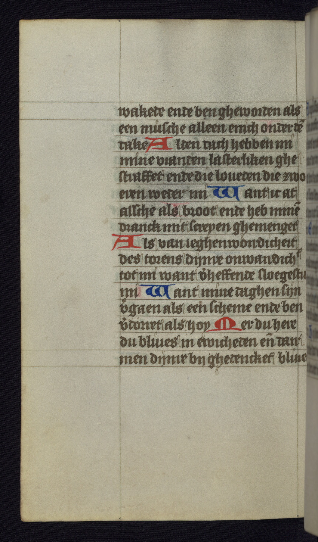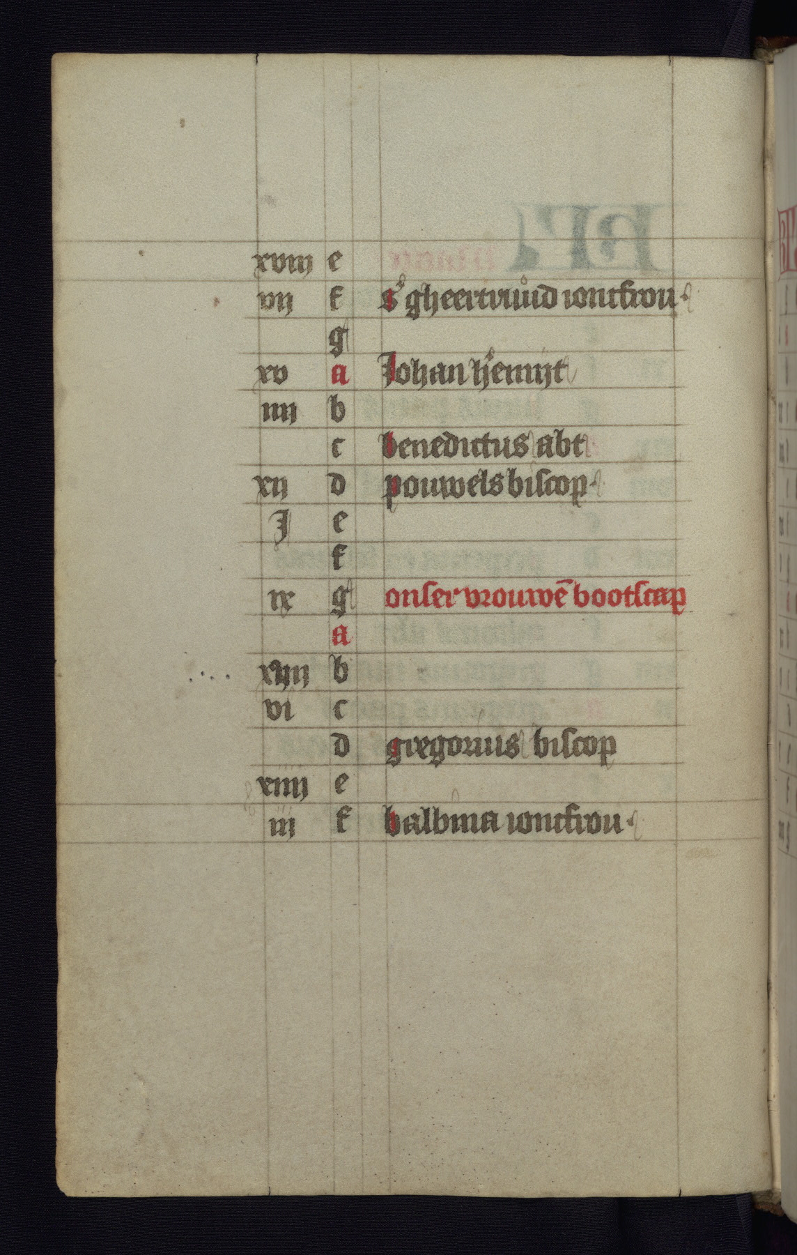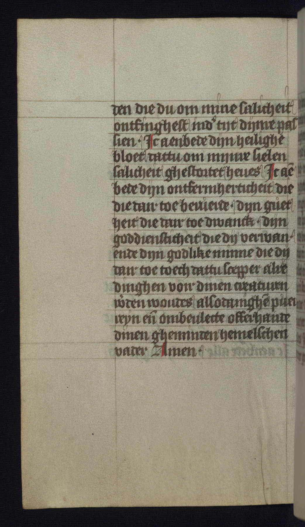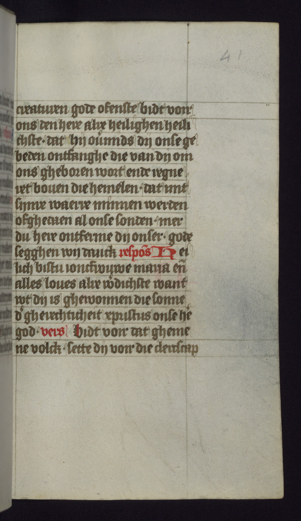 This mid-fifteenth-century illuminated book of hours is written entirely in Dutch on fine parchment and is remarkable for its eighteen grisaille miniatures. This technique, wherein the figures are modeled primarily in a gray wash, became a favorite in the Netherlands. The hand behind the miniatures in this manuscript has been identified with a group of artists known as the Masters of the Delft Grisailles. The manuscript has been grouped with more than a dozen related works, including New York, Pierpont Morgan Library Ms. M.349; London, Victoria and Albert Museum, Geo. Reid Ms. 32; Leiden, Bibliotheek der Rijksuniversiteit BPL 224; Brussels, Bibliothèque Royale Ms. 21696; Antwerp, Plantin Moretus Ms. 49; and The Hague, Koninklijke Bibliotheek Ms. 74 G 35. The manuscript comprises 152 folios and is almost completely intact, lacking only two miniatures. It retains its original brown leather binding decorated with mythological beasts and a now illegible inscription. The calendar is for the use of Utrecht, which helps localize its original ownership, as might a mostly erased ownership inscription that has been partially recovered. Good impressions of two circular pilgrim badges, now removed, are visible on fol. 112v.
