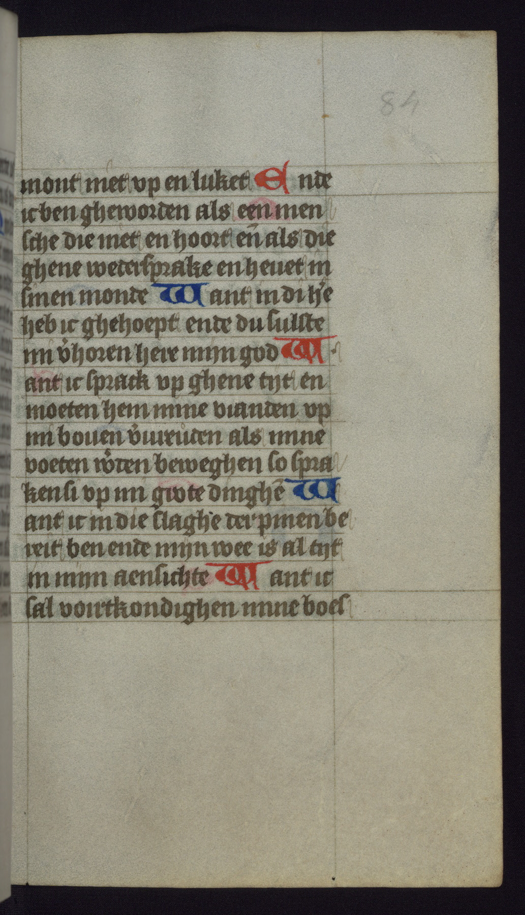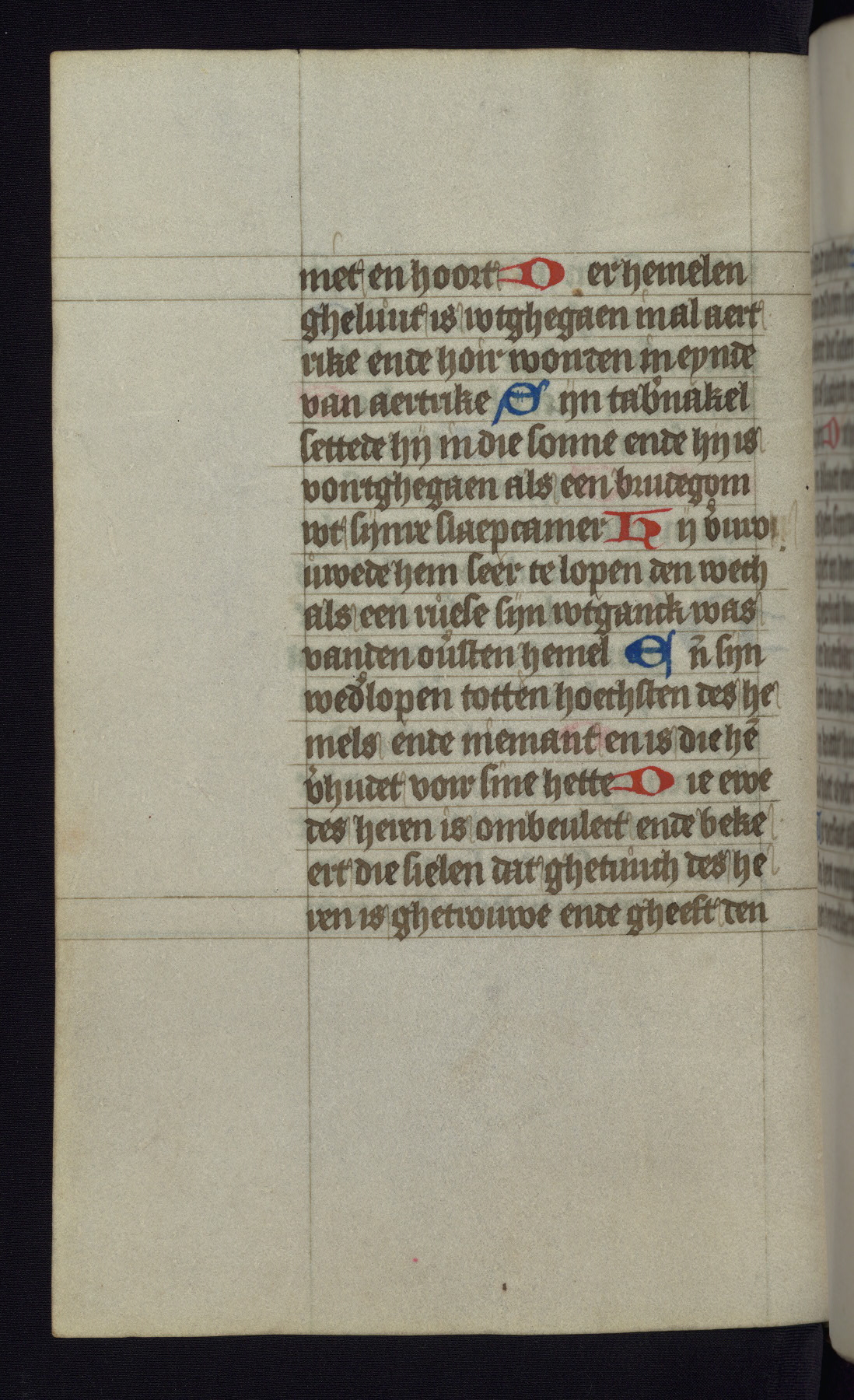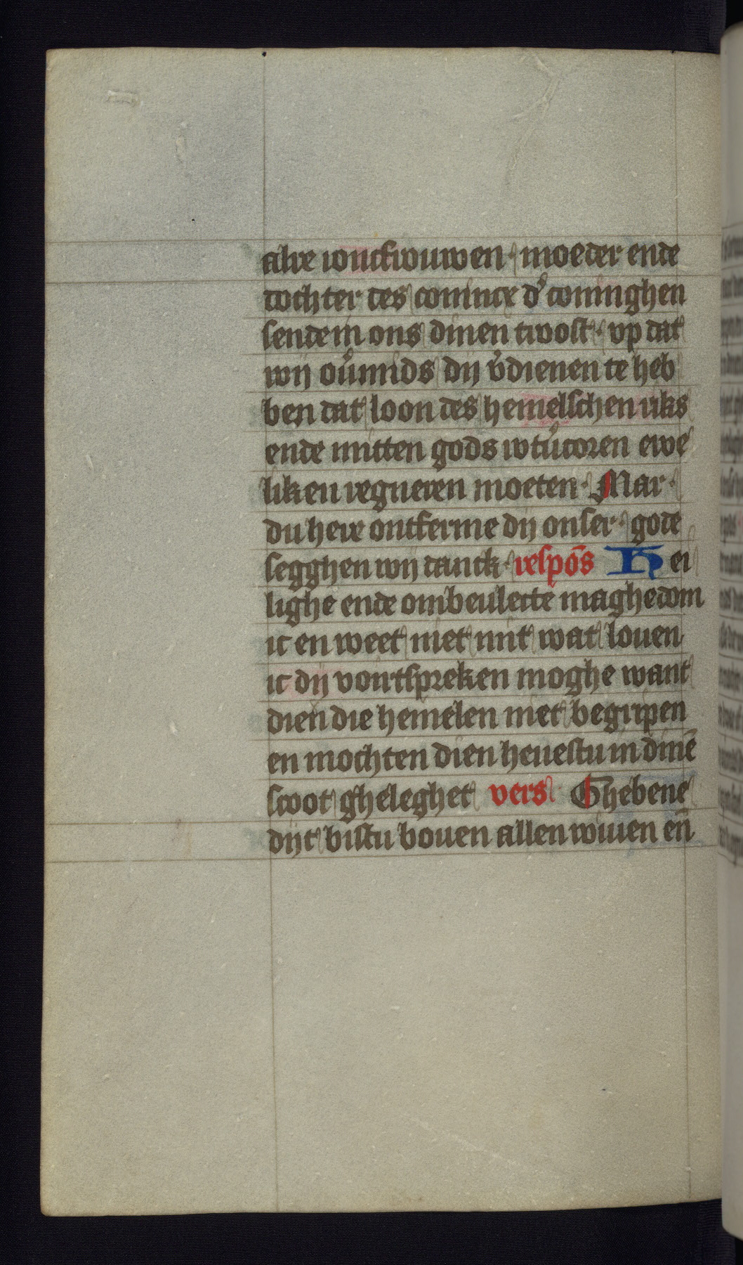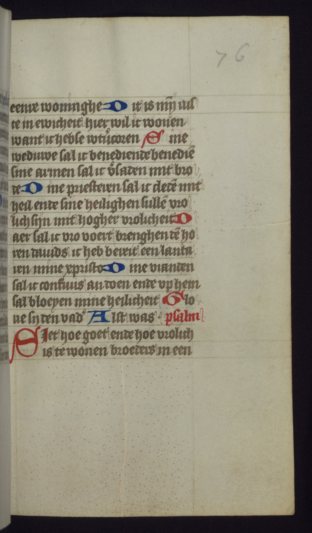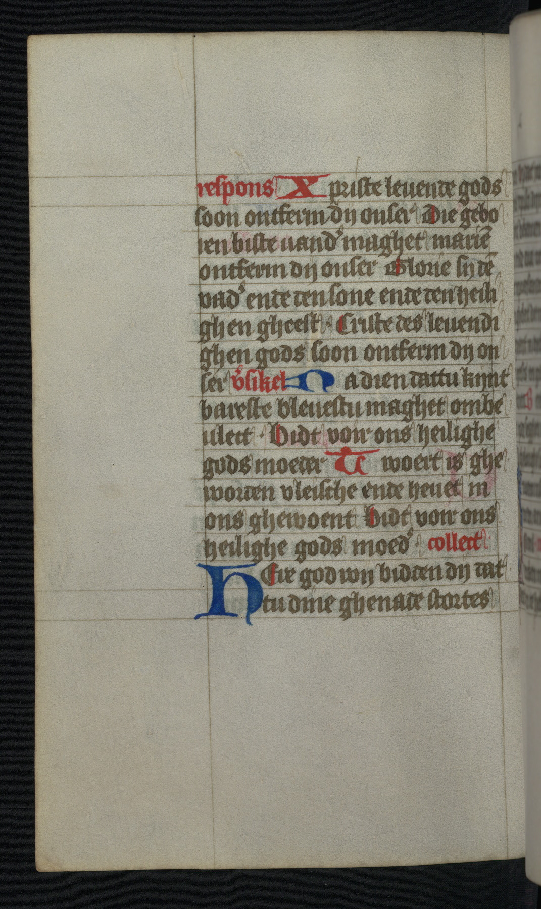 This mid-fifteenth-century illuminated book of hours is written entirely in Dutch on fine parchment and is remarkable for its eighteen grisaille miniatures. This technique, wherein the figures are modeled primarily in a gray wash, became a favorite in the Netherlands. The hand behind the miniatures in this manuscript has been identified with a group of artists known as the Masters of the Delft Grisailles. The manuscript has been grouped with more than a dozen related works, including New York, Pierpont Morgan Library Ms. M.349; London, Victoria and Albert Museum, Geo. Reid Ms. 32; Leiden, Bibliotheek der Rijksuniversiteit BPL 224; Brussels, Bibliothèque Royale Ms. 21696; Antwerp, Plantin Moretus Ms. 49; and The Hague, Koninklijke Bibliotheek Ms. 74 G 35. The manuscript comprises 152 folios and is almost completely intact, lacking only two miniatures. It retains its original brown leather binding decorated with mythological beasts and a now illegible inscription. The calendar is for the use of Utrecht, which helps localize its original ownership, as might a mostly erased ownership inscription that has been partially recovered. Good impressions of two circular pilgrim badges, now removed, are visible on fol. 112v.