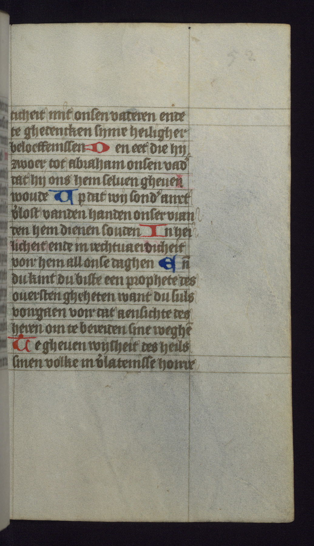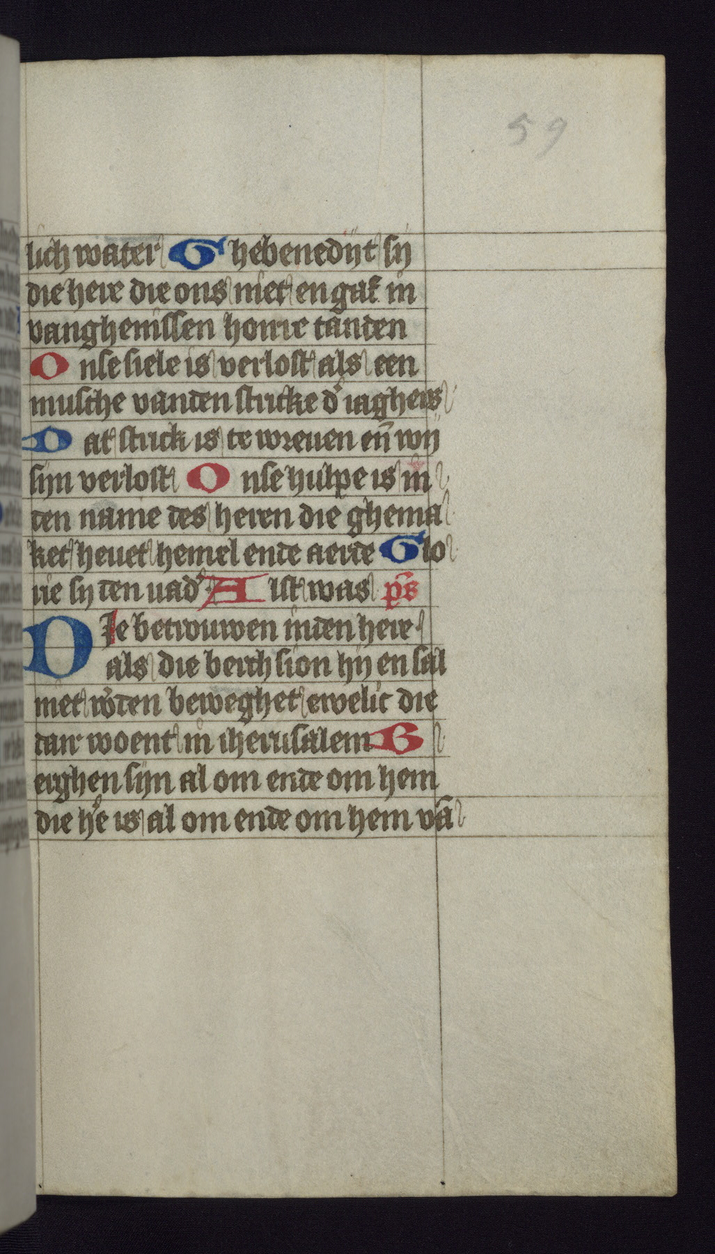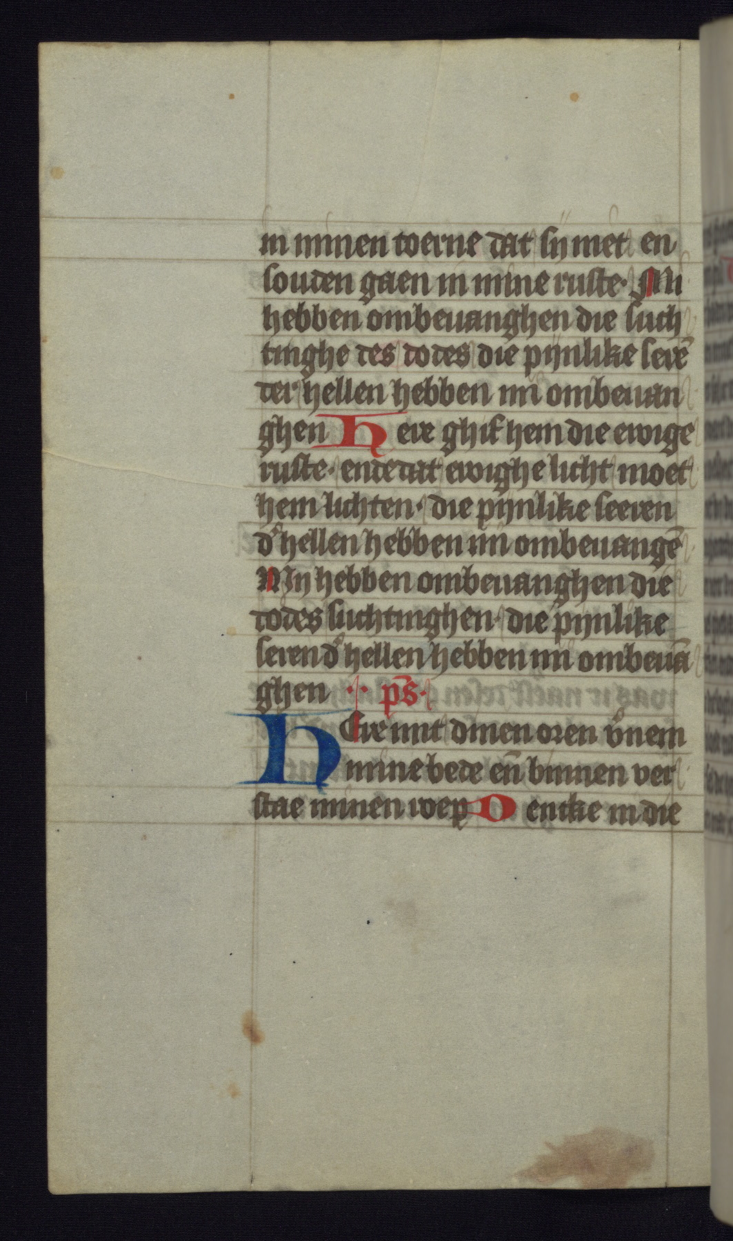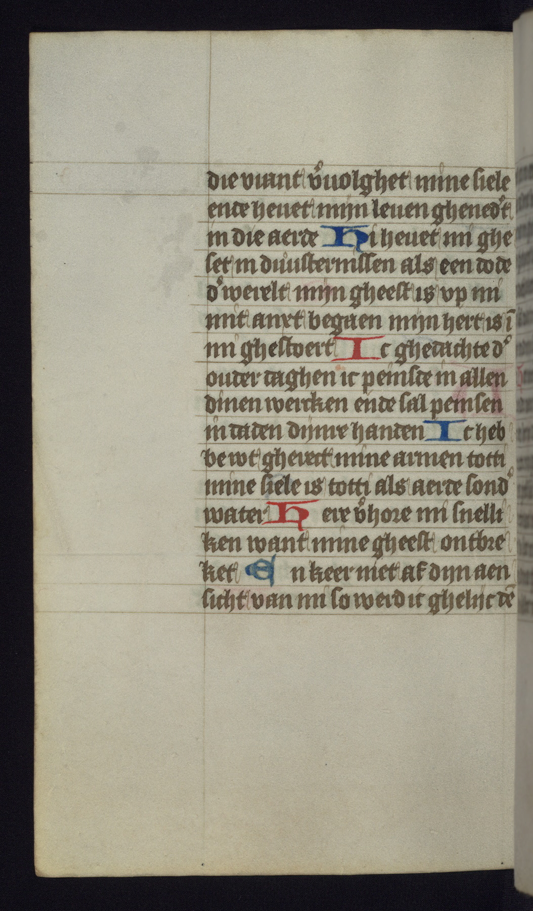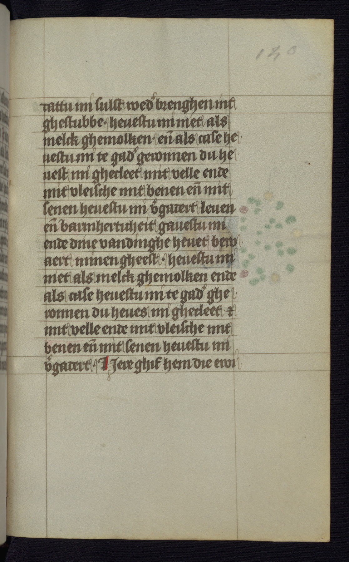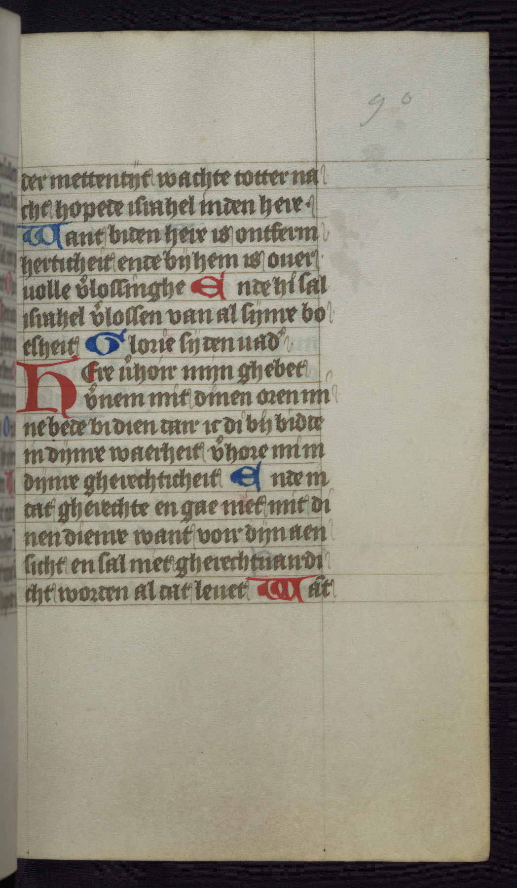 This mid-fifteenth-century illuminated book of hours is written entirely in Dutch on fine parchment and is remarkable for its eighteen grisaille miniatures. This technique, wherein the figures are modeled primarily in a gray wash, became a favorite in the Netherlands. The hand behind the miniatures in this manuscript has been identified with a group of artists known as the Masters of the Delft Grisailles. The manuscript has been grouped with more than a dozen related works, including New York, Pierpont Morgan Library Ms. M.349; London, Victoria and Albert Museum, Geo. Reid Ms. 32; Leiden, Bibliotheek der Rijksuniversiteit BPL 224; Brussels, Bibliothèque Royale Ms. 21696; Antwerp, Plantin Moretus Ms. 49; and The Hague, Koninklijke Bibliotheek Ms. 74 G 35. The manuscript comprises 152 folios and is almost completely intact, lacking only two miniatures. It retains its original brown leather binding decorated with mythological beasts and a now illegible inscription. The calendar is for the use of Utrecht, which helps localize its original ownership, as might a mostly erased ownership inscription that has been partially recovered. Good impressions of two circular pilgrim badges, now removed, are visible on fol. 112v.