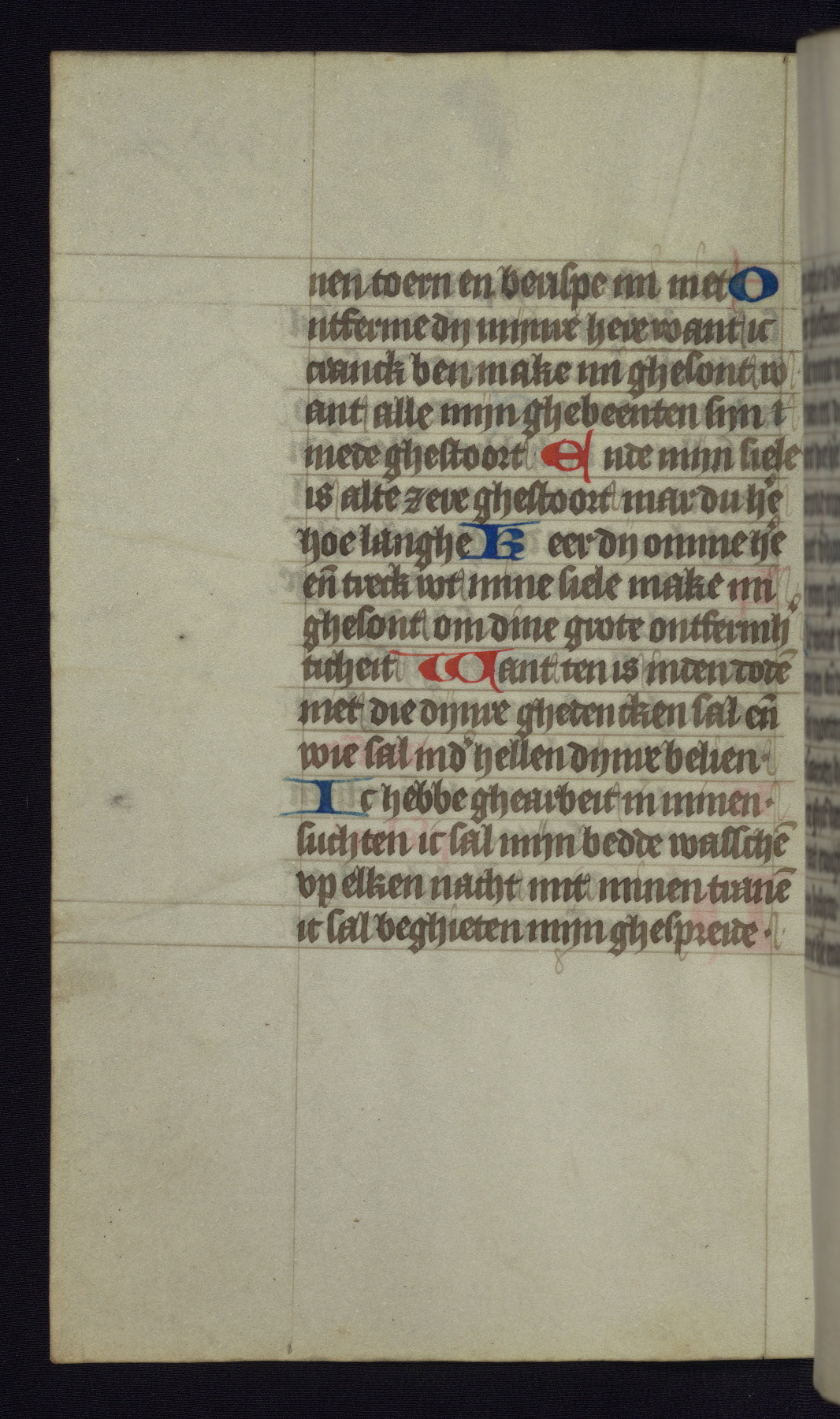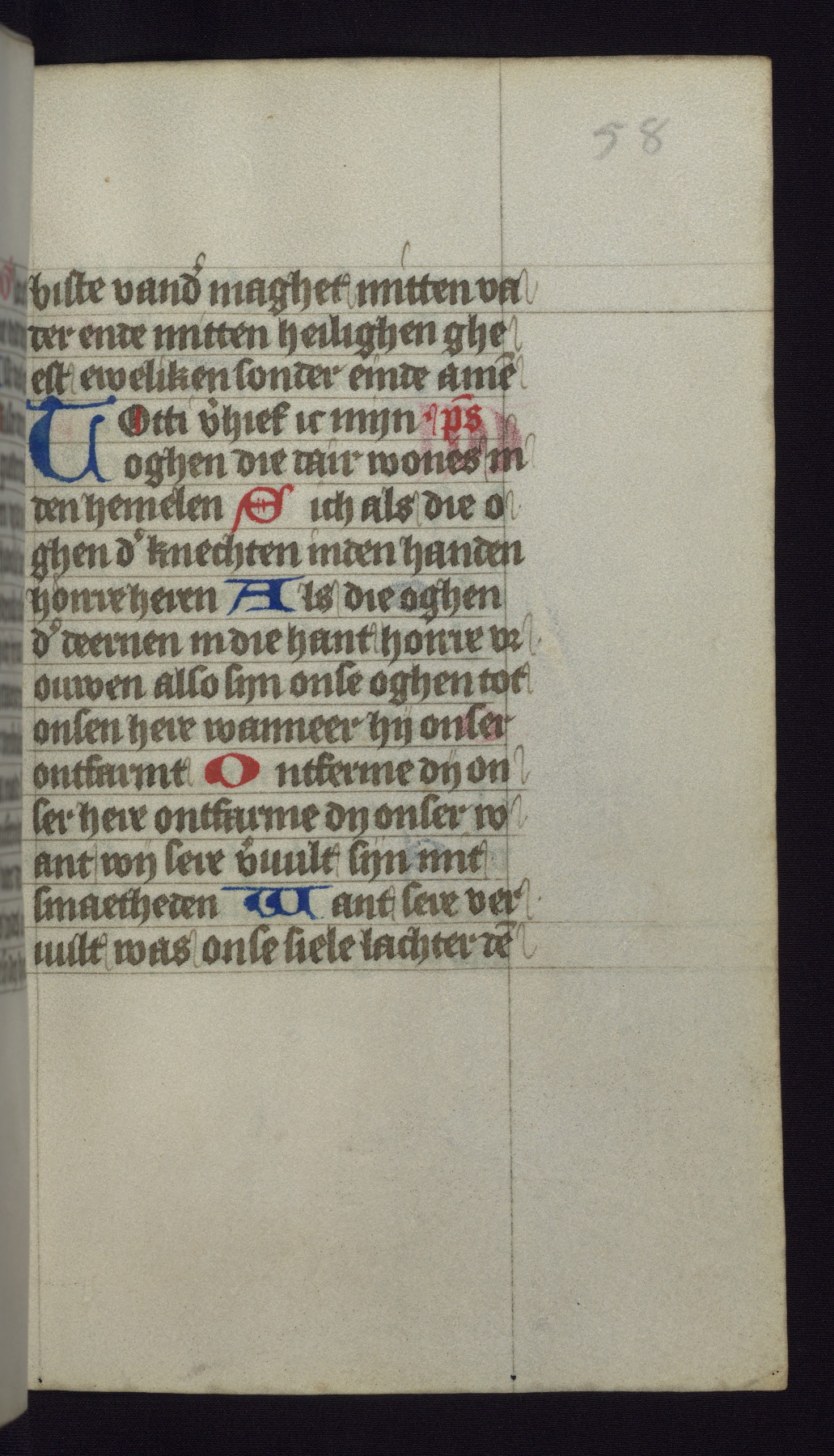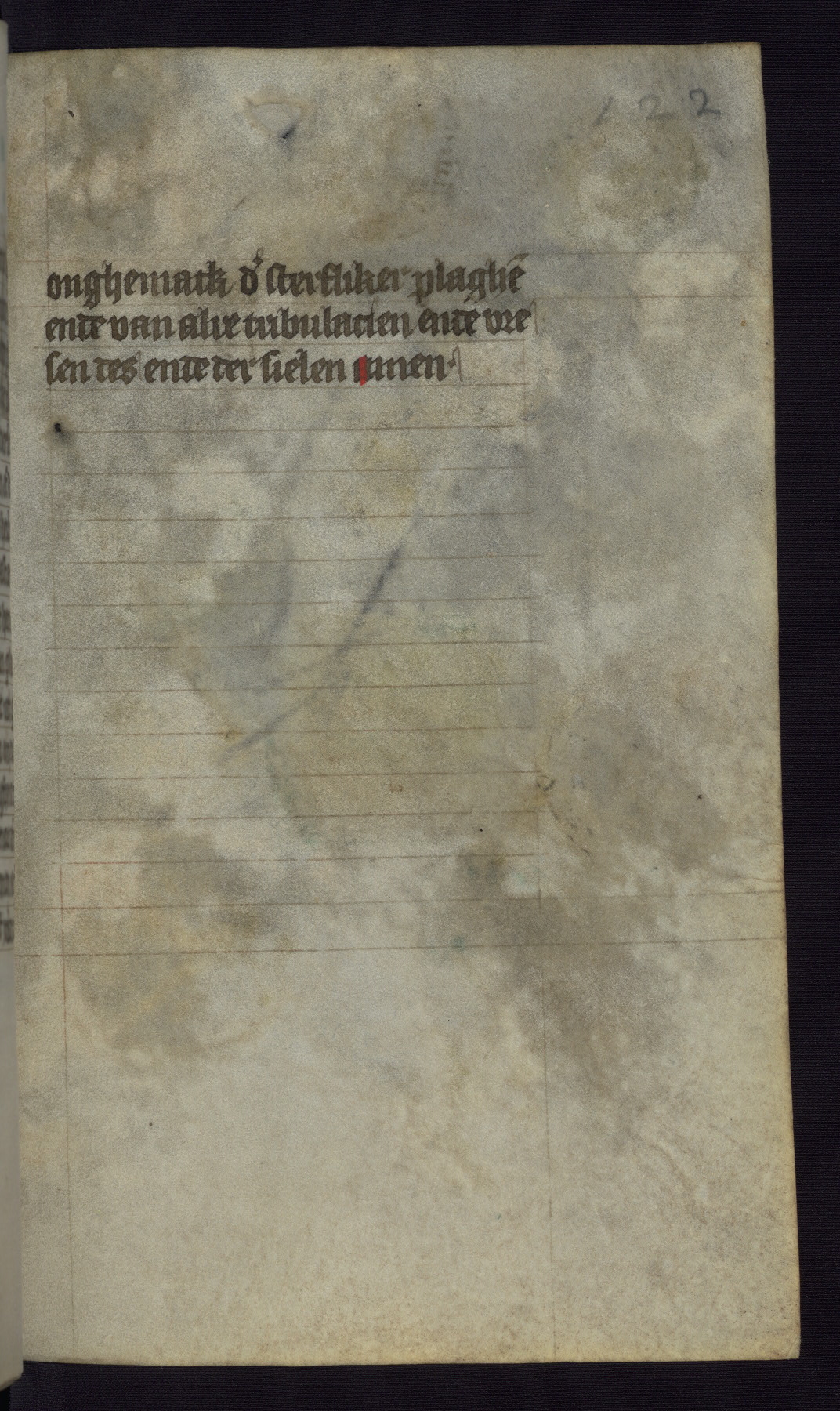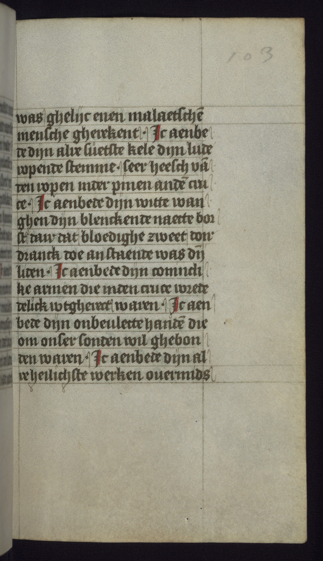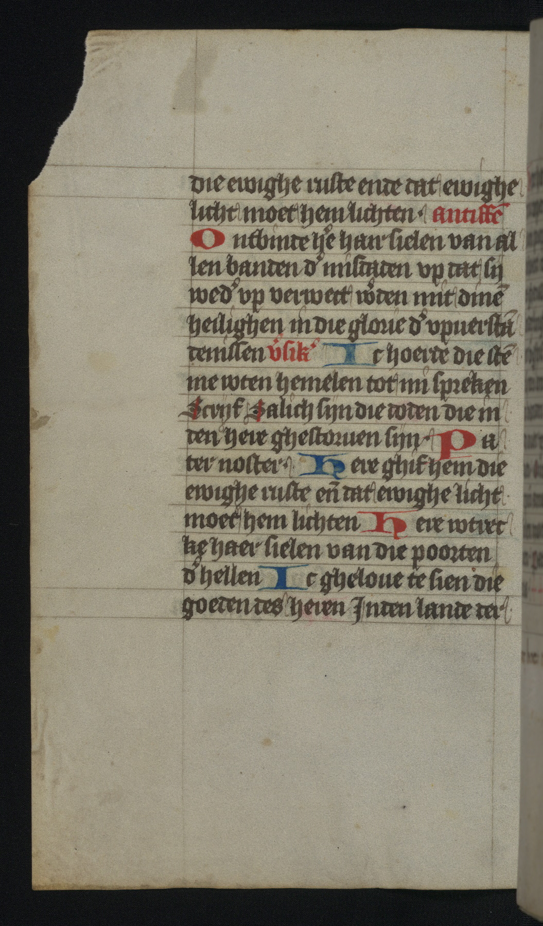 This mid-fifteenth-century illuminated book of hours is written entirely in Dutch on fine parchment and is remarkable for its eighteen grisaille miniatures. This technique, wherein the figures are modeled primarily in a gray wash, became a favorite in the Netherlands. The hand behind the miniatures in this manuscript has been identified with a group of artists known as the Masters of the Delft Grisailles. The manuscript has been grouped with more than a dozen related works, including New York, Pierpont Morgan Library Ms. M.349; London, Victoria and Albert Museum, Geo. Reid Ms. 32; Leiden, Bibliotheek der Rijksuniversiteit BPL 224; Brussels, Bibliothèque Royale Ms. 21696; Antwerp, Plantin Moretus Ms. 49; and The Hague, Koninklijke Bibliotheek Ms. 74 G 35. The manuscript comprises 152 folios and is almost completely intact, lacking only two miniatures. It retains its original brown leather binding decorated with mythological beasts and a now illegible inscription. The calendar is for the use of Utrecht, which helps localize its original ownership, as might a mostly erased ownership inscription that has been partially recovered. Good impressions of two circular pilgrim badges, now removed, are visible on fol. 112v.