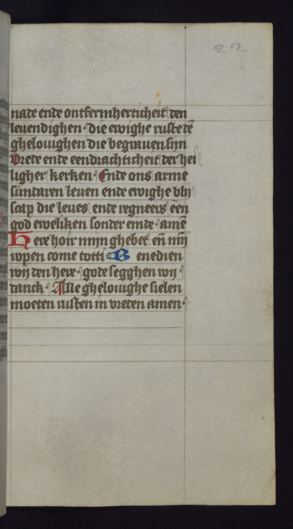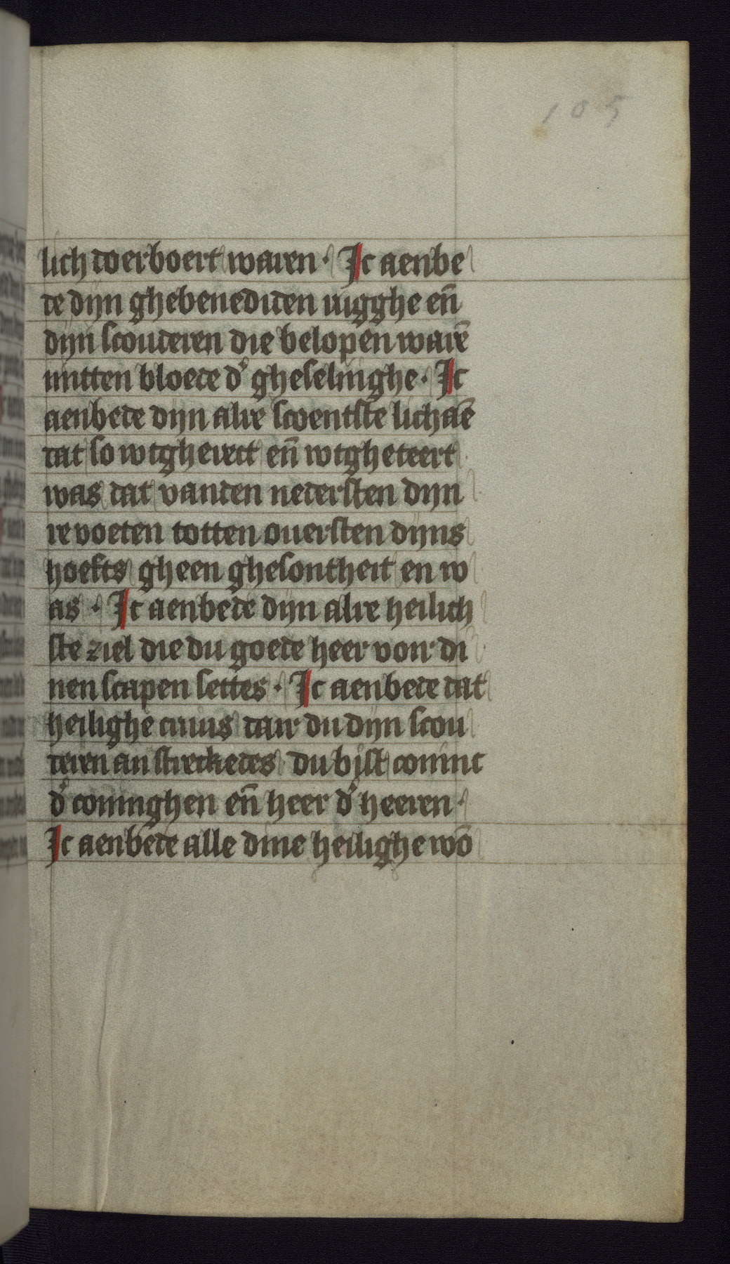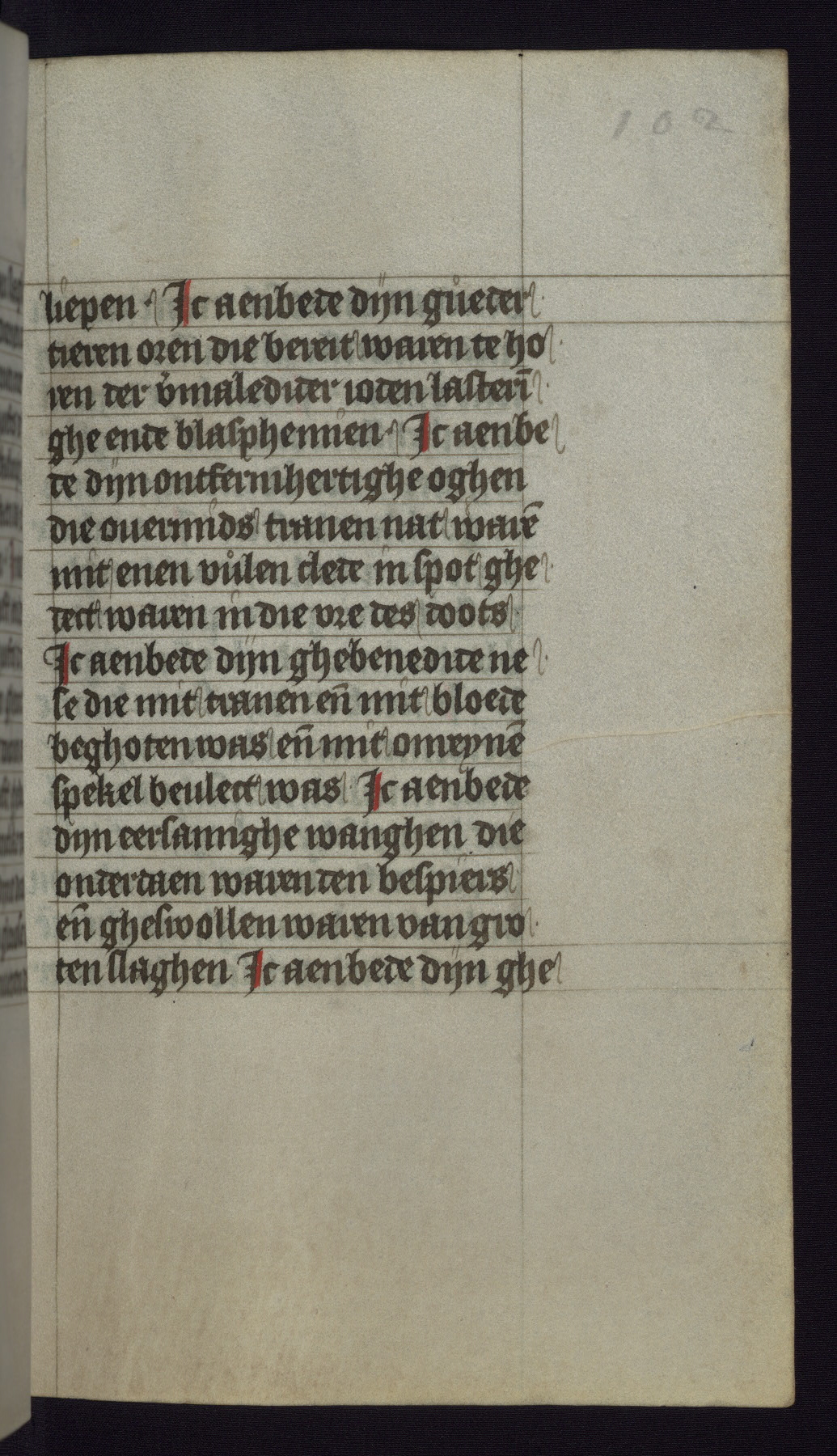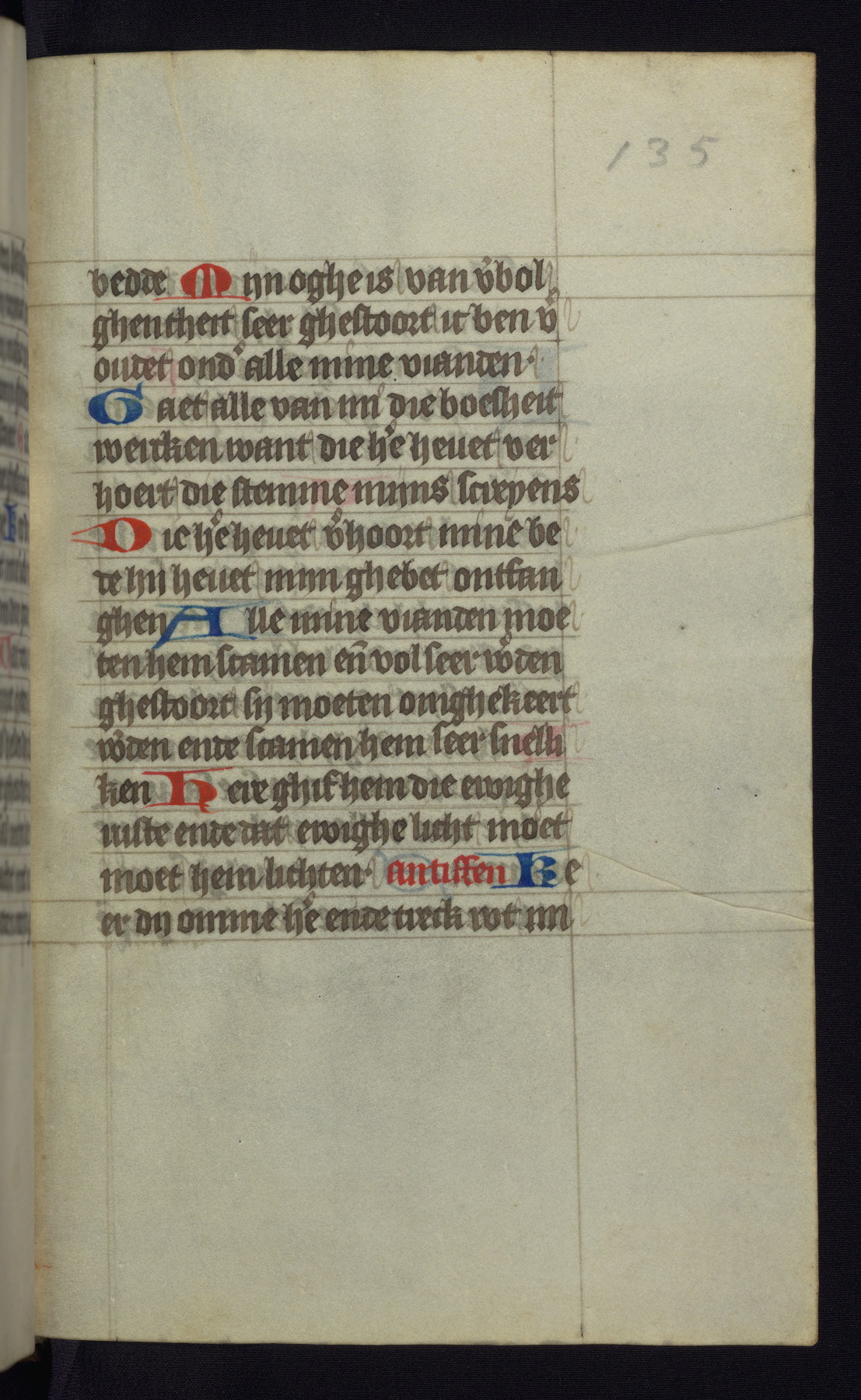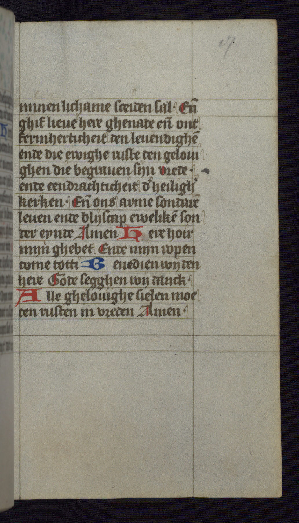 This mid-fifteenth-century illuminated book of hours is written entirely in Dutch on fine parchment and is remarkable for its eighteen grisaille miniatures. This technique, wherein the figures are modeled primarily in a gray wash, became a favorite in the Netherlands. The hand behind the miniatures in this manuscript has been identified with a group of artists known as the Masters of the Delft Grisailles. The manuscript has been grouped with more than a dozen related works, including New York, Pierpont Morgan Library Ms. M.349; London, Victoria and Albert Museum, Geo. Reid Ms. 32; Leiden, Bibliotheek der Rijksuniversiteit BPL 224; Brussels, Bibliothèque Royale Ms. 21696; Antwerp, Plantin Moretus Ms. 49; and The Hague, Koninklijke Bibliotheek Ms. 74 G 35. The manuscript comprises 152 folios and is almost completely intact, lacking only two miniatures. It retains its original brown leather binding decorated with mythological beasts and a now illegible inscription. The calendar is for the use of Utrecht, which helps localize its original ownership, as might a mostly erased ownership inscription that has been partially recovered. Good impressions of two circular pilgrim badges, now removed, are visible on fol. 112v.