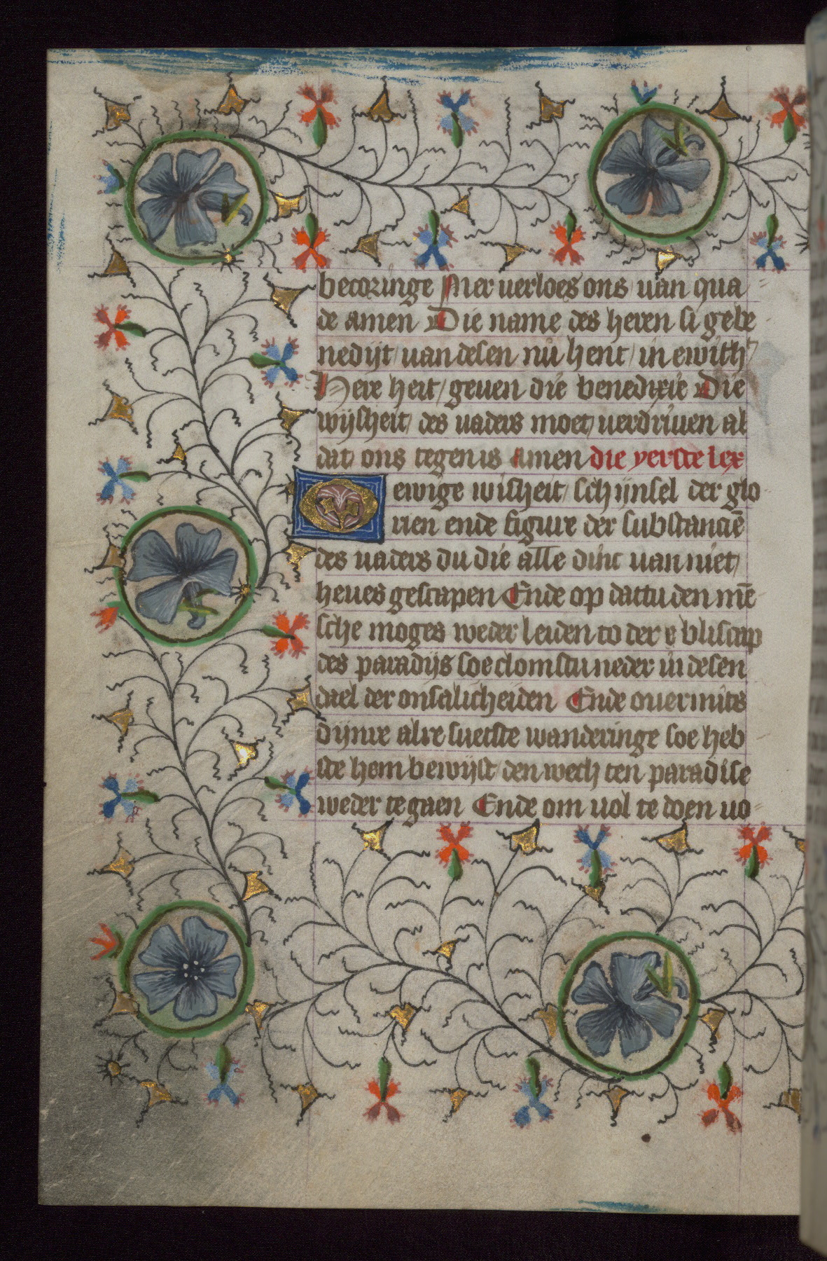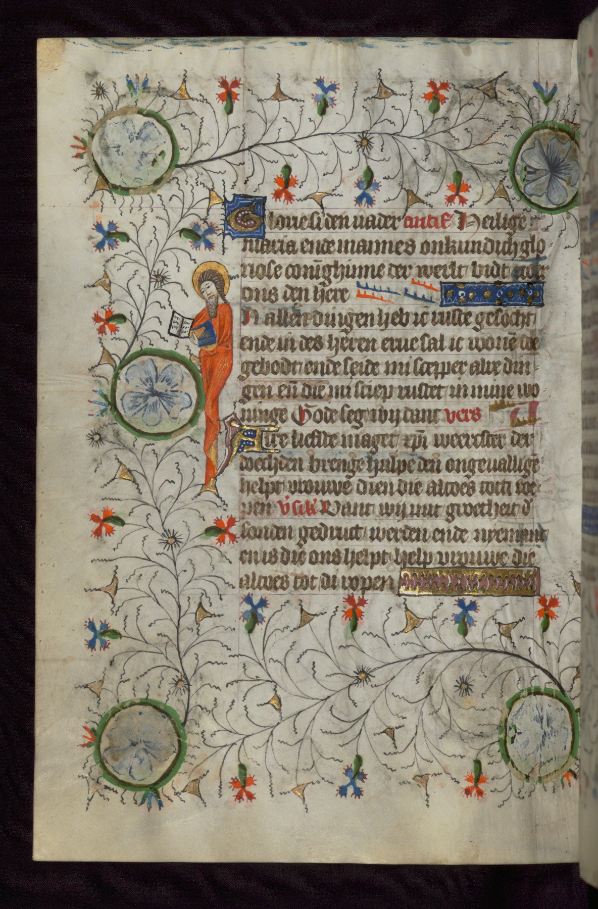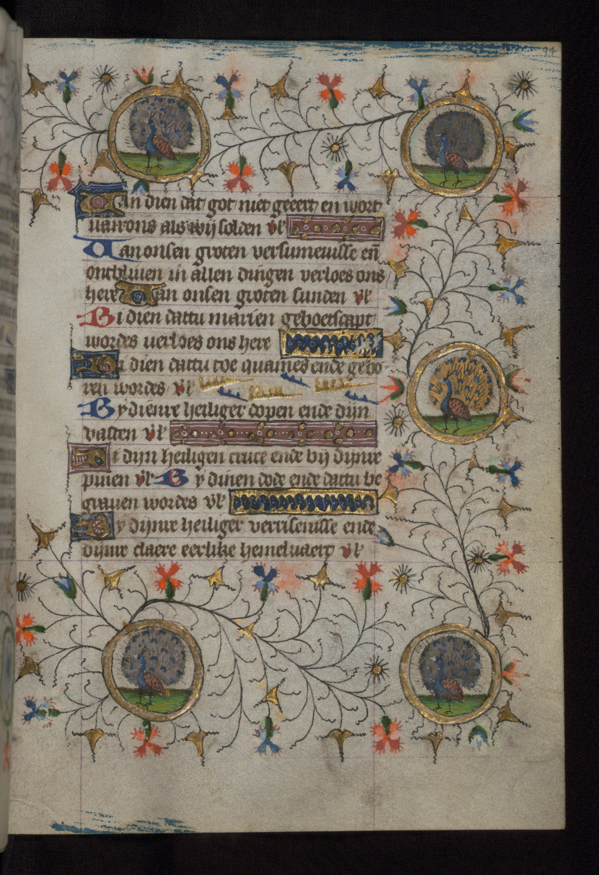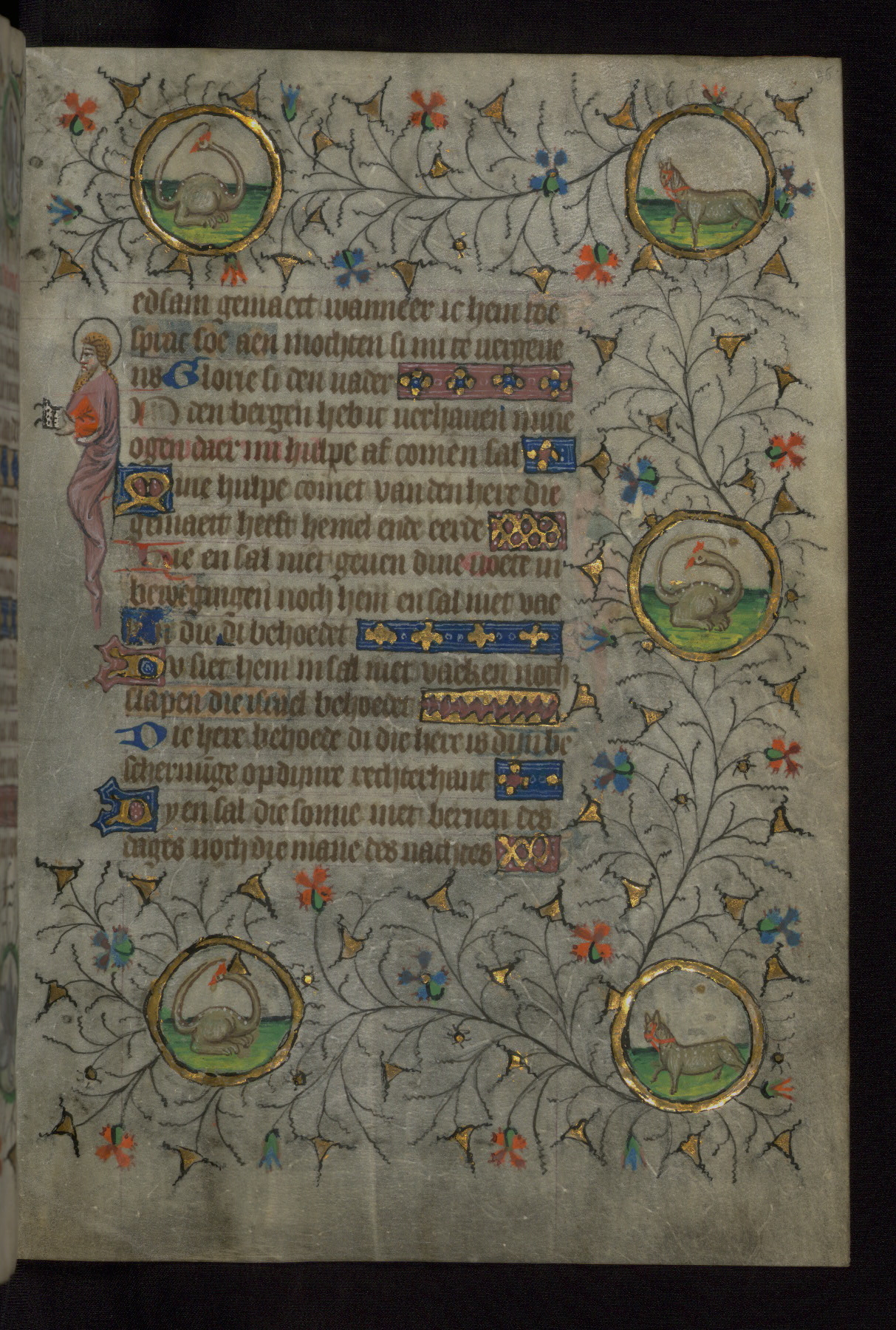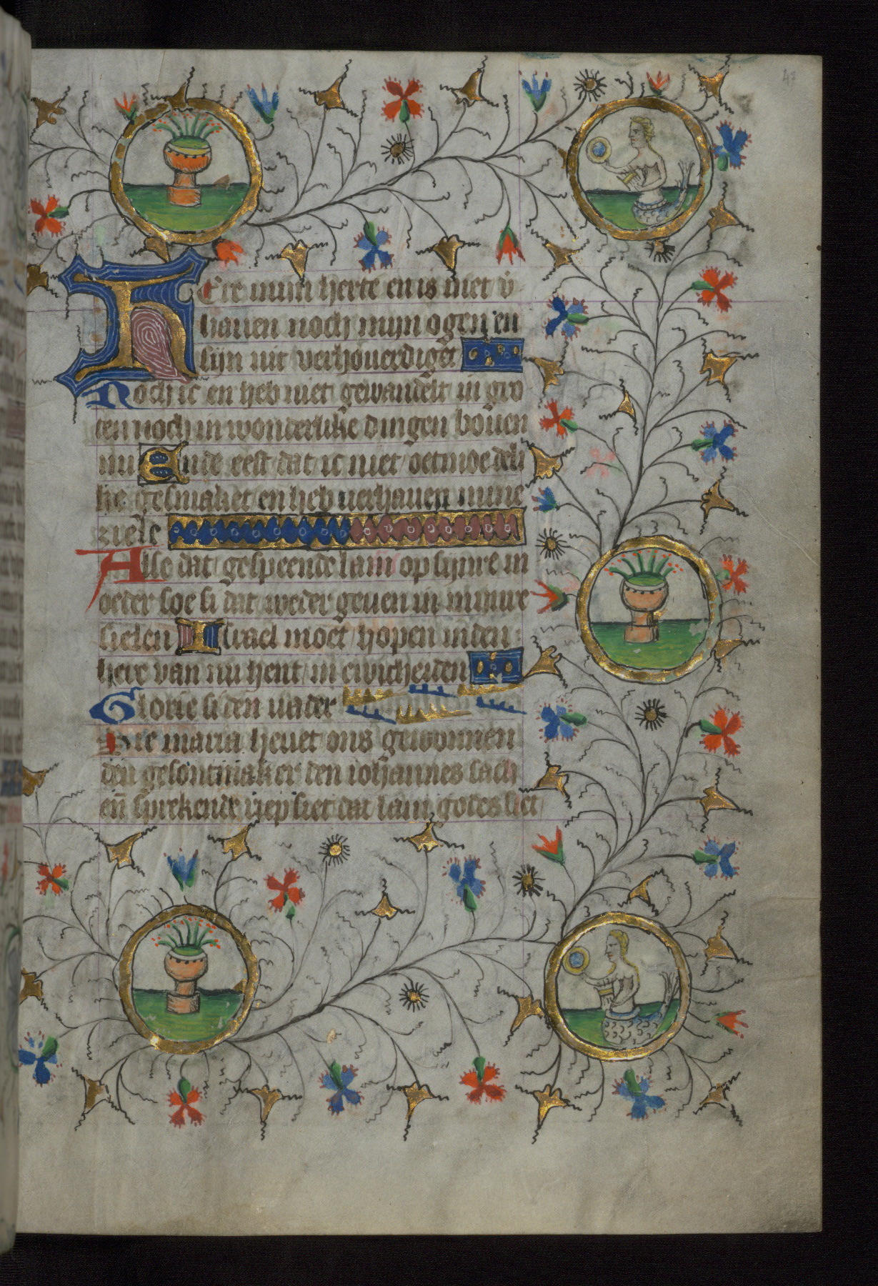 This book of hours was written in Dutch in the fifteenth century for the use of Utrecht. The Hours of the Virgin and of the Cross are accompanied here by the Dutch translation of Henry Suso's "Cursus aeternae sapientiae," a text that was particularly popular for private devotion in the Netherlands. Once owned by the English collector Lord Amherst, the manuscript is exceptional for its extensive illumination. Webs of foliage cover every margin, most sprouting medallions containing flora and fauna. The divisions in the text are marked by twenty richly painted full-page miniatures, often accompanied by related marginalia. Further illumination in the form of historiated and foliate initials marks minor breaks in the text, and the overall effect is a visual feast for the reader.