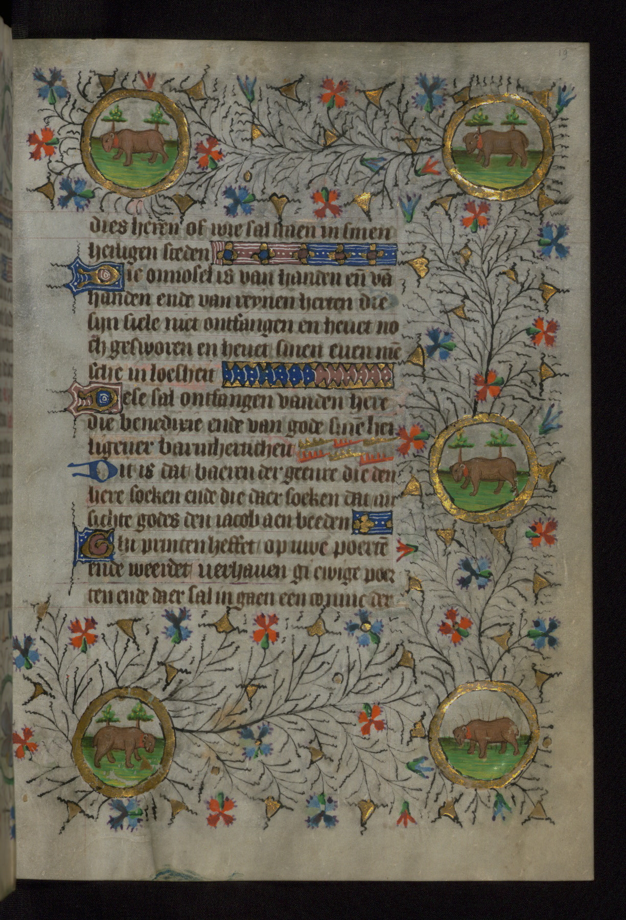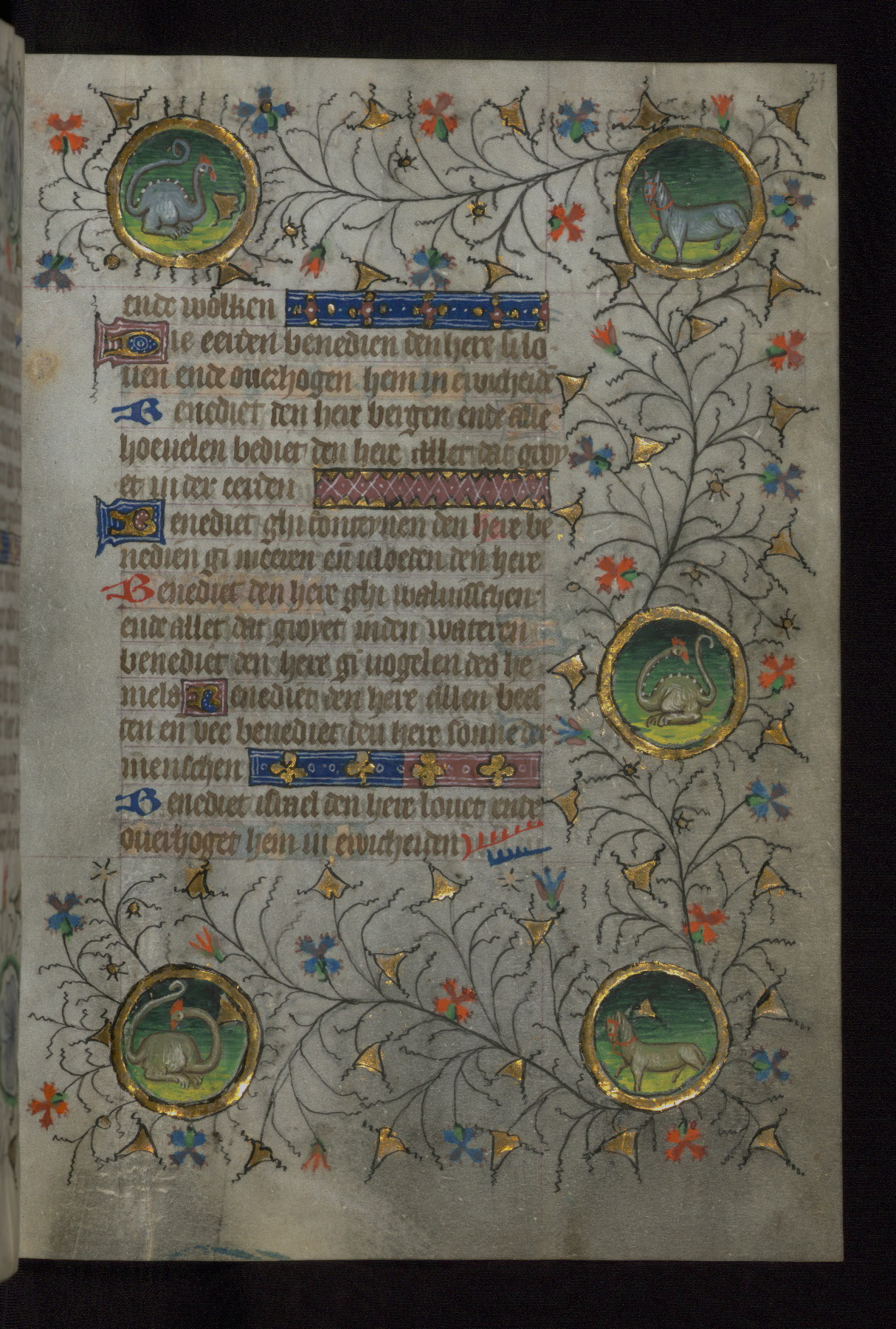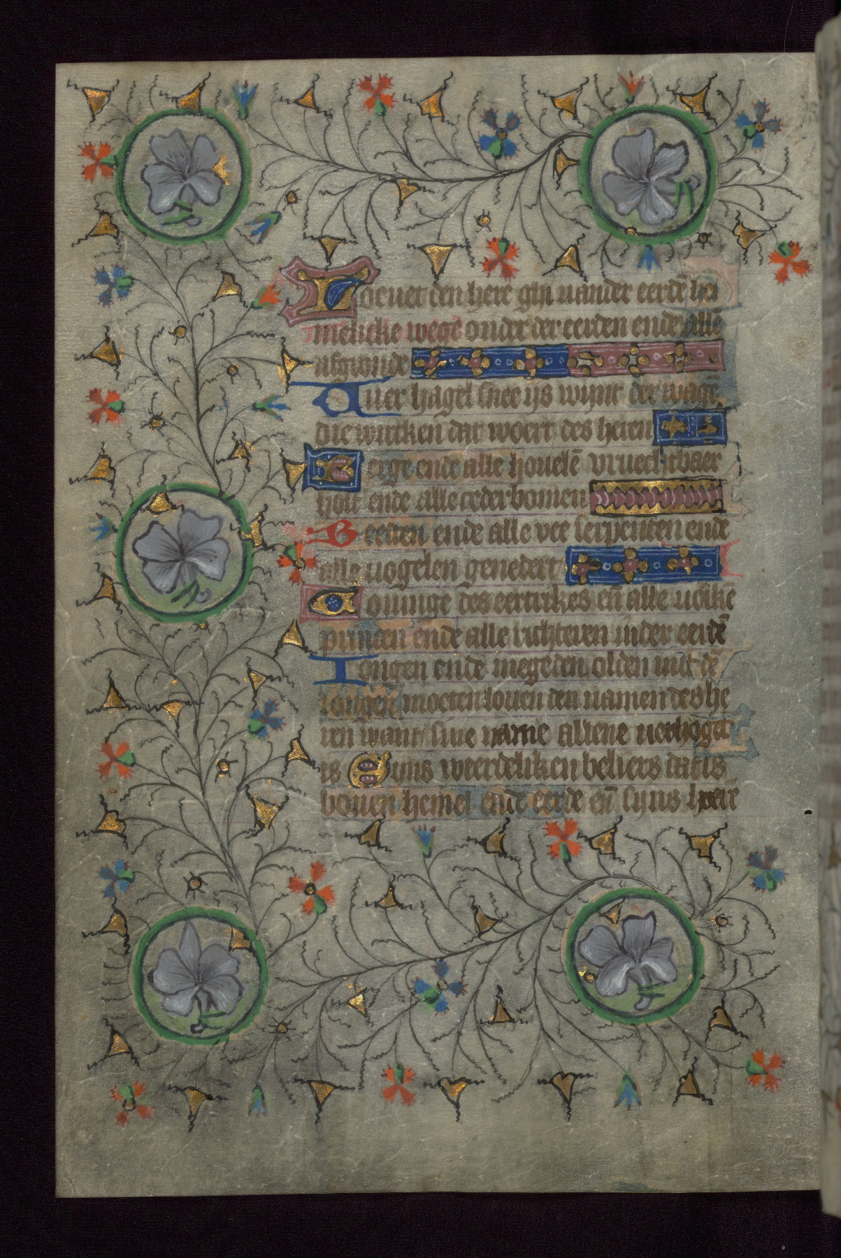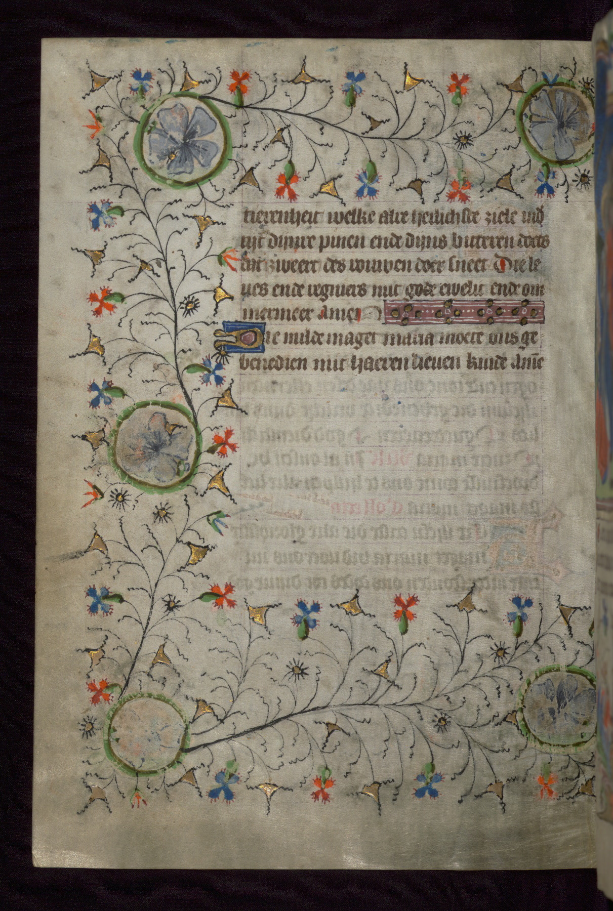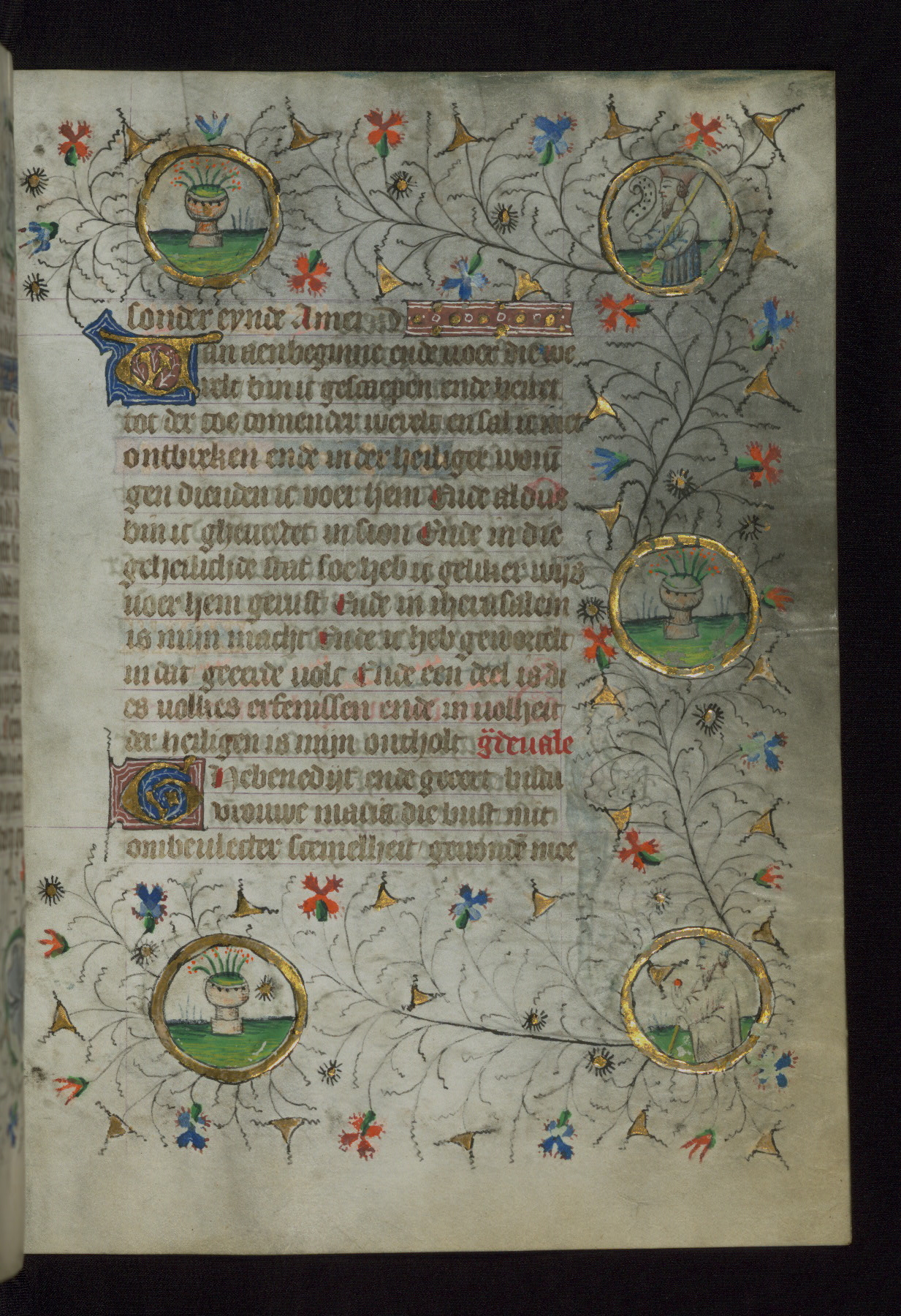 This book of hours was written in Dutch in the fifteenth century for the use of Utrecht. The Hours of the Virgin and of the Cross are accompanied here by the Dutch translation of Henry Suso's "Cursus aeternae sapientiae," a text that was particularly popular for private devotion in the Netherlands. Once owned by the English collector Lord Amherst, the manuscript is exceptional for its extensive illumination. Webs of foliage cover every margin, most sprouting medallions containing flora and fauna. The divisions in the text are marked by twenty richly painted full-page miniatures, often accompanied by related marginalia. Further illumination in the form of historiated and foliate initials marks minor breaks in the text, and the overall effect is a visual feast for the reader.