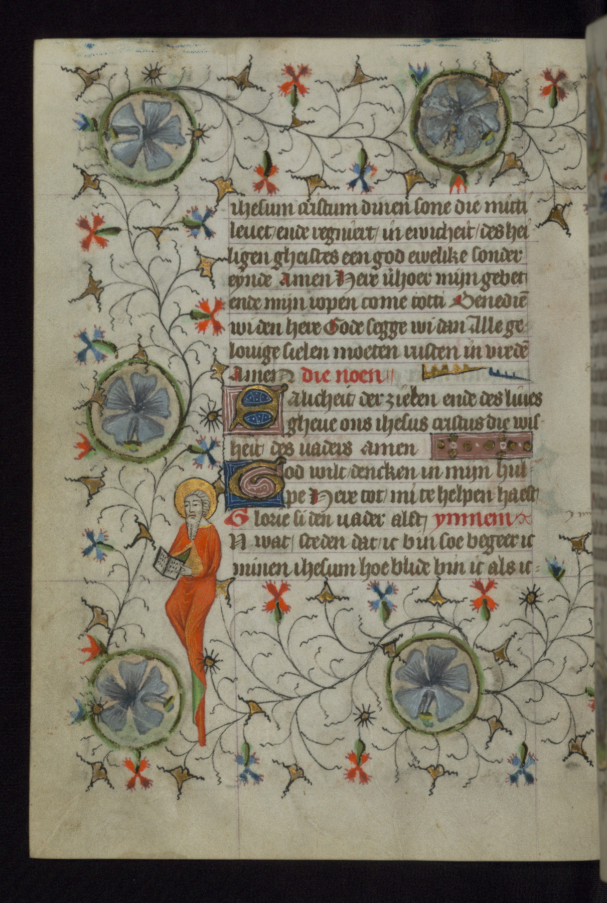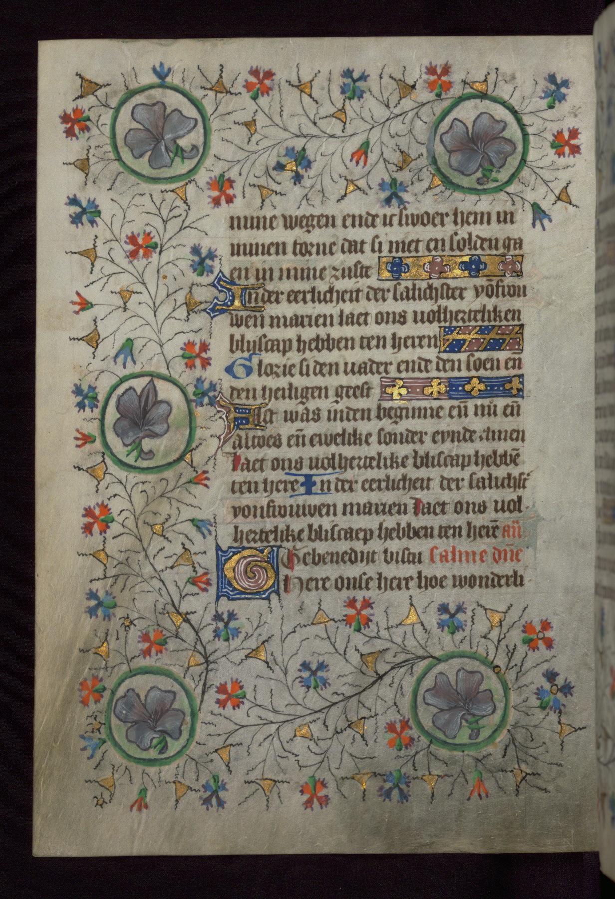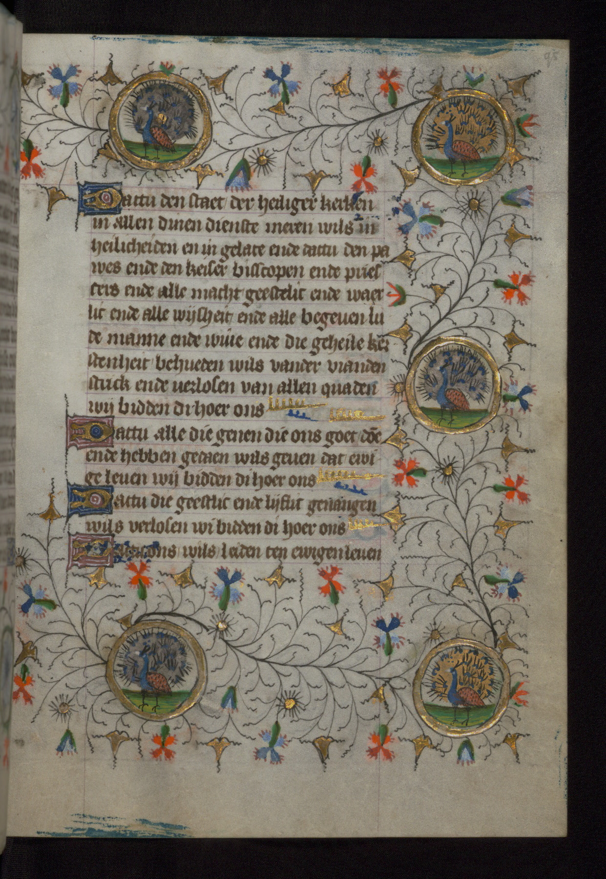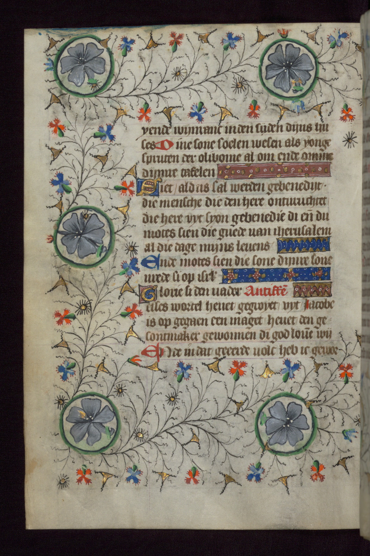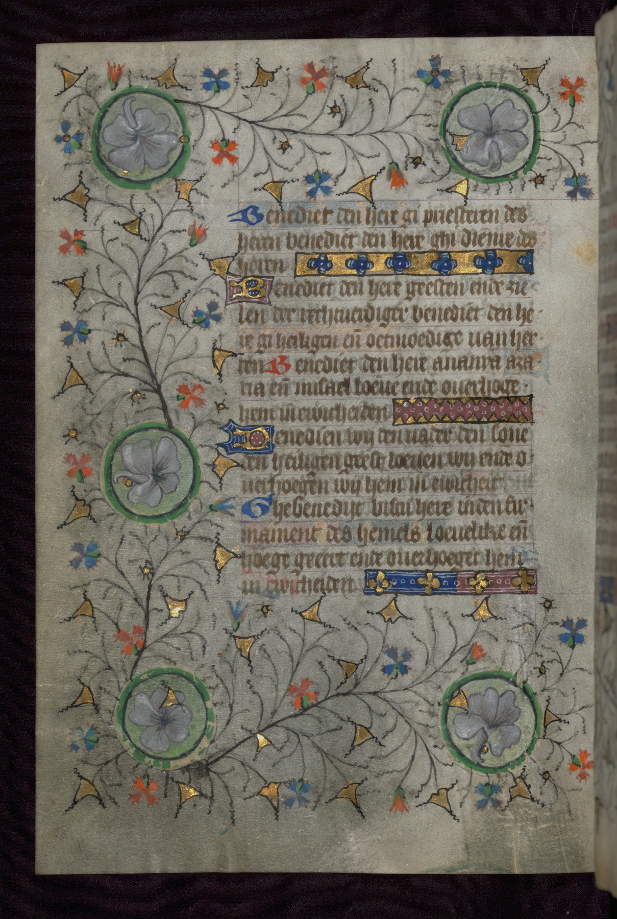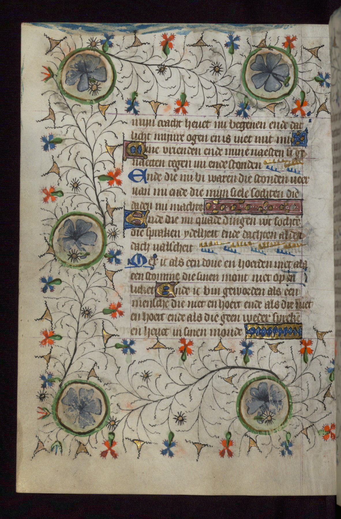 This book of hours was written in Dutch in the fifteenth century for the use of Utrecht. The Hours of the Virgin and of the Cross are accompanied here by the Dutch translation of Henry Suso's "Cursus aeternae sapientiae," a text that was particularly popular for private devotion in the Netherlands. Once owned by the English collector Lord Amherst, the manuscript is exceptional for its extensive illumination. Webs of foliage cover every margin, most sprouting medallions containing flora and fauna. The divisions in the text are marked by twenty richly painted full-page miniatures, often accompanied by related marginalia. Further illumination in the form of historiated and foliate initials marks minor breaks in the text, and the overall effect is a visual feast for the reader.