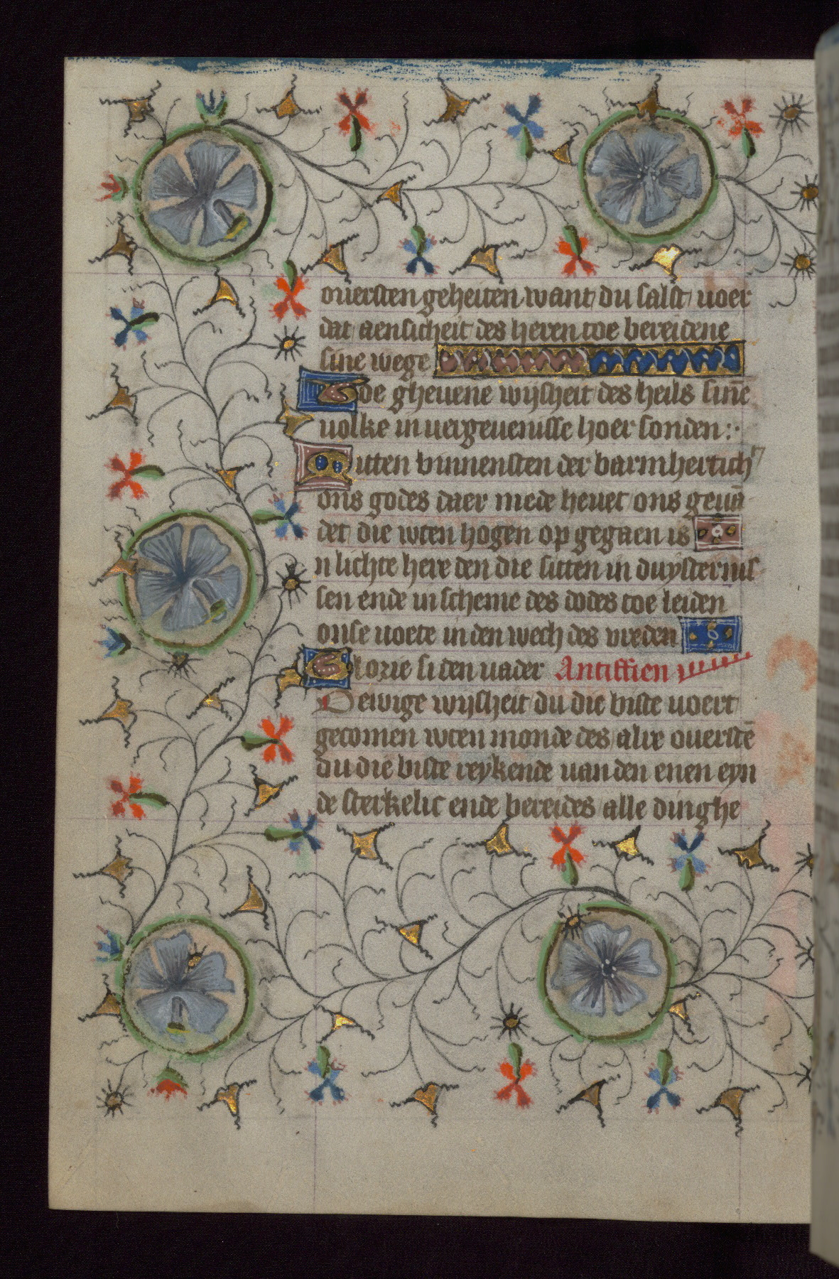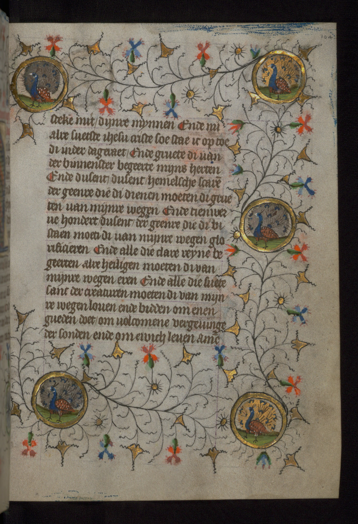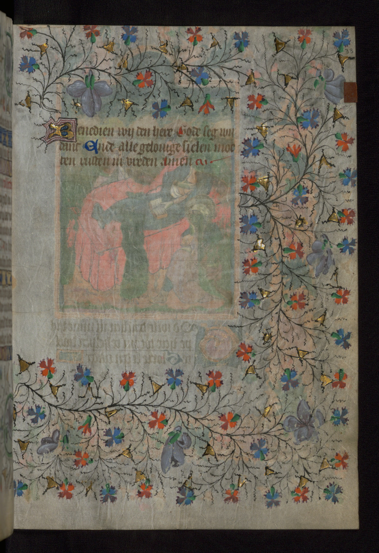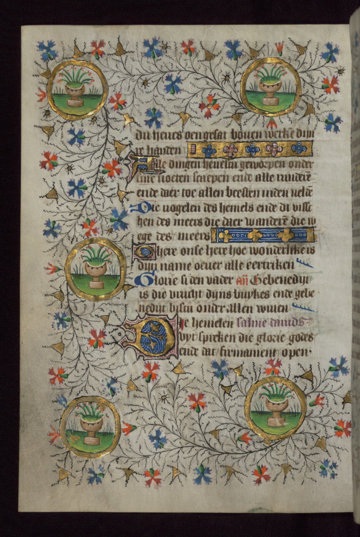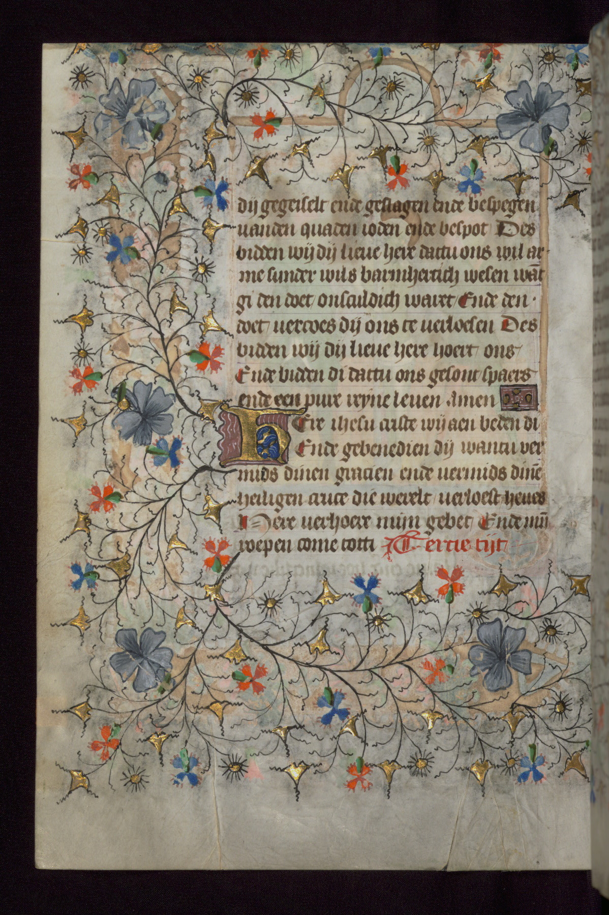 This book of hours was written in Dutch in the fifteenth century for the use of Utrecht. The Hours of the Virgin and of the Cross are accompanied here by the Dutch translation of Henry Suso's "Cursus aeternae sapientiae," a text that was particularly popular for private devotion in the Netherlands. Once owned by the English collector Lord Amherst, the manuscript is exceptional for its extensive illumination. Webs of foliage cover every margin, most sprouting medallions containing flora and fauna. The divisions in the text are marked by twenty richly painted full-page miniatures, often accompanied by related marginalia. Further illumination in the form of historiated and foliate initials marks minor breaks in the text, and the overall effect is a visual feast for the reader.